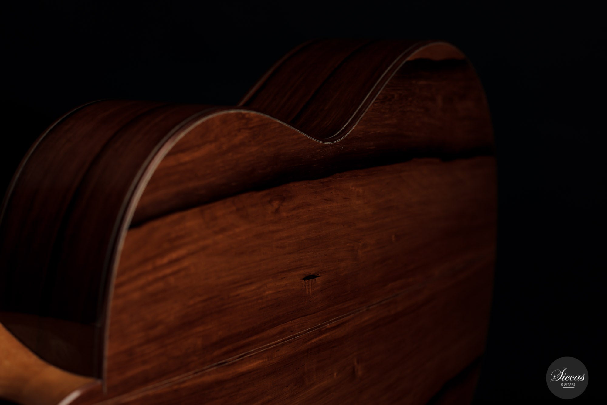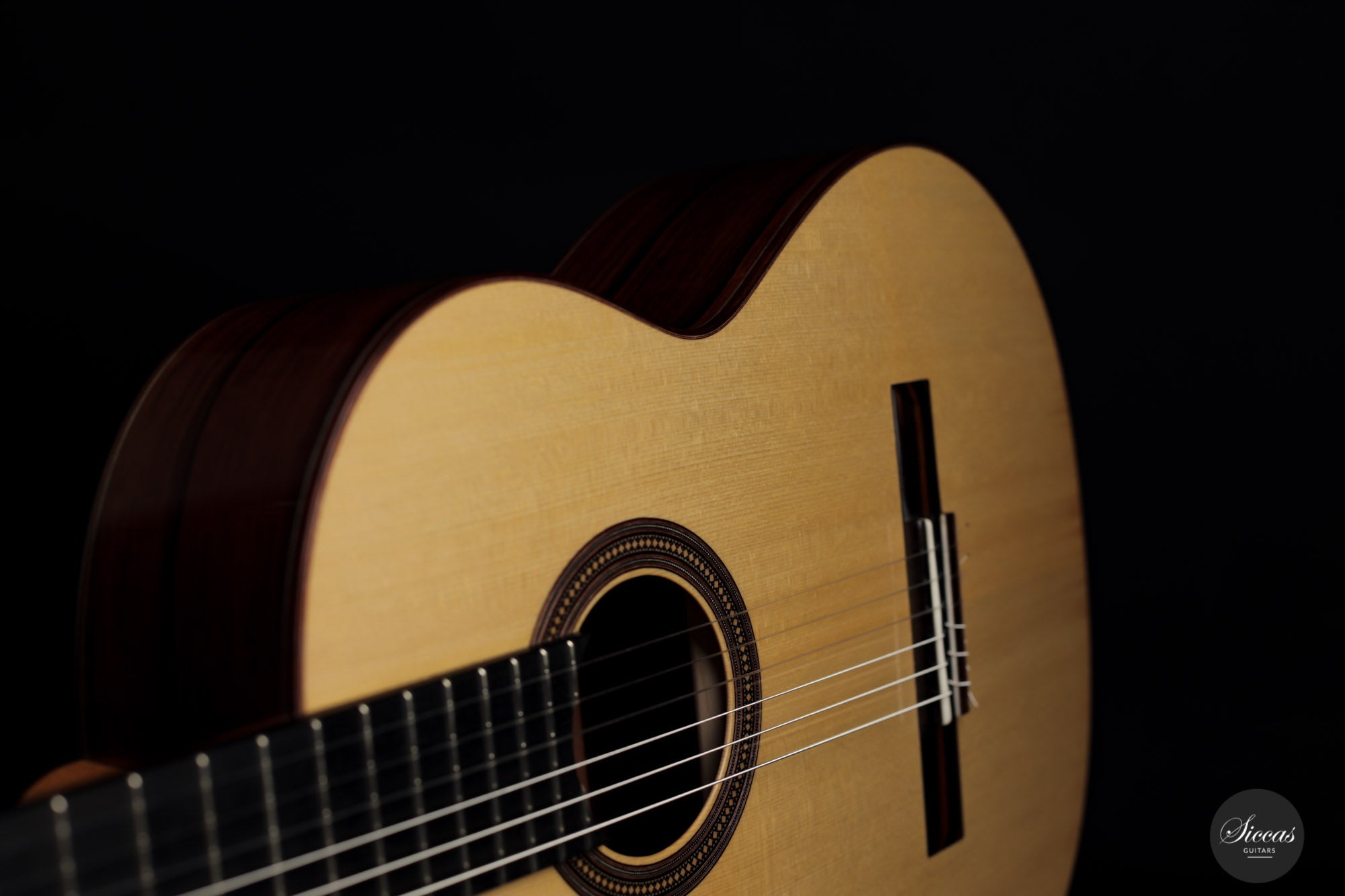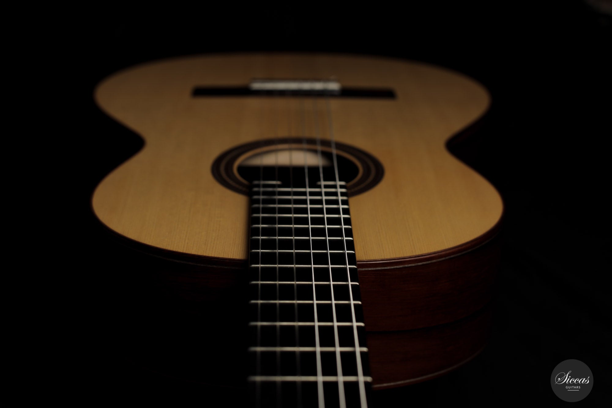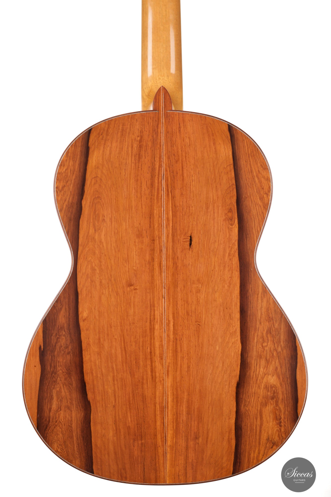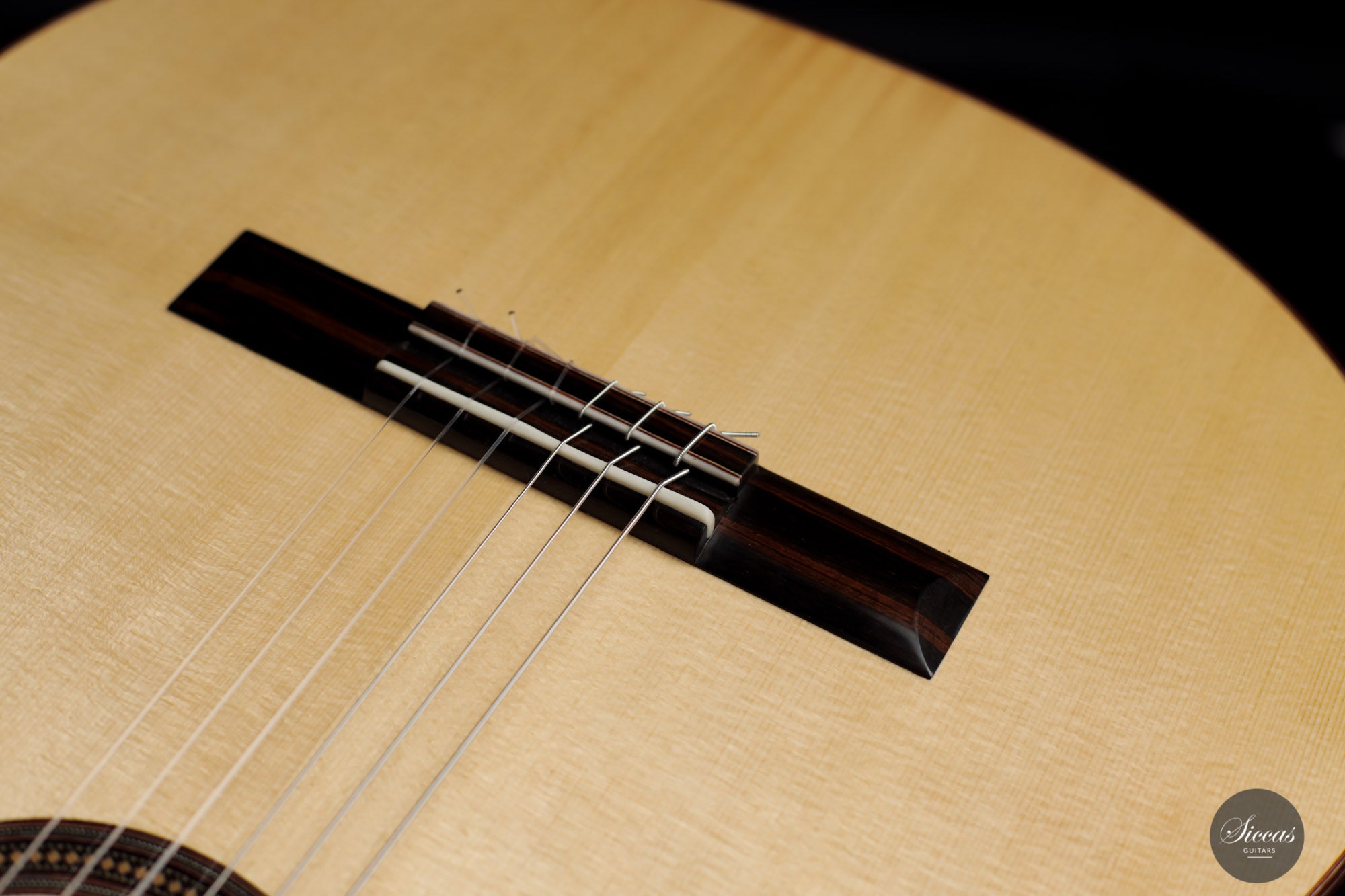 Es ist immer eine Freude, Gitarren von Francois zu erhalten. Dieses Modell ist das erste mit 64cm Mensur, das er für uns gebaut hat und wir sind wieder einmal begeistert. Trotz der etwas kürzeren Mensur büßt dieses Modell nichts von seiner Ausdruckskraft und Präsenz ein, sondern ist noch angenehmer und komfortabler zu spielen. Die Offenheit des Tons und die Reaktionsfähigkeit der Decke sind erstaunlich. Die Höhen besitzen eine beachtliche Präsenz und einen klaren und raffinierten Klangcharakter. Auch die Vielfalt der Klangfarben ist auffällig gut sowie der große Dynamikbereich dieser Gitarre.