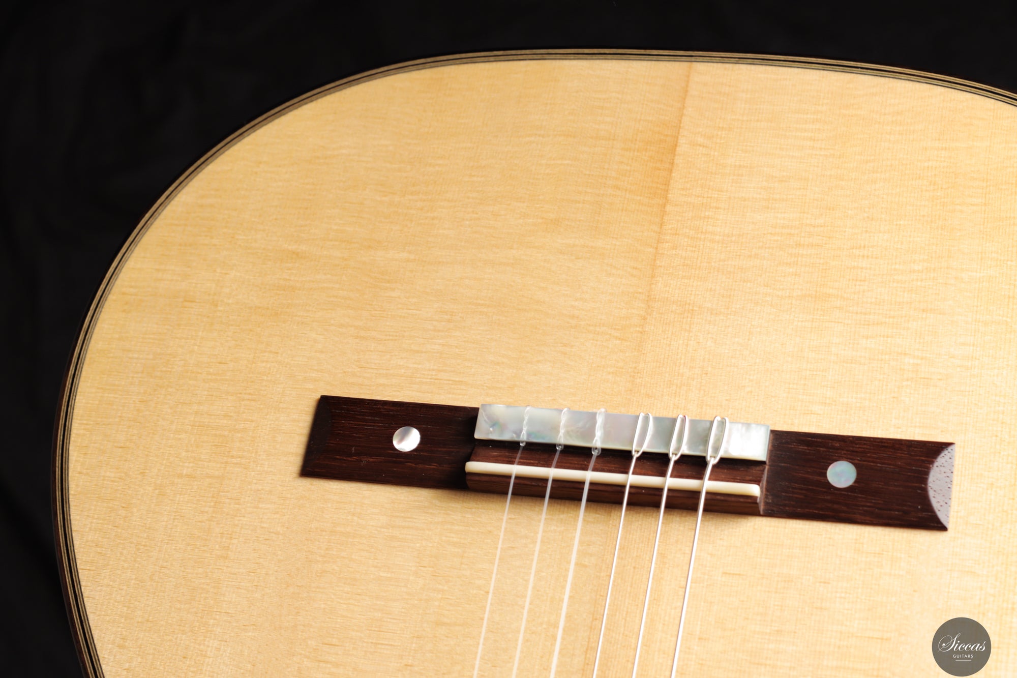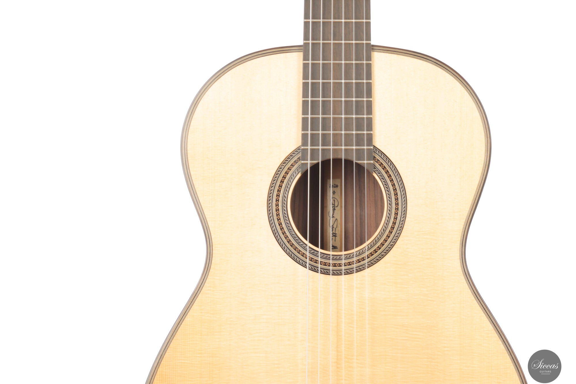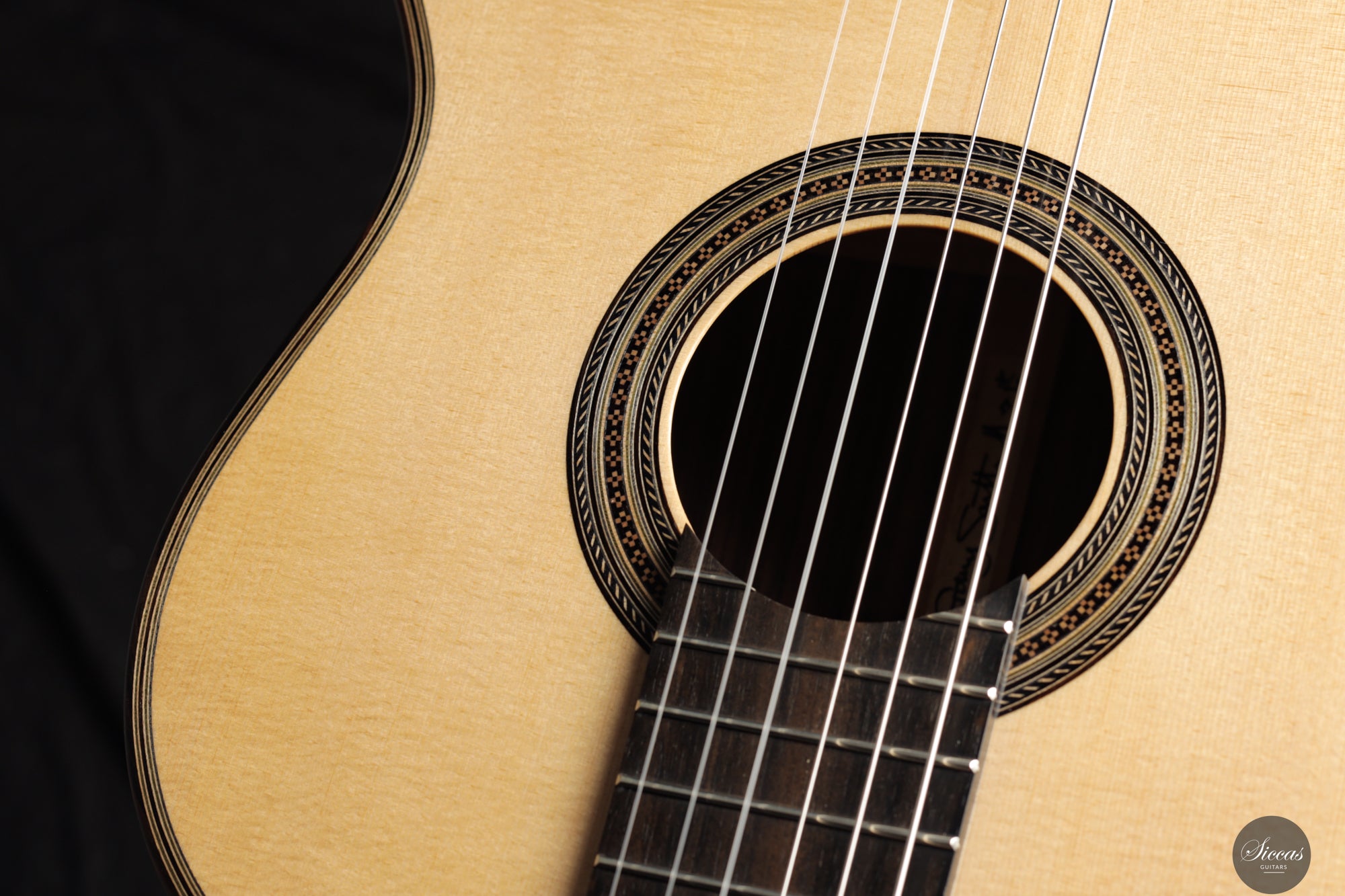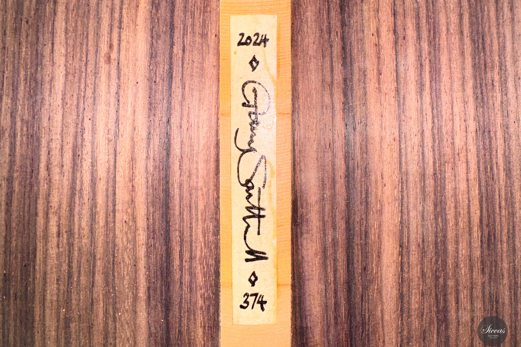 Diese Gitarre aus dem Jahr 2024 mit der Seriennummer 374 basiert auf einem Instrument von Herrmann Hauser I aus dem Jahr 1940, das von Julian Bream gegen Ende seiner internationalen Tournee-Karriere gespielt und aufgenommen wurde und an dem Southwell eng mit Julian Bream zusammengearbeitet hat. Sie besticht durch ihre besonders leichte Bauweise, eine fein gearbeitete Fichtendecke und Boden und Zargen aus indischem Palisander. Dank der niedrigen Korpusresonanz entwickeln die Basstöne eine bemerkenswerte Freiheit, ohne an Klarheit zu verlieren. Der Klang bleibt über das gesamte Griffbrett präzise und kontrolliert. Besonders erwähnenswert sind die runden, präzisen Höhen, die perfekt mit den mittleren und tiefen Frequenzen harmonieren. Diese Eigenschaften sorgen für einen gleichmäßigen Klang mit hervorragender Trennung, der dennoch warm und voll bleibt. Die Gitarre bietet unzählige Möglichkeiten zur Gestaltung der Klangfarbe und reagiert sehr sensibel auf unterschiedliche Spieltechniken. Gary demonstriert hier seine meisterhafte Handwerkskunst und seine Leidenschaft für außergewöhnliche Instrumente in Perfektion.