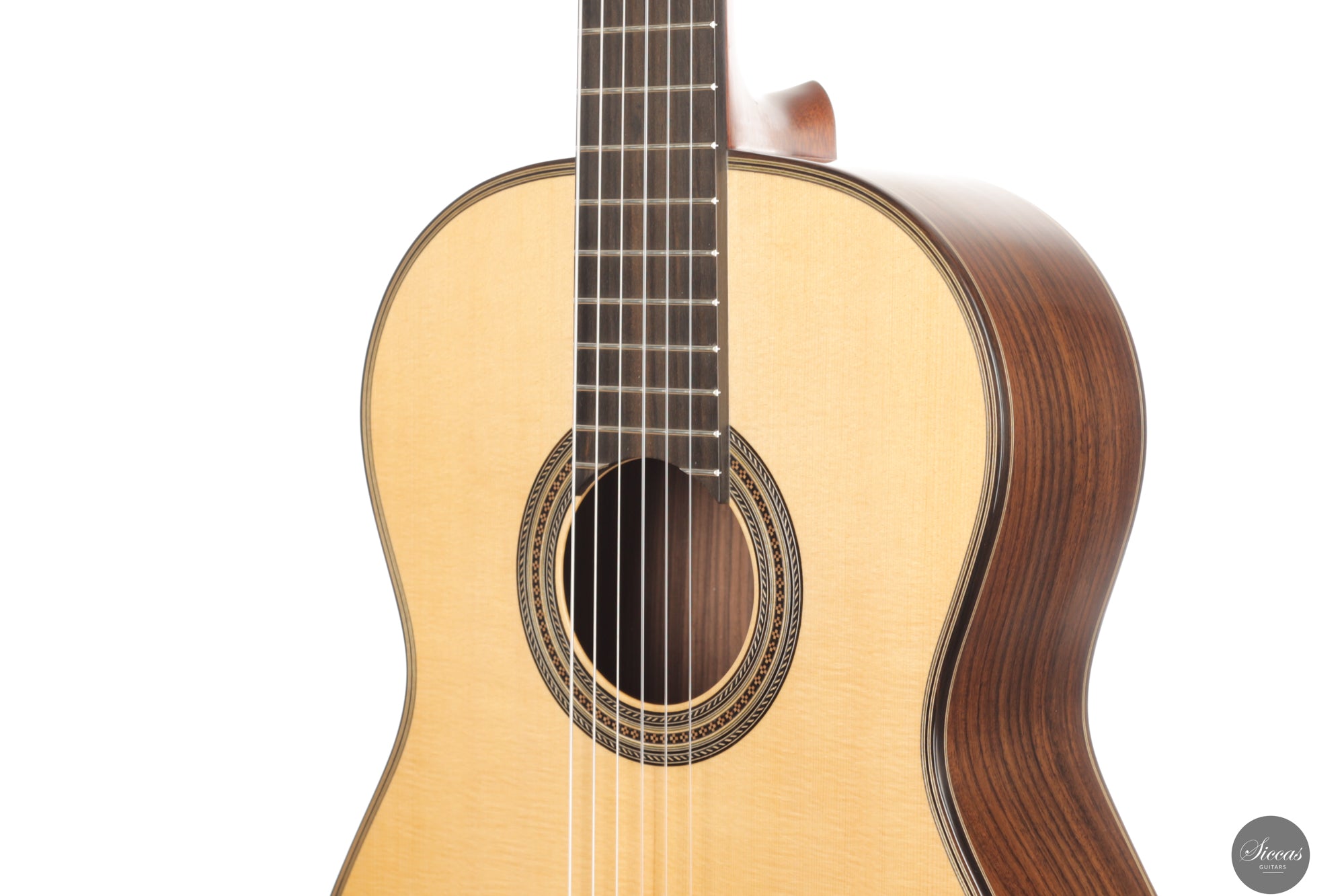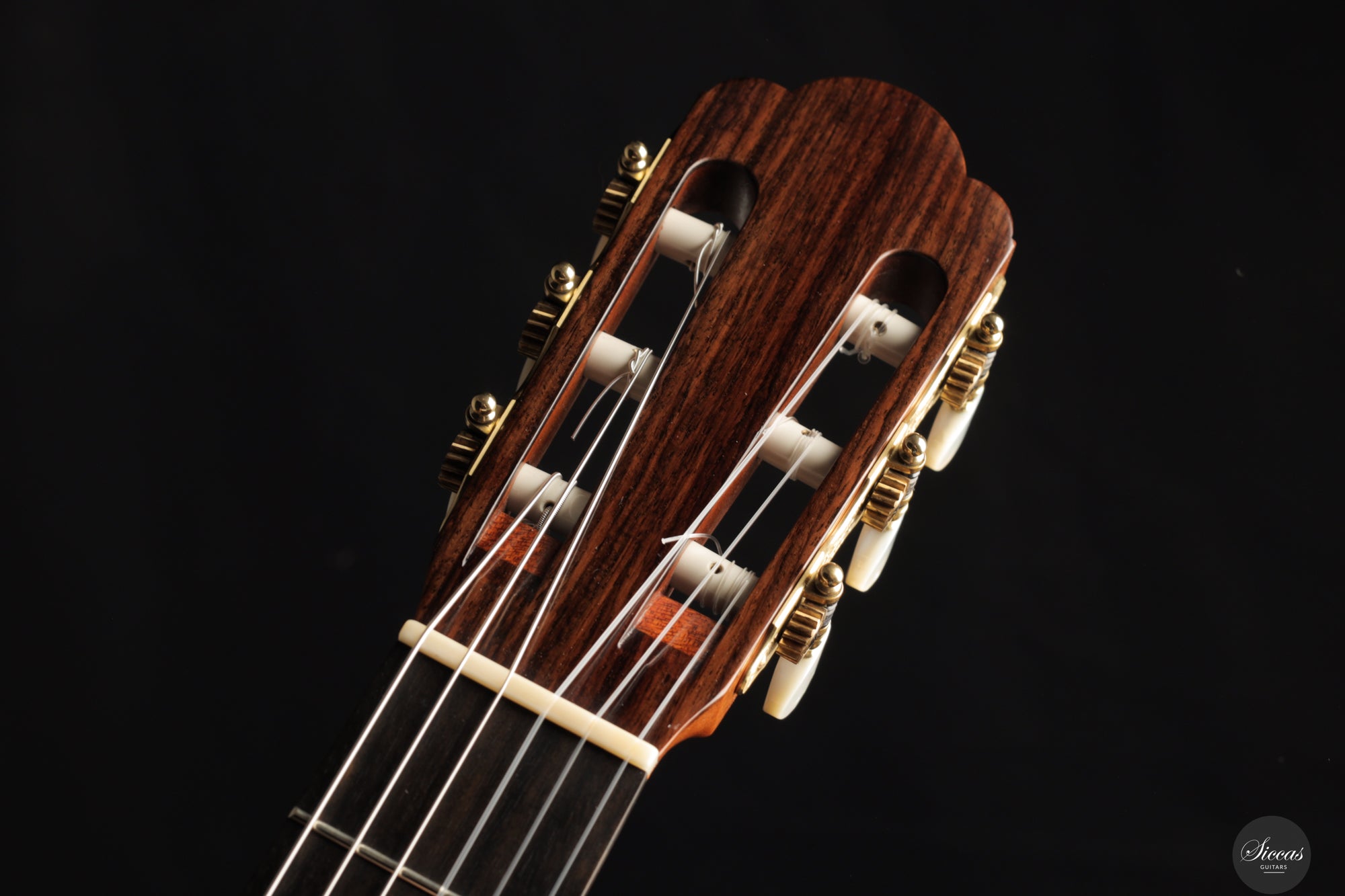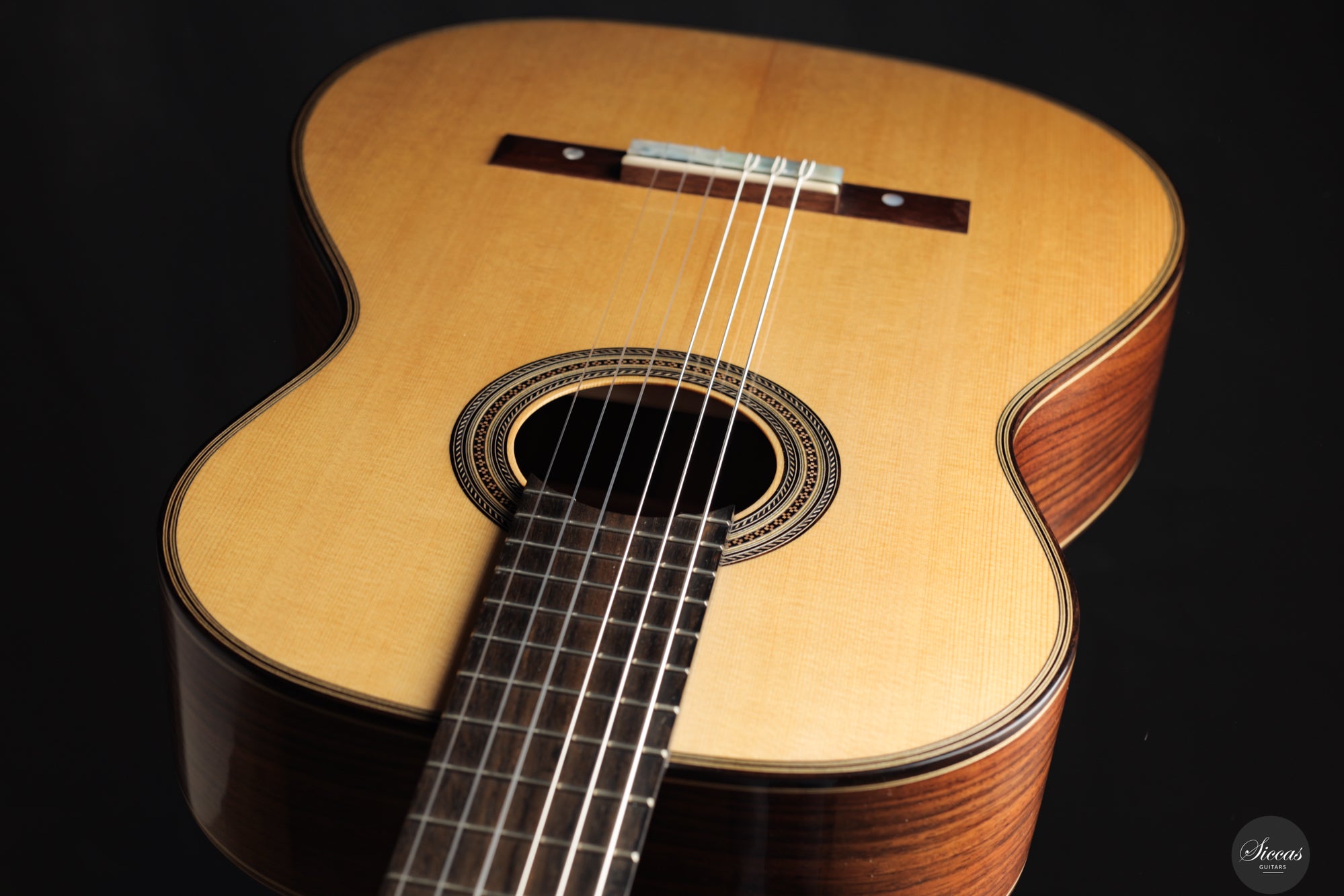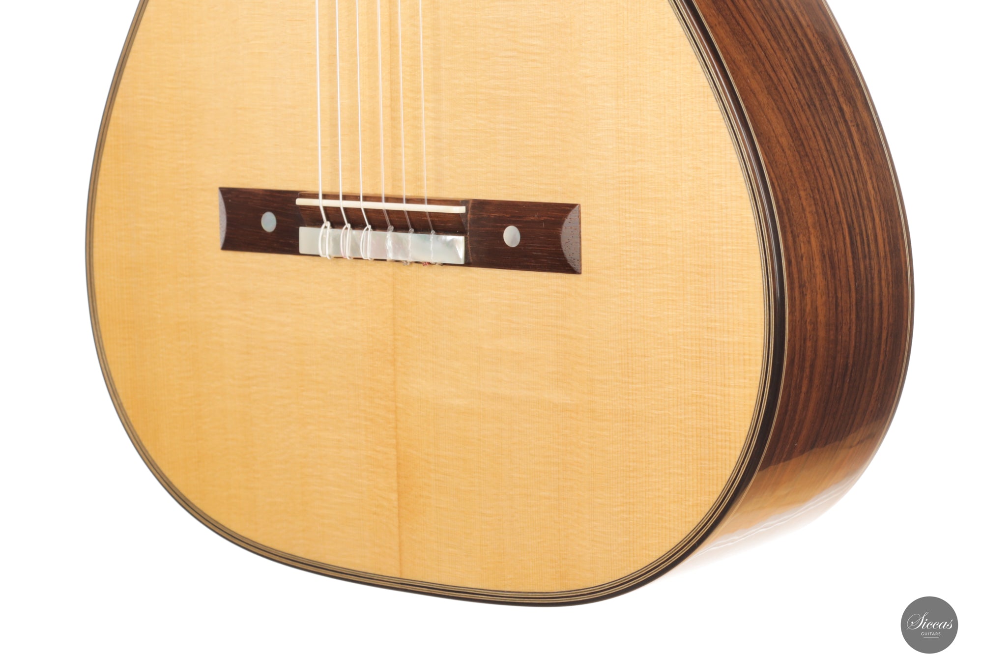 Diese Gitarre aus dem Jahr 2024 mit der Seriennummer 374 basiert auf einem Instrument von Herrmann Hauser I aus dem Jahr 1940, das von Julian Bream gegen Ende seiner internationalen Tournee-Karriere gespielt und aufgenommen wurde und an dem Southwell eng mit Julian Bream zusammengearbeitet hat. Sie besticht durch ihre besonders leichte Bauweise, eine fein gearbeitete Fichtendecke und Boden und Zargen aus indischem Palisander. Dank der niedrigen Korpusresonanz entwickeln die Basstöne eine bemerkenswerte Freiheit, ohne an Klarheit zu verlieren. Der Klang bleibt über das gesamte Griffbrett präzise und kontrolliert. Besonders erwähnenswert sind die runden, präzisen Höhen, die perfekt mit den mittleren und tiefen Frequenzen harmonieren. Diese Eigenschaften sorgen für einen gleichmäßigen Klang mit hervorragender Trennung, der dennoch warm und voll bleibt. Die Gitarre bietet unzählige Möglichkeiten zur Gestaltung der Klangfarbe und reagiert sehr sensibel auf unterschiedliche Spieltechniken. Gary demonstriert hier seine meisterhafte Handwerkskunst und seine Leidenschaft für außergewöhnliche Instrumente in Perfektion.