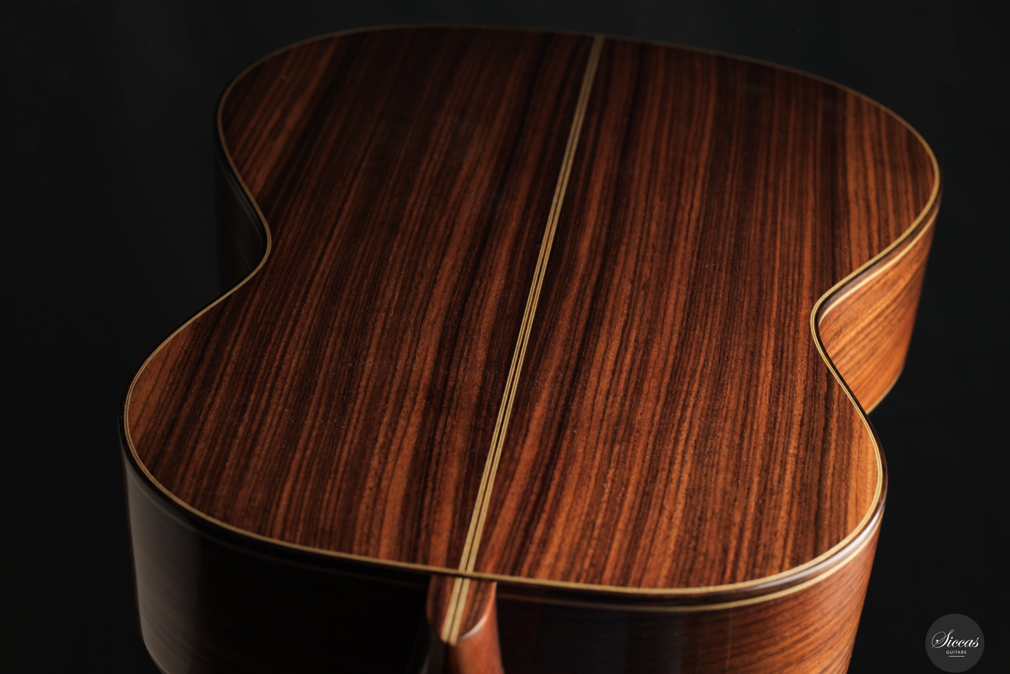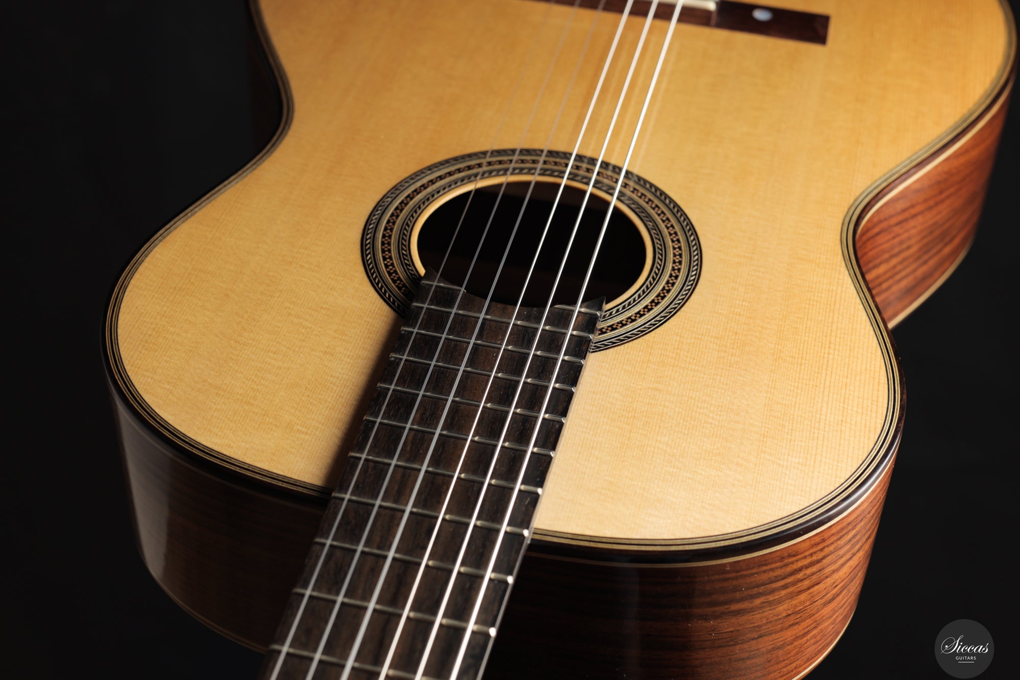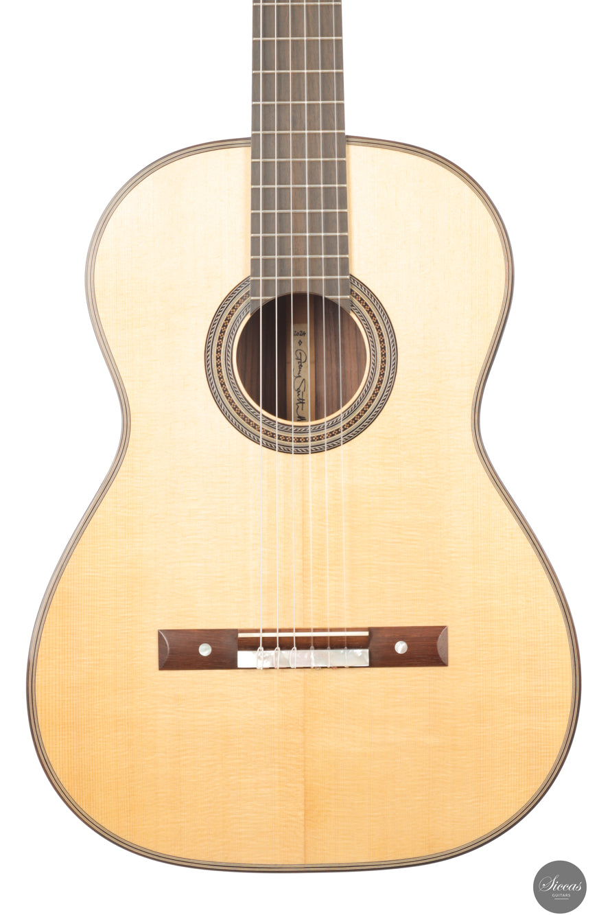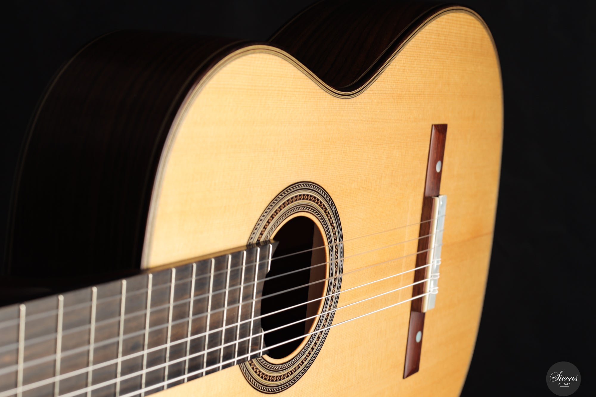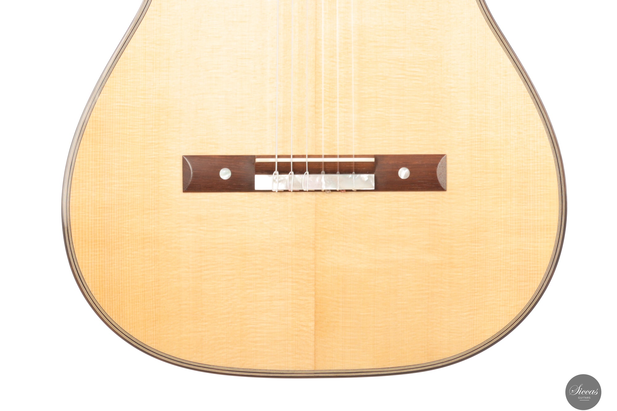 Diese Gitarre aus dem Jahr 2024 mit der Seriennummer 374 basiert auf einem Instrument von Herrmann Hauser I aus dem Jahr 1940, das von Julian Bream gegen Ende seiner internationalen Tournee-Karriere gespielt und aufgenommen wurde und an dem Southwell eng mit Julian Bream zusammengearbeitet hat. Sie besticht durch ihre besonders leichte Bauweise, eine fein gearbeitete Fichtendecke und Boden und Zargen aus indischem Palisander. Dank der niedrigen Korpusresonanz entwickeln die Basstöne eine bemerkenswerte Freiheit, ohne an Klarheit zu verlieren. Der Klang bleibt über das gesamte Griffbrett präzise und kontrolliert. Besonders erwähnenswert sind die runden, präzisen Höhen, die perfekt mit den mittleren und tiefen Frequenzen harmonieren. Diese Eigenschaften sorgen für einen gleichmäßigen Klang mit hervorragender Trennung, der dennoch warm und voll bleibt. Die Gitarre bietet unzählige Möglichkeiten zur Gestaltung der Klangfarbe und reagiert sehr sensibel auf unterschiedliche Spieltechniken. Gary demonstriert hier seine meisterhafte Handwerkskunst und seine Leidenschaft für außergewöhnliche Instrumente in Perfektion.