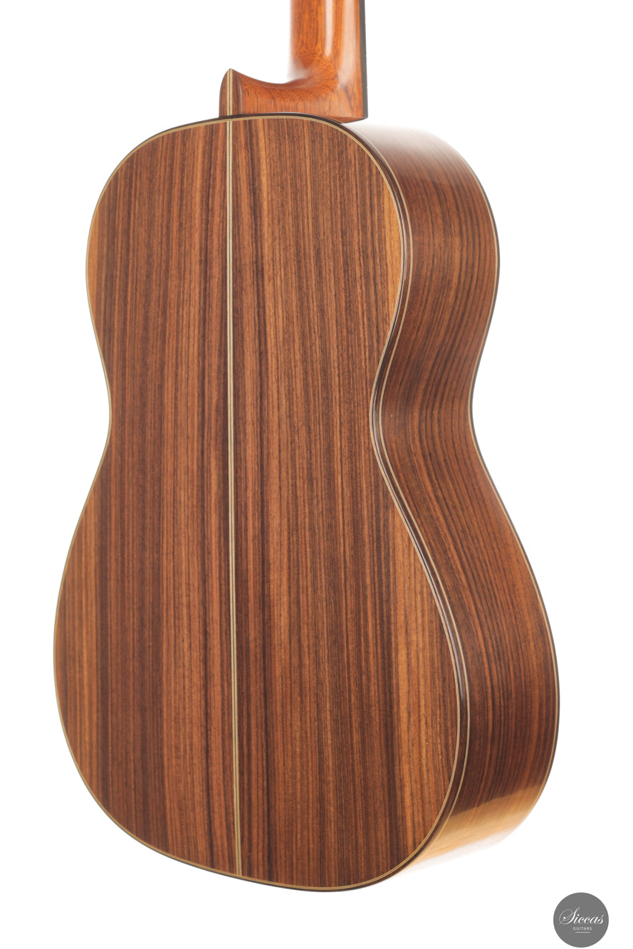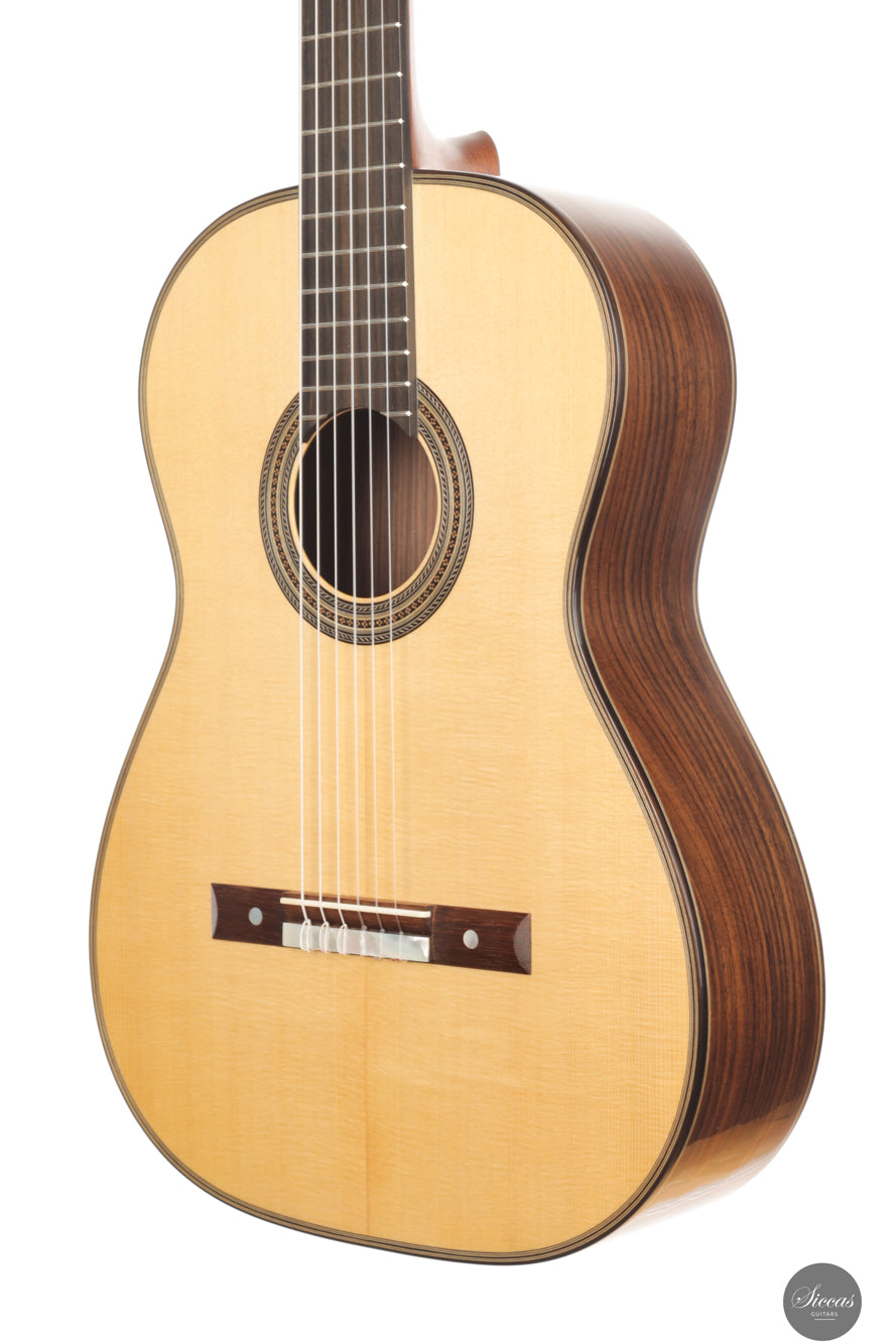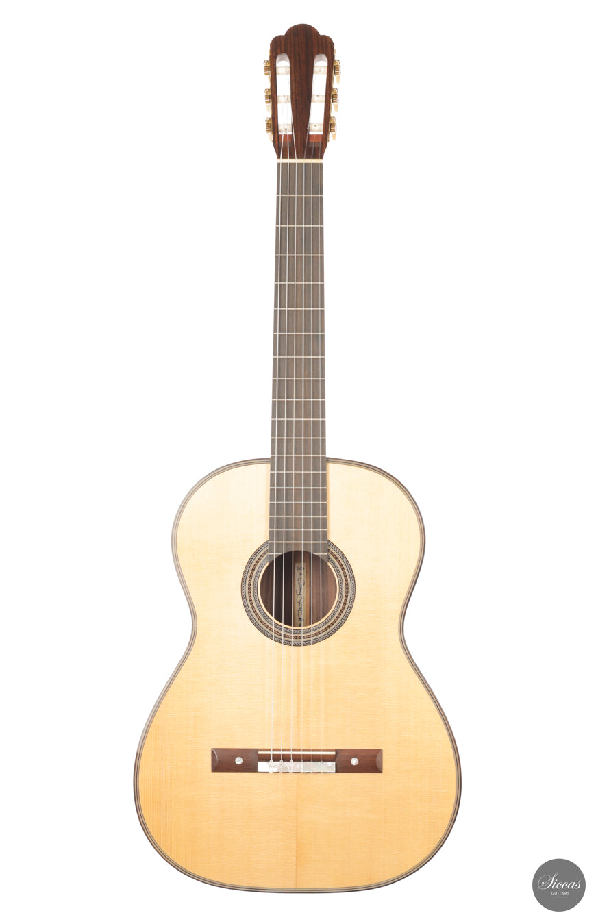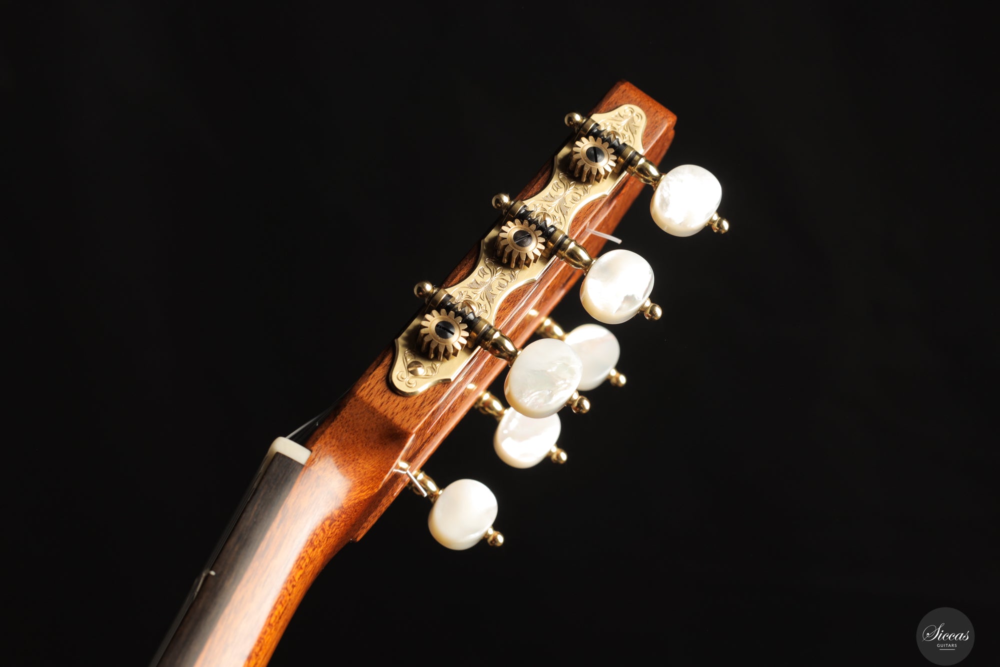 Diese Gitarre aus dem Jahr 2024 mit der Seriennummer 374 basiert auf einem Instrument von Herrmann Hauser I aus dem Jahr 1940, das von Julian Bream gegen Ende seiner internationalen Tournee-Karriere gespielt und aufgenommen wurde und an dem Southwell eng mit Julian Bream zusammengearbeitet hat. Sie besticht durch ihre besonders leichte Bauweise, eine fein gearbeitete Fichtendecke und Boden und Zargen aus indischem Palisander. Dank der niedrigen Korpusresonanz entwickeln die Basstöne eine bemerkenswerte Freiheit, ohne an Klarheit zu verlieren. Der Klang bleibt über das gesamte Griffbrett präzise und kontrolliert. Besonders erwähnenswert sind die runden, präzisen Höhen, die perfekt mit den mittleren und tiefen Frequenzen harmonieren. Diese Eigenschaften sorgen für einen gleichmäßigen Klang mit hervorragender Trennung, der dennoch warm und voll bleibt. Die Gitarre bietet unzählige Möglichkeiten zur Gestaltung der Klangfarbe und reagiert sehr sensibel auf unterschiedliche Spieltechniken. Gary demonstriert hier seine meisterhafte Handwerkskunst und seine Leidenschaft für außergewöhnliche Instrumente in Perfektion.