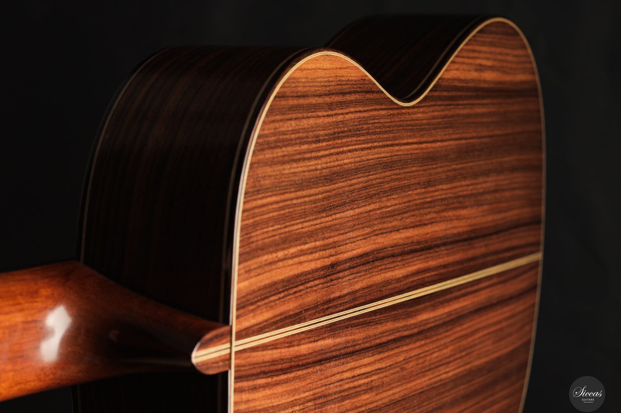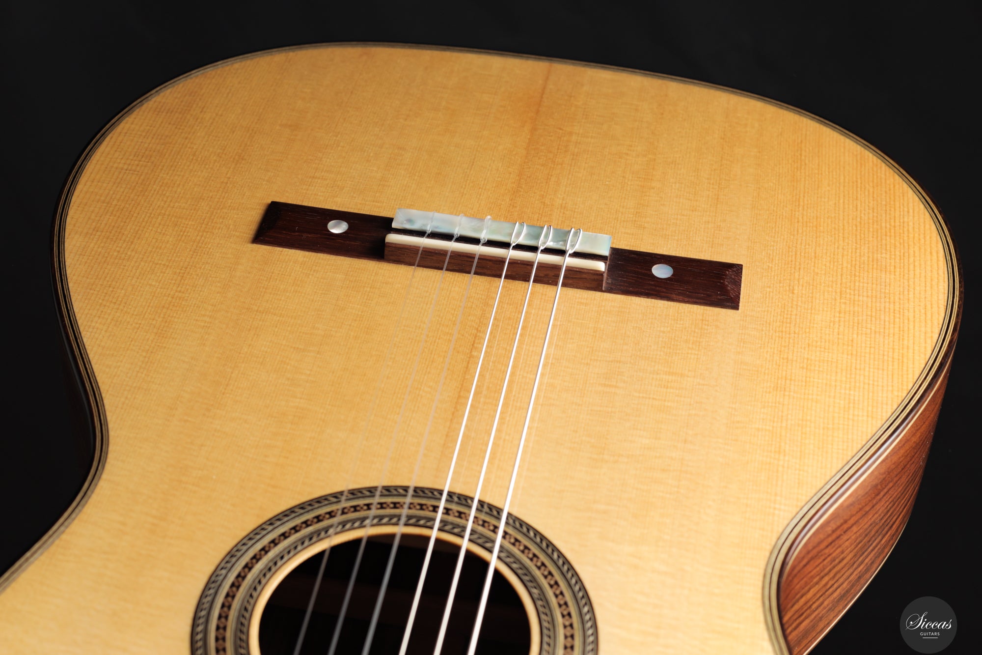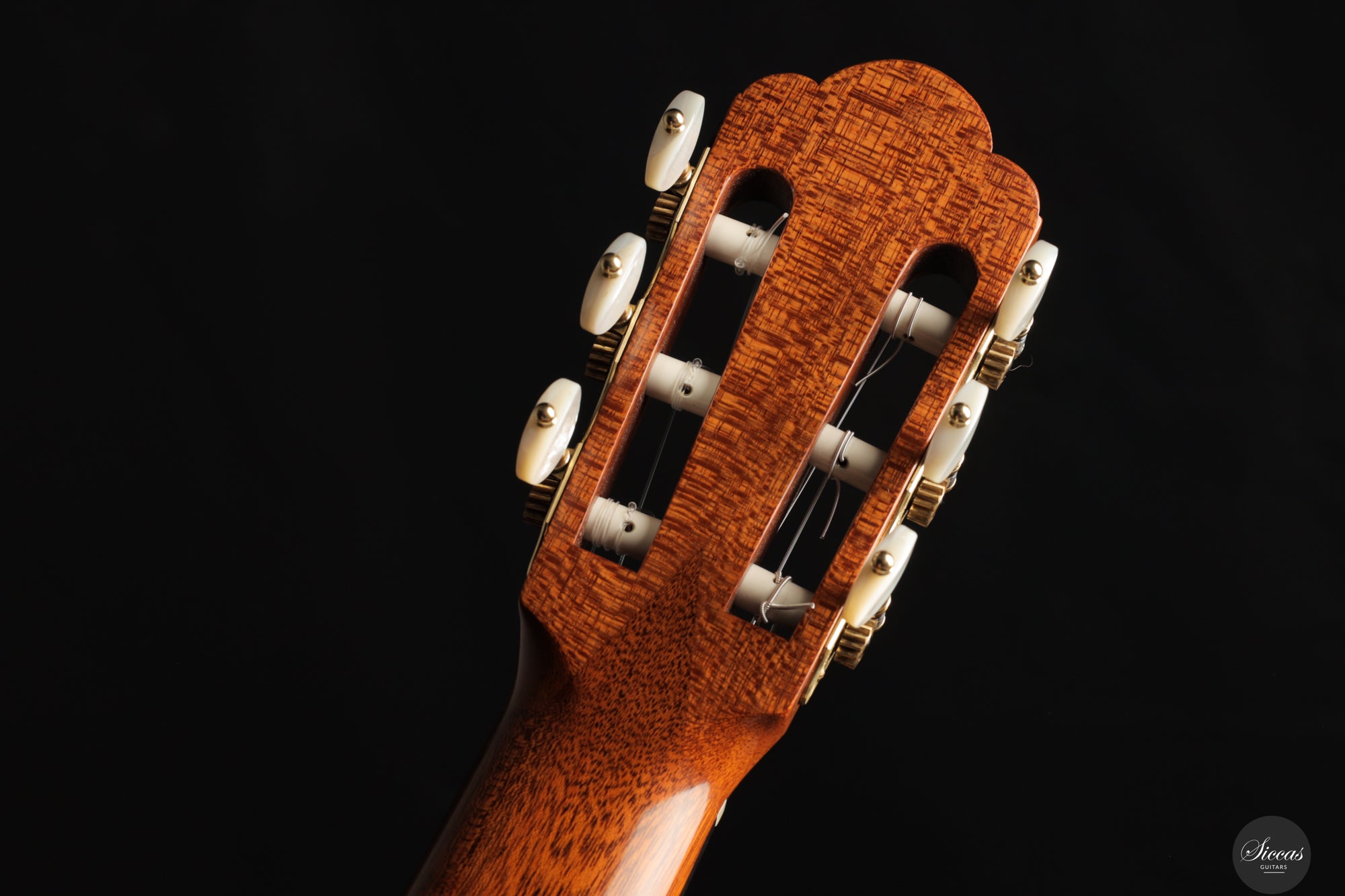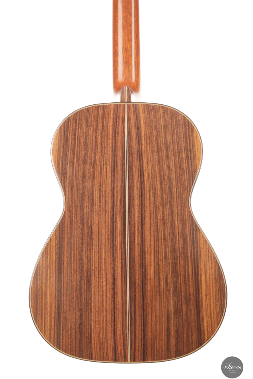 Diese Gitarre aus dem Jahr 2024 mit der Seriennummer 374 basiert auf einem Instrument von Herrmann Hauser I aus dem Jahr 1940, das von Julian Bream gegen Ende seiner internationalen Tournee-Karriere gespielt und aufgenommen wurde und an dem Southwell eng mit Julian Bream zusammengearbeitet hat. Sie besticht durch ihre besonders leichte Bauweise, eine fein gearbeitete Fichtendecke und Boden und Zargen aus indischem Palisander. Dank der niedrigen Korpusresonanz entwickeln die Basstöne eine bemerkenswerte Freiheit, ohne an Klarheit zu verlieren. Der Klang bleibt über das gesamte Griffbrett präzise und kontrolliert. Besonders erwähnenswert sind die runden, präzisen Höhen, die perfekt mit den mittleren und tiefen Frequenzen harmonieren. Diese Eigenschaften sorgen für einen gleichmäßigen Klang mit hervorragender Trennung, der dennoch warm und voll bleibt. Die Gitarre bietet unzählige Möglichkeiten zur Gestaltung der Klangfarbe und reagiert sehr sensibel auf unterschiedliche Spieltechniken. Gary demonstriert hier seine meisterhafte Handwerkskunst und seine Leidenschaft für außergewöhnliche Instrumente in Perfektion.