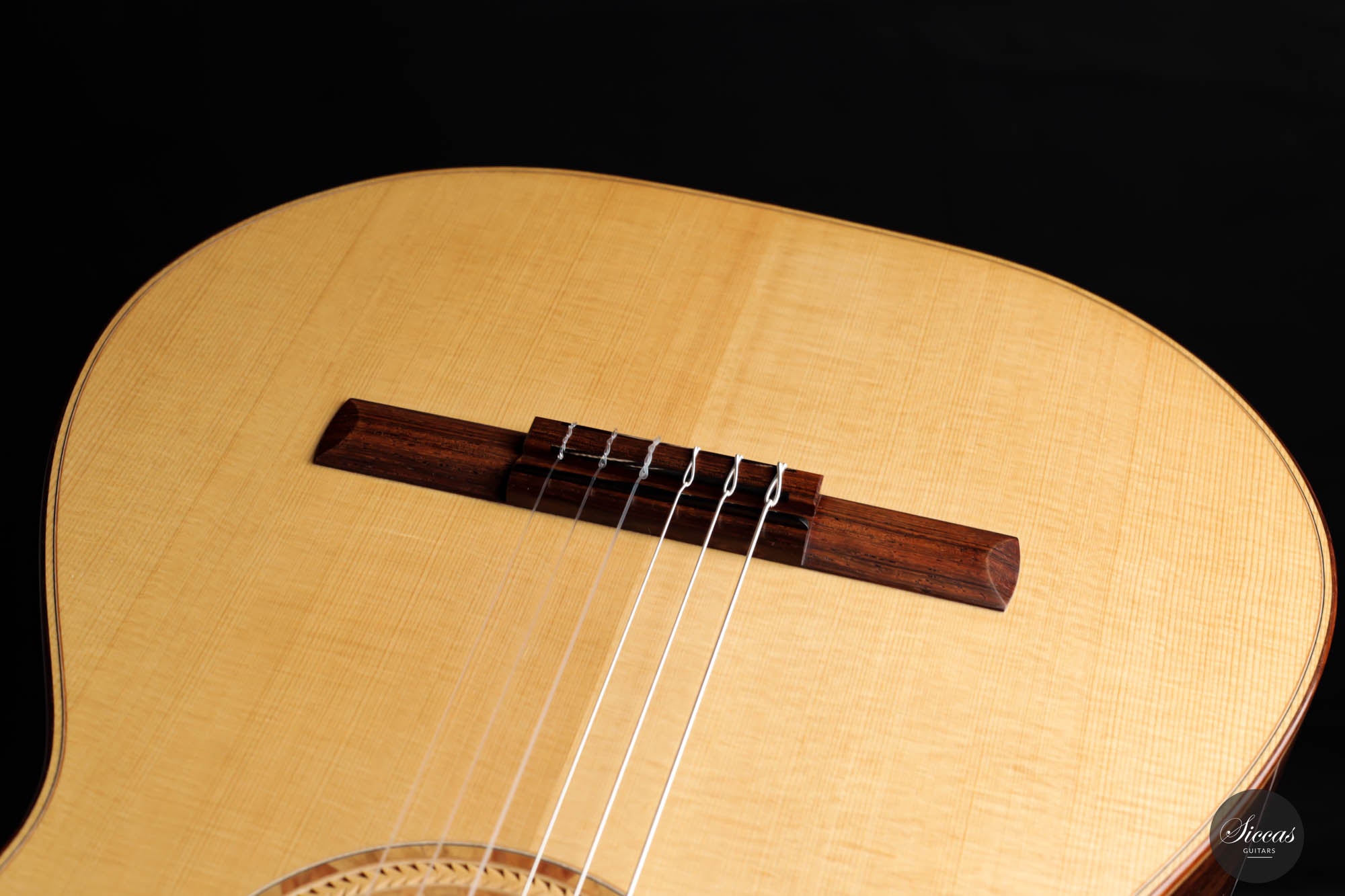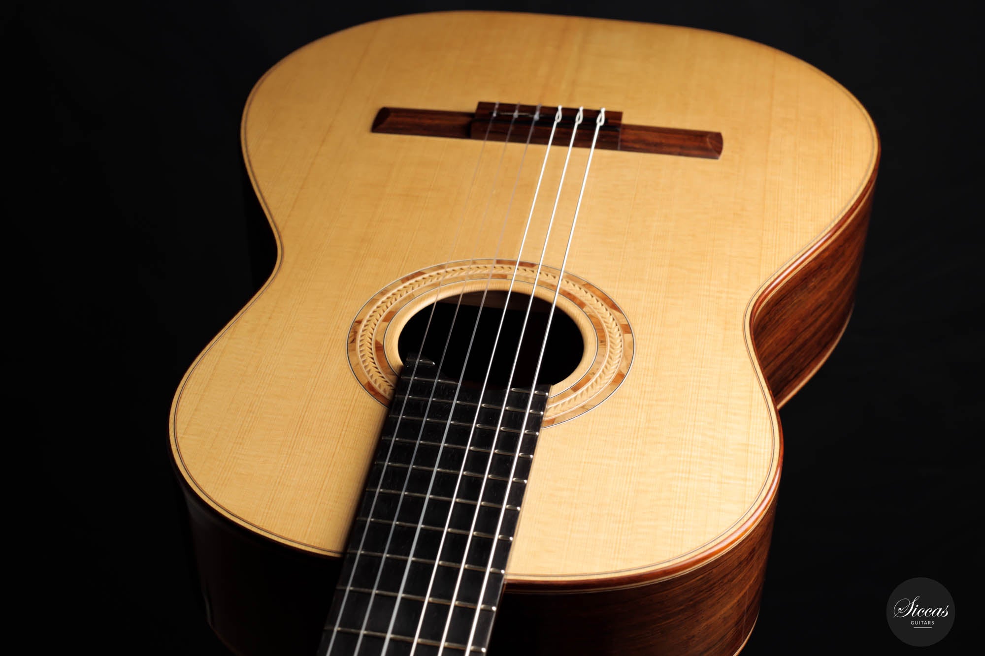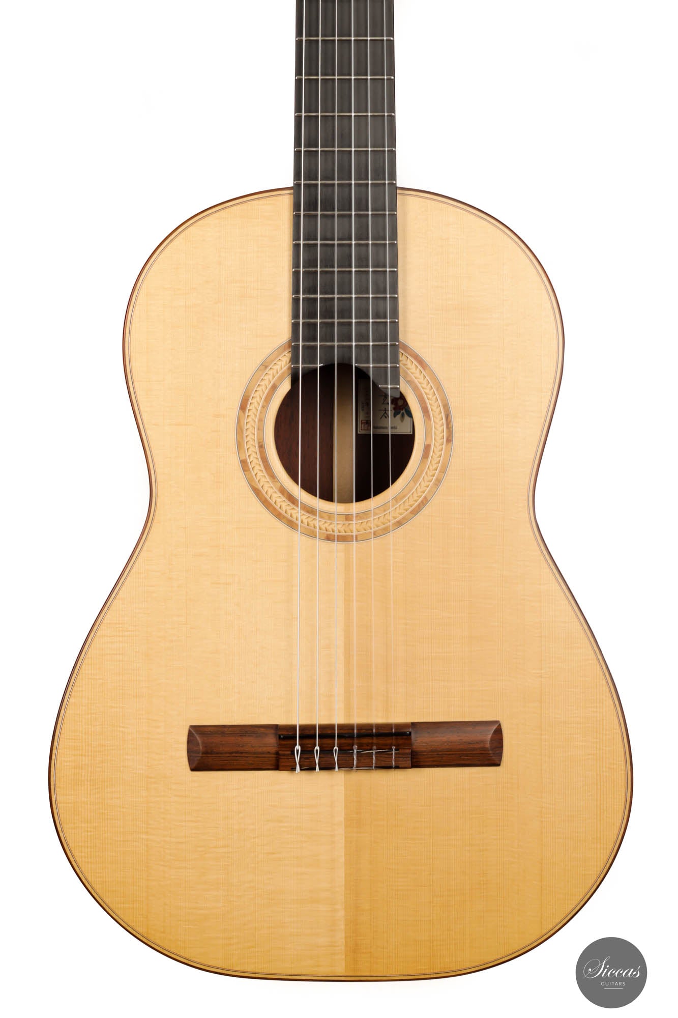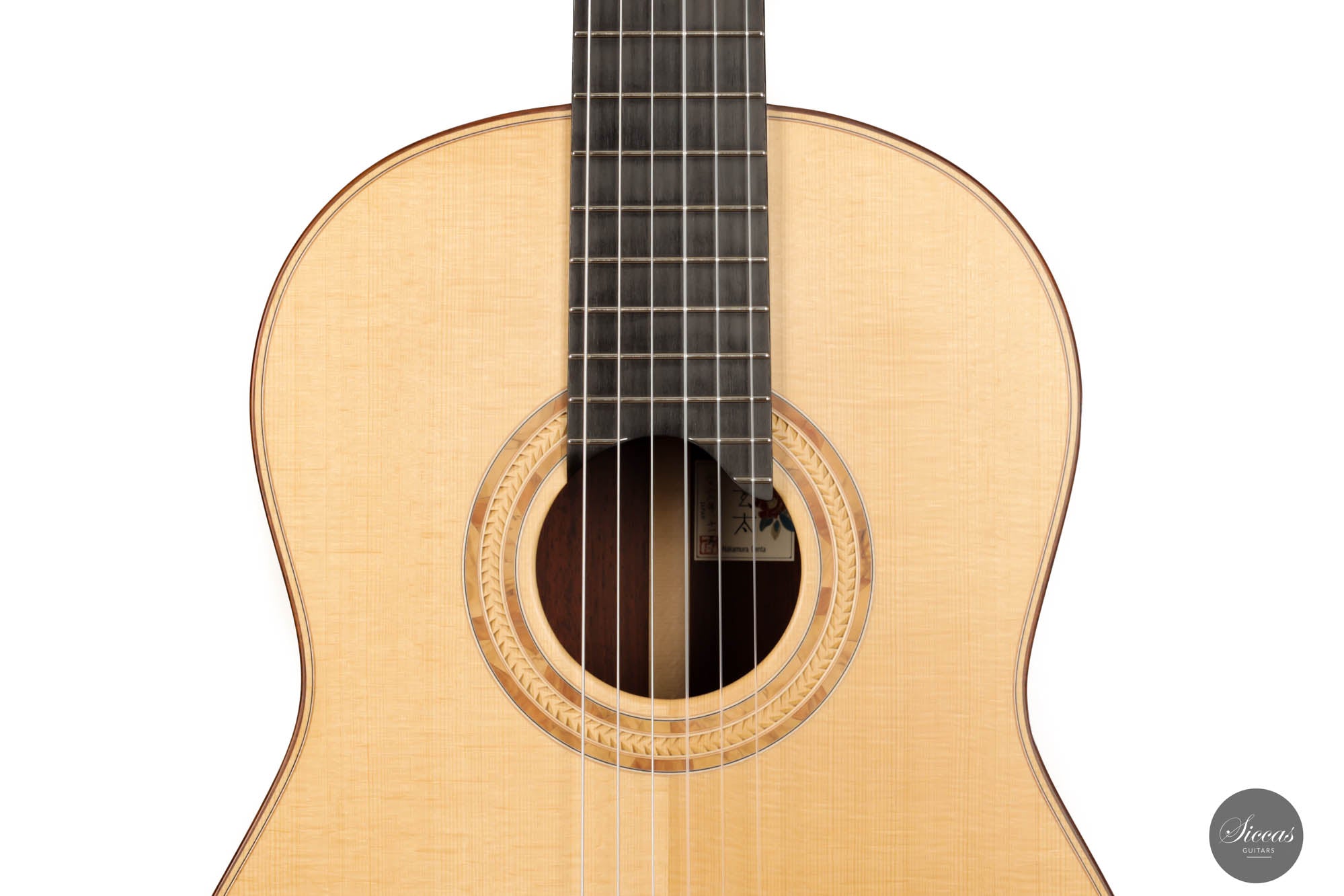 This beautiful brand-new guitar from a young and talented guitar maker has stunned us since the first time we opened the case. The amount of effort spent on making this guitar is just astonishing. Every little detail was done to the highest level of precision; for example, the carved rosette was done entirely by hand. It shows Genta's talent as a fantastic craftsman. The spruce soundboard has four fan bracing systems underneath and striking cocobolo back and sides. Furthermore, it was assembled using the traditional Spanish method. The crystal-clear trebles and lively basses reveal various views and expressions as the guitar is played.