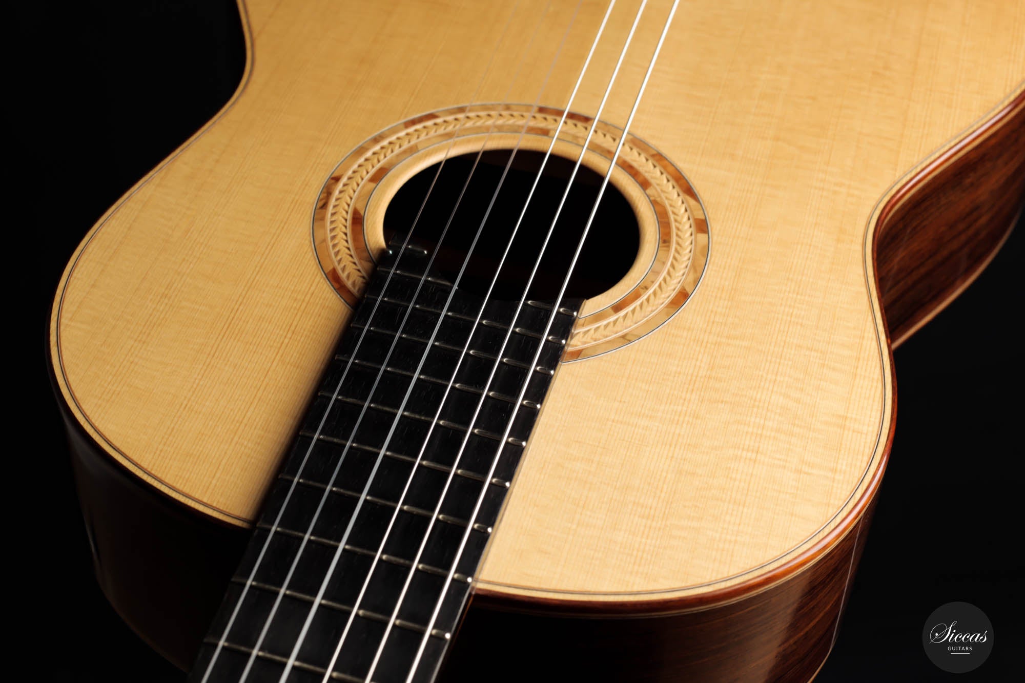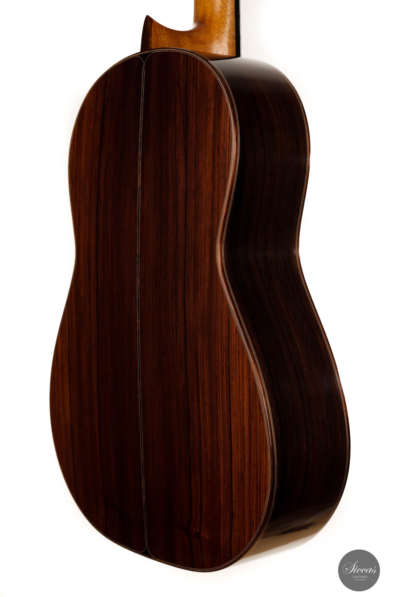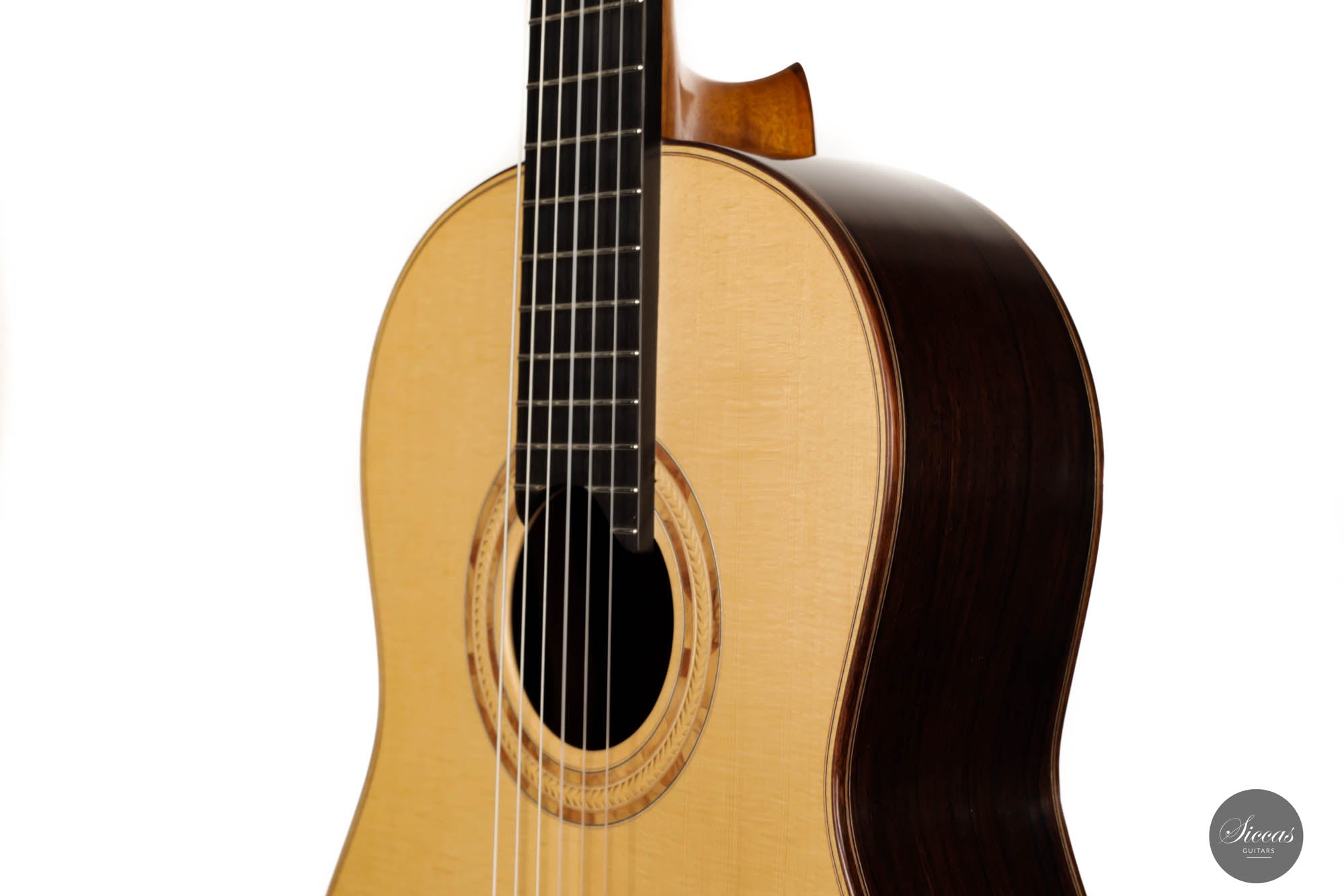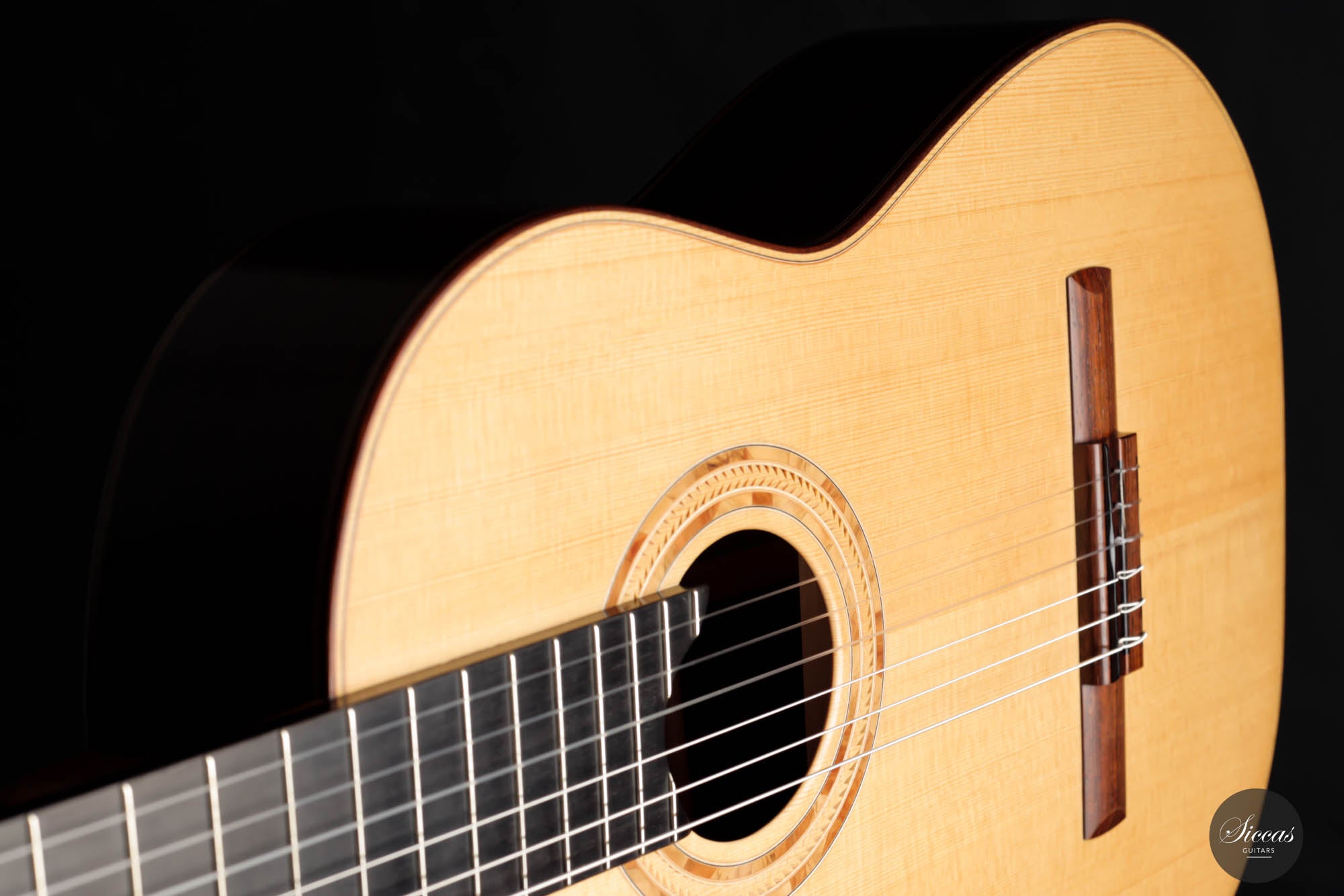 This beautiful brand-new guitar from a young and talented guitar maker has stunned us since the first time we opened the case. The amount of effort spent on making this guitar is just astonishing. Every little detail was done to the highest level of precision; for example, the carved rosette was done entirely by hand. It shows Genta's talent as a fantastic craftsman. The spruce soundboard has four fan bracing systems underneath and striking cocobolo back and sides. Furthermore, it was assembled using the traditional Spanish method. The crystal-clear trebles and lively basses reveal various views and expressions as the guitar is played.