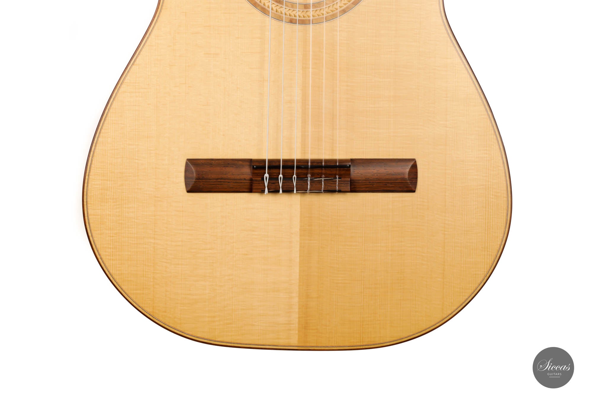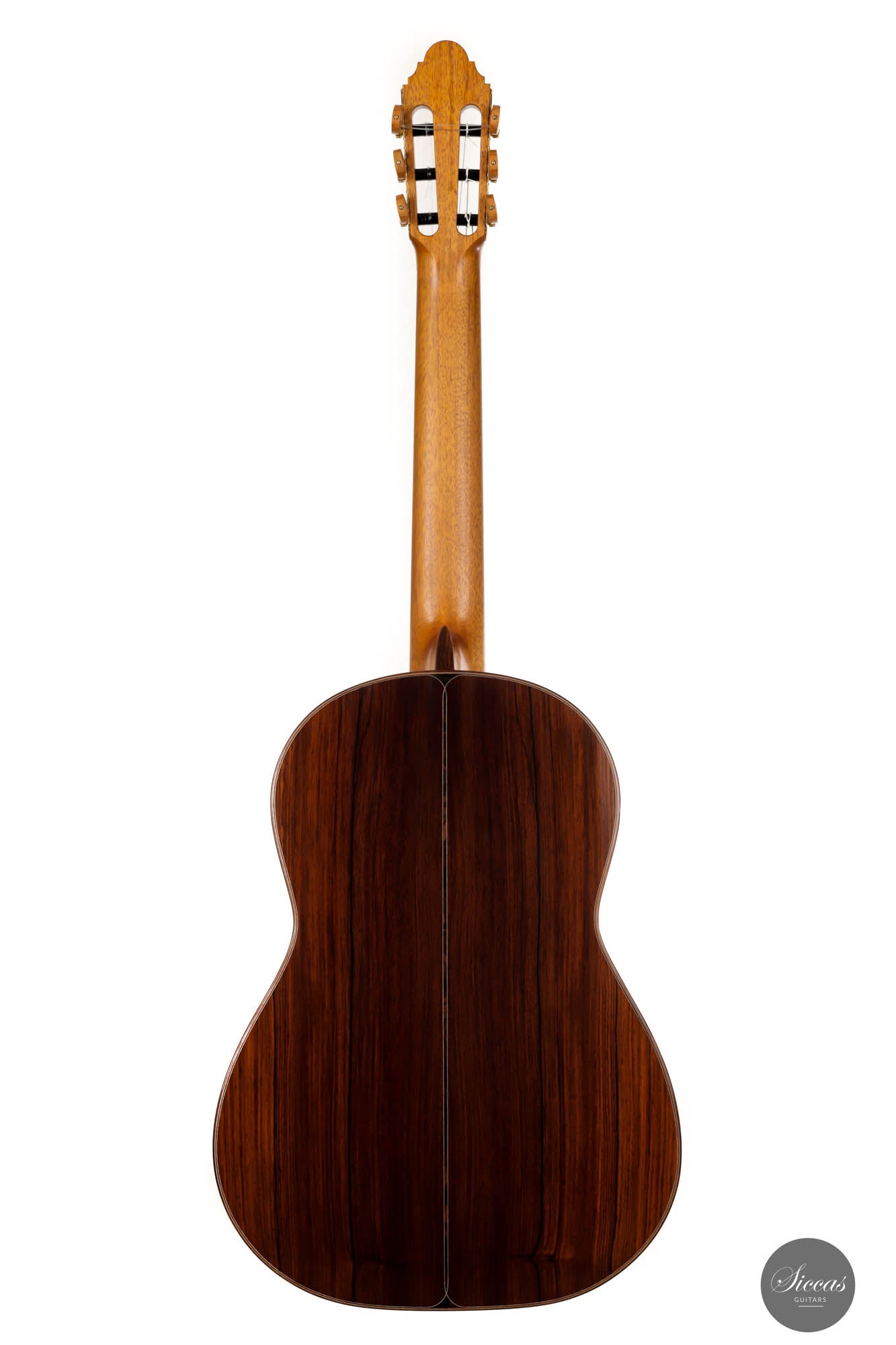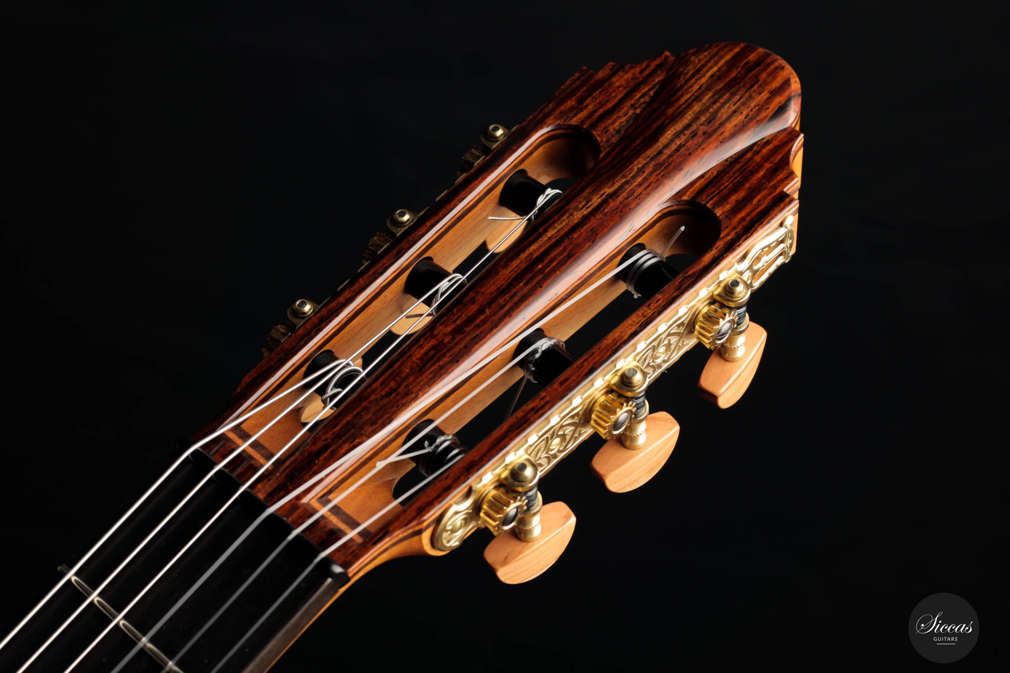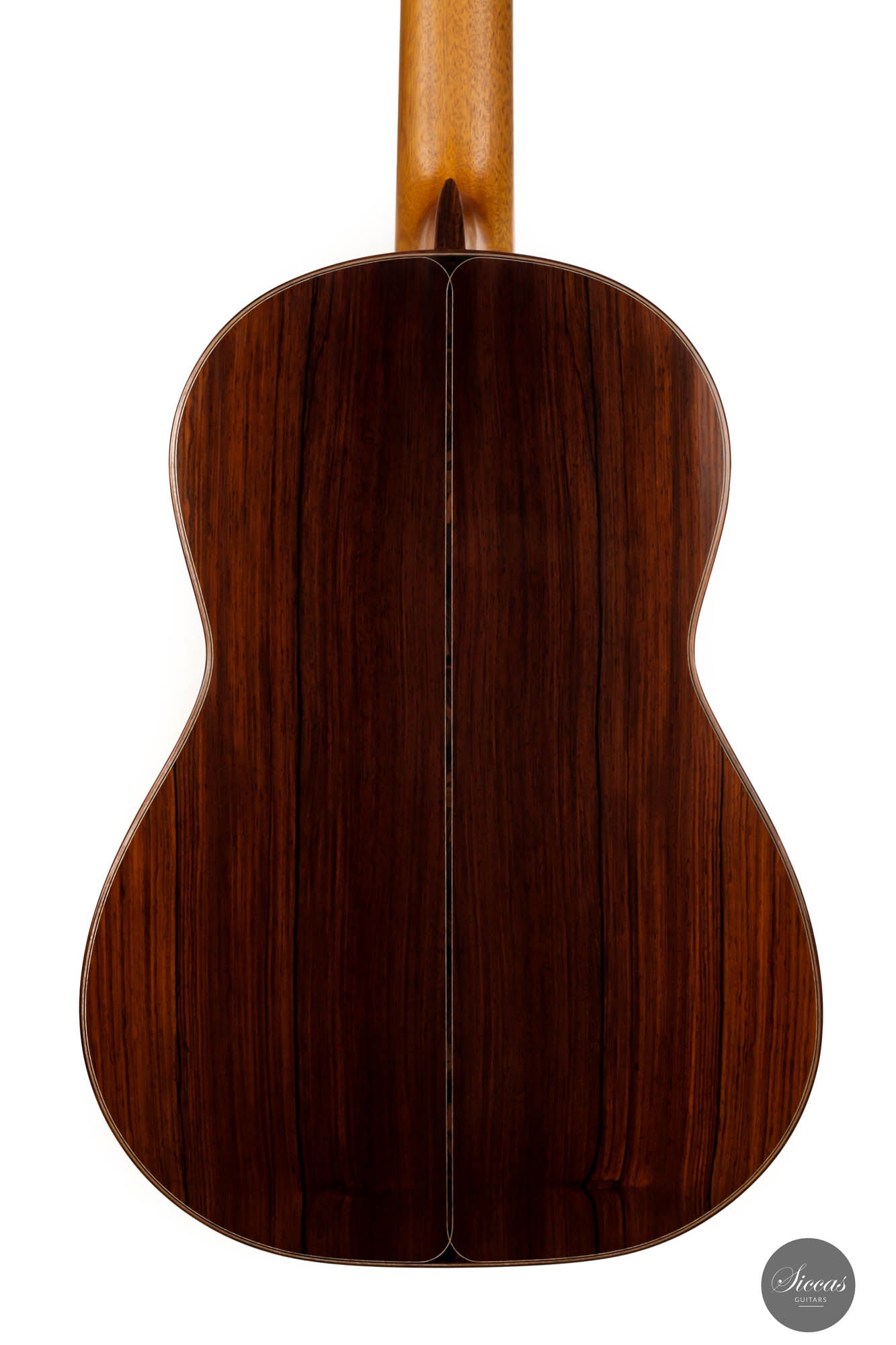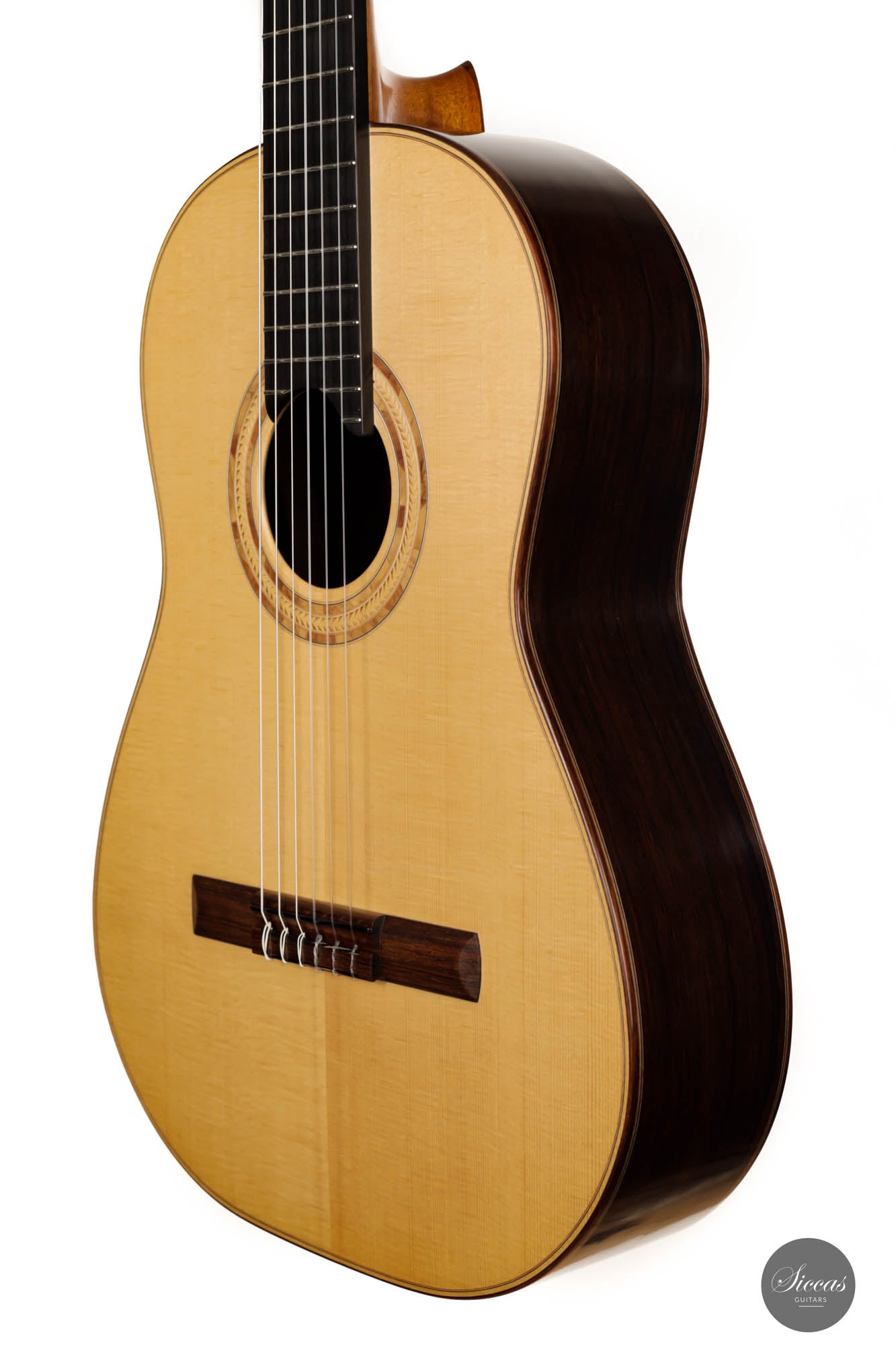 This beautiful brand-new guitar from a young and talented guitar maker has stunned us since the first time we opened the case. The amount of effort spent on making this guitar is just astonishing. Every little detail was done to the highest level of precision; for example, the carved rosette was done entirely by hand. It shows Genta's talent as a fantastic craftsman. The spruce soundboard has four fan bracing systems underneath and striking cocobolo back and sides. Furthermore, it was assembled using the traditional Spanish method. The crystal-clear trebles and lively basses reveal various views and expressions as the guitar is played.