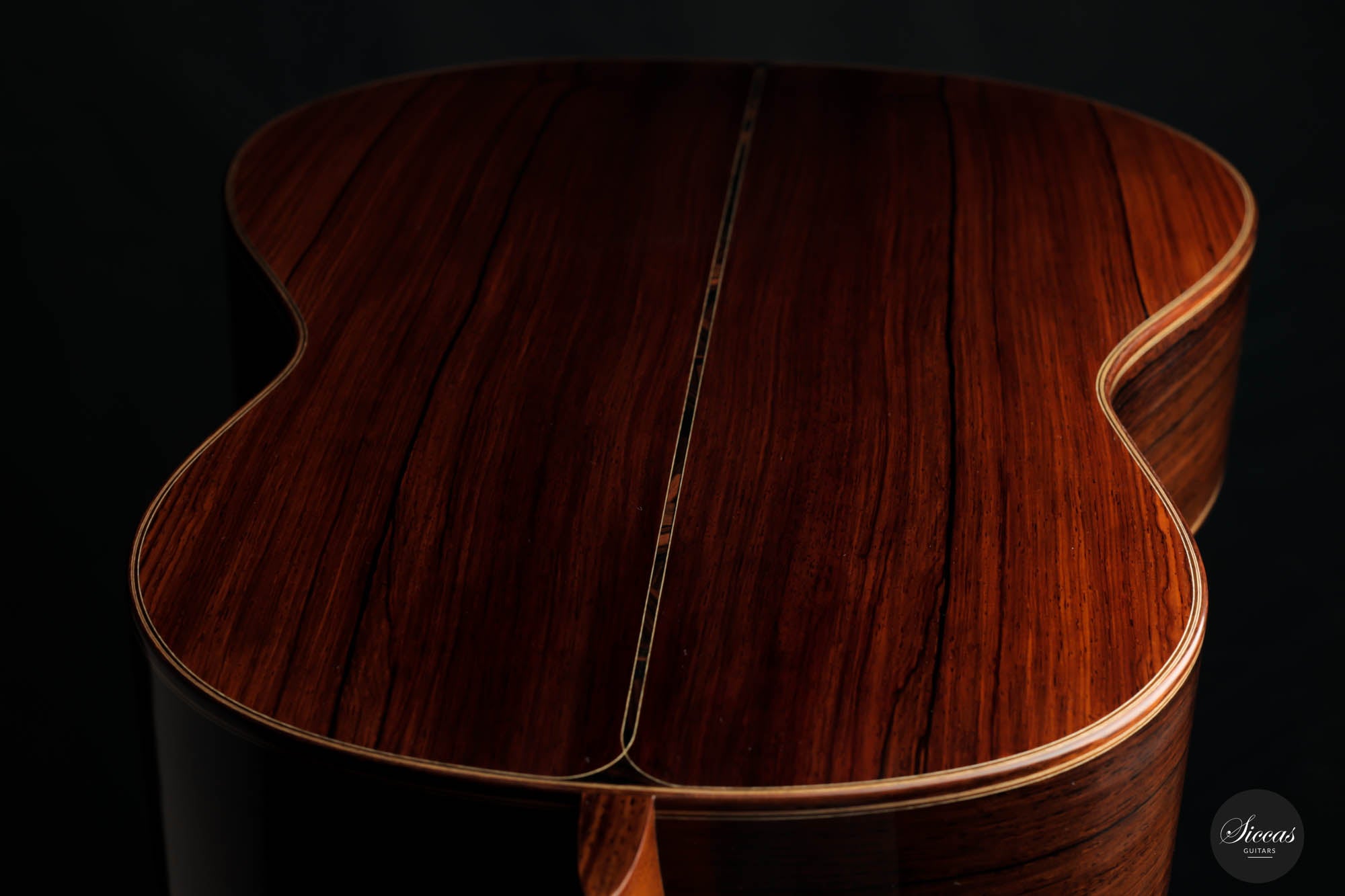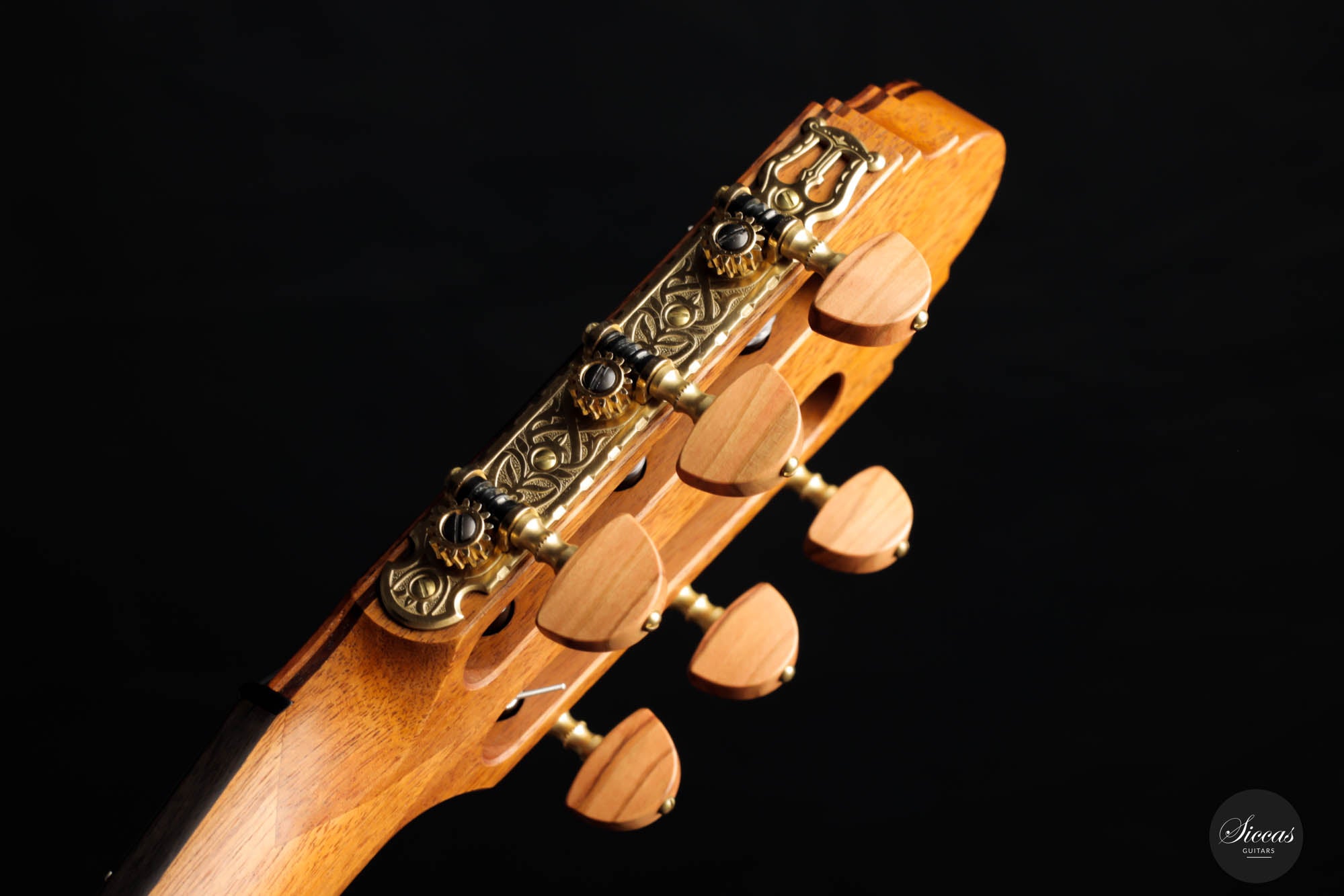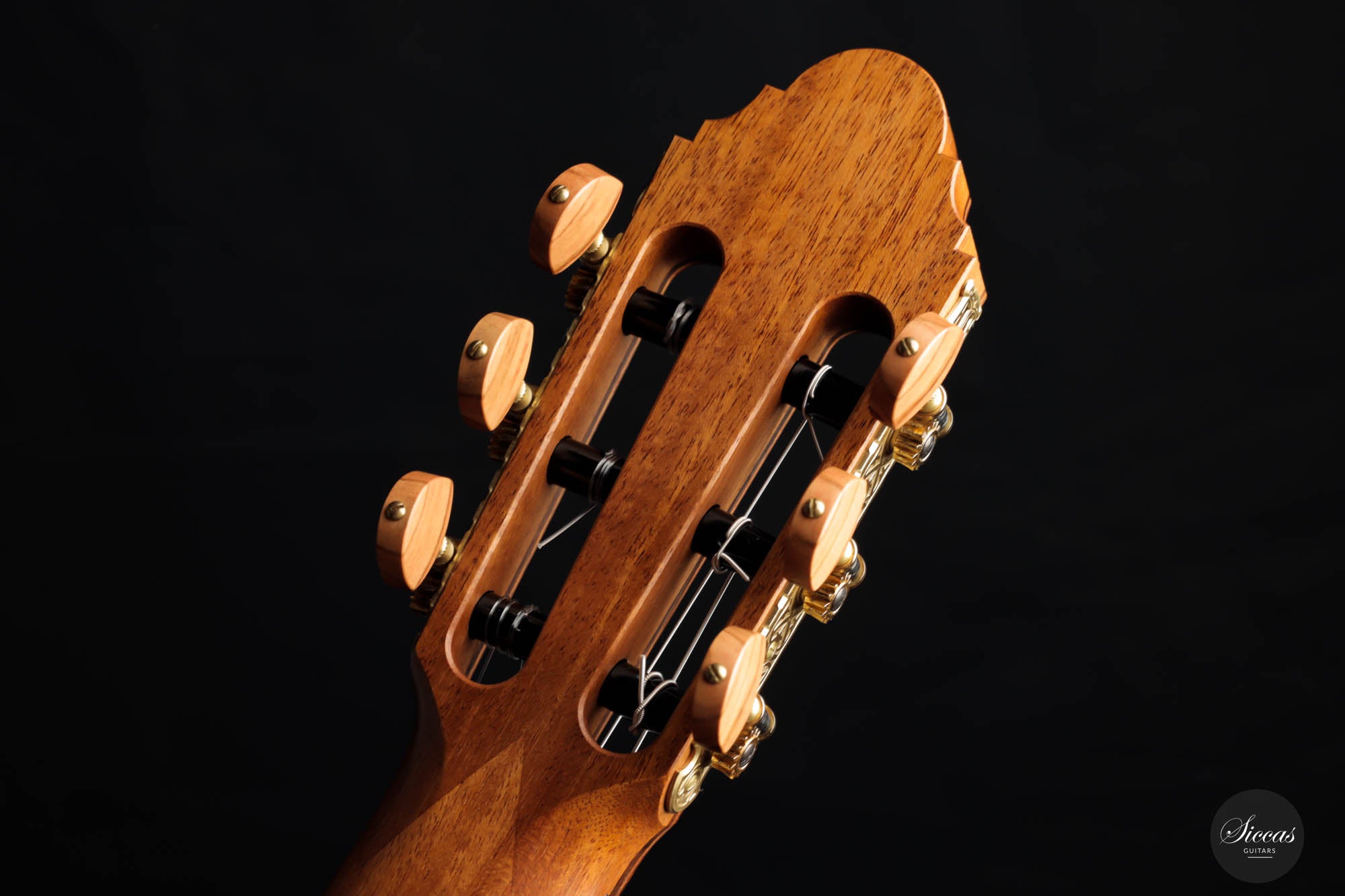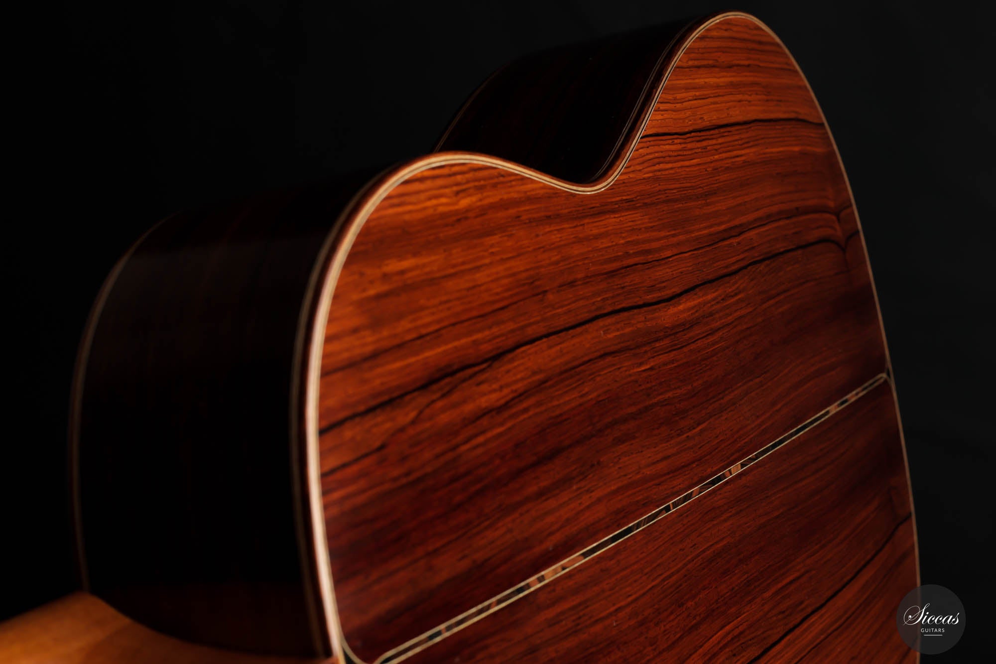This beautiful brand-new guitar from a young and talented guitar maker has stunned us since the first time we opened the case. The amount of effort spent on making this guitar is just astonishing. Every little detail was done to the highest level of precision; for example, the carved rosette was done entirely by hand. It shows Genta's talent as a fantastic craftsman. The spruce soundboard has four fan bracing systems underneath and striking cocobolo back and sides. Furthermore, it was assembled using the traditional Spanish method. The crystal-clear trebles and lively basses reveal various views and expressions as the guitar is played.