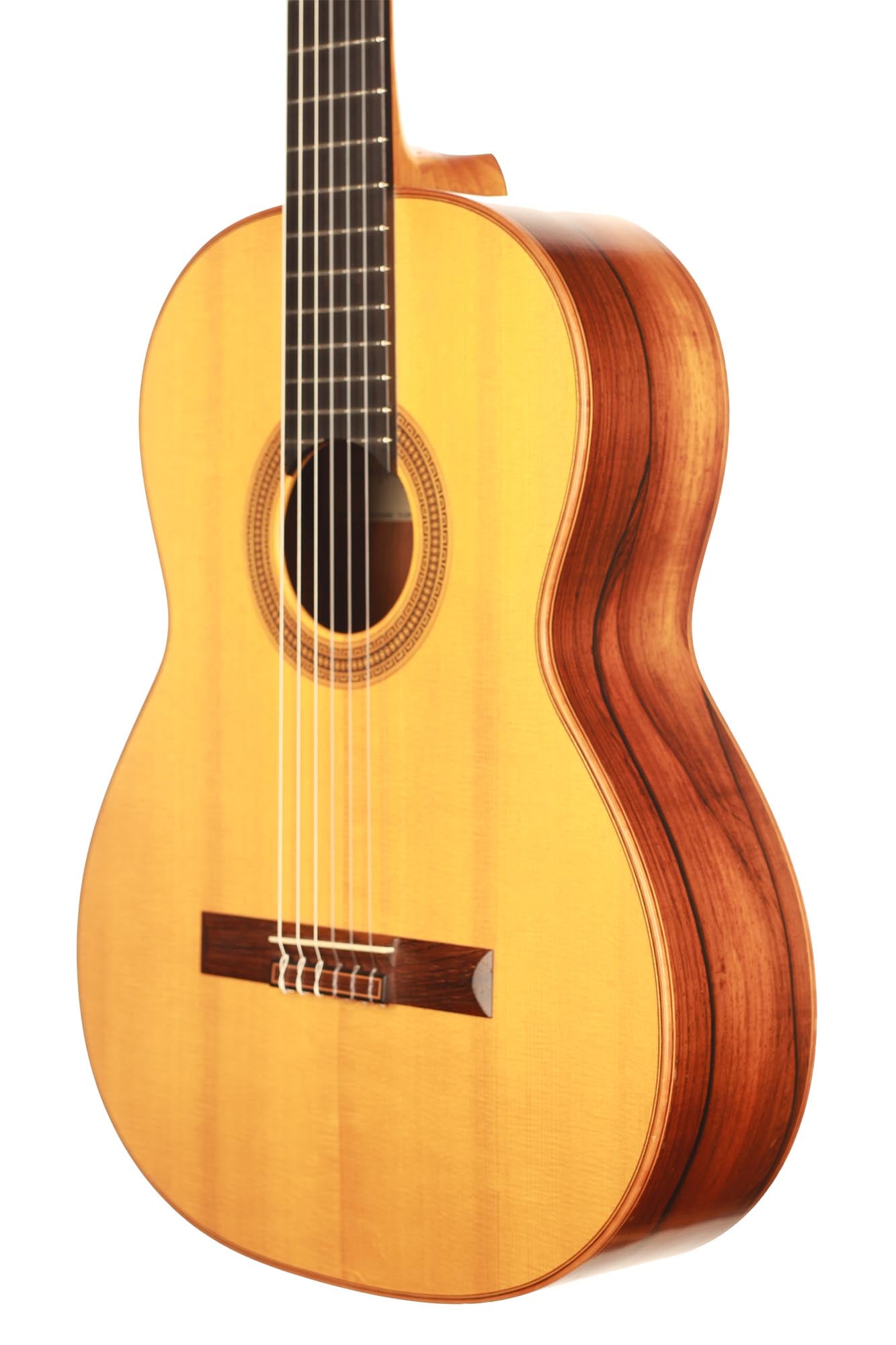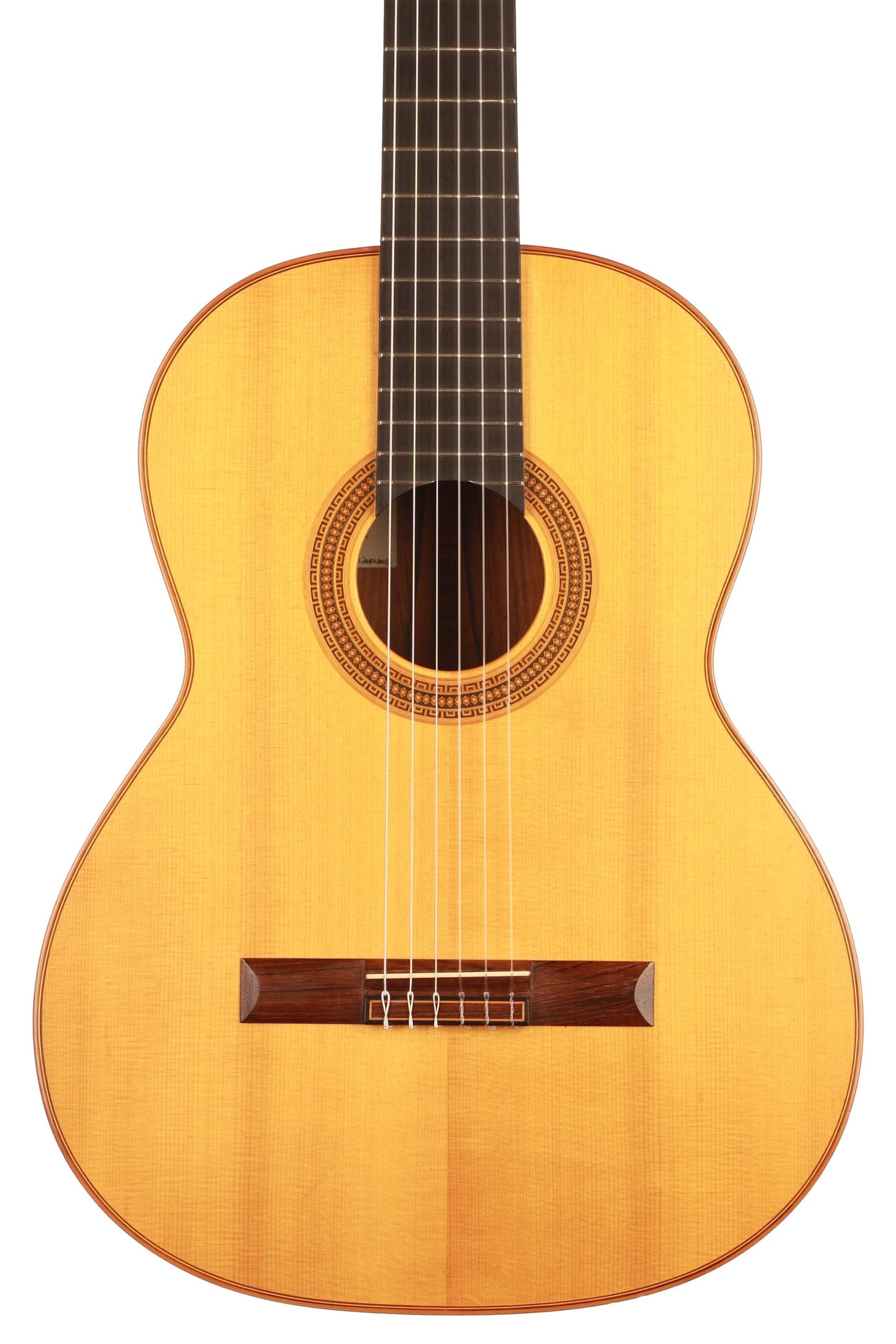 Diese 1992 gebaute Gitarre ist in ausgezeichnetem Zustand, frei von Rissen und weist nur sehr wenige oberflächliche Spielspuren auf. Sie wurde mit wunderschönem CITES-zertifiziertem brasilianischem Palisander und erstklassigen Rodgers-Tuning-Maschinen gebaut. Das komplexe innere Verstrebung wurde von der Konstruktion seiner erfolgreichen Akustikgitarren inspiriert und so angepasst, dass die Decke so frei wie möglich schwingen kann. Das Ergebnis ist ein sehr ausgewogenes und kraftvolles Instrument mit einer wirklich einzigartigen Klangfarbe. Diese Gitarre wurde intensiv gespielt und klingt daher sehr offen und frei. Sie hat einen voluminösen Klang mit sofortiger Ansprache und einen außergewöhnlich satten Klang. Tiefe, vollmundige Bässe verbinden sich perfekt mit den abgerundeten Höhen; insgesamt ein wahres Meisterwerk.