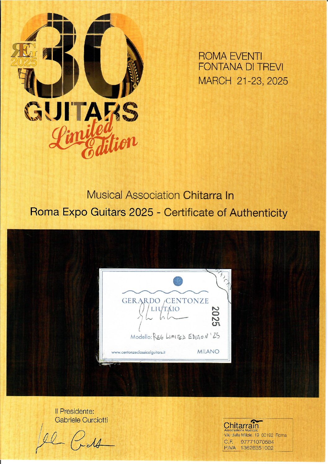 Gerardo Centonze, geboren 1986 in Tarent, Italien, ist ein renommierter Gitarrenbauer, bekannt für seine außergewöhnliche Handwerkskunst im Gitarrenbau. Ursprünglich als Autodidakt begonnen, startete seine formale Laufbahn in der Lautenmacherei 2013 an der Städtischen Schule für Lautenbau in Mailand, wo er die Bauweisen verschiedener Zupfinstrumente meisterte. 2017 wurde Centonzes Hingabe und Geschick mit einem Diplom als Meister-Lautenmacher anerkannt. Unter der Anleitung von Maestro Mirko Borghino vertiefte er sich weiter in den Bau von Archtop- und Akustikgitarren. Nach seiner Rückkehr nach Mailand im Jahr 2018 vertiefte Centonze seine Expertise im klassischen Gitarrenbau während einer bedeutenden Tätigkeit in der Werkstatt von Maestro Lorenzo Lippi. Diese Periode markierte nicht nur eine Verfeinerung seiner Technik, sondern auch die Gründung seiner eigenen Werkstatt in Mailand, wo er begann, klassische Gitarren zu bauen und alte Instrumente zu restaurieren. Seine Arbeit erlangte bemerkenswerte Anerkennung auf der Rome Expo Guitar (REG) 2021 und 2022 und im Jahr 2023 wurde ihm der 3. Preis beim „VI Marin Montero Gitarrenbauwettbewerb“ verliehen. Centonzes Bauweise, stark beeinflusst von der großen spanischen Schule, zeichnet sich durch sorgfältige Detailarbeit und ein zeitgenössisches ästhetisches Empfinden aus. Sein Engagement für traditionelles Handwerk zeigt sich in der Verwendung von Schellackpolitur für alle seine Instrumente, was eine perfekte Mischung aus klassischen Techniken und modernem Design darstellt.