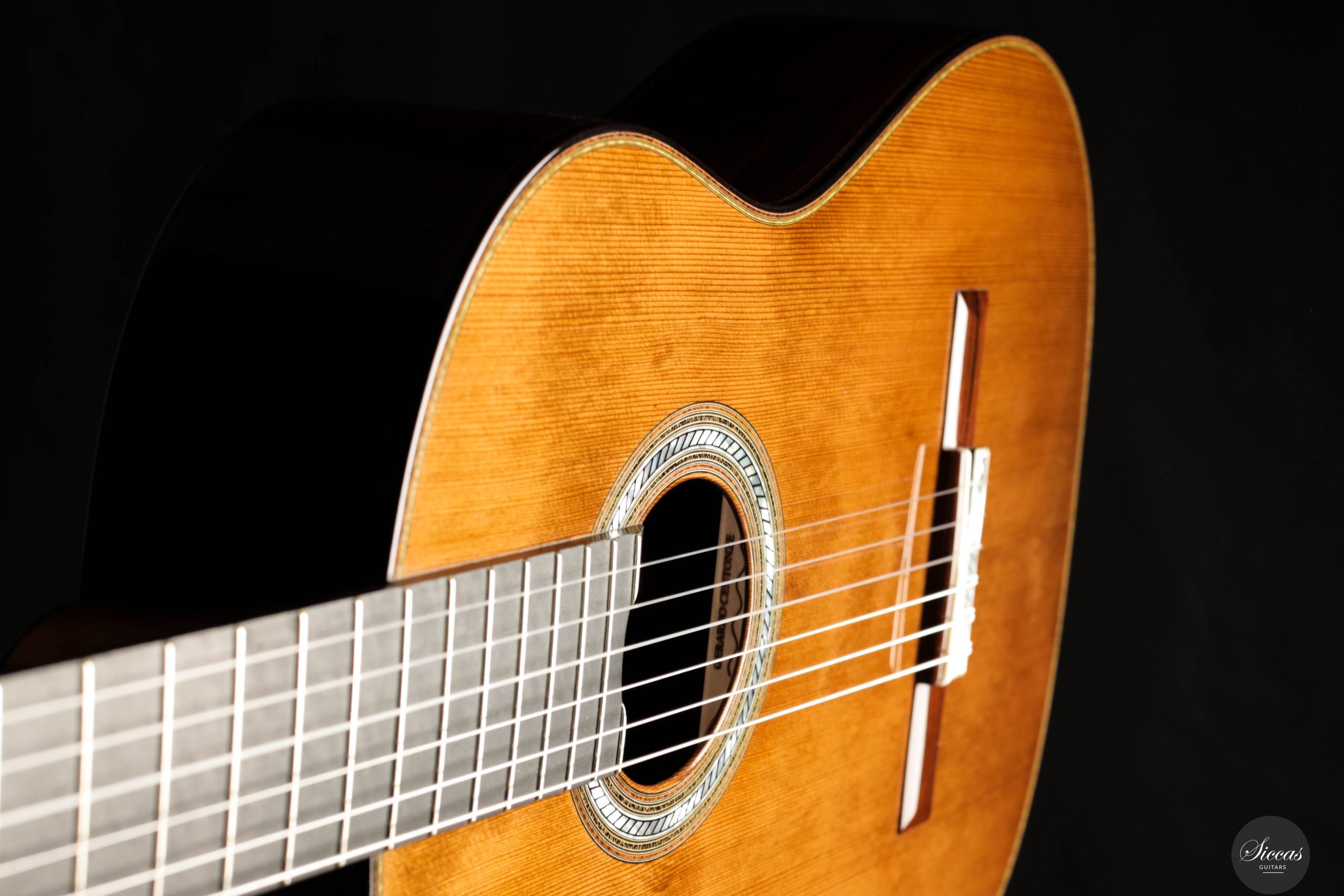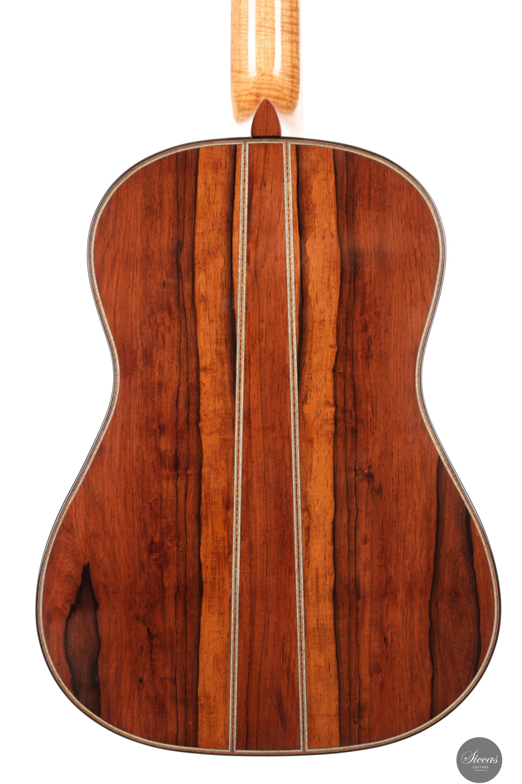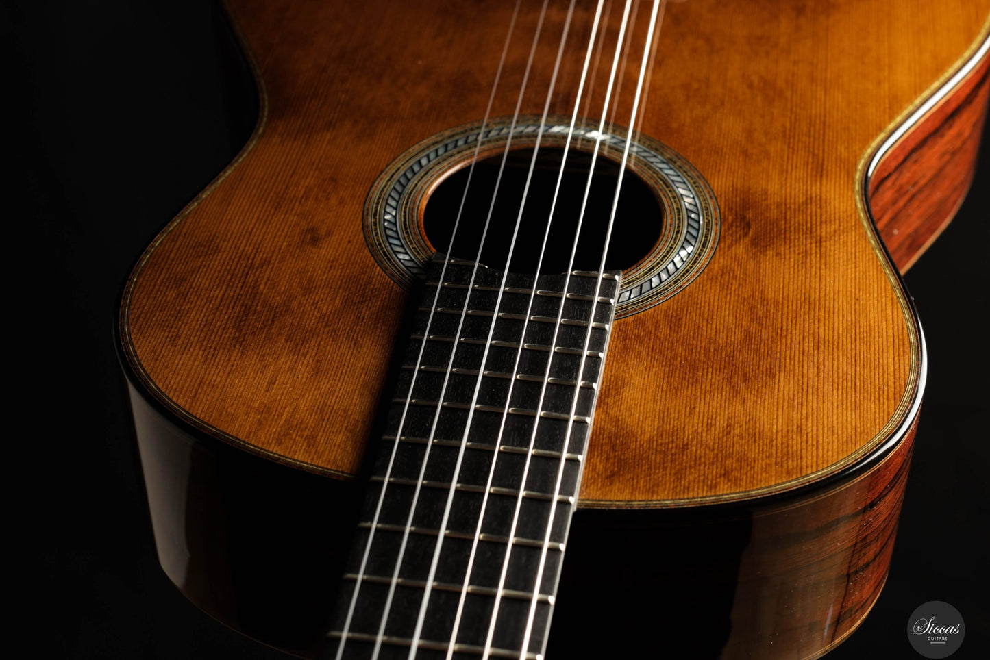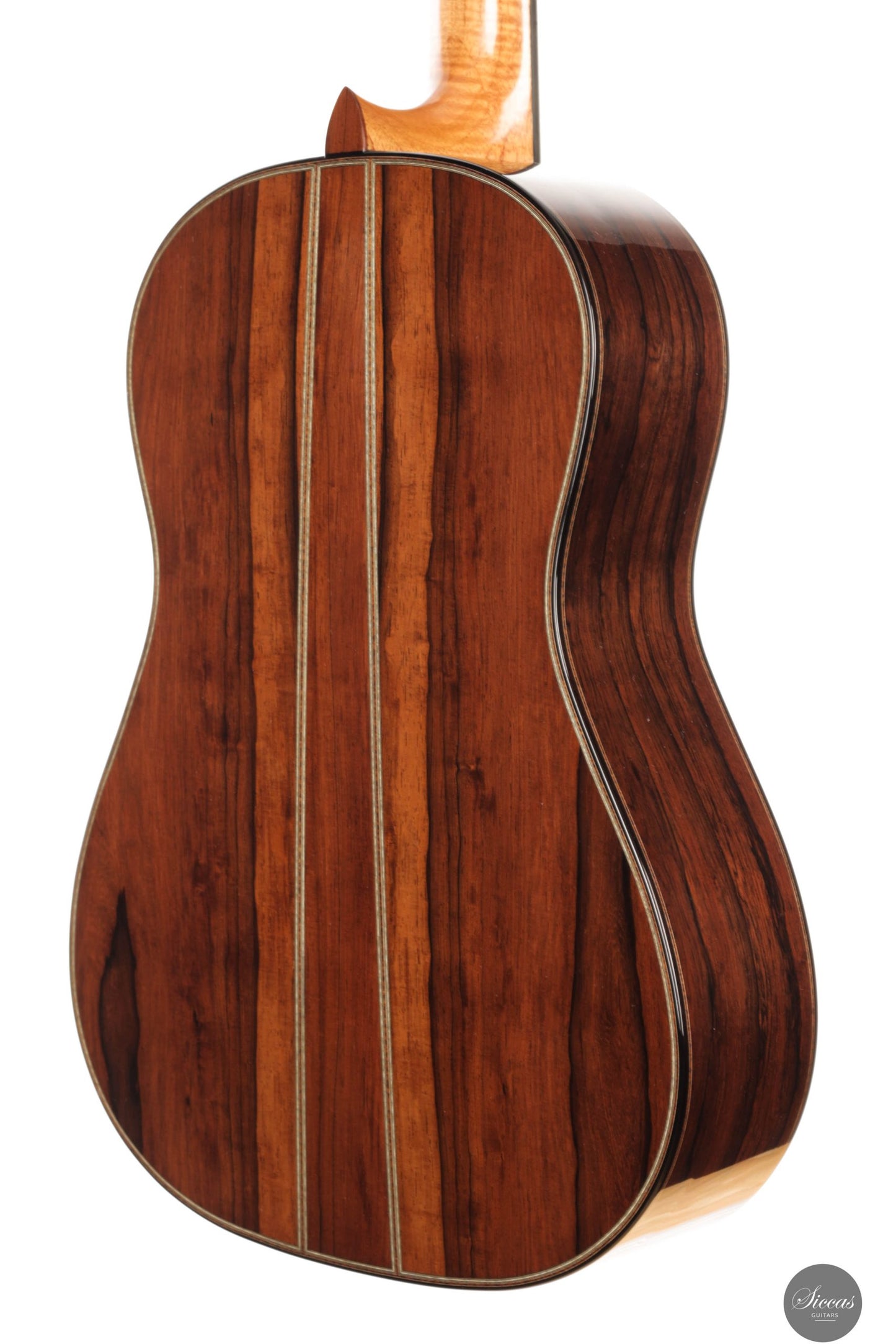 Die Decke besteht aus dunklem, hervorragend abgelagertem kanadischen Zedernholz aus dem Jahr 1982, das aus dem Bestand eines inzwischen pensionierten Geigen- und Gitarrenbauers stammt. Für Boden und Zargen wurde hochwertiges Palisander aus Madagaskar verwendet, der Hals ist aus geflammtem spanischen Zedernholz gefertigt – Materialien, die sowohl Stabilität als auch ästhetische Schönheit garantieren.