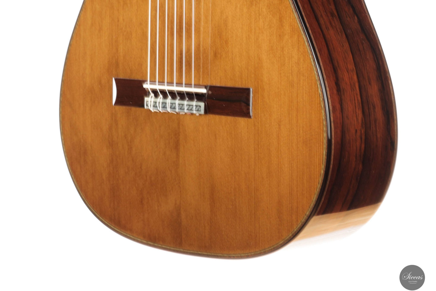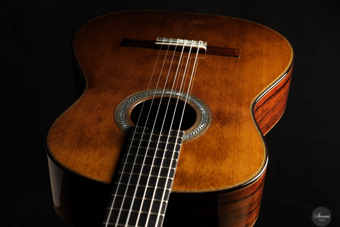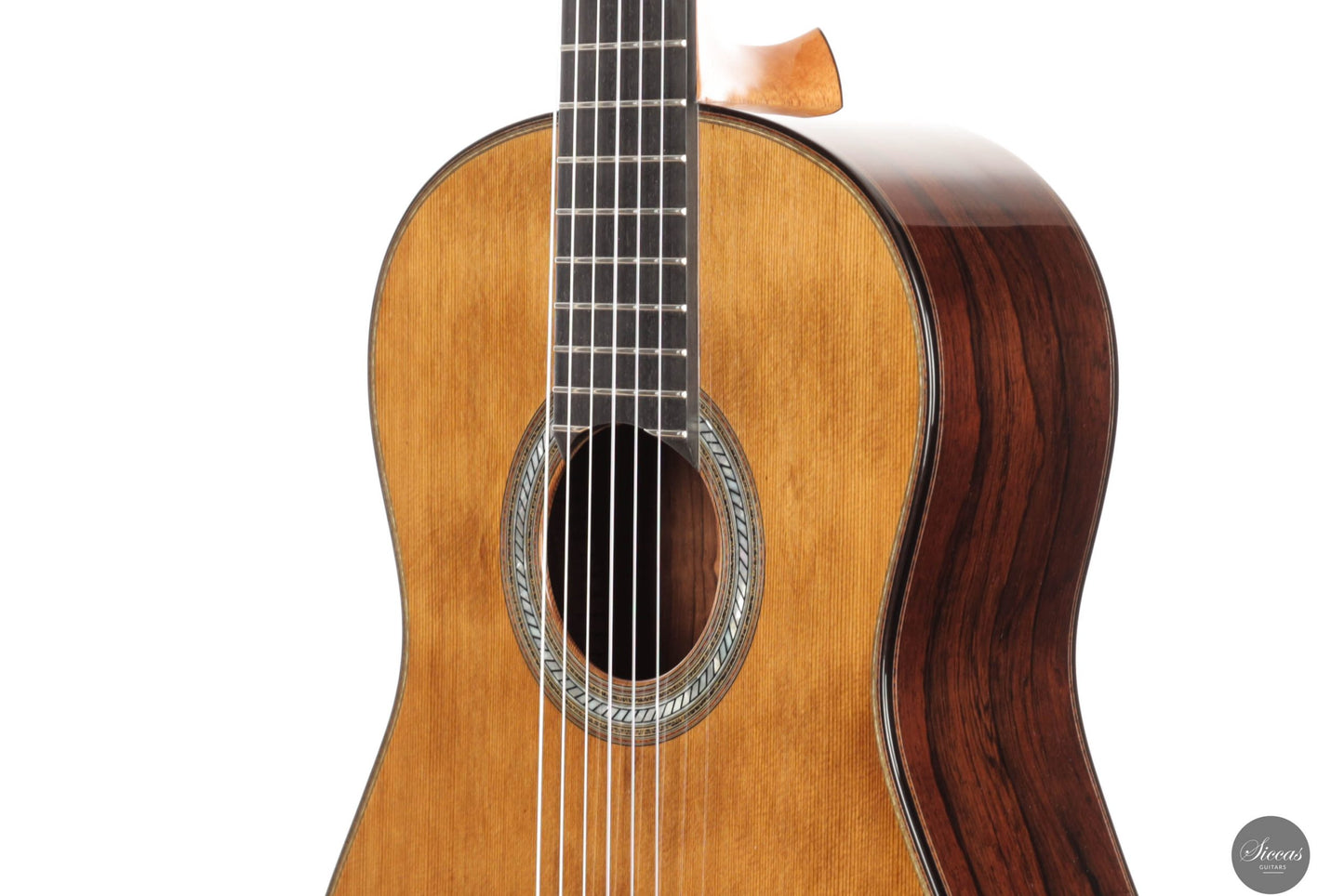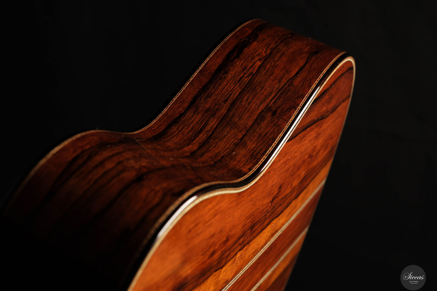 Die Decke besteht aus dunklem, hervorragend abgelagertem kanadischen Zedernholz aus dem Jahr 1982, das aus dem Bestand eines inzwischen pensionierten Geigen- und Gitarrenbauers stammt. Für Boden und Zargen wurde hochwertiges Palisander aus Madagaskar verwendet, der Hals ist aus geflammtem spanischen Zedernholz gefertigt – Materialien, die sowohl Stabilität als auch ästhetische Schönheit garantieren.
