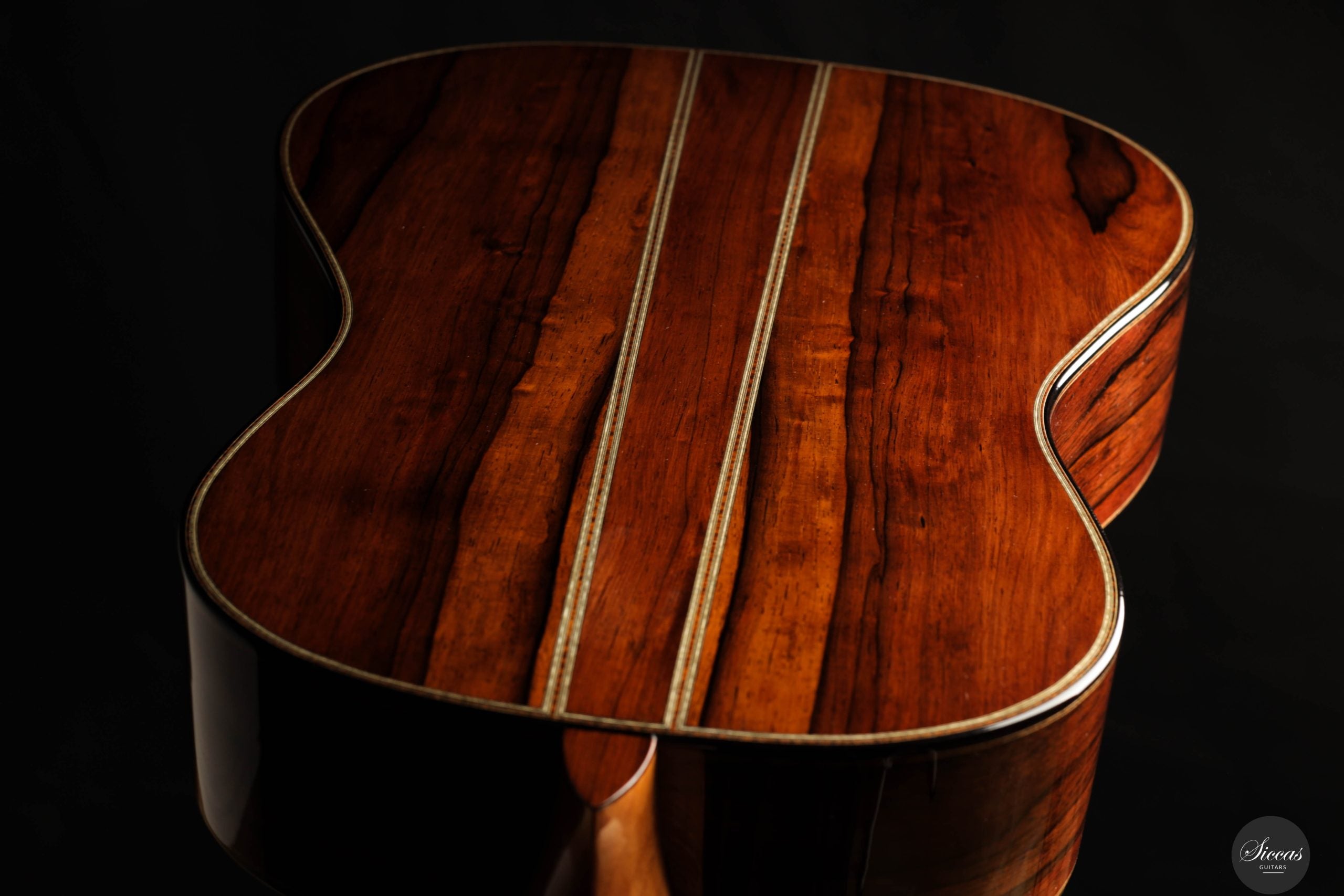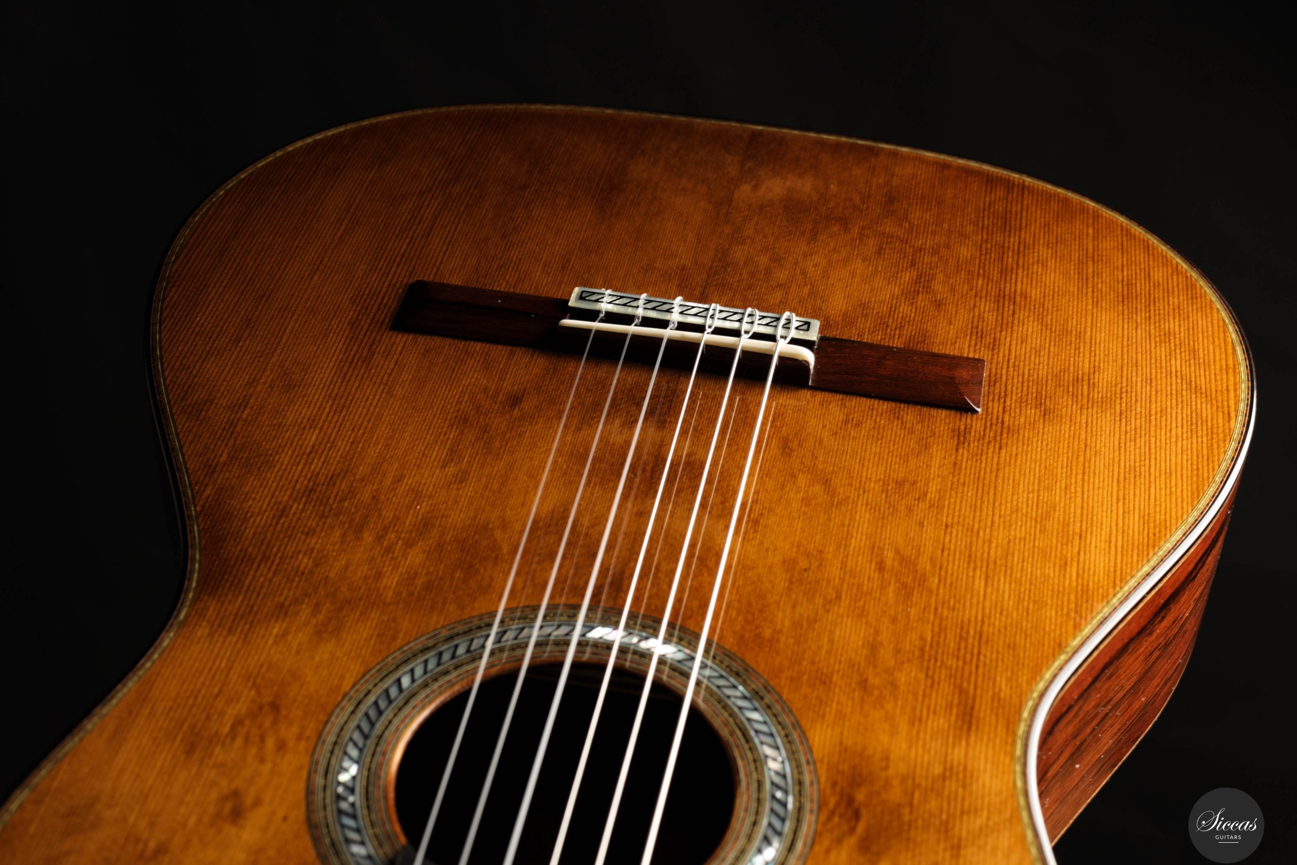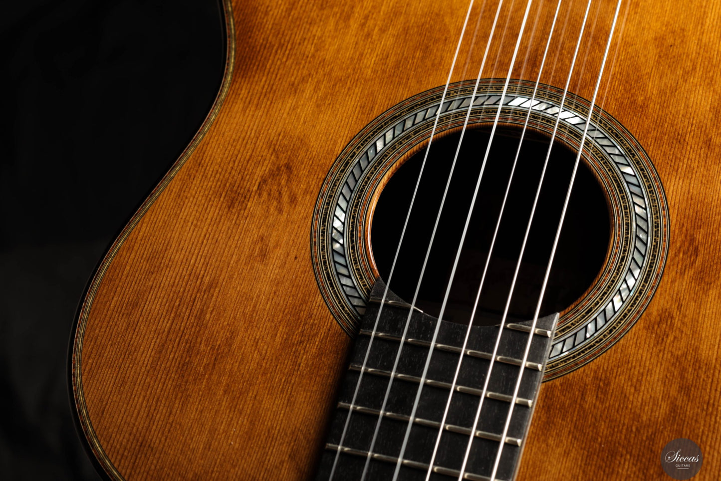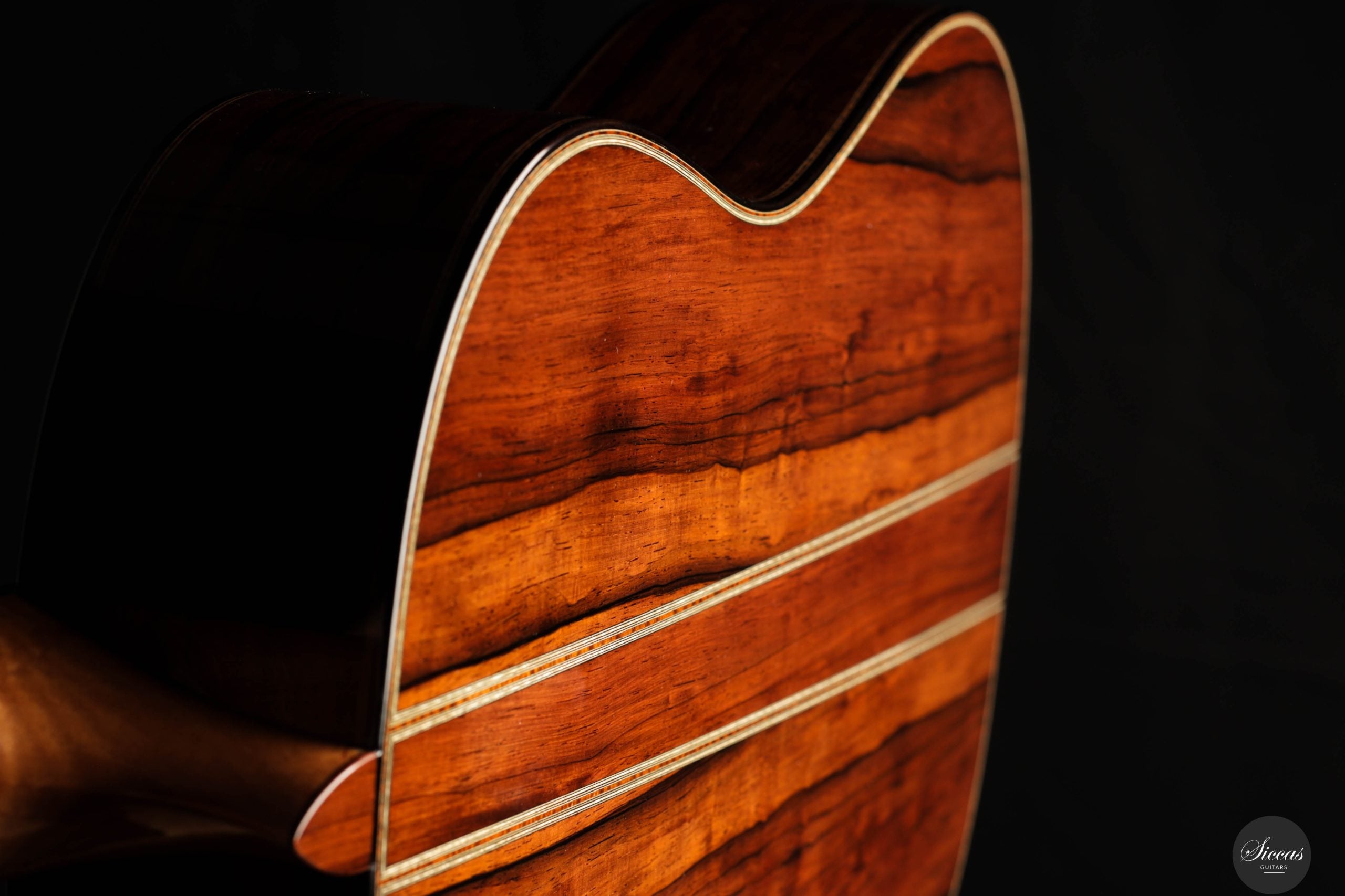 Die Decke besteht aus dunklem, hervorragend abgelagertem kanadischen Zedernholz aus dem Jahr 1982, das aus dem Bestand eines inzwischen pensionierten Geigen- und Gitarrenbauers stammt. Für Boden und Zargen wurde hochwertiges Palisander aus Madagaskar verwendet, der Hals ist aus geflammtem spanischen Zedernholz gefertigt – Materialien, die sowohl Stabilität als auch ästhetische Schönheit garantieren.