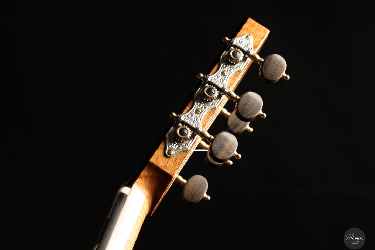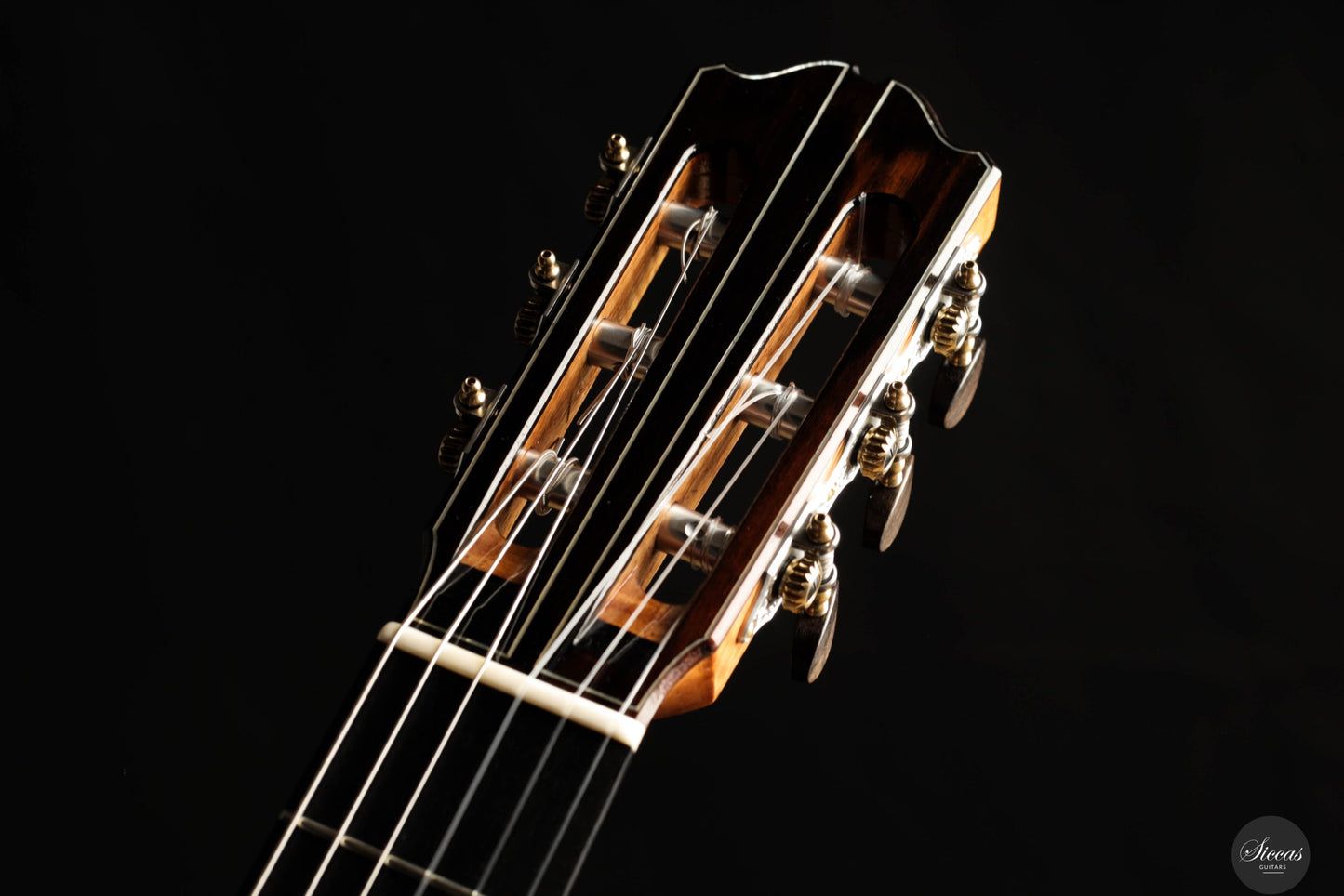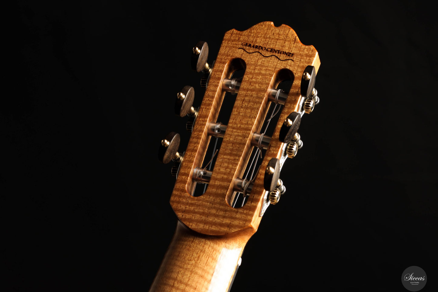 Wie auf den Fotos zu erkennen ist, steckt viel Liebe zum Detail in den feinen Einlagen (Purflings) sowie in den Perlmuttverzierungen an Kopfplatte, Rosette und Steg. Diese edlen Materialien und die meisterhafte Verarbeitung unterstreichen den hohen Anspruch, den Gerardo an jedes seiner Instrumente stellt.