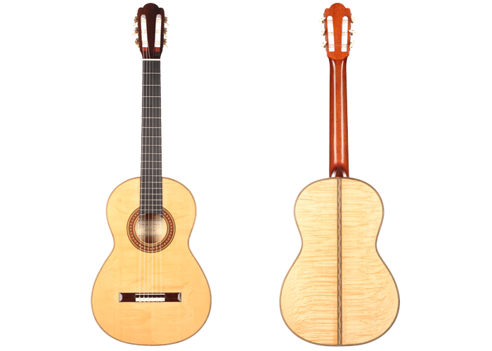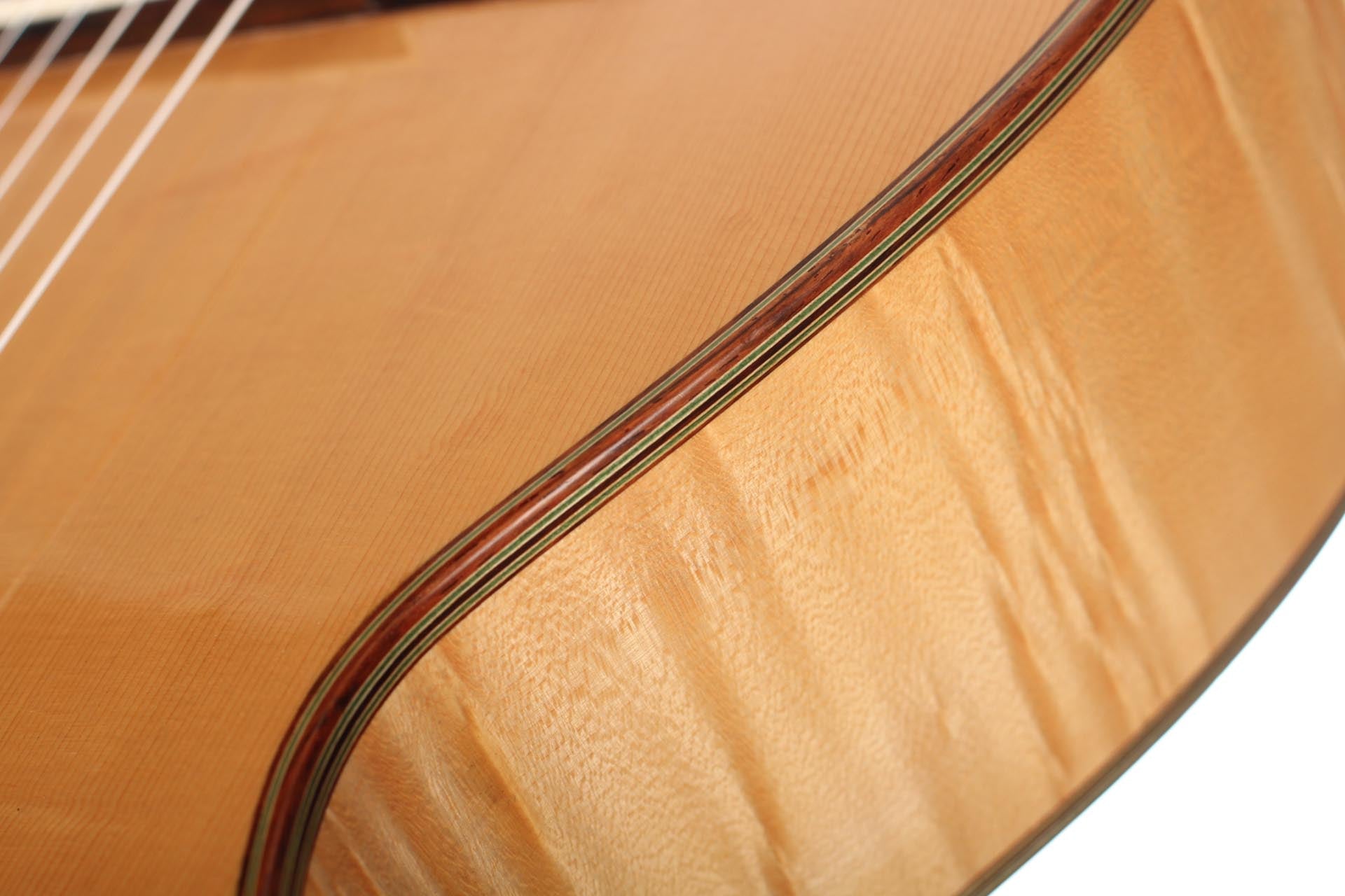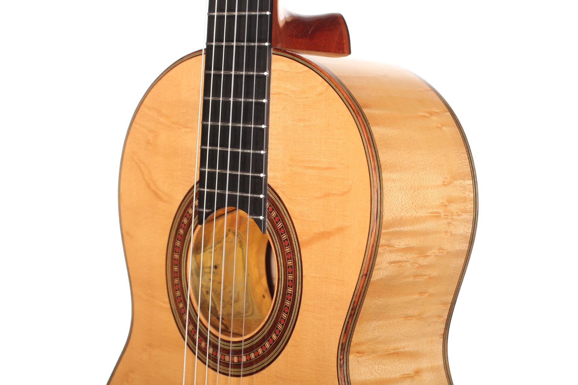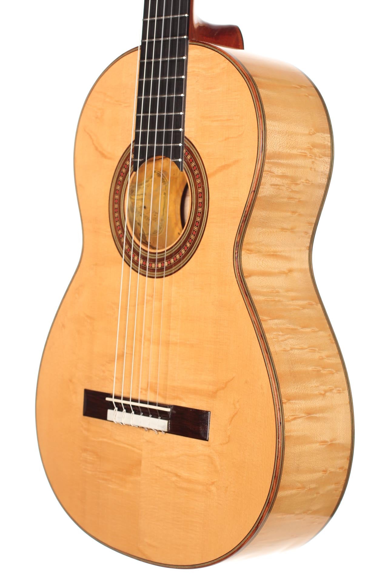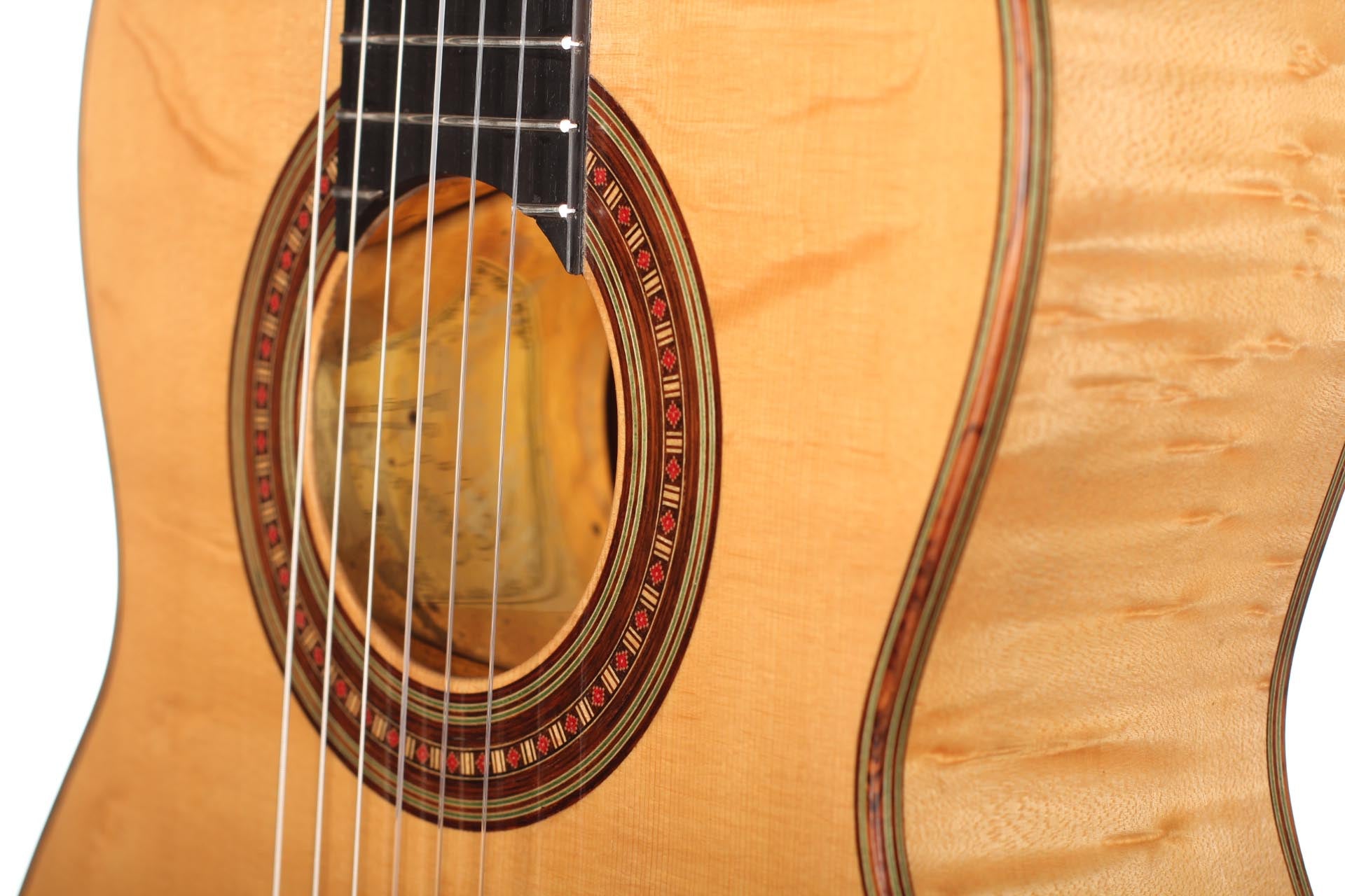 This Torres copy from 2003 combines a gorgeous bear claw top with ravishingly flamed maple back and sides. Against the background of these exquisite bright woods, the contrasty red and green mosaic in the rosette can unfold beautifully. The guitar has a marvelously mellow and lovely sound. Due to the Tornavoz the basses and mids have a warm singing touch, underlining the bright trebles pleasantly. The instrument is in very good condition. The tuners are made by Sloane. A hard-shell case is included.