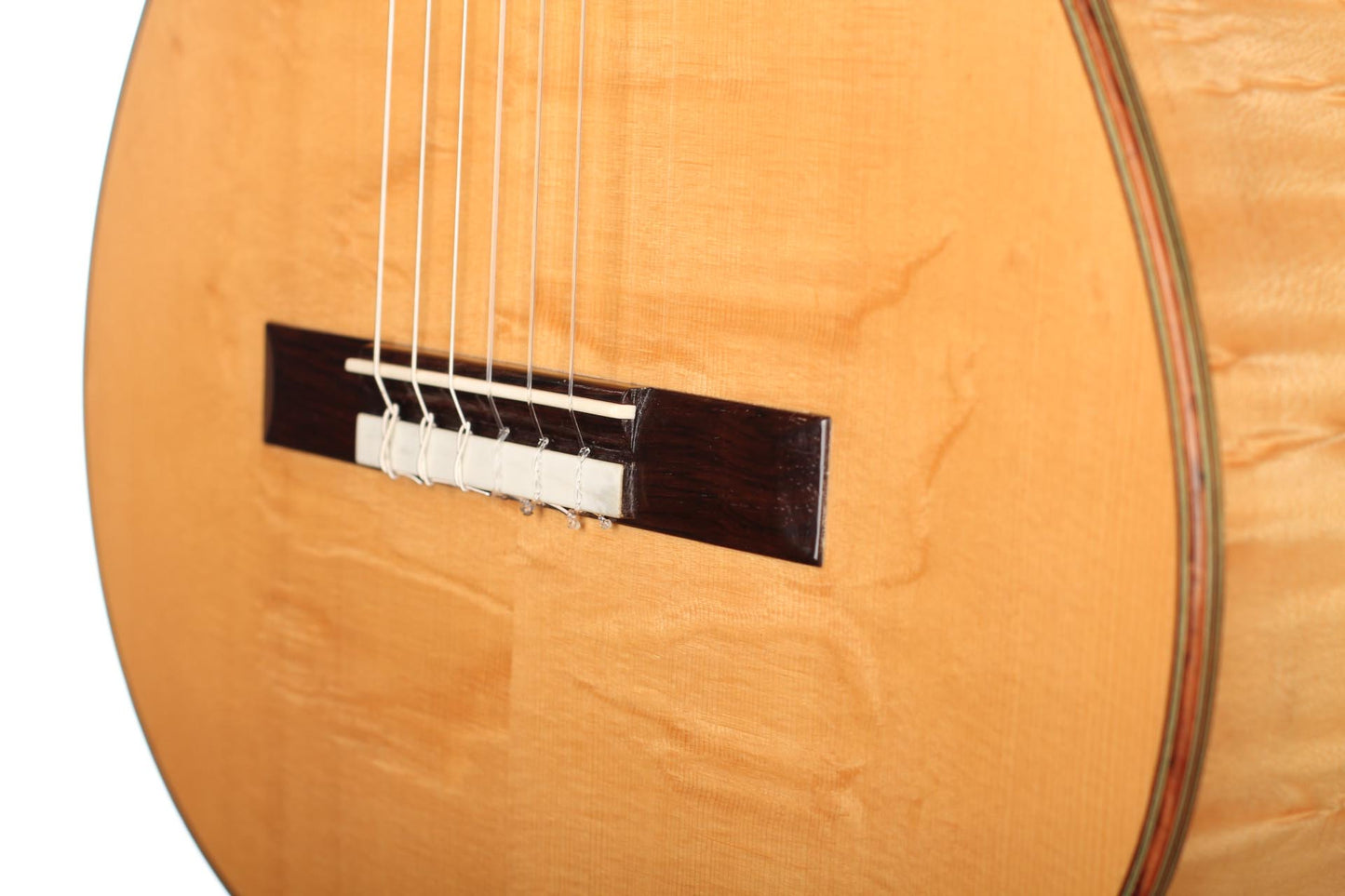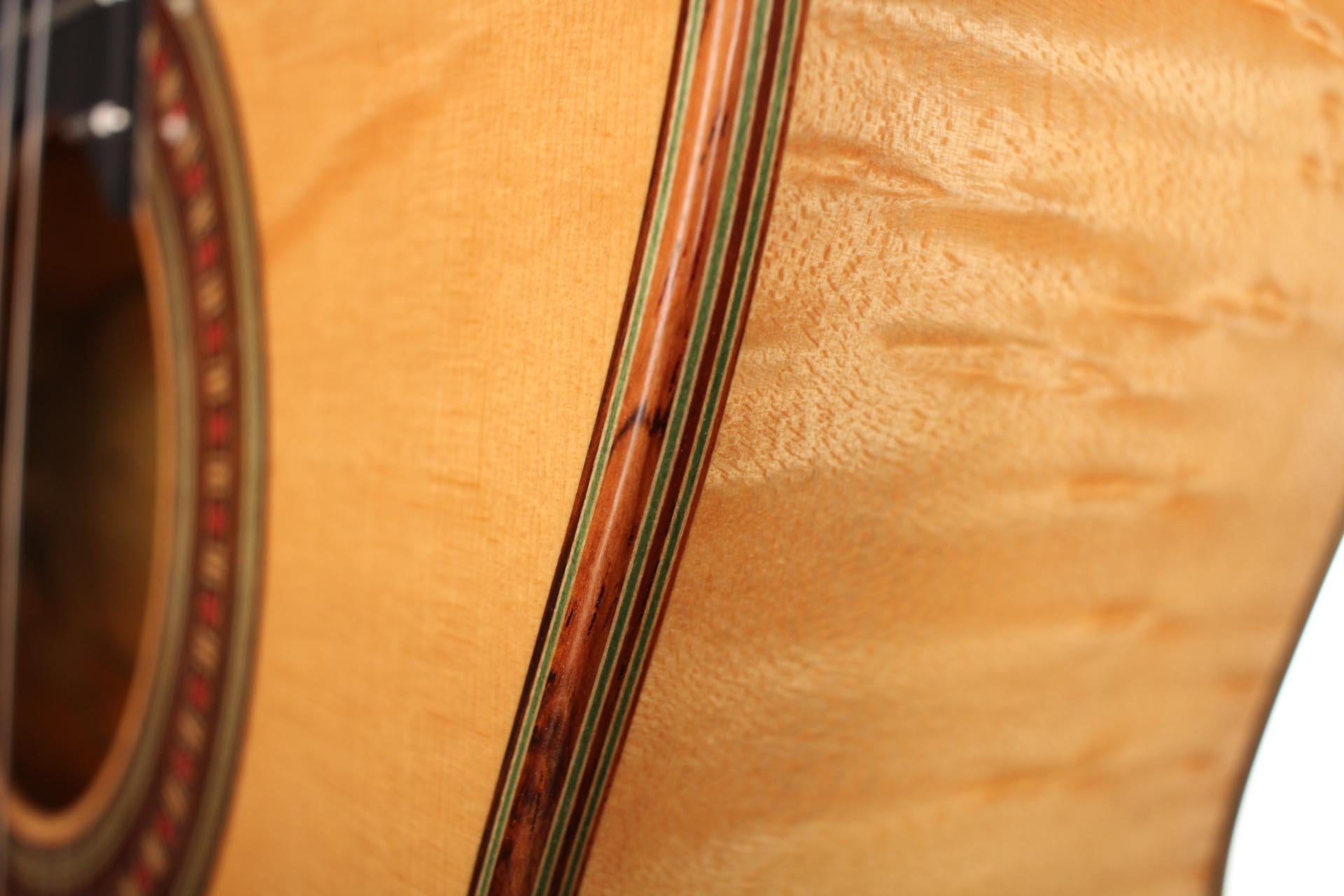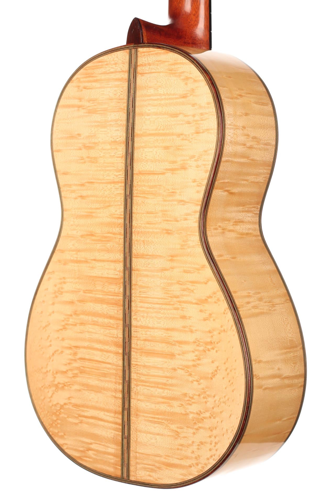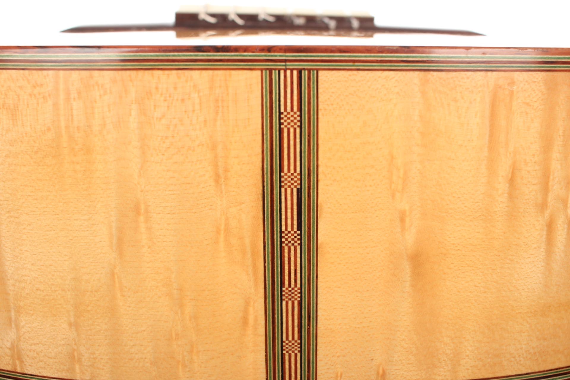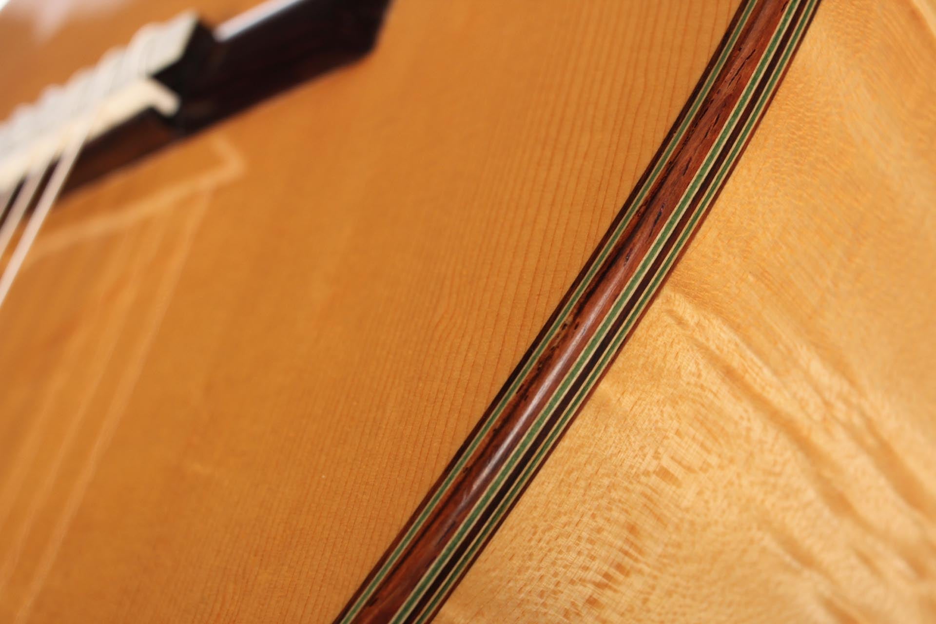 This Torres copy from 2003 combines a gorgeous bear claw top with ravishingly flamed maple back and sides. Against the background of these exquisite bright woods, the contrasty red and green mosaic in the rosette can unfold beautifully. The guitar has a marvelously mellow and lovely sound. Due to the Tornavoz the basses and mids have a warm singing touch, underlining the bright trebles pleasantly. The instrument is in very good condition. The tuners are made by Sloane. A hard-shell case is included.