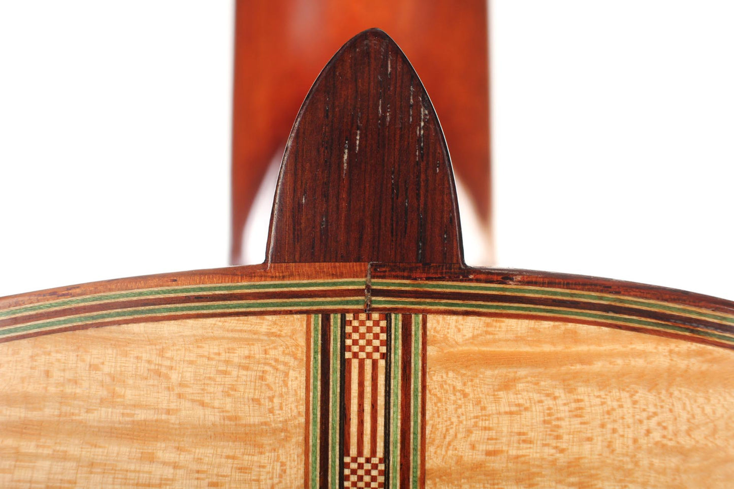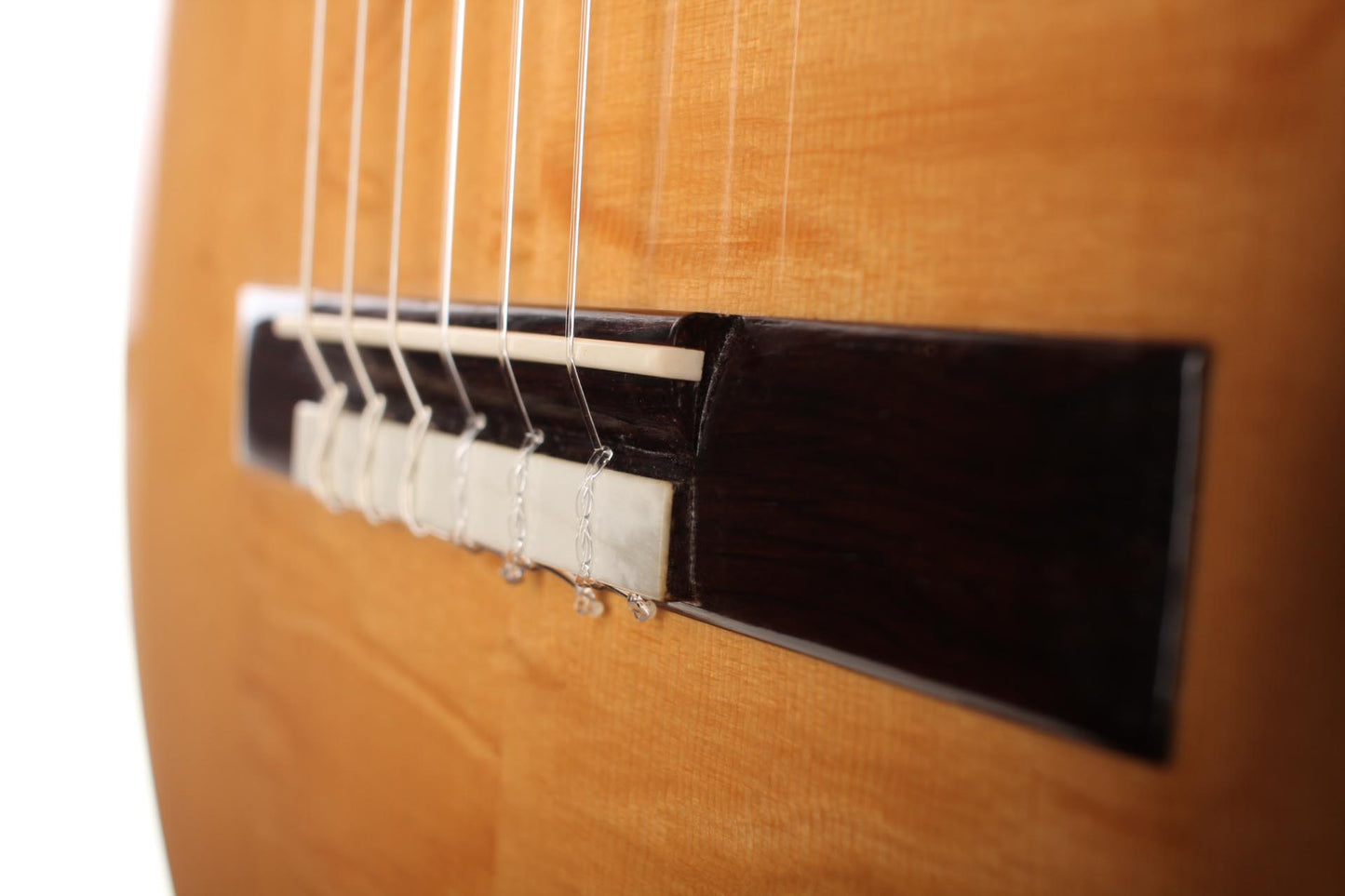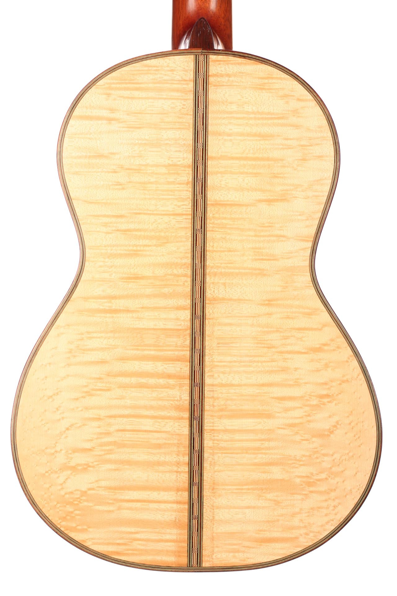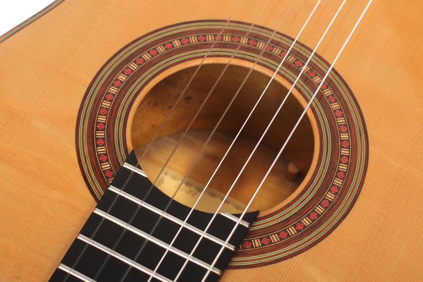This Torres copy from 2003 combines a gorgeous bear claw top with ravishingly flamed maple back and sides. Against the background of these exquisite bright woods, the contrasty red and green mosaic in the rosette can unfold beautifully. The guitar has a marvelously mellow and lovely sound. Due to the Tornavoz the basses and mids have a warm singing touch, underlining the bright trebles pleasantly. The instrument is in very good condition. The tuners are made by Sloane. A hard-shell case is included.