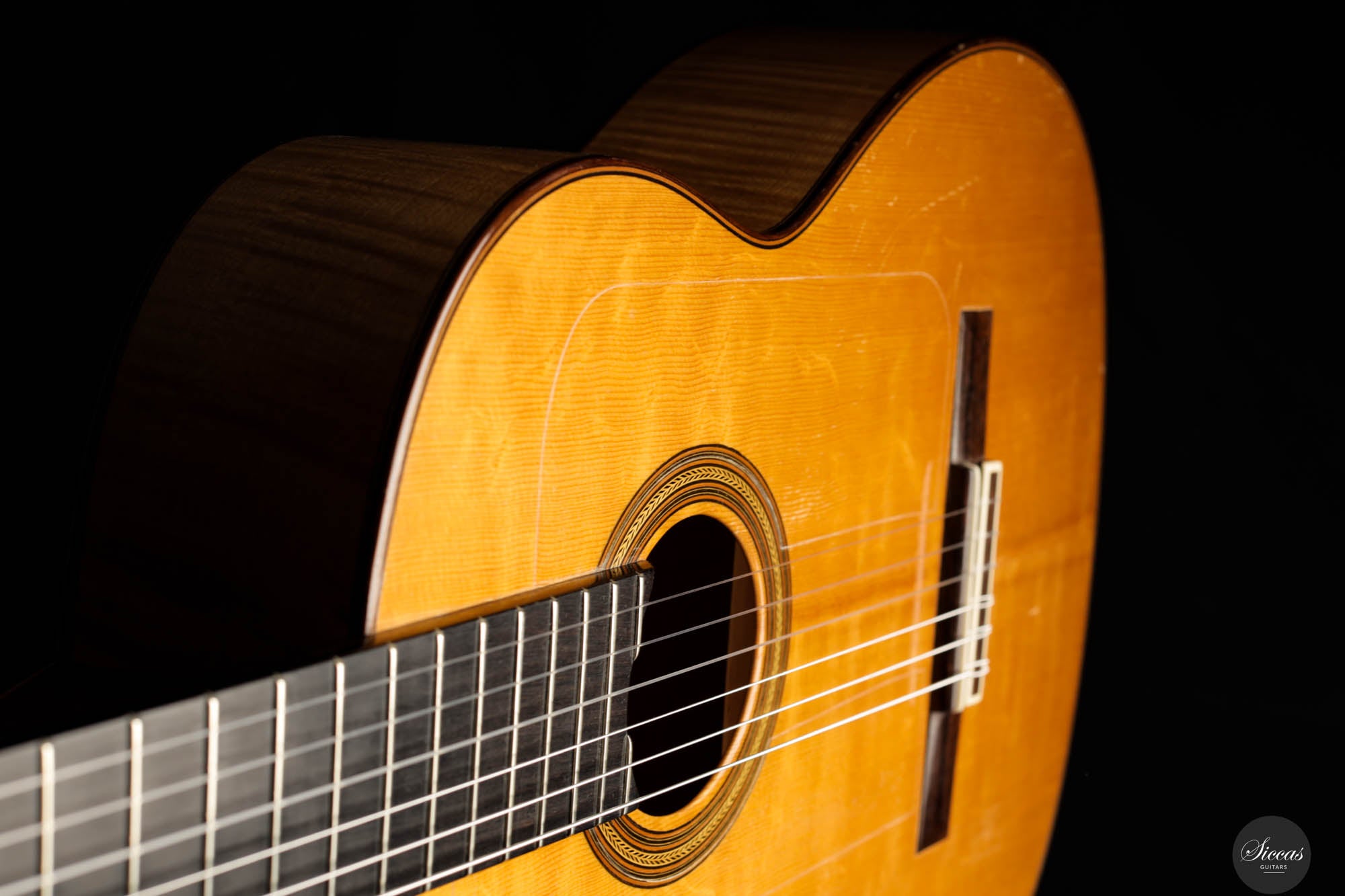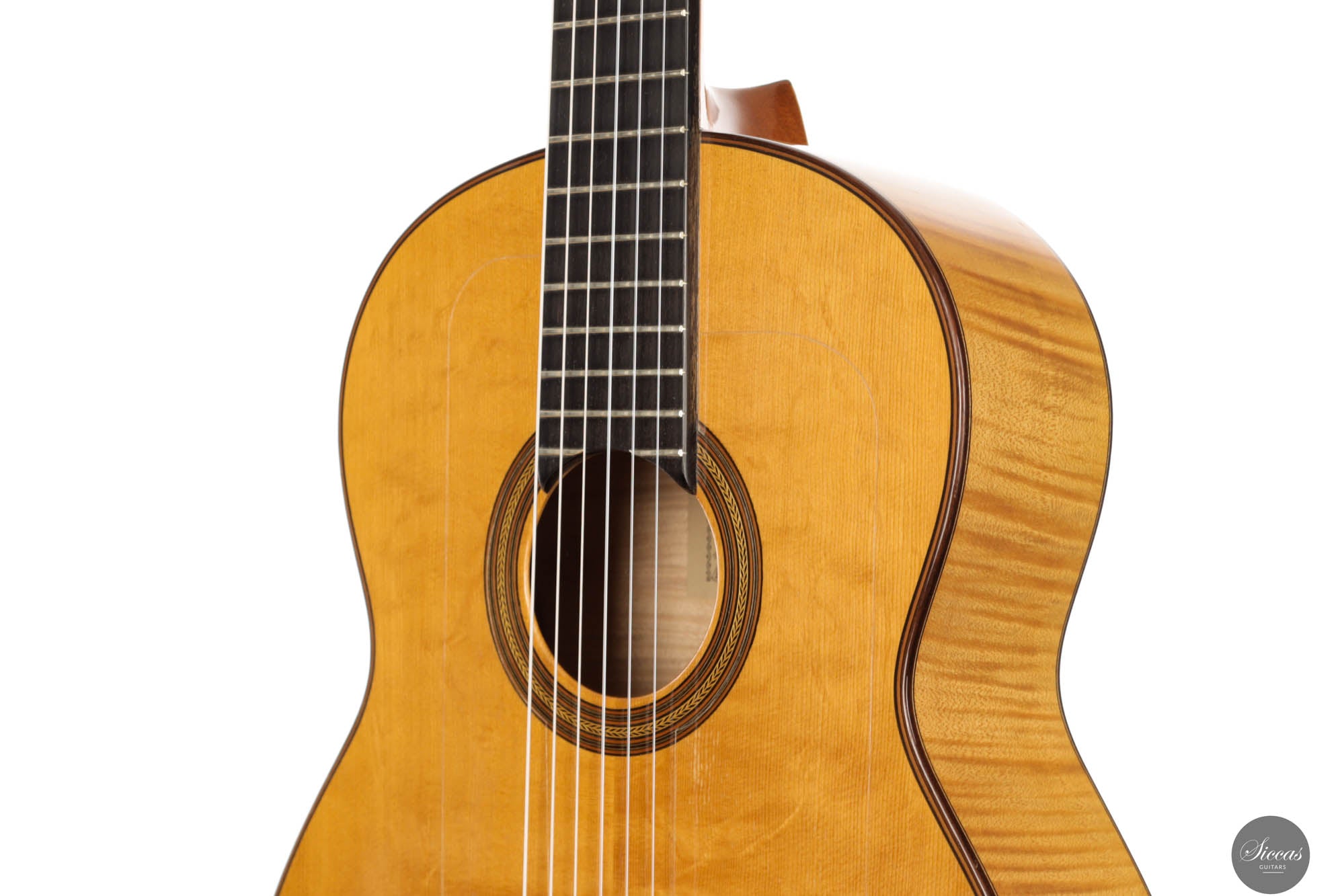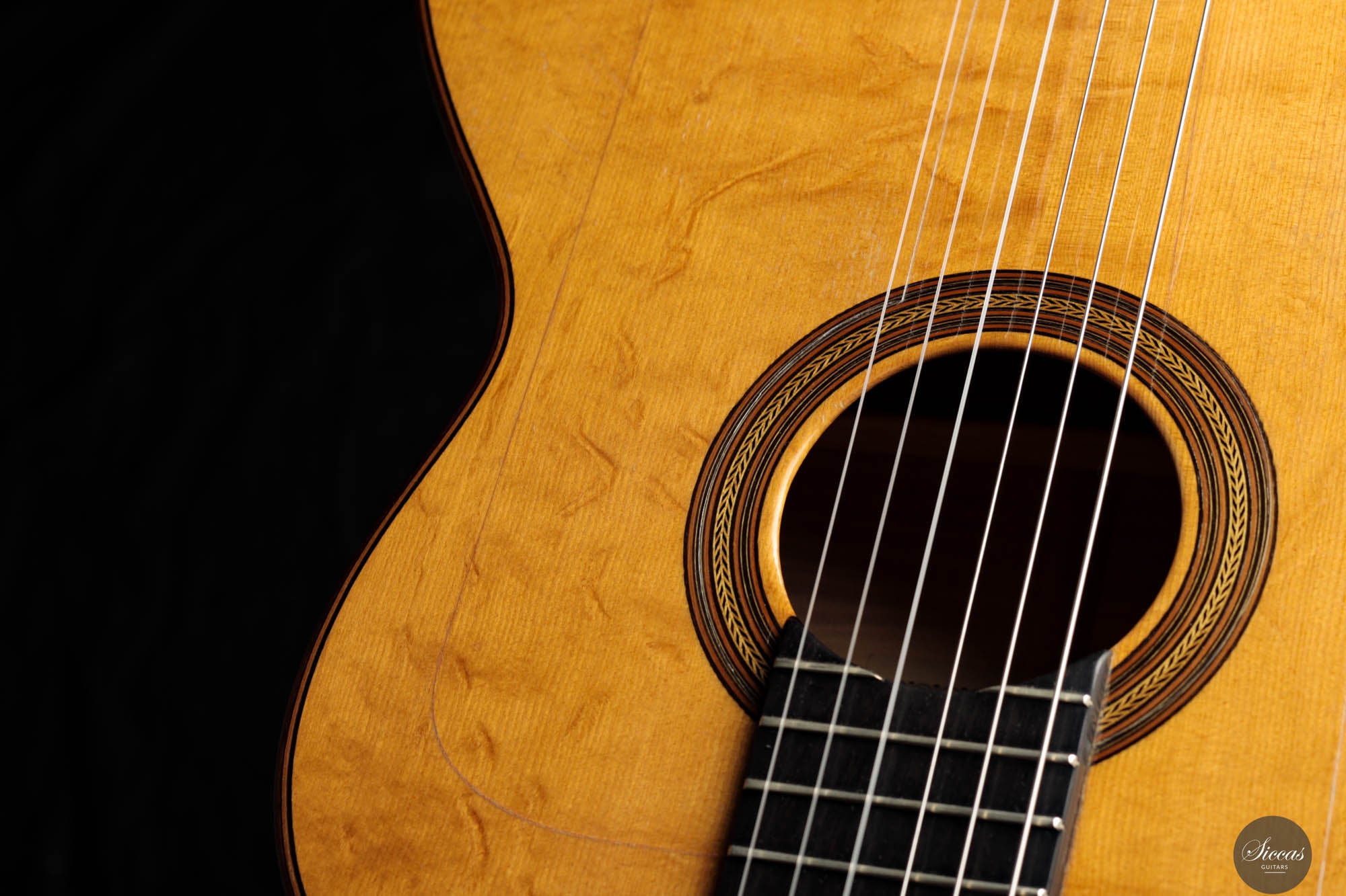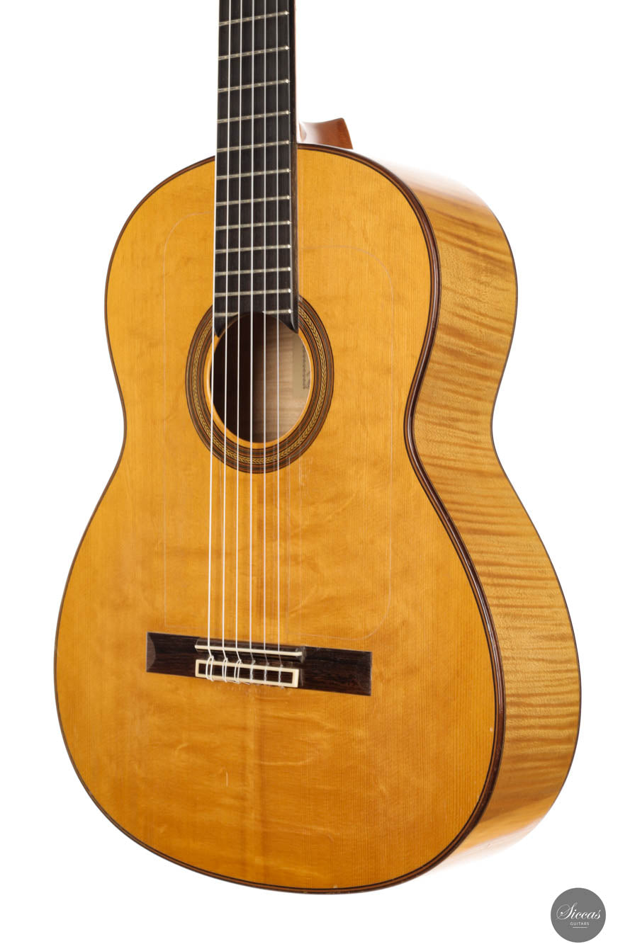 Diese leichte Gitarre, hergestellt im Jahr 1983 mit der Nummer 330, verfügt über eine traditionelle Konstruktion mit 7-Fran-Beleistung. Rücken und Seiten sind aus auffällig geflammtem Ahorn gefertigt, der in Kontrast zu der Bärenklaue-Fichtendecke ein beeindruckendes visuelles Bild bietet. Als gebrauchtes Instrument befindet sich diese Gitarre in einem großartigen Zustand und zeigt einige normale Gebrauchsspuren, die rein ästhetischer Natur sind und die Klangqualitäten des Instruments nicht beeinträchtigen. Ein Schutzfilm wurde auf der Decke angebracht und gilt als dauerhaft. Glücklicherweise bietet das Nitrozelluloselack-Finish eine zusätzliche Schutzschicht für die energischsten Spieler. Der Klang besteht aus cremigen Höhen, dank der Kombination aus Ahorn und Fichte, und die Bässe sind sanft und überraschend tief. Insgesamt bietet diese Gitarre einen intimen Klang mit großer Projektion, gekoppelt mit einer sehr schnellen Ansprache, die die Artikulation für den Spieler zu einer leichten Aufgabe macht.
