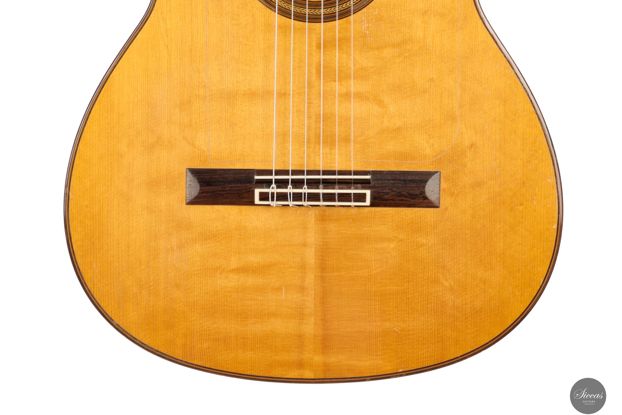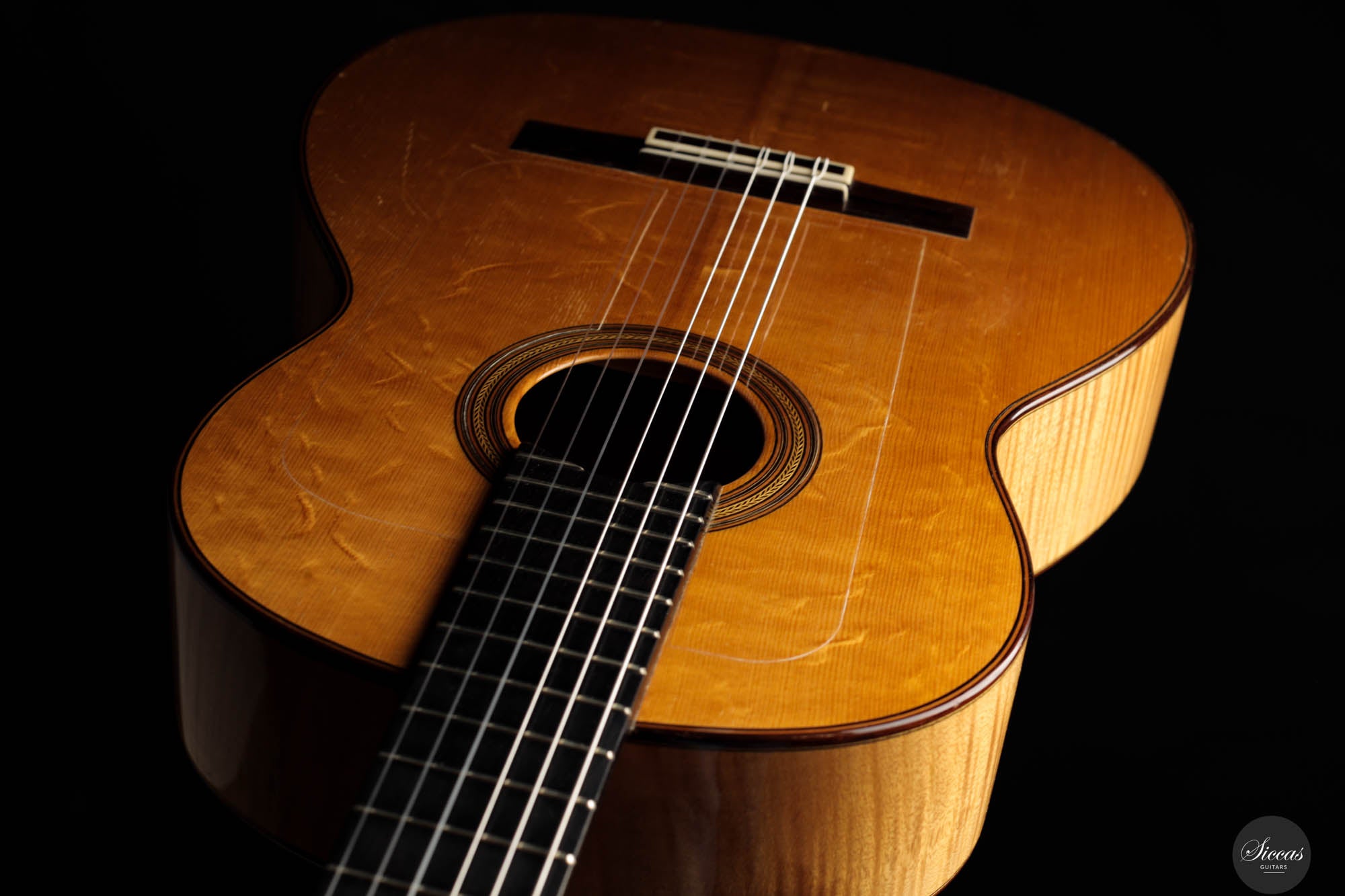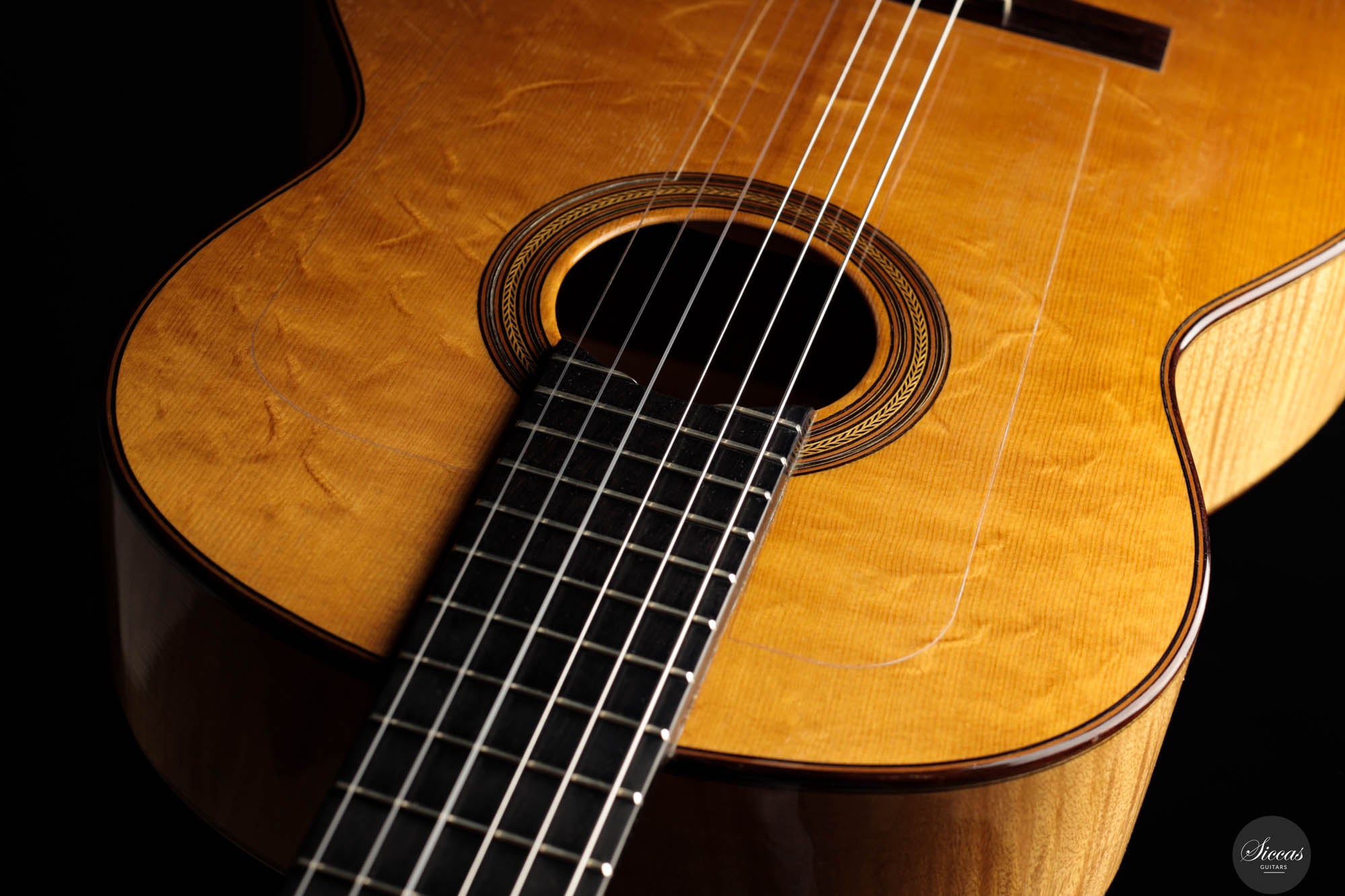 Diese leichte Gitarre, hergestellt im Jahr 1983 mit der Nummer 330, verfügt über eine traditionelle Konstruktion mit 7-Fran-Beleistung. Rücken und Seiten sind aus auffällig geflammtem Ahorn gefertigt, der in Kontrast zu der Bärenklaue-Fichtendecke ein beeindruckendes visuelles Bild bietet. Als gebrauchtes Instrument befindet sich diese Gitarre in einem großartigen Zustand und zeigt einige normale Gebrauchsspuren, die rein ästhetischer Natur sind und die Klangqualitäten des Instruments nicht beeinträchtigen. Ein Schutzfilm wurde auf der Decke angebracht und gilt als dauerhaft. Glücklicherweise bietet das Nitrozelluloselack-Finish eine zusätzliche Schutzschicht für die energischsten Spieler. Der Klang besteht aus cremigen Höhen, dank der Kombination aus Ahorn und Fichte, und die Bässe sind sanft und überraschend tief. Insgesamt bietet diese Gitarre einen intimen Klang mit großer Projektion, gekoppelt mit einer sehr schnellen Ansprache, die die Artikulation für den Spieler zu einer leichten Aufgabe macht.
