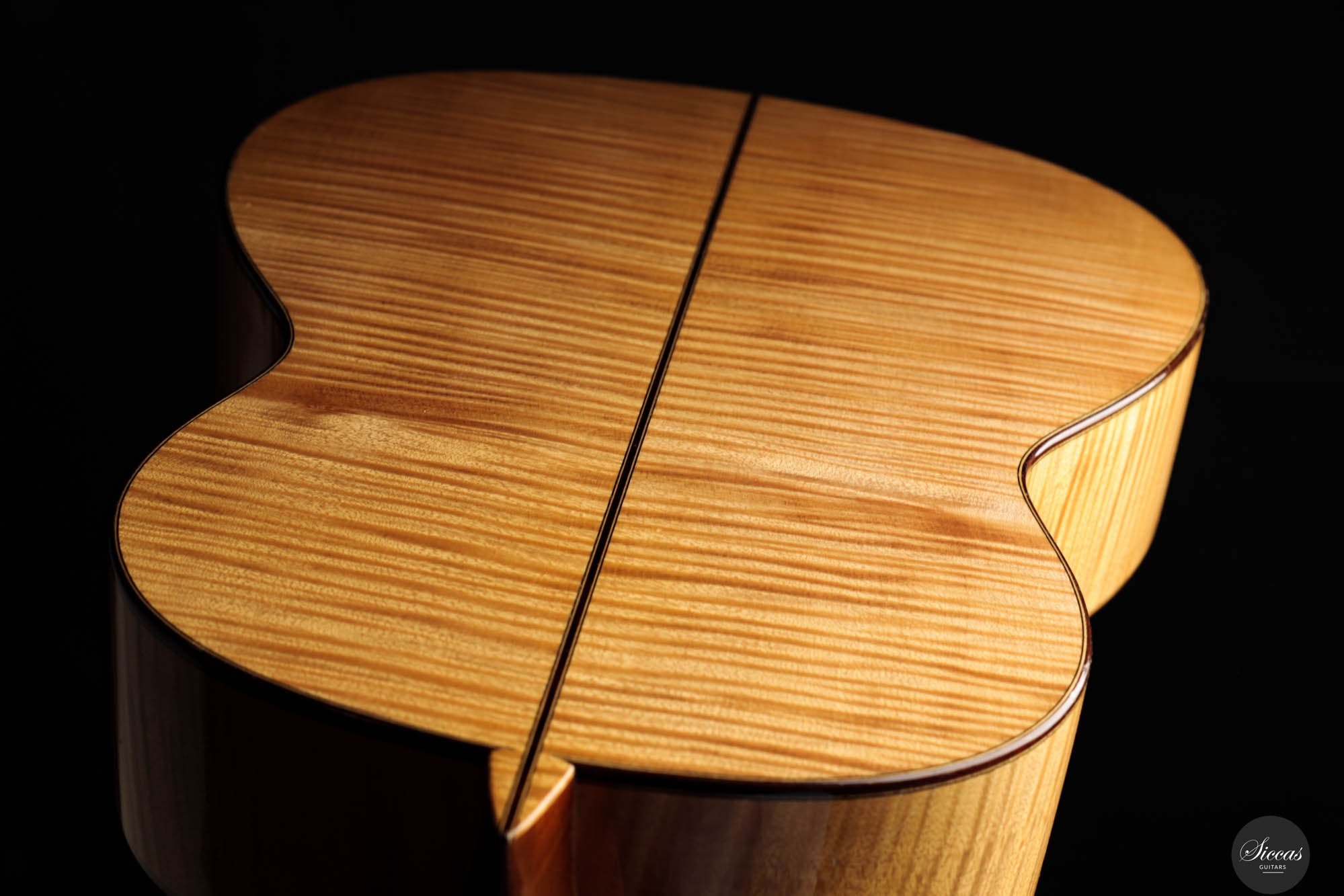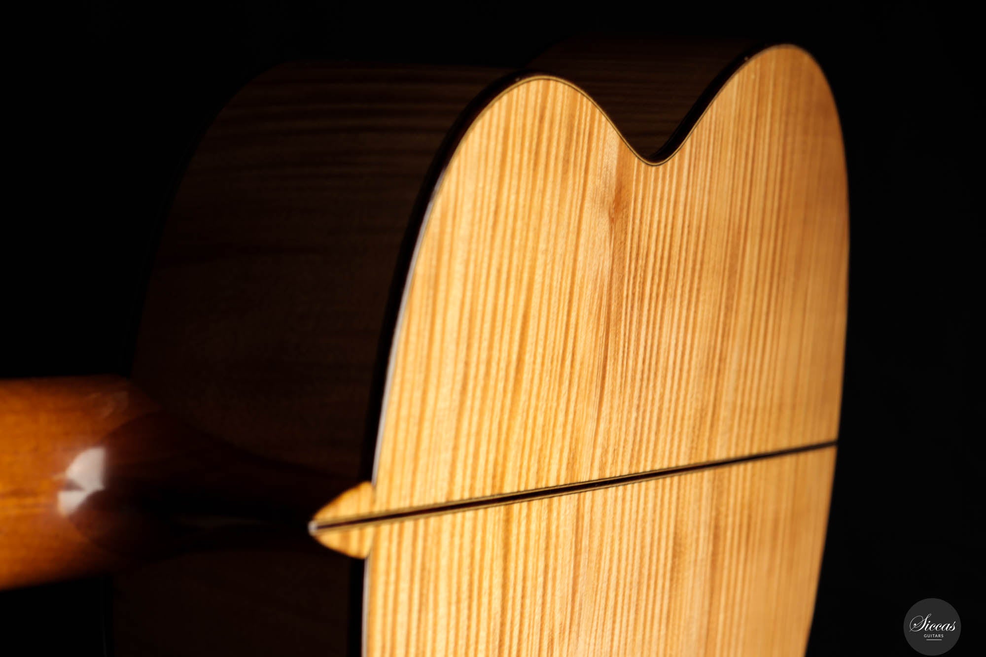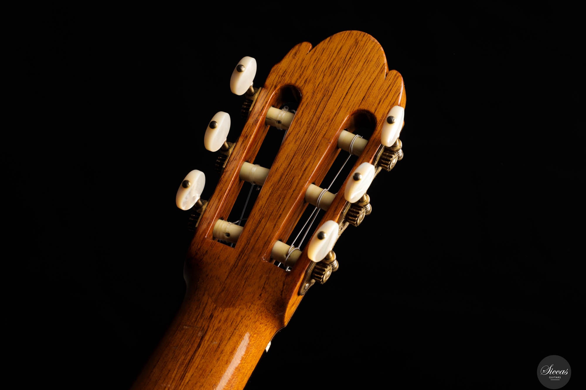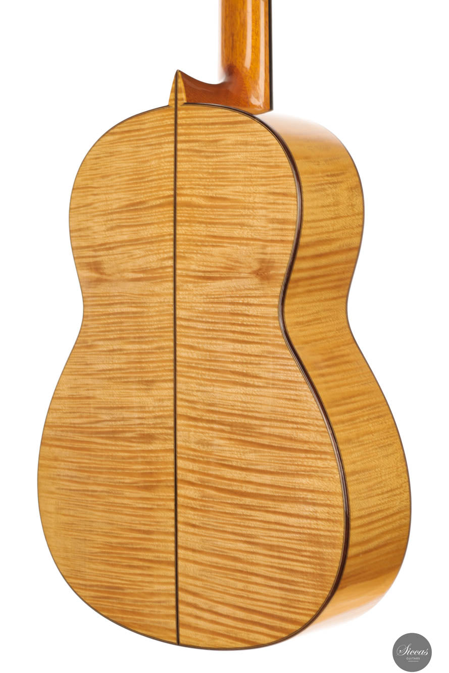 Diese leichte Gitarre, hergestellt im Jahr 1983 mit der Nummer 330, verfügt über eine traditionelle Konstruktion mit 7-Fran-Beleistung. Rücken und Seiten sind aus auffällig geflammtem Ahorn gefertigt, der in Kontrast zu der Bärenklaue-Fichtendecke ein beeindruckendes visuelles Bild bietet. Als gebrauchtes Instrument befindet sich diese Gitarre in einem großartigen Zustand und zeigt einige normale Gebrauchsspuren, die rein ästhetischer Natur sind und die Klangqualitäten des Instruments nicht beeinträchtigen. Ein Schutzfilm wurde auf der Decke angebracht und gilt als dauerhaft. Glücklicherweise bietet das Nitrozelluloselack-Finish eine zusätzliche Schutzschicht für die energischsten Spieler. Der Klang besteht aus cremigen Höhen, dank der Kombination aus Ahorn und Fichte, und die Bässe sind sanft und überraschend tief. Insgesamt bietet diese Gitarre einen intimen Klang mit großer Projektion, gekoppelt mit einer sehr schnellen Ansprache, die die Artikulation für den Spieler zu einer leichten Aufgabe macht.