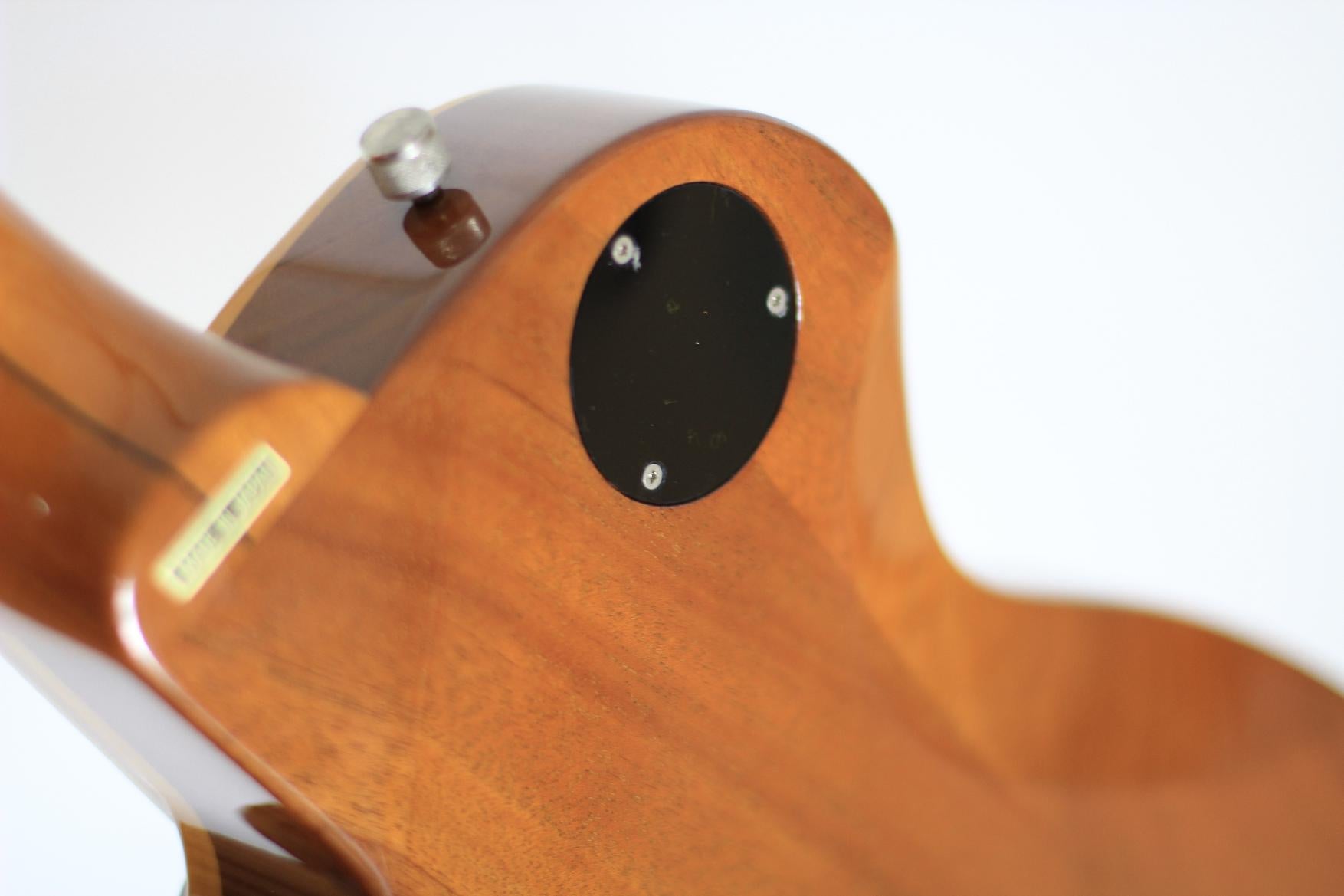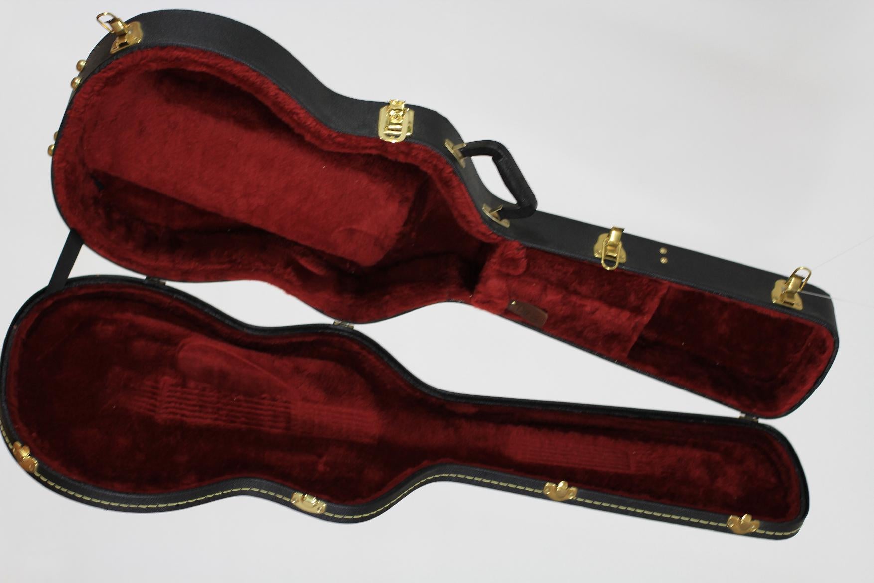 This 2002 "New Jet" G6114 is in excellent. TV Jones Dual FilterTron pickups, Tune-O-Matic bridge and a G-stop tailpiece. The lightweight mahogany body is capped with a carved maple top and flame maple laminate to create the perfect balance between tone, beauty and player comfort. The finish is a silky smooth, deep clear gloss over a see-through-stain of antique maple. The 2-pc mahogany neck is fitted with an ebonized rosewood fingerboard and the classic Gretsch “Humped” block inlays.