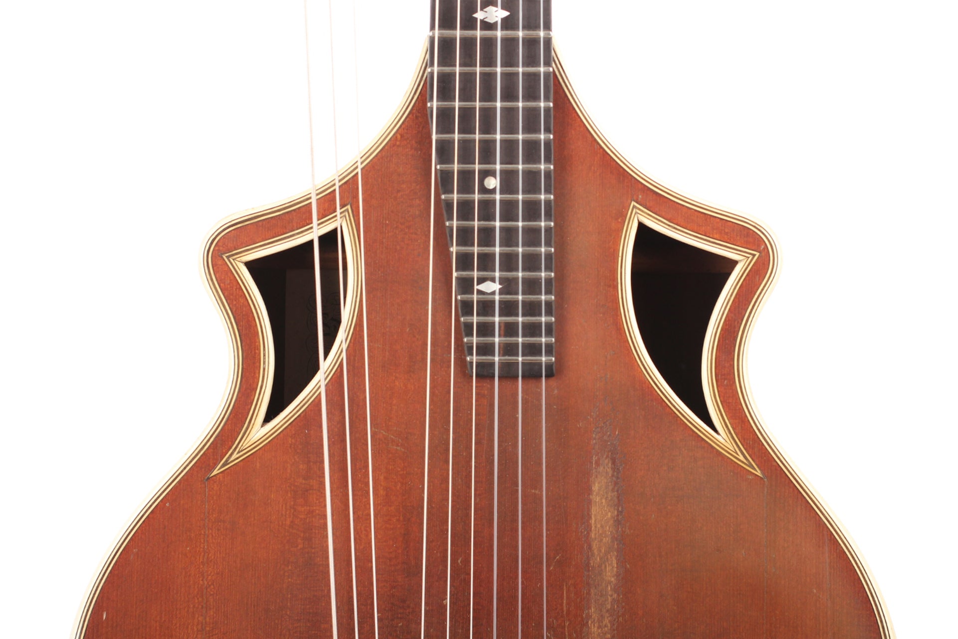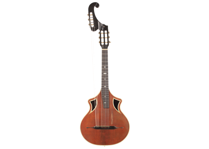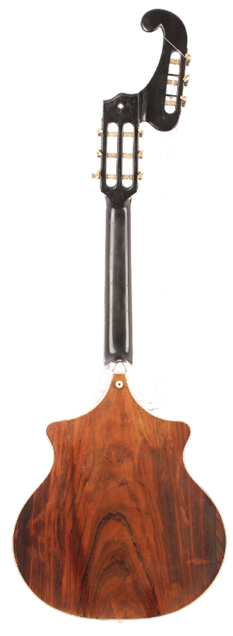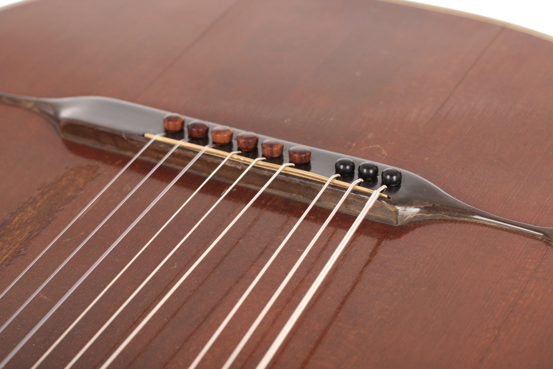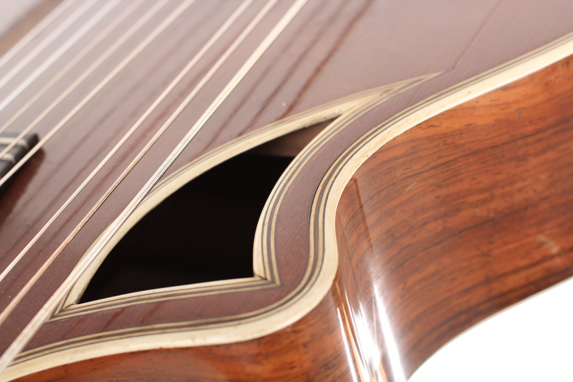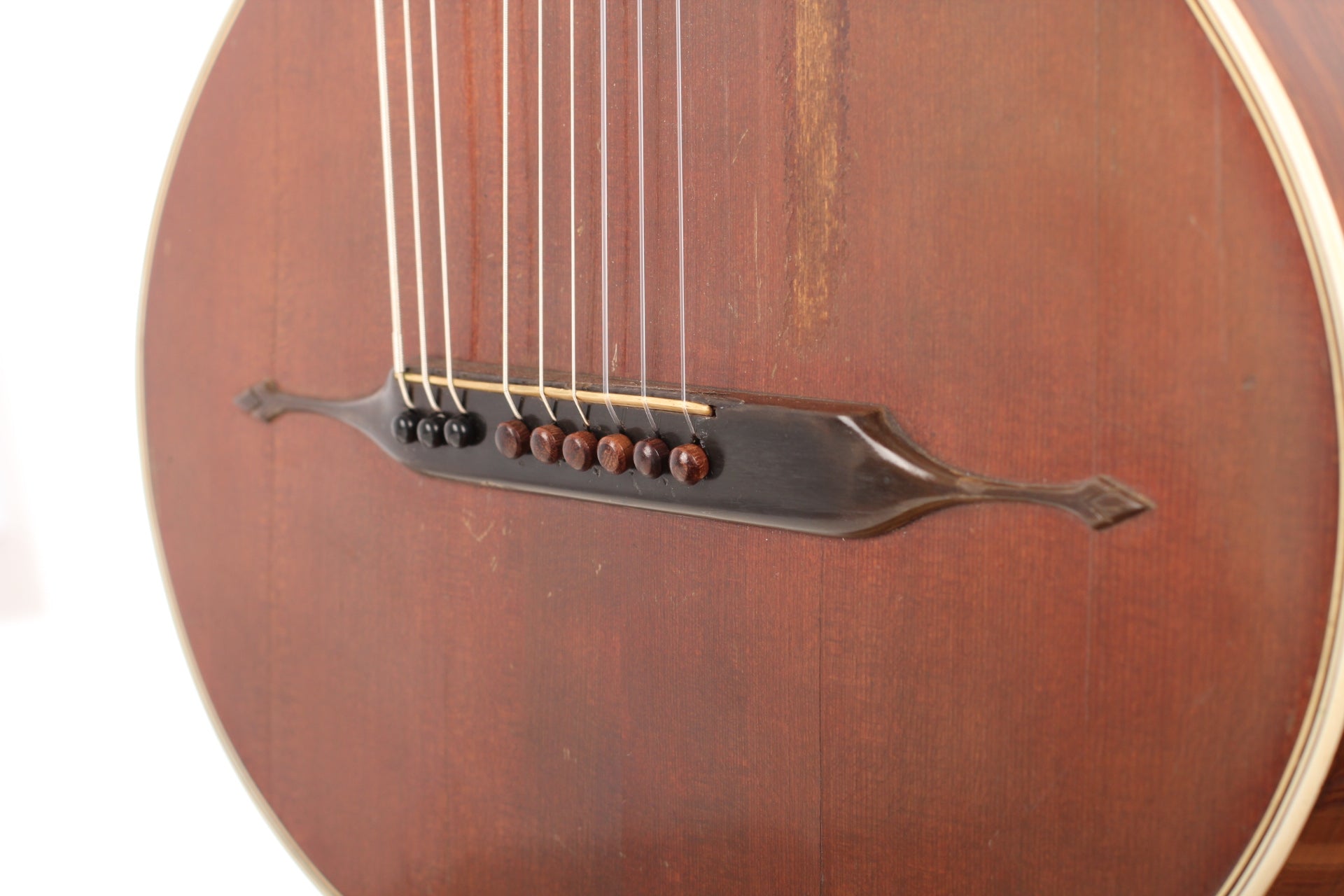 Hans Raab war Vertreter der Münchner Schule und baute diese neunsaitige Wappengitarre im Jahr 1912. Die Decke dieser Gitarre wurde aus Fichte gefertigt und ist mit einem hellen Rand umfasst ebenso wie das Schallloch. Der zweiteilige Boden sowie die Zargen sind aus Palisander. Auf der Decke befinden sich fünf reparierte Risse, die alle stabil sind. Boden und Zargen sind rissfrei. Ein Hartschalenkoffer ist inklusive.