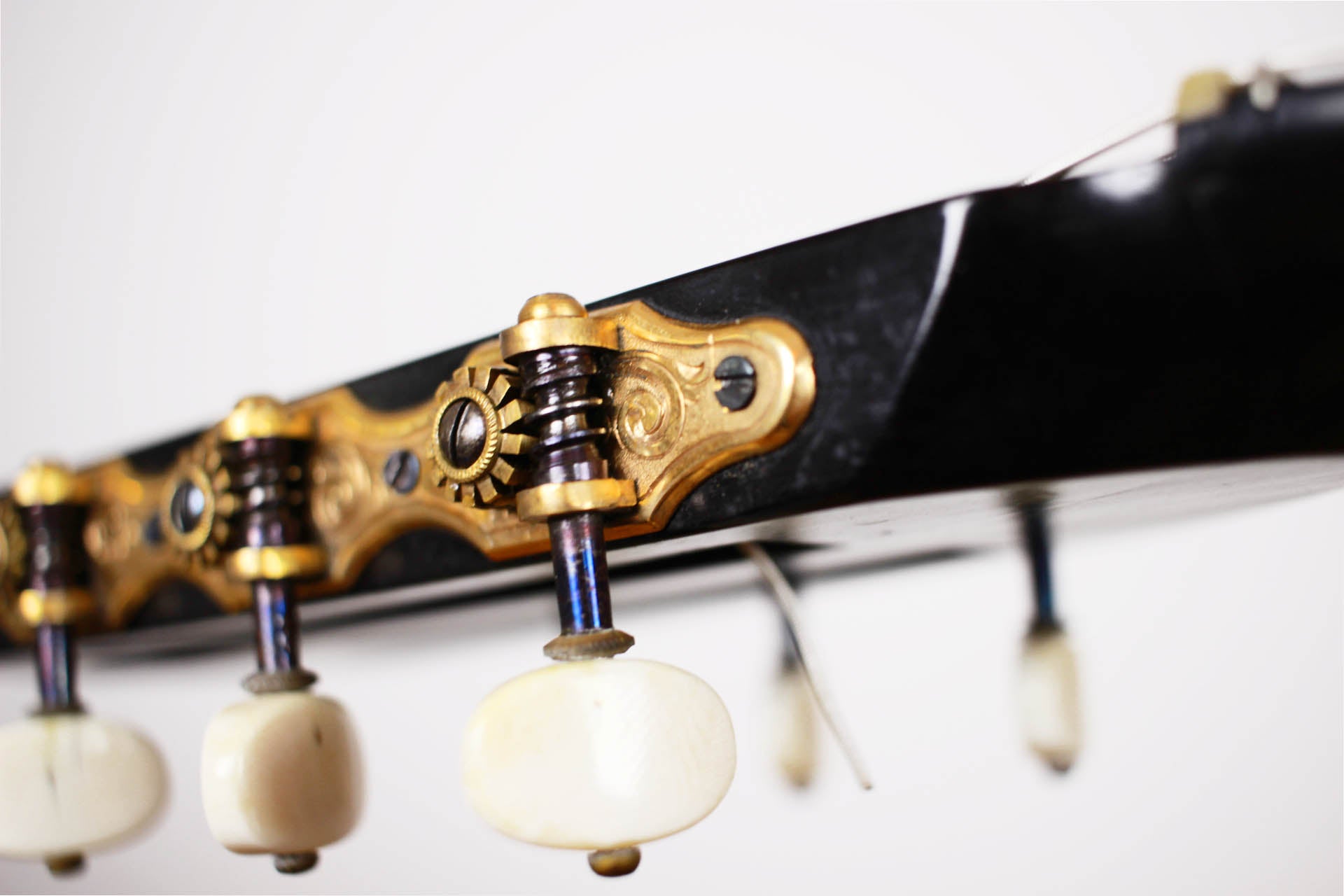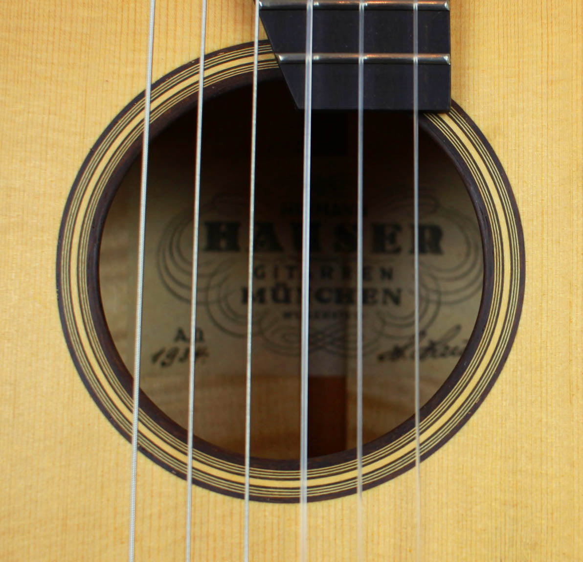 This guitar that was made for a customer of Hermann Hauser ® I that requested a very special decoration of the bridge that reminds to the ones that the Italian guitar maker Gennaro Fabricatore used for his guitars. The guitar is in in incredible condition - no cracks, no repairs, completely original. There are only some signs on the back. The two-piece top consists of spruce wood and is framed by brown and light purflings. The top is signed from the inside by Hermann Hauser ® in the region of the fretboard. The head is connected with the neck by a German neck spine and neck is screwed to the body and can be adjusted individually. The fingerboard has a zero fret and protrudes the sound hole. By Landstorfer/Reischl are highly decorated and they are of course also in excellent condition.