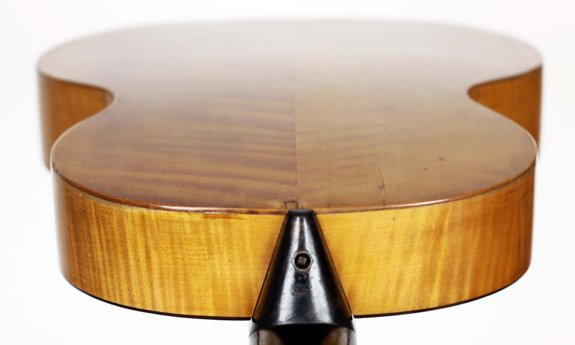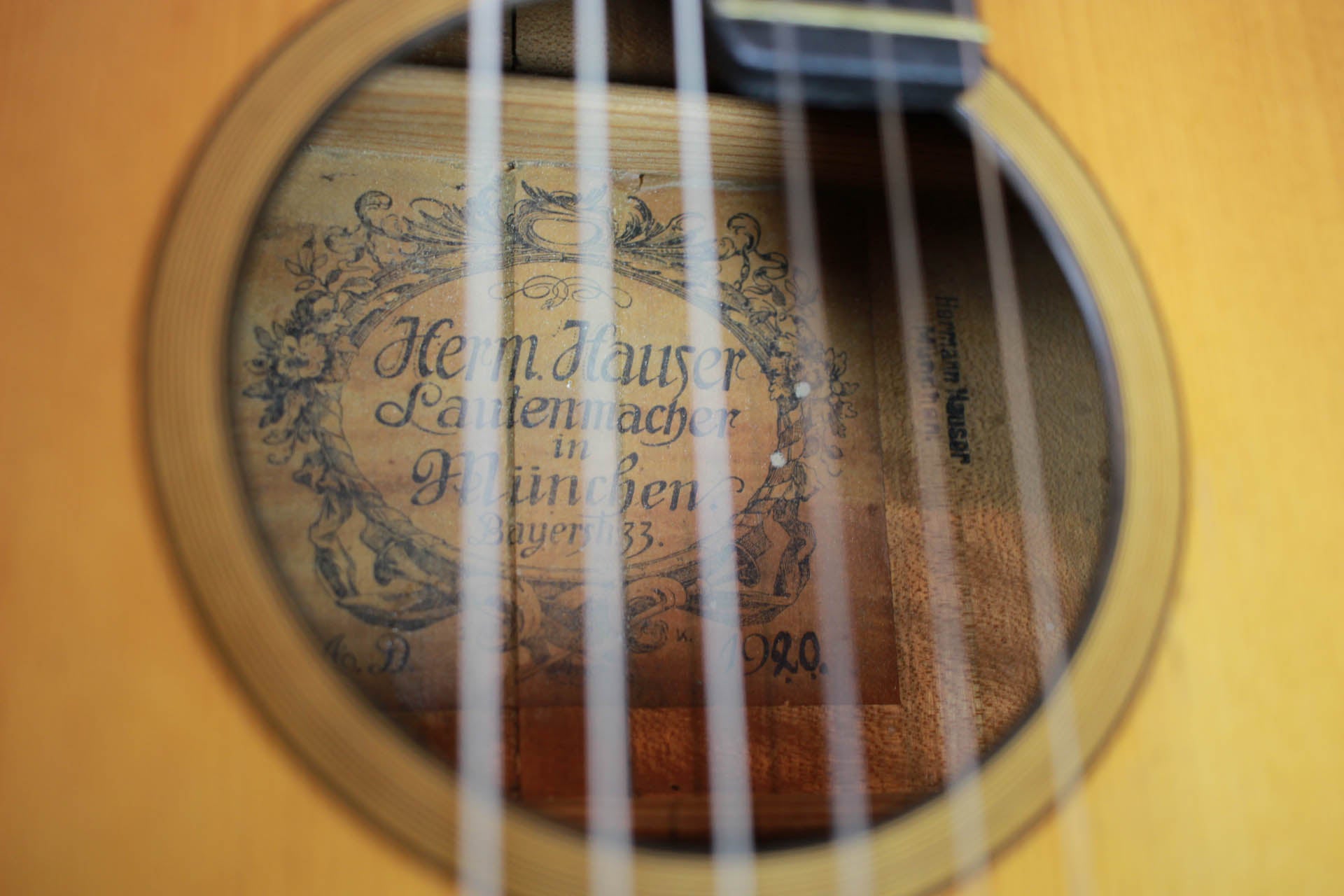 Die Wiener Gitarren von Hermann Hauser ® I zeichnen sich als besonders leicht spielbare Instrumente aus. Auch haben Sie einen kräftigen und lang anhaltenden Klang. Die zweiteilige Decke besteht aus Fichte und hat dunkle und helle Randverzierungen, ebenso wie das Schallloch. Der Boden ist zweiteilig und besteht wie auch die Zargen aus stark geflammtem Ahorn. Der Kopf ist nach deutscher Art mit dem Hals verbunden. Der Hals ist mit dem Korpus verschraubt und individuell einstellbar. Das Griffbrett besitzt einen Nullbund und reicht schwebend bis über das Schallloch. Insgesamt befindet sich diese Gitarre in einem guten Zustand. Der Steg wurde nach den Originalmaßen neu nachgebaut, da der originale Steg zwischenzeitlich durch einen modernen Knüpfsteg ersetzt wurde.