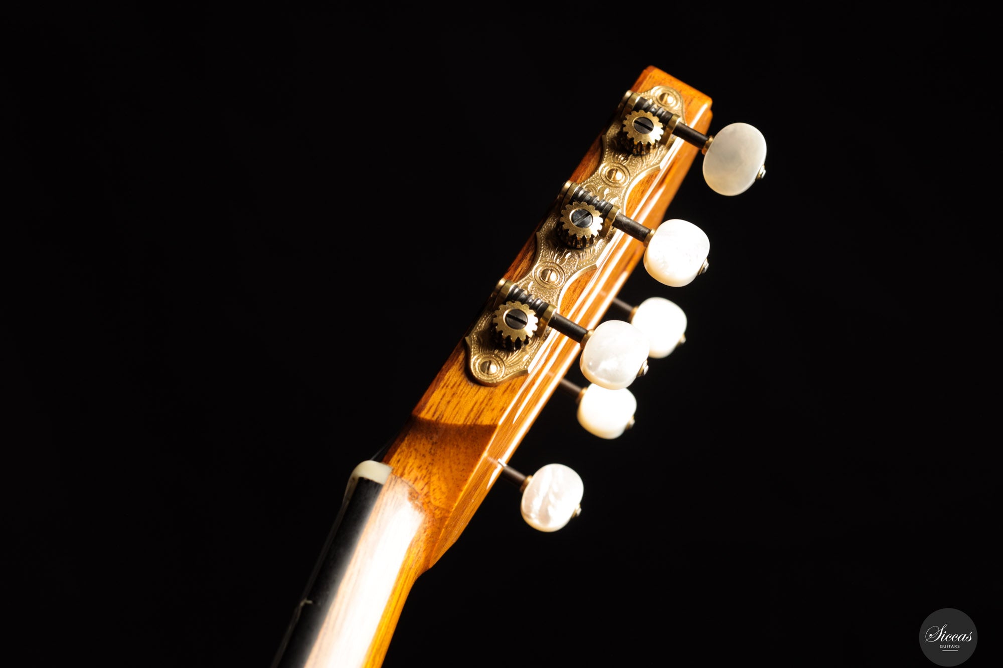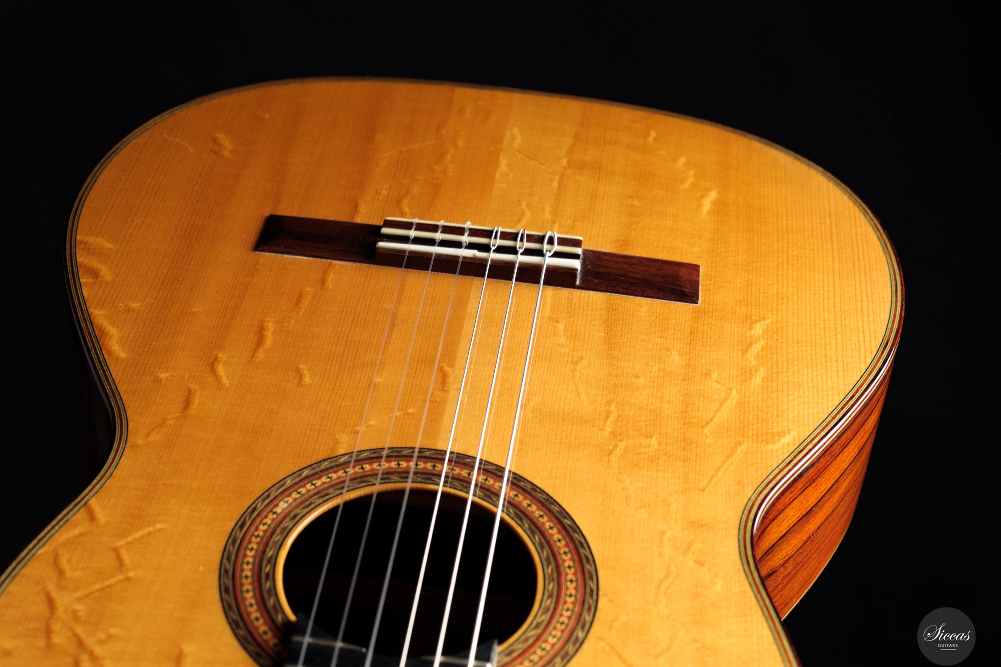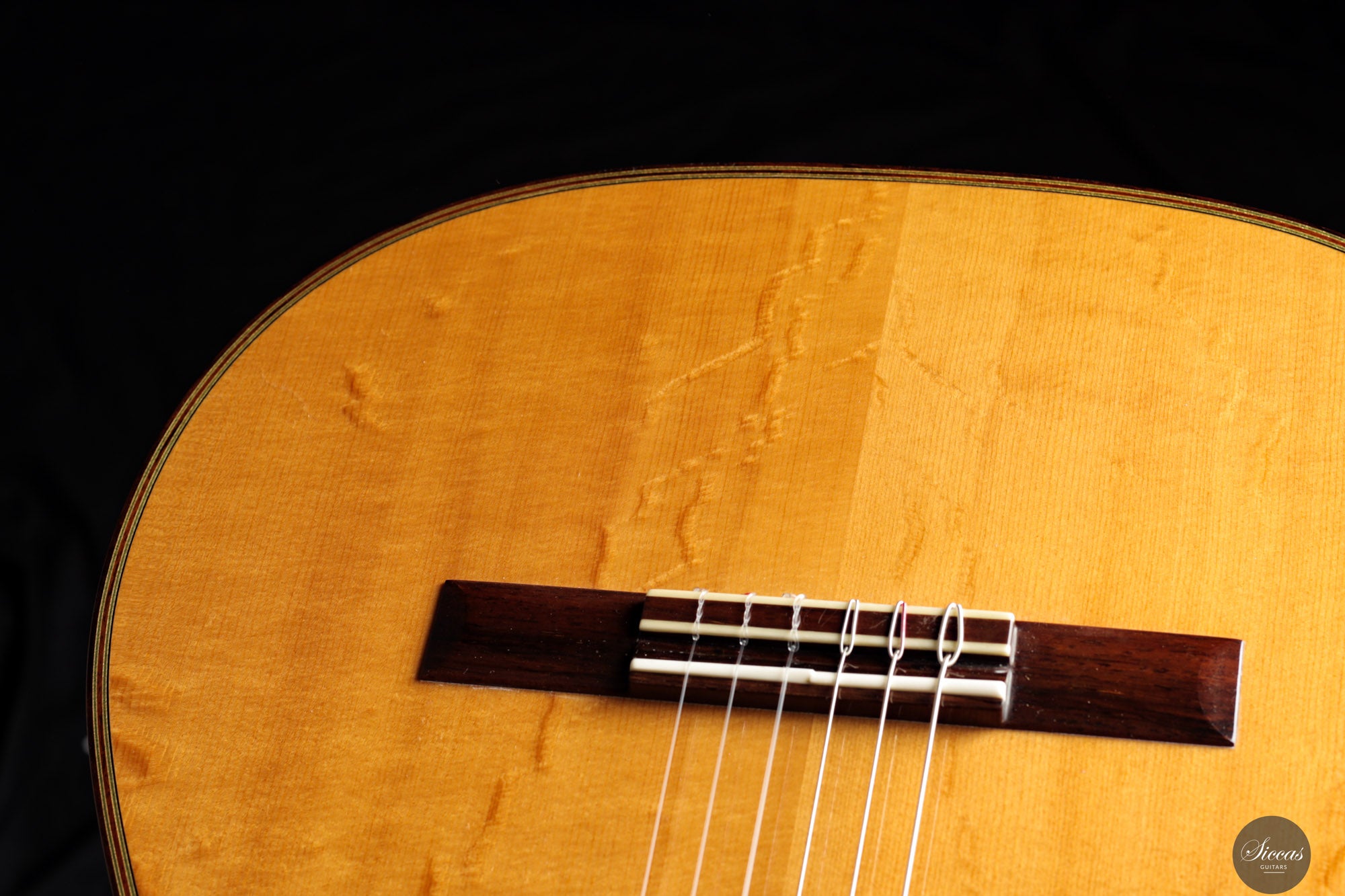 Die Gitarre befindet sich in ausgezeichnetem Zustand ohne strukturelle Beeinträchtigungen. Die Haselfichtendecke, der Steg sowie Sattel und Stegeinlage aus japanischem Rinderknochen sind hervorragend erhalten. Das Instrument wurde äußerst sorgfältig gepflegt. Der originale Koffer weist lediglich leichte Gebrauchsspuren auf und ist weiterhin voll funktionstüchtig.