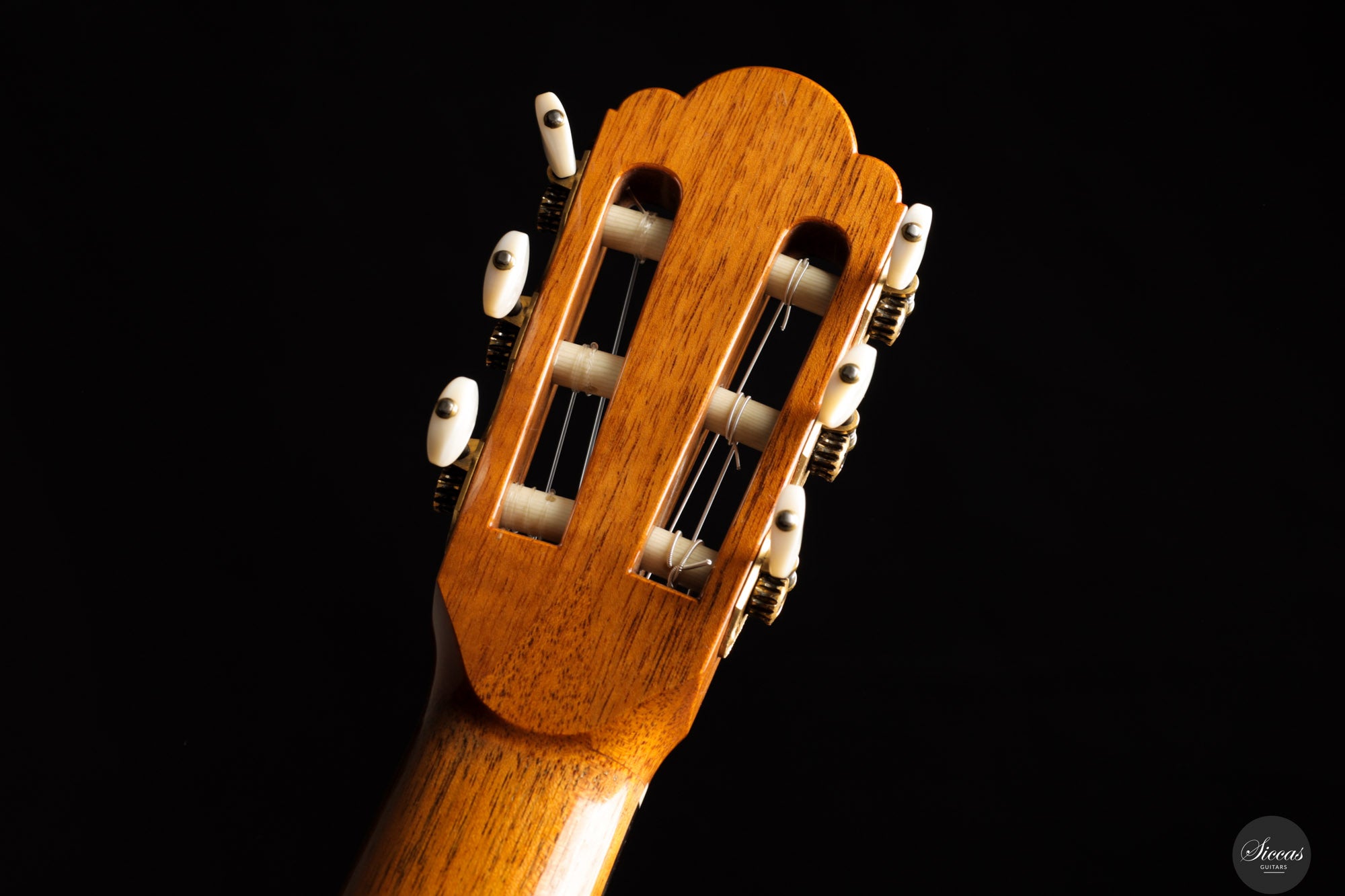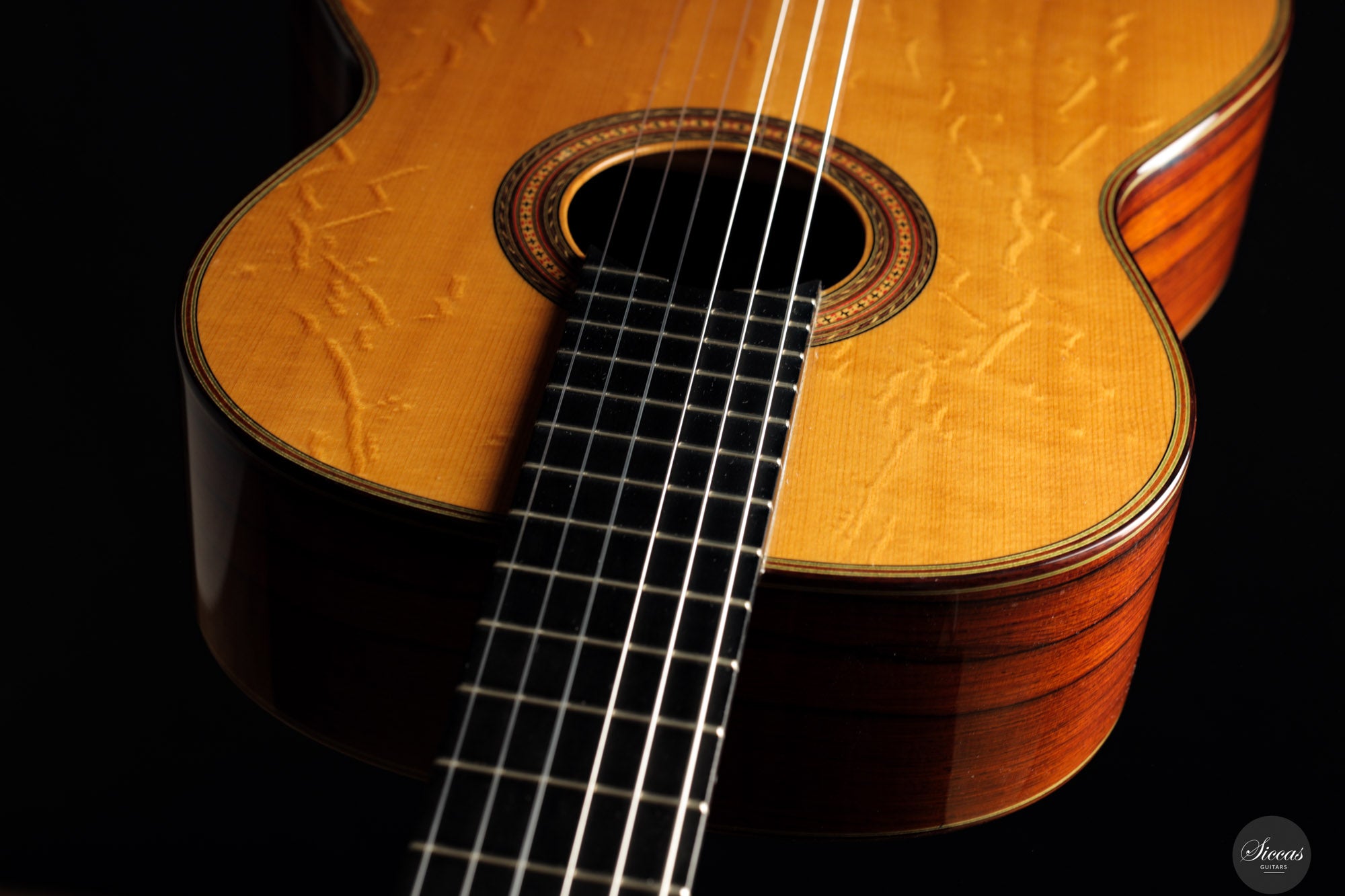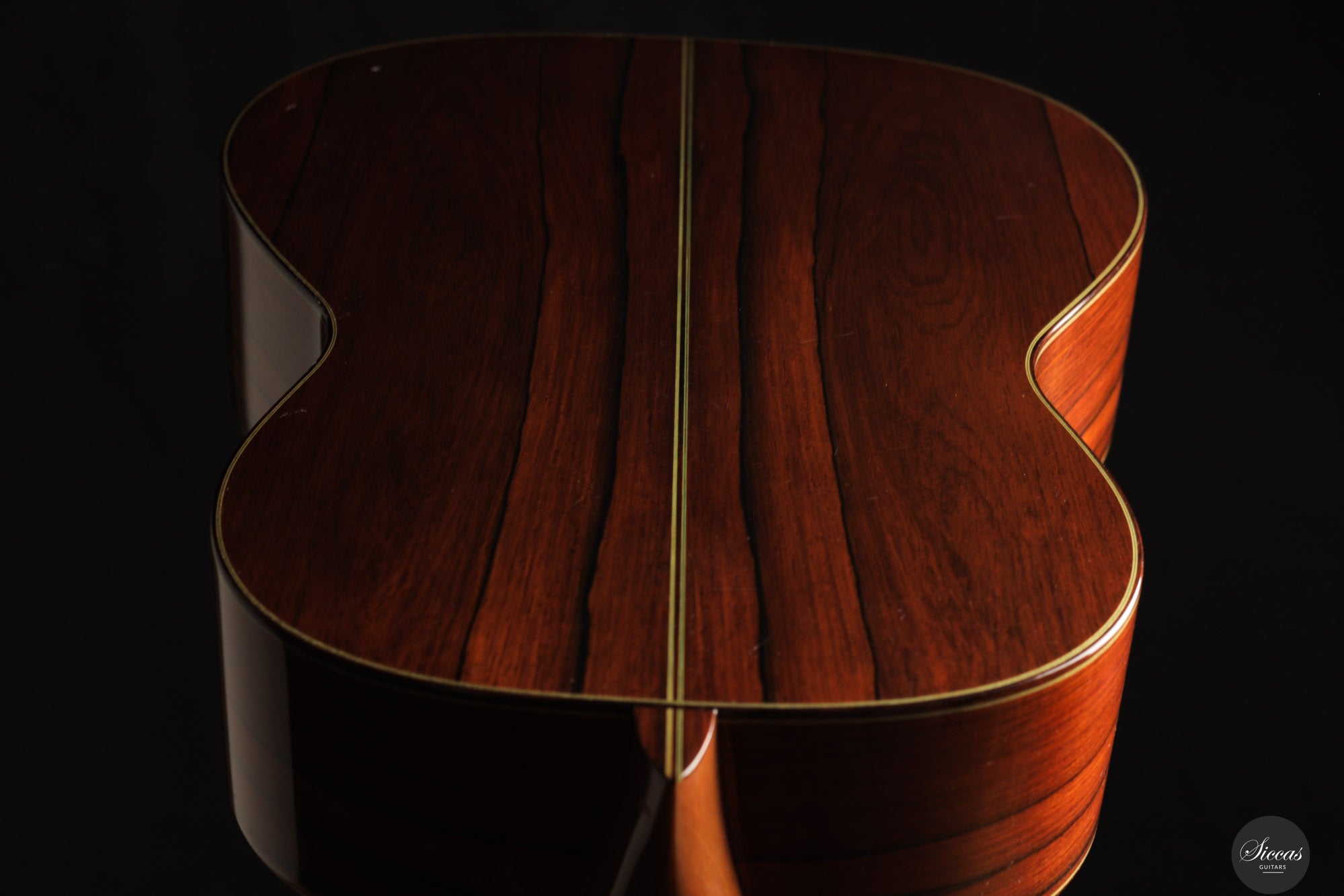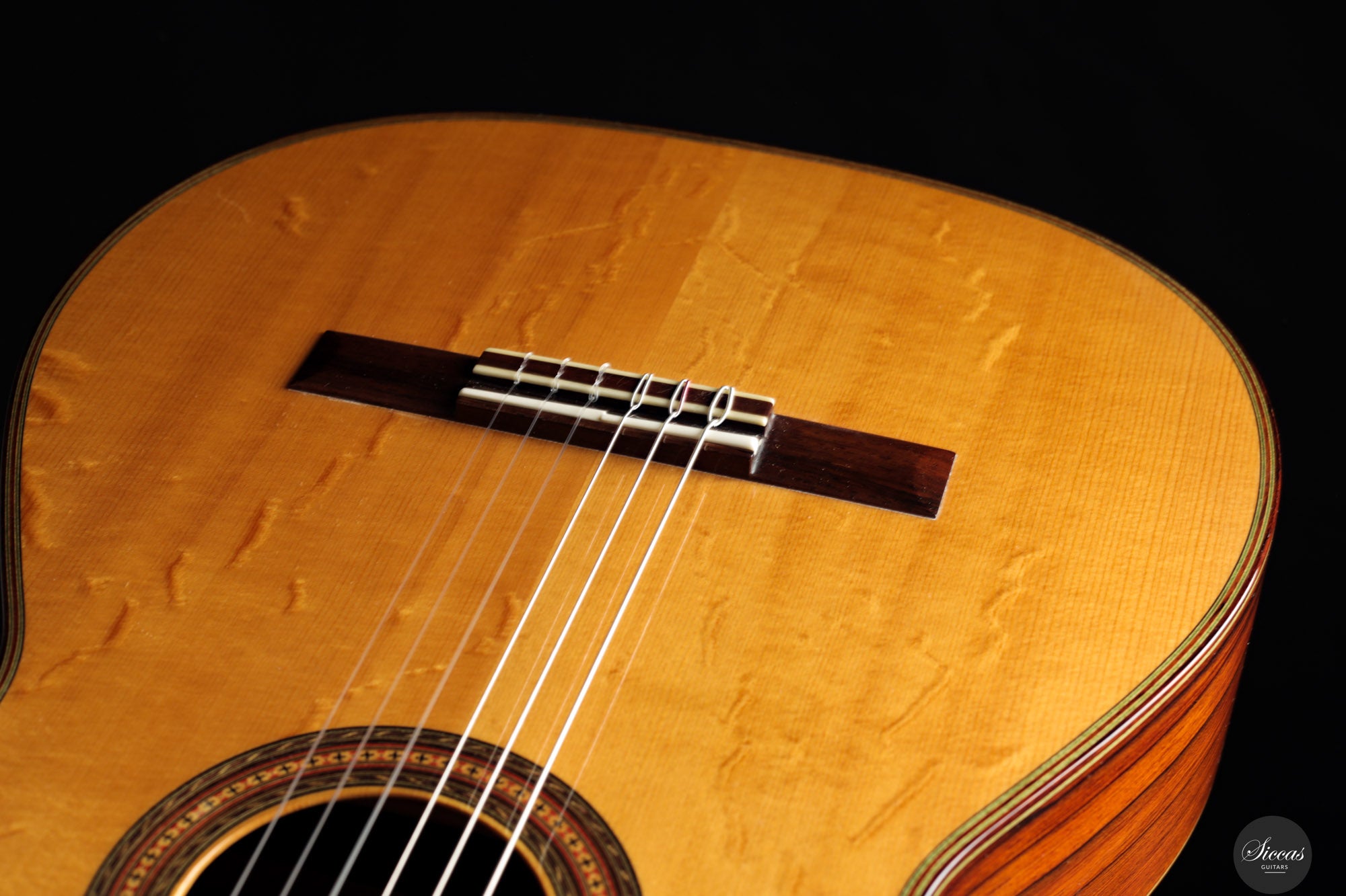 Die Gitarre befindet sich in ausgezeichnetem Zustand ohne strukturelle Beeinträchtigungen. Die Haselfichtendecke, der Steg sowie Sattel und Stegeinlage aus japanischem Rinderknochen sind hervorragend erhalten. Das Instrument wurde äußerst sorgfältig gepflegt. Der originale Koffer weist lediglich leichte Gebrauchsspuren auf und ist weiterhin voll funktionstüchtig.