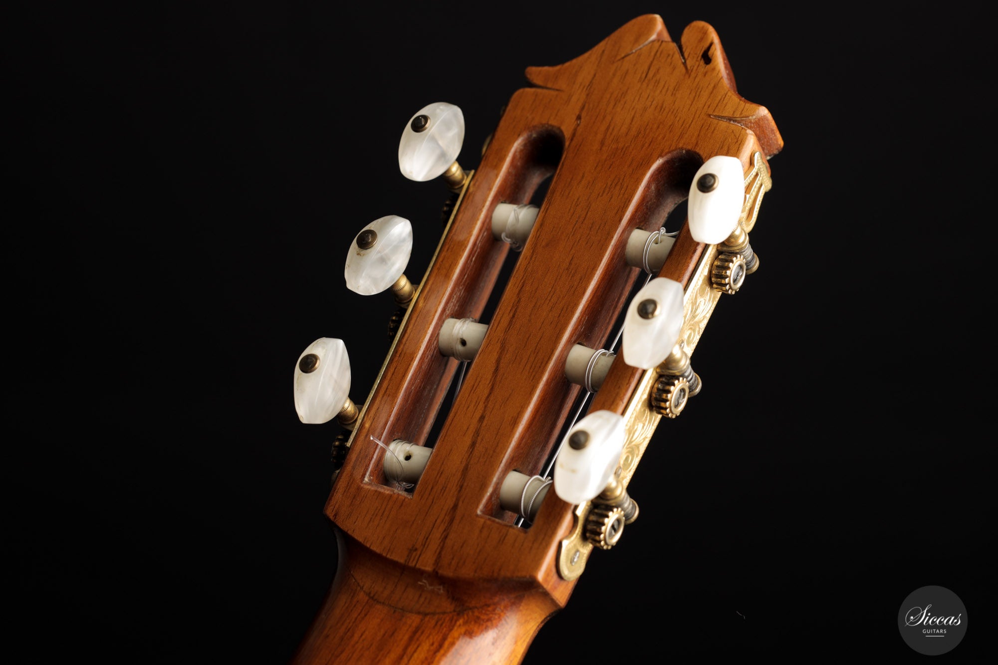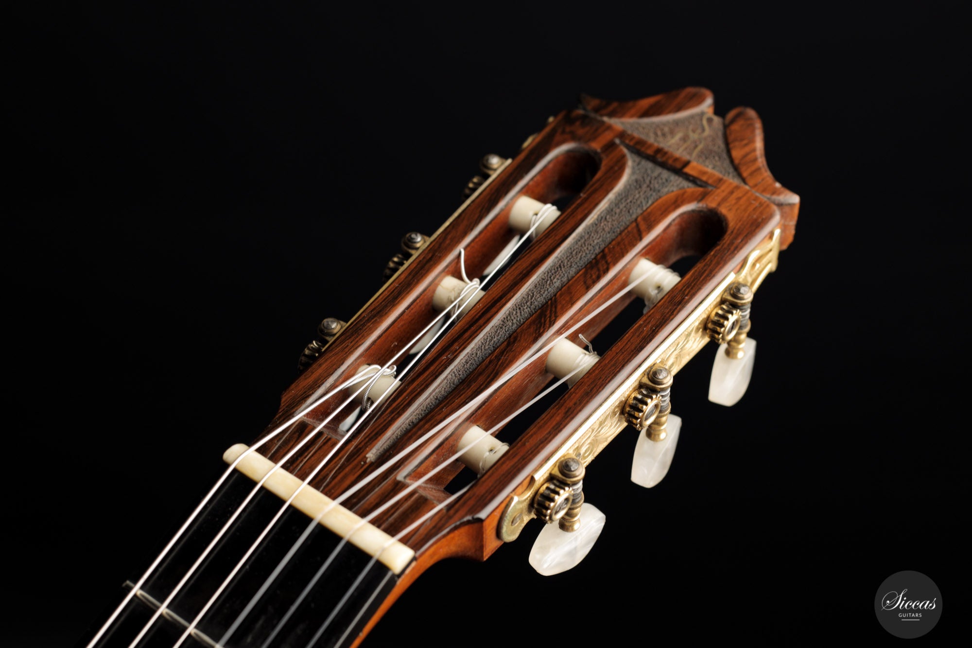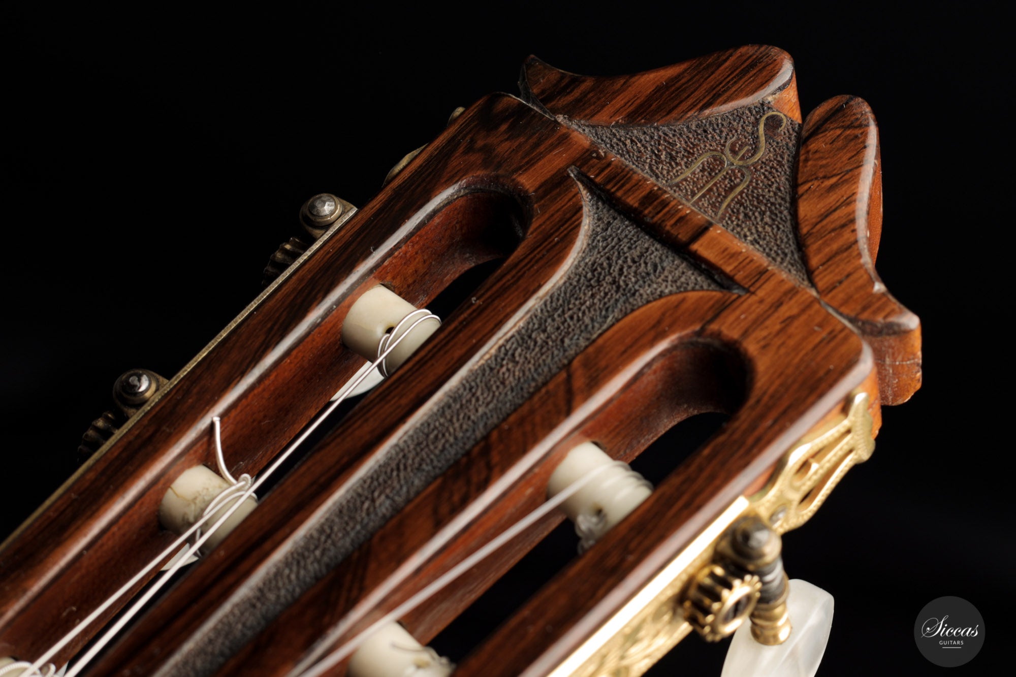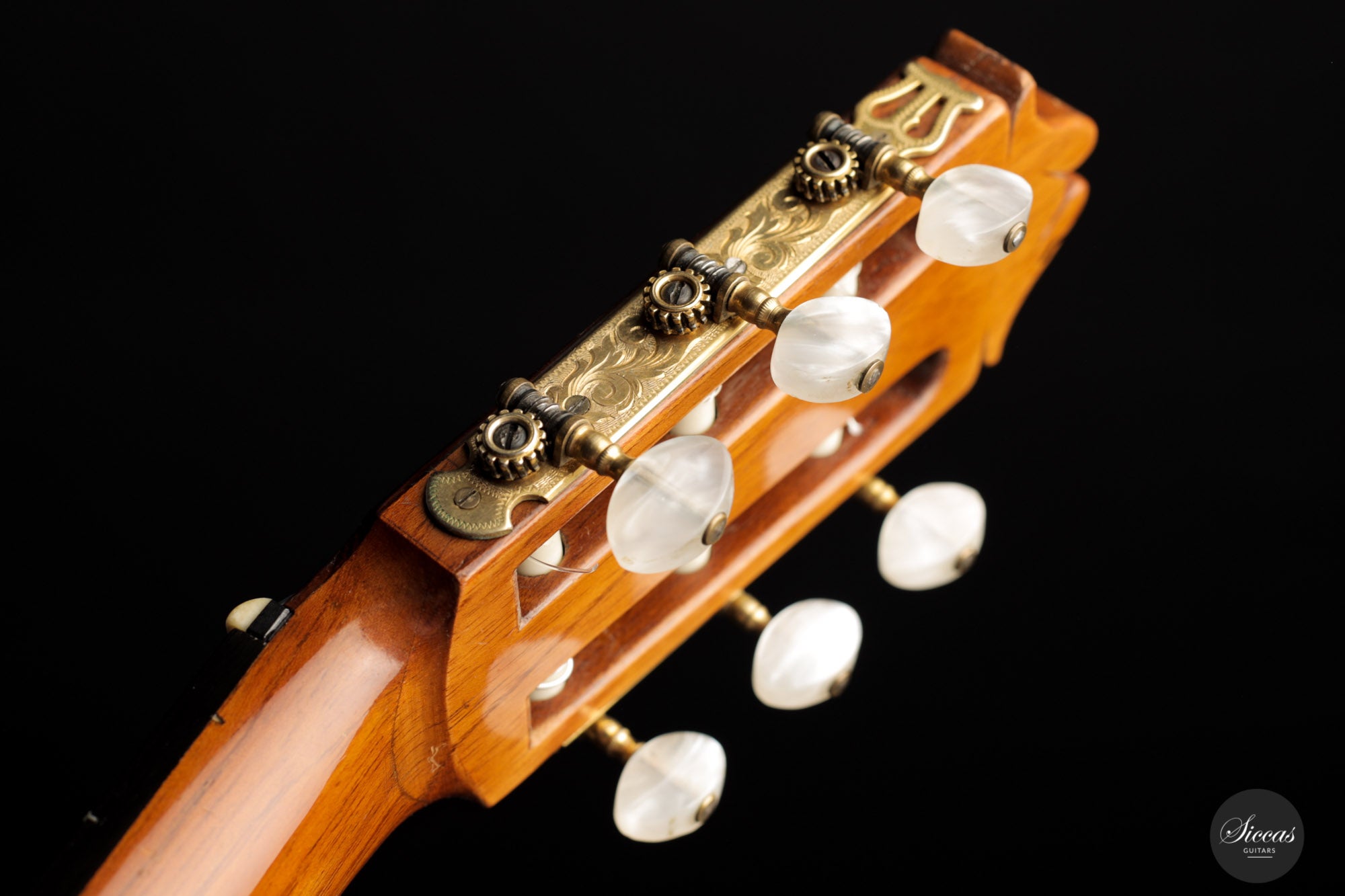 Besides, the Spanish virtuoso was a close friend of Hernandez y Aguado and an early promoter of their work. Therefore, it is not surprising that the two luthiers created an extraordinary guitar for him, skilfully engraving the maestro's initials in the rosewood of the head veneer. A vivid photo from 1972 shows the maestro with this well recognizable 1961 Hernandez y Aguado (courtesy of the Biblioteca Digital Memoriademadrid).