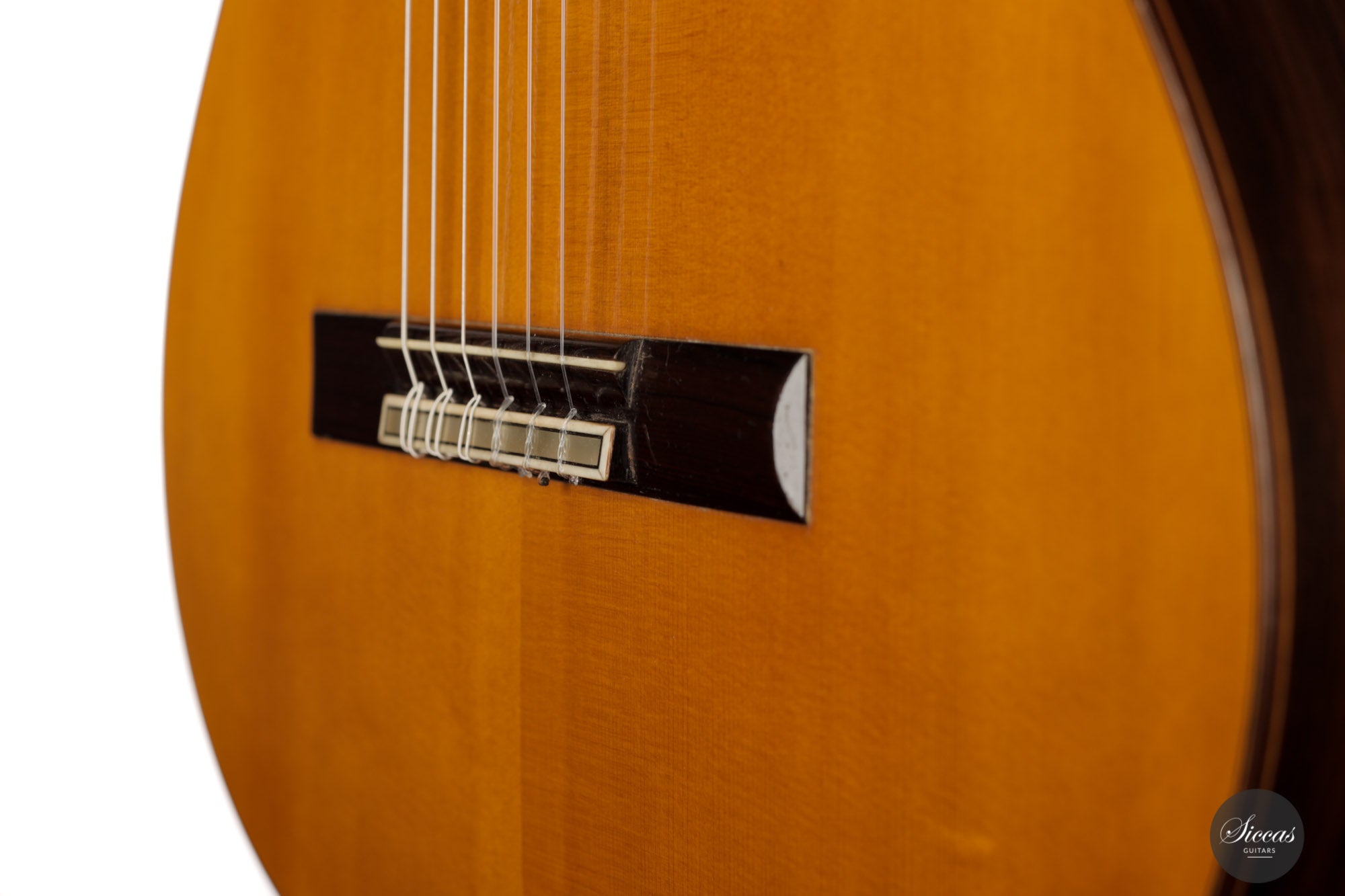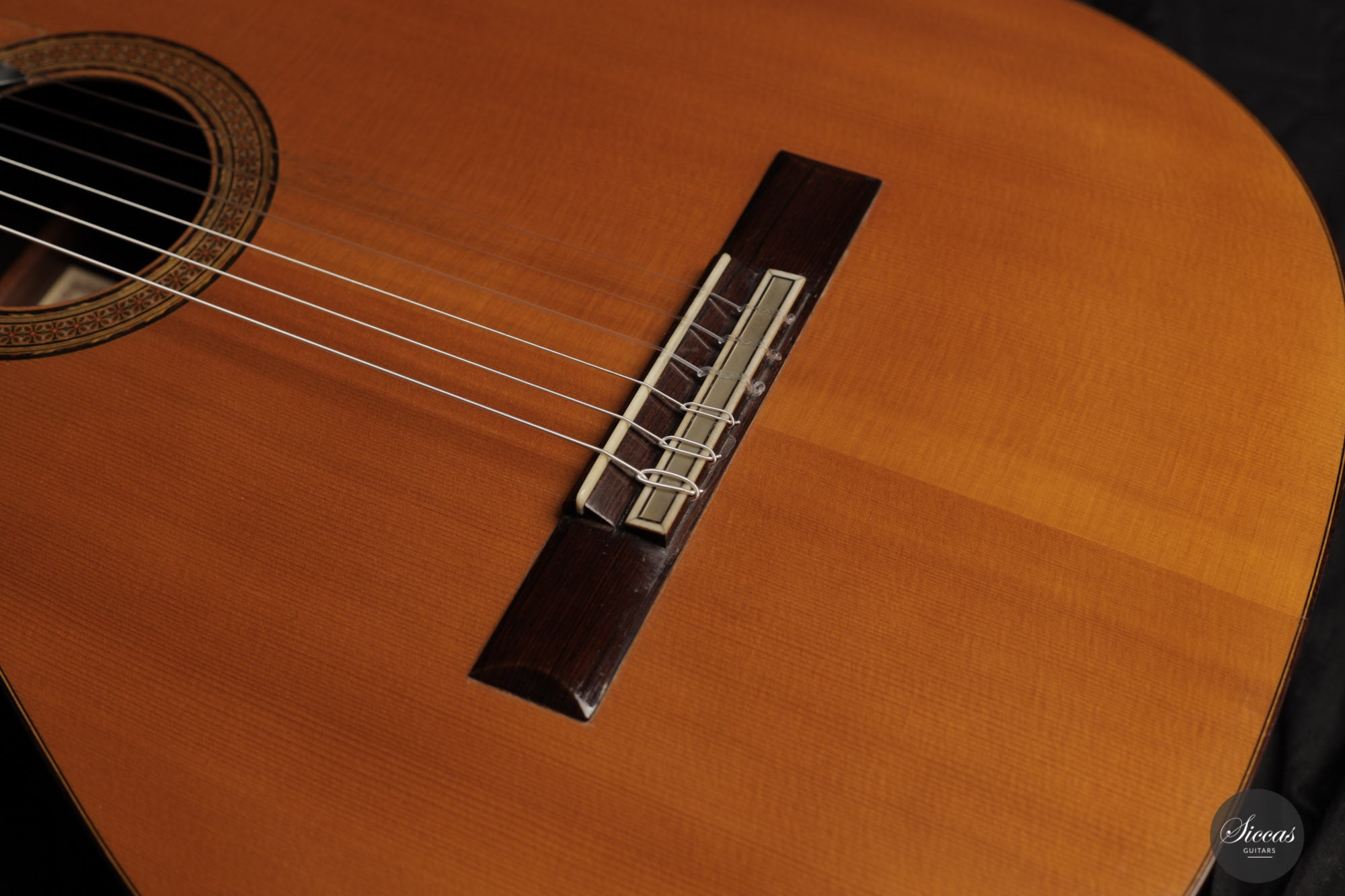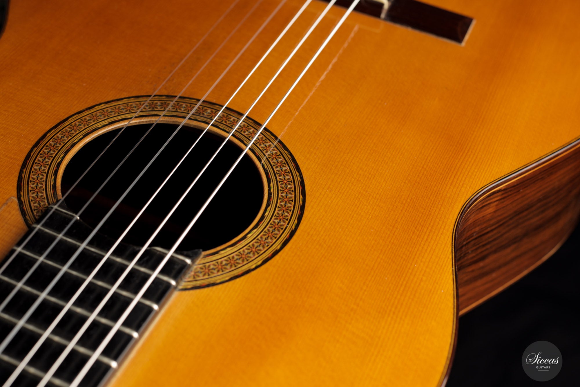 Dating from the golden age of Hernandez y Aguado, this instrument is in fantastic condition, having been highly valued and cared for by its only owner after Regino Sainz de la Maza. Hence, there are only minor signs of play and two unnoticeable cracks (professionally repaired and stable) on both sides of the fingerboard. Sound-wise, this guitar meets all expectations one would associate with such an exceptional instrument. It sounds expressive and present, the treble can easily and beautifully be brought to sing, and even fast and demanding parts come easily with this guitar. The balance between basses and trebles is excellent and overall it is not only a great pleasure to play but also incredibly inspiring.