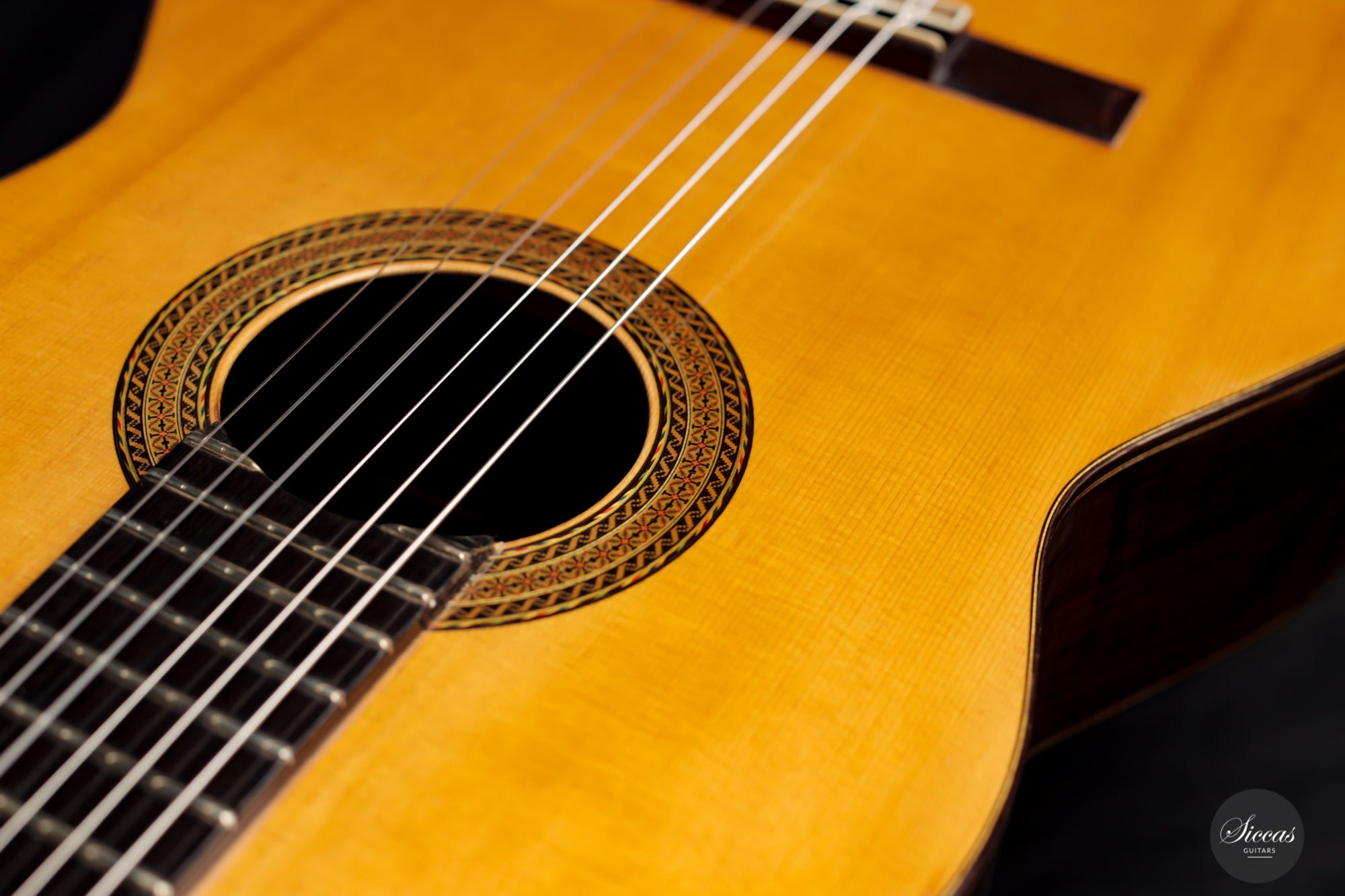 Außerdem verleiht die charakteristische geschnitzte Kopfplatte von H. y A. dieser Gitarre ein unverwechselbares Aussehen und die Rosette ist die größte und prächtigste ist, die von der Madrilenischen Werkstatt hergestellt wurde. Sie zeigt farbenreiche und kunstvolle Intarsien, viel umfangreicher als bei den meisten H y A-Gitarren. Klanglich weist sie alle Merkmale auf, für welche die faszinierenden Isntrumente dieses bemerkenswerten Gitarrenbauer-Duos weltweit bekannt und begehrt sind: große Ausdruckskraft, fantastisches Sustain und perfekte Intonation. Eine Gitarre wie diese ist eine absolute Rarität.