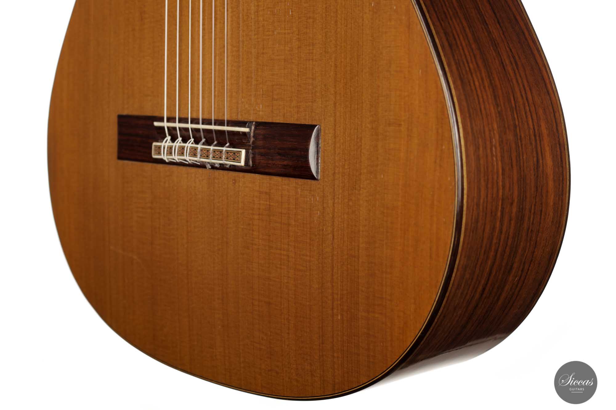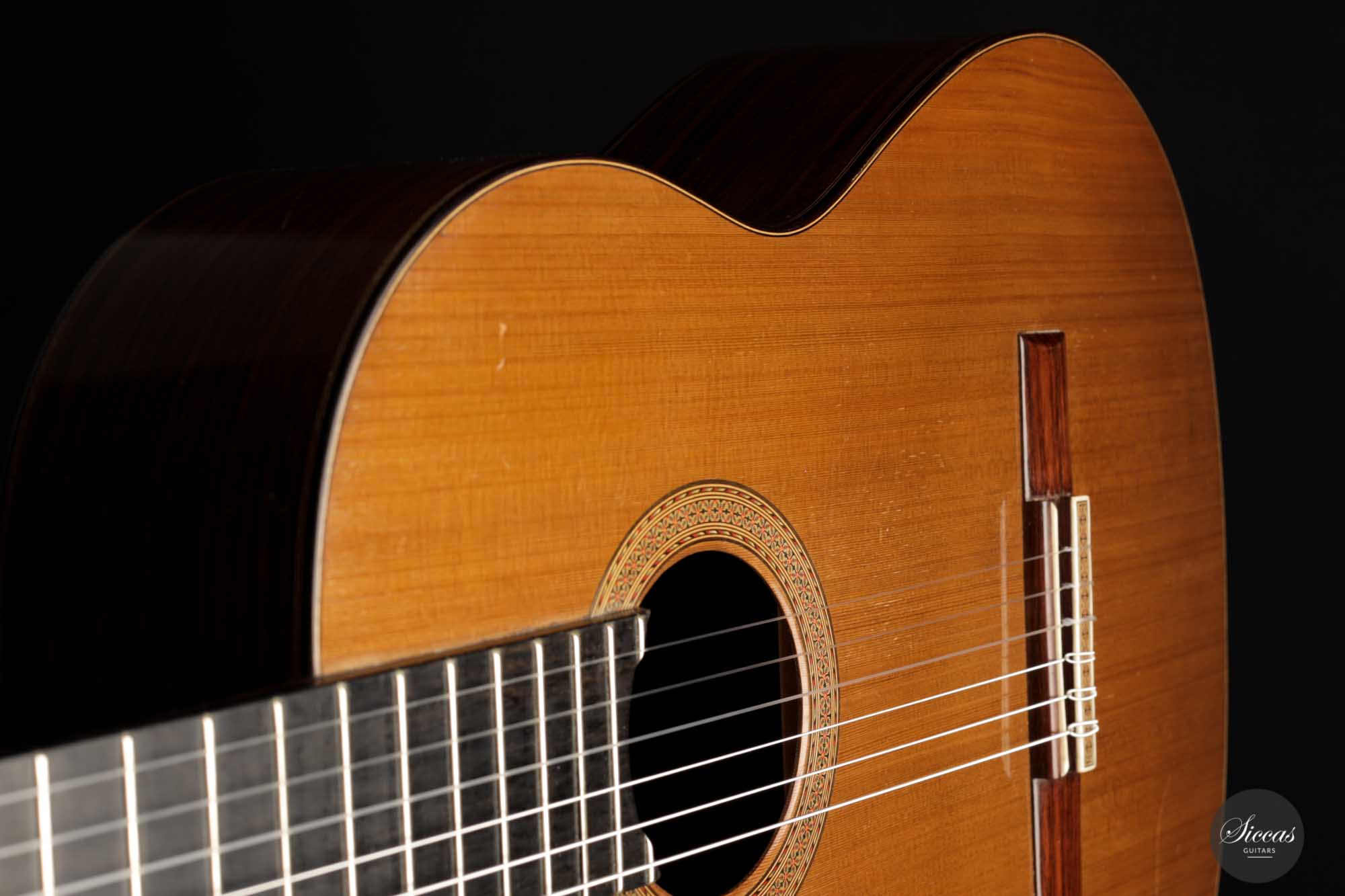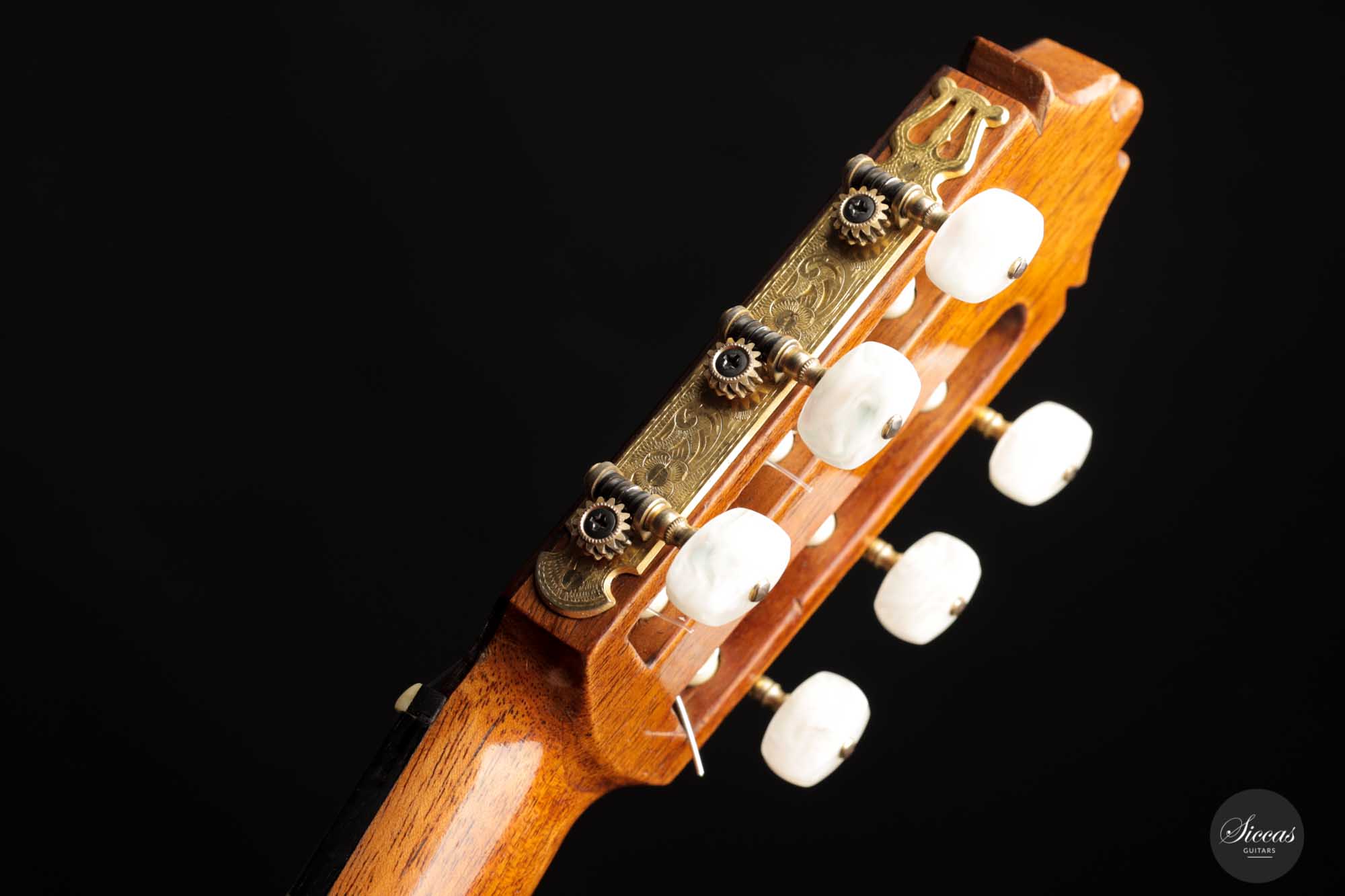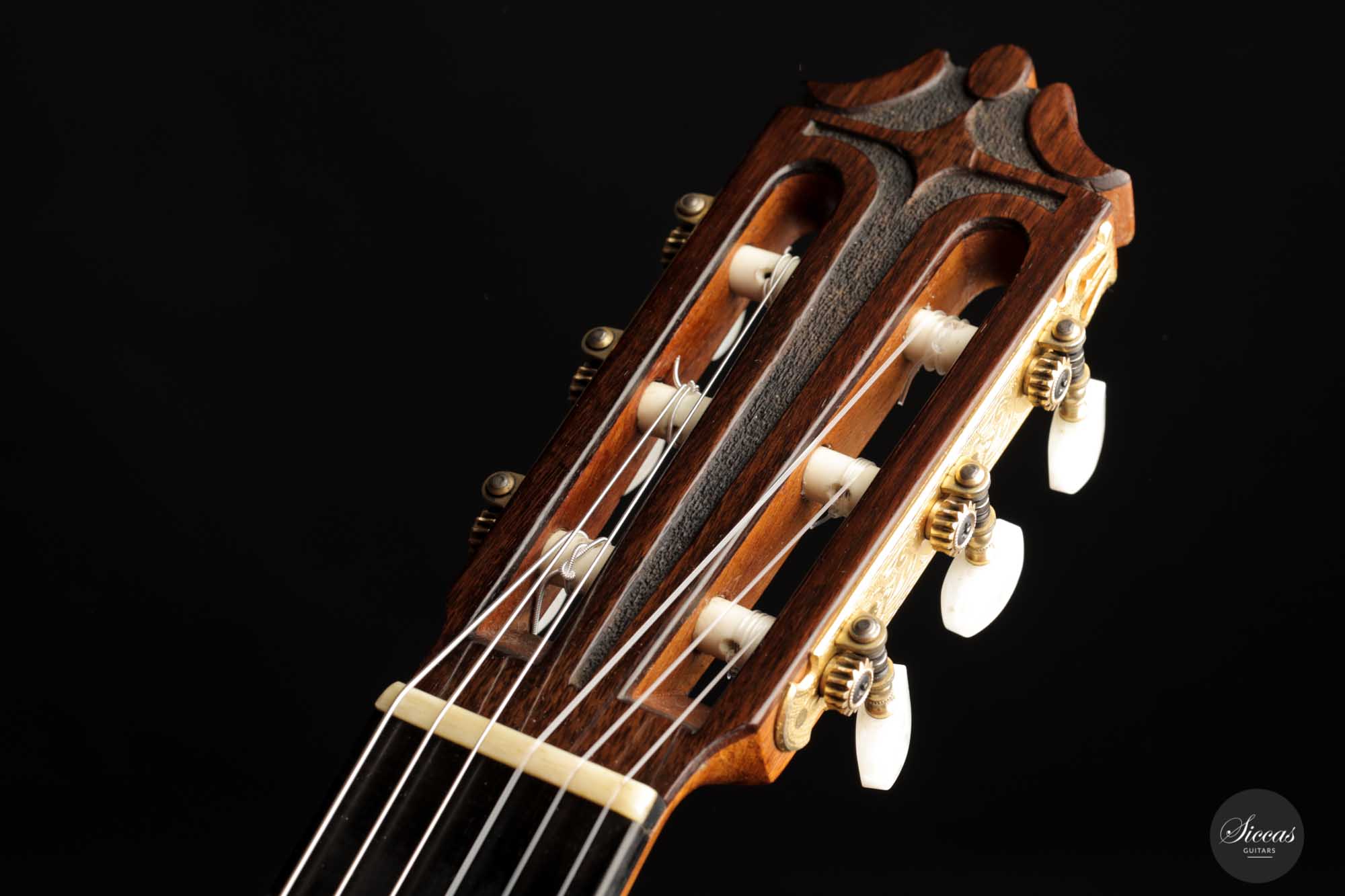 Diese Gitarre ist ein sehr interessantes Instrument aus den letzten Jahren der Tätigkeit der Werkstatt "Hernandez y Aguado". Zu dieser Zeit ging Victoriano Aguado, der hauptsächlich für die Lackierung der Gitarren und die Herstellung der Hälse zuständig war, in den Ruhestand, und Manuel Hernandez rekrutierte erfahrene Gitarrenbauer, die ihn beim Bau der Gitarren unterstützten. Die Hände, die dieses faszinierende Instrument aus dem Jahr 1973 geschaffen haben, sind die von Maestro Manuel Hernandez und dem japanischen Gitarrenbauer Hideyuki Ezaki, dem damaligen "Master Guitar Builder" von Yamaha, der eine brillante Karriere als Gitarrenbauer gemacht hat. Diese Hernandez y Aguado-Gitarre zeigt alle Anzeichen der großen HyA-Konzertgitarren in Bauqualität, Ästhetik und Klang. Sie ist von Manuel Hernandez auf dem Etikett und sowohl von H. Ezaki als auch von M. Hernandez im Inneren des Resonanzbodens handsigniert. Dort ist auch das Baujahr angegeben. Der Kopf ist, wie bei HyAs Gitarren üblich, handgeschnitzt und hat ein besonderes Design, das sie einzigartig macht. Meistens war Victoriano derjenige, der das Design der Kopfplatte entwarf, auch nachdem er sich zurückgezogen hatte, wie es bei den Gitarren von Jesus Belezar der Fall ist. Außerdem ist der Zustand der Gitarre atemberaubend, mit nur einem unauffälligen Haarriss an der Verbindung zwischen Griffbrett und Decke und oberflächlichen Spielspuren.