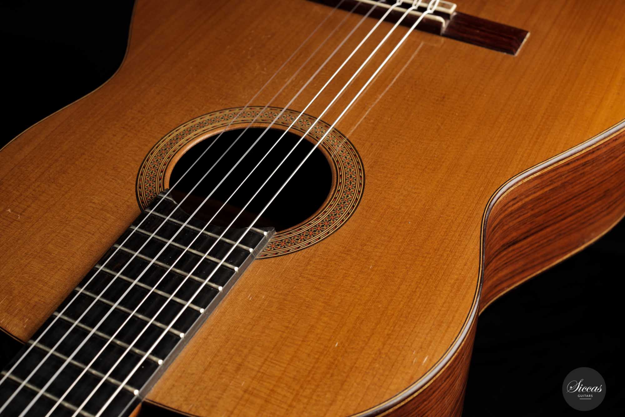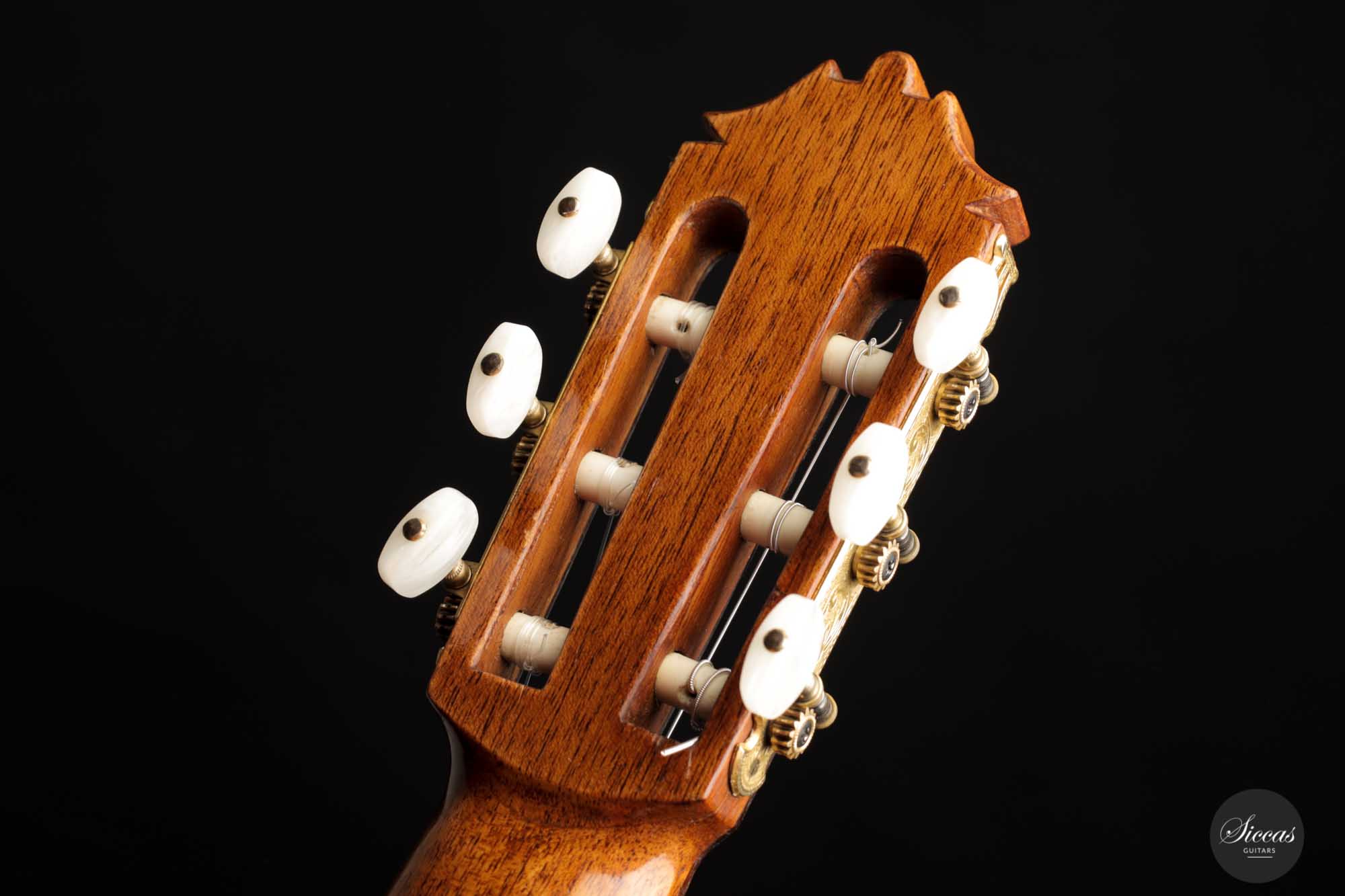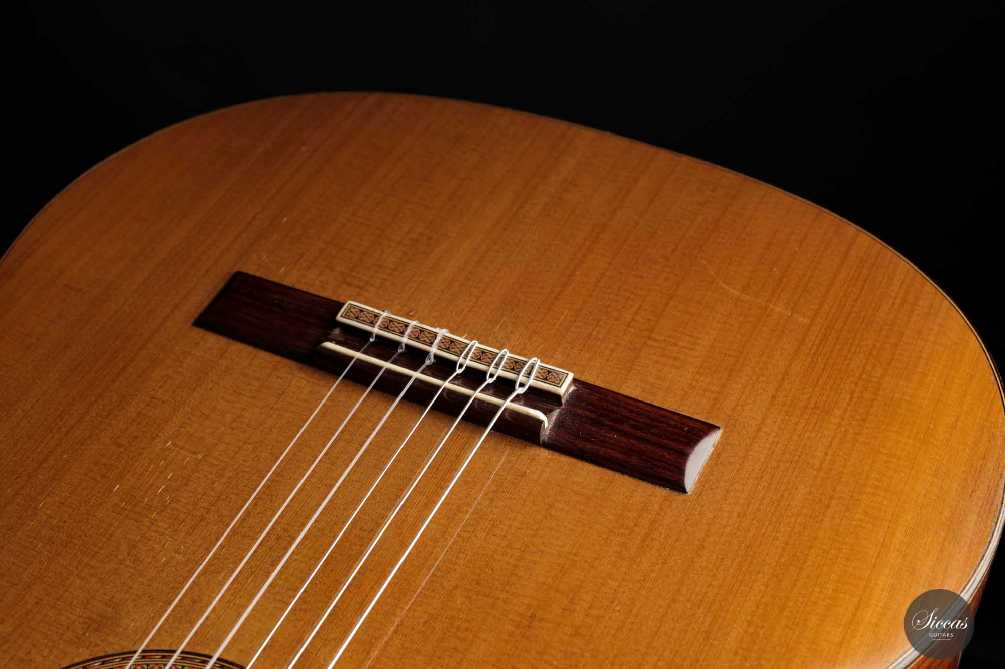 Diese Gitarre ist ein sehr interessantes Instrument aus den letzten Jahren der Tätigkeit der Werkstatt "Hernandez y Aguado". Zu dieser Zeit ging Victoriano Aguado, der hauptsächlich für die Lackierung der Gitarren und die Herstellung der Hälse zuständig war, in den Ruhestand, und Manuel Hernandez rekrutierte erfahrene Gitarrenbauer, die ihn beim Bau der Gitarren unterstützten. Die Hände, die dieses faszinierende Instrument aus dem Jahr 1973 geschaffen haben, sind die von Maestro Manuel Hernandez und dem japanischen Gitarrenbauer Hideyuki Ezaki, dem damaligen "Master Guitar Builder" von Yamaha, der eine brillante Karriere als Gitarrenbauer gemacht hat. Diese Hernandez y Aguado-Gitarre zeigt alle Anzeichen der großen HyA-Konzertgitarren in Bauqualität, Ästhetik und Klang. Sie ist von Manuel Hernandez auf dem Etikett und sowohl von H. Ezaki als auch von M. Hernandez im Inneren des Resonanzbodens handsigniert. Dort ist auch das Baujahr angegeben. Der Kopf ist, wie bei HyAs Gitarren üblich, handgeschnitzt und hat ein besonderes Design, das sie einzigartig macht. Meistens war Victoriano derjenige, der das Design der Kopfplatte entwarf, auch nachdem er sich zurückgezogen hatte, wie es bei den Gitarren von Jesus Belezar der Fall ist. Außerdem ist der Zustand der Gitarre atemberaubend, mit nur einem unauffälligen Haarriss an der Verbindung zwischen Griffbrett und Decke und oberflächlichen Spielspuren.