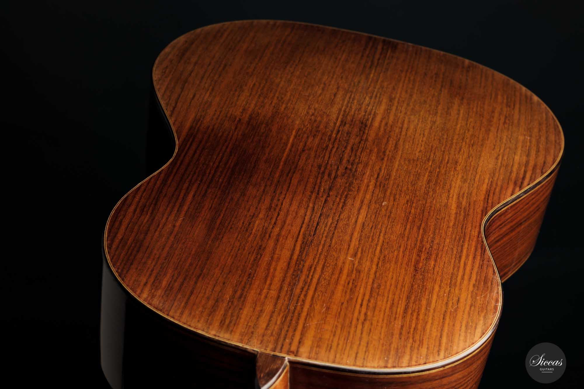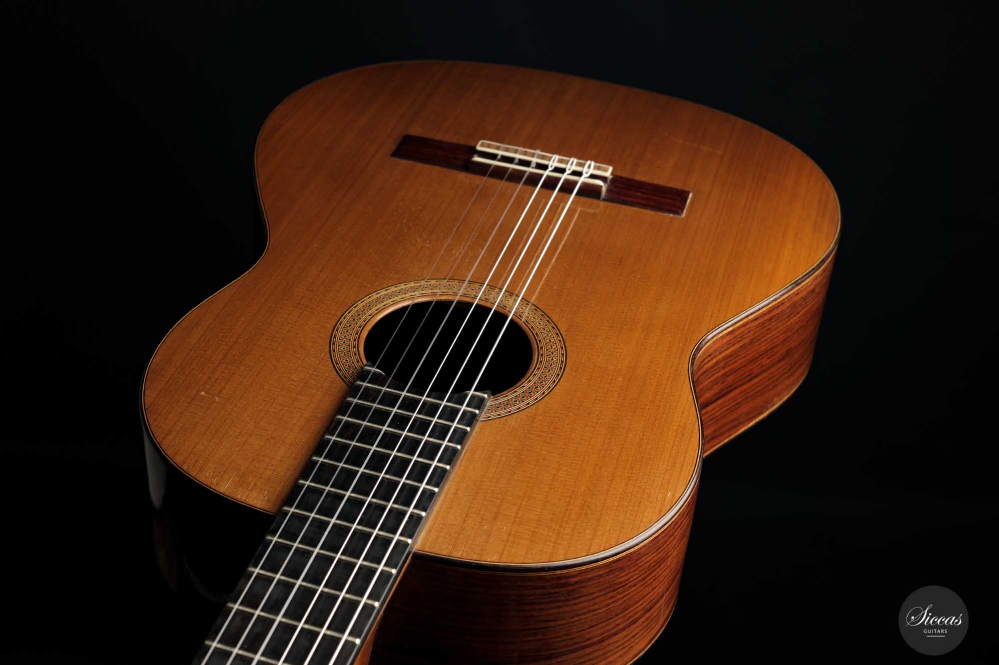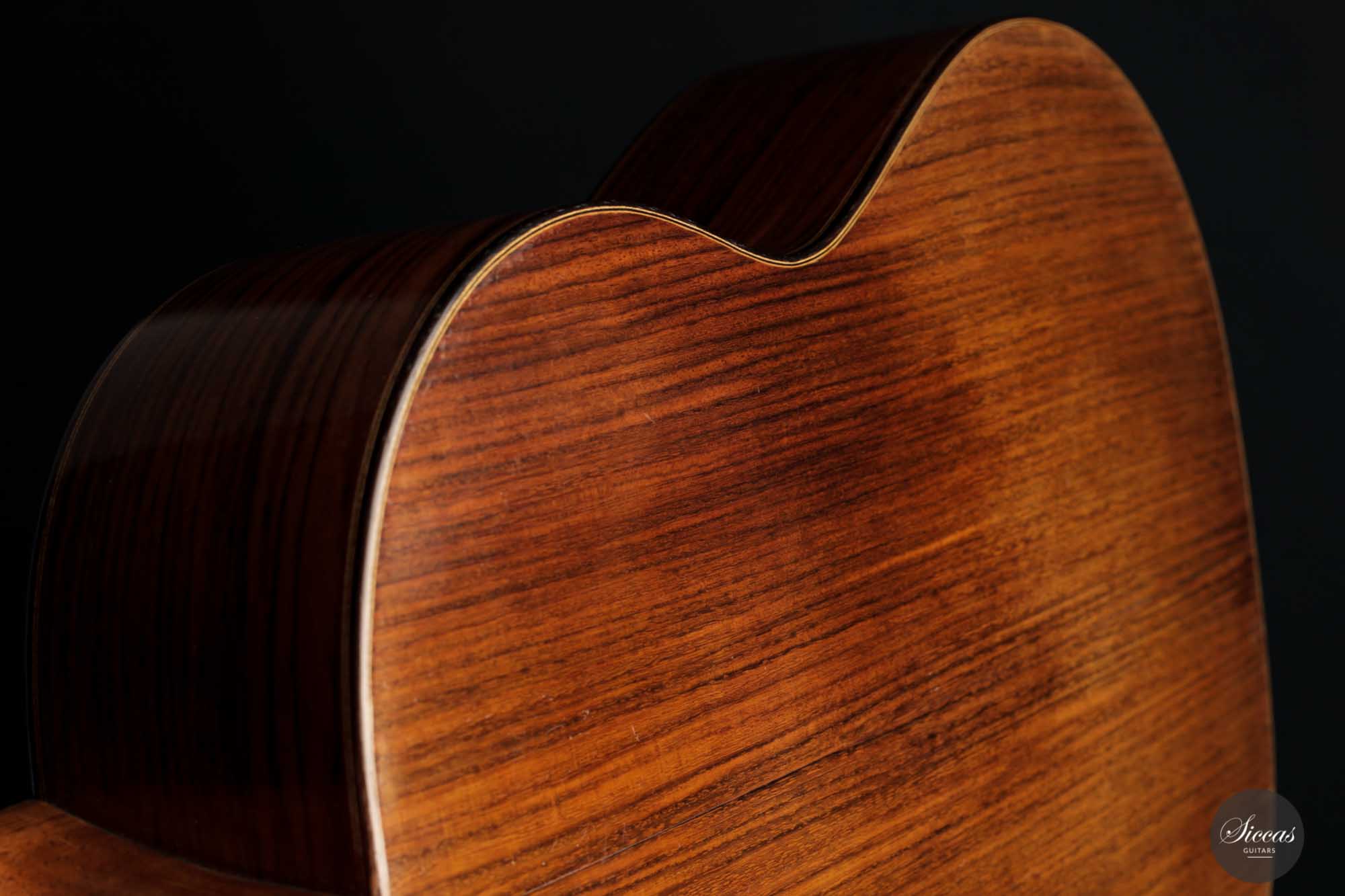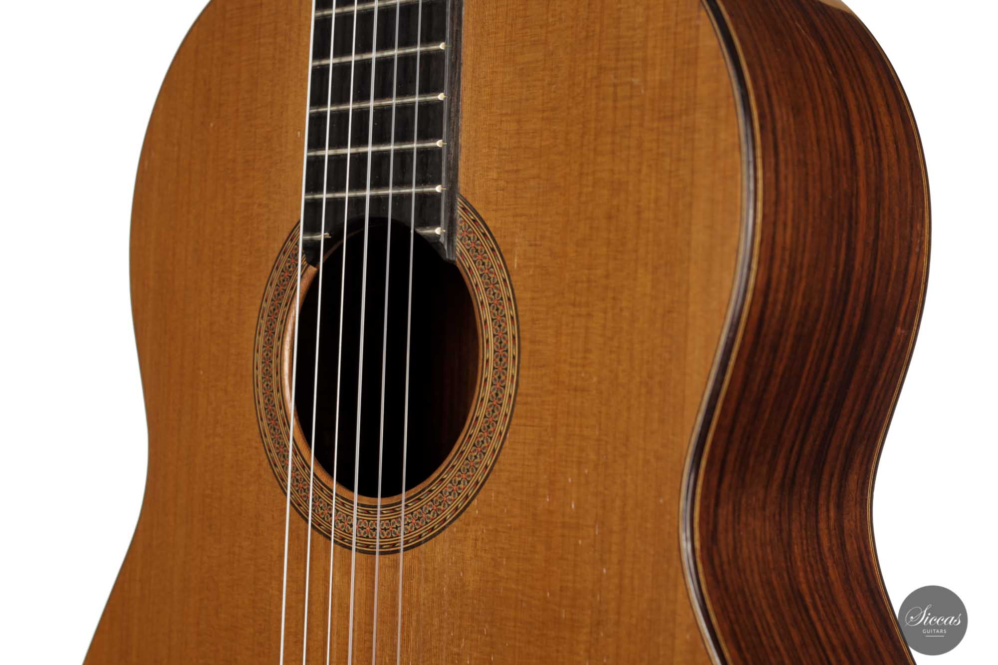 Diese Gitarre ist ein sehr interessantes Instrument aus den letzten Jahren der Tätigkeit der Werkstatt "Hernandez y Aguado". Zu dieser Zeit ging Victoriano Aguado, der hauptsächlich für die Lackierung der Gitarren und die Herstellung der Hälse zuständig war, in den Ruhestand, und Manuel Hernandez rekrutierte erfahrene Gitarrenbauer, die ihn beim Bau der Gitarren unterstützten. Die Hände, die dieses faszinierende Instrument aus dem Jahr 1973 geschaffen haben, sind die von Maestro Manuel Hernandez und dem japanischen Gitarrenbauer Hideyuki Ezaki, dem damaligen "Master Guitar Builder" von Yamaha, der eine brillante Karriere als Gitarrenbauer gemacht hat. Diese Hernandez y Aguado-Gitarre zeigt alle Anzeichen der großen HyA-Konzertgitarren in Bauqualität, Ästhetik und Klang. Sie ist von Manuel Hernandez auf dem Etikett und sowohl von H. Ezaki als auch von M. Hernandez im Inneren des Resonanzbodens handsigniert. Dort ist auch das Baujahr angegeben. Der Kopf ist, wie bei HyAs Gitarren üblich, handgeschnitzt und hat ein besonderes Design, das sie einzigartig macht. Meistens war Victoriano derjenige, der das Design der Kopfplatte entwarf, auch nachdem er sich zurückgezogen hatte, wie es bei den Gitarren von Jesus Belezar der Fall ist. Außerdem ist der Zustand der Gitarre atemberaubend, mit nur einem unauffälligen Haarriss an der Verbindung zwischen Griffbrett und Decke und oberflächlichen Spielspuren.