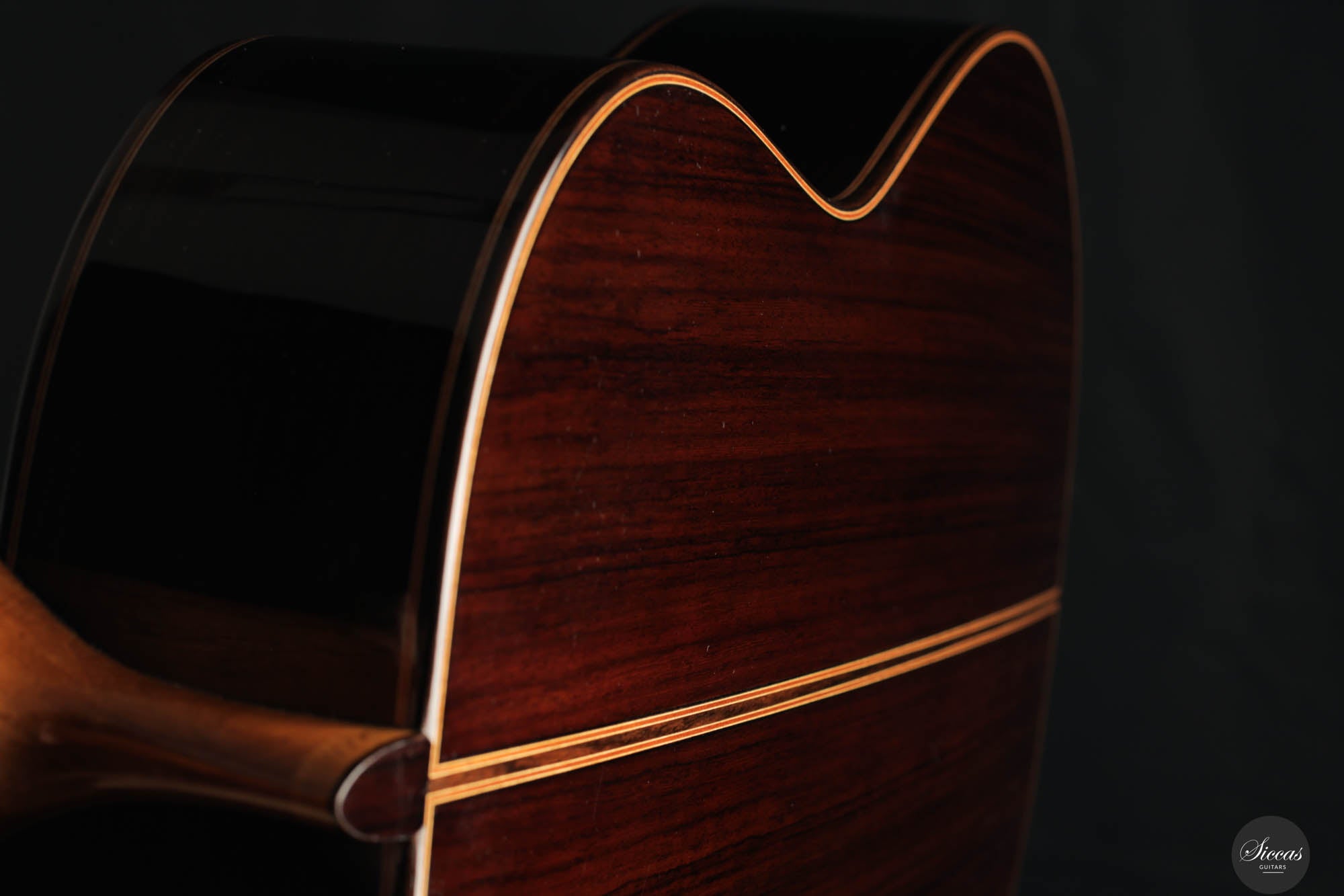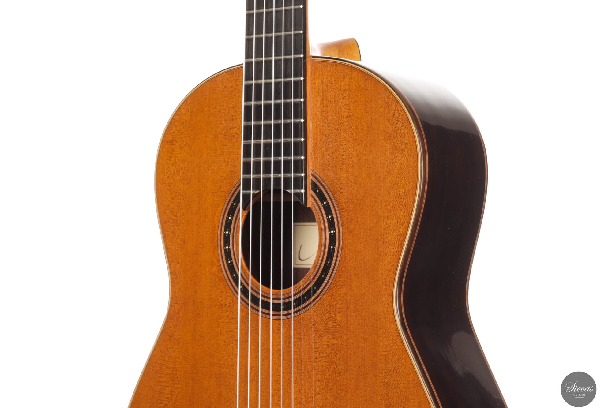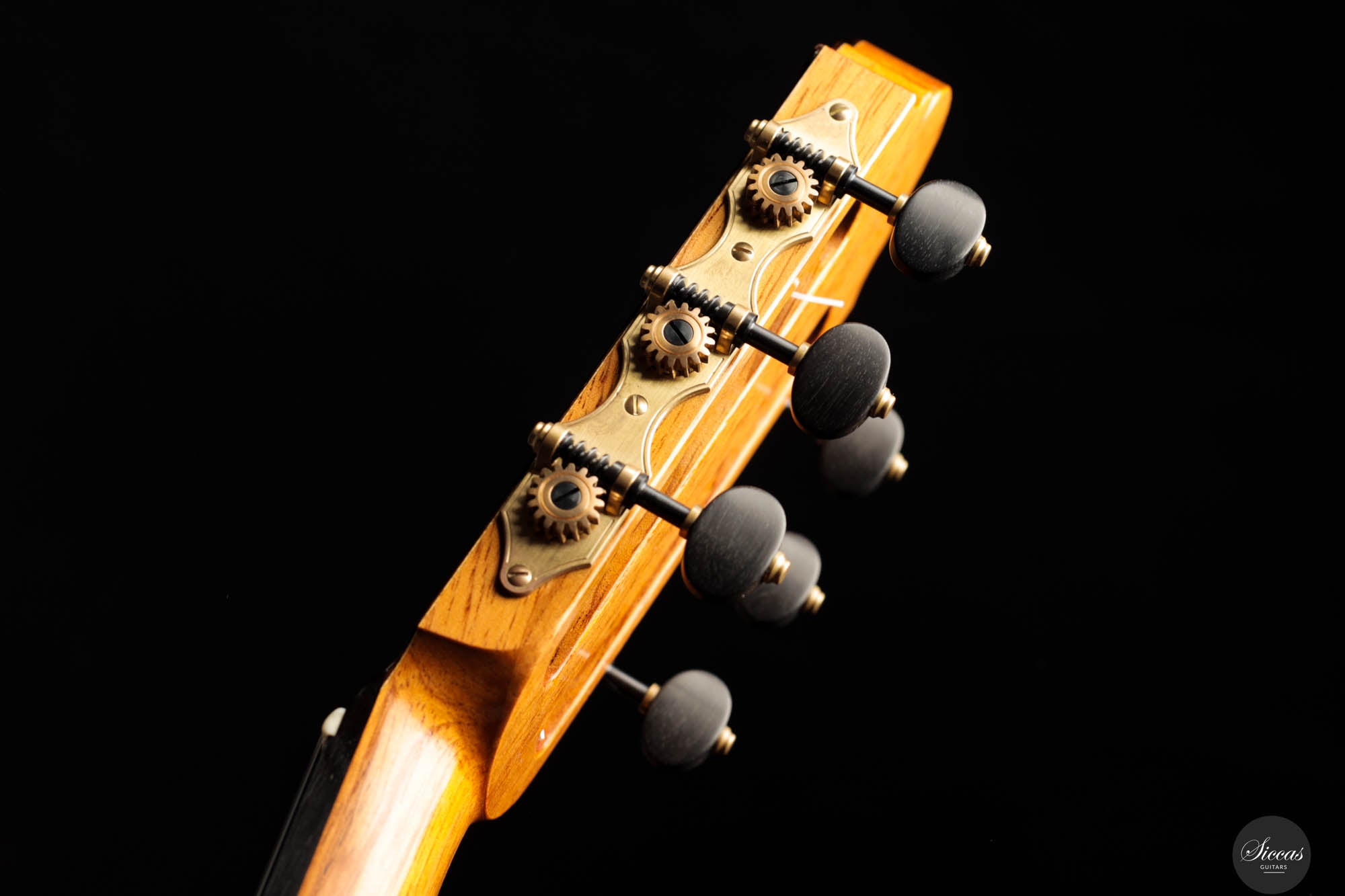 This instrument is a marvel to play, offering exceptional playability that can captivate any guitarist. It features a tiny, strategically placed cleat near the heel on the side, a subtle addition that Jakob incorporates routinely as a preventative measure against potential structural issues. This detail underscores his meticulous approach to durability without compromising the guitar’s aesthetic or sound quality. For enthusiasts and professional musicians alike, owning a Jakob Lebisch guitar means experiencing the blend of artistry and engineering that makes his guitars not just instruments, but true works of art. This particular guitar, free from any structural problems, is a dream to play and a testament to Jakob’s innovative craftsmanship and visionary approach to guitar building.