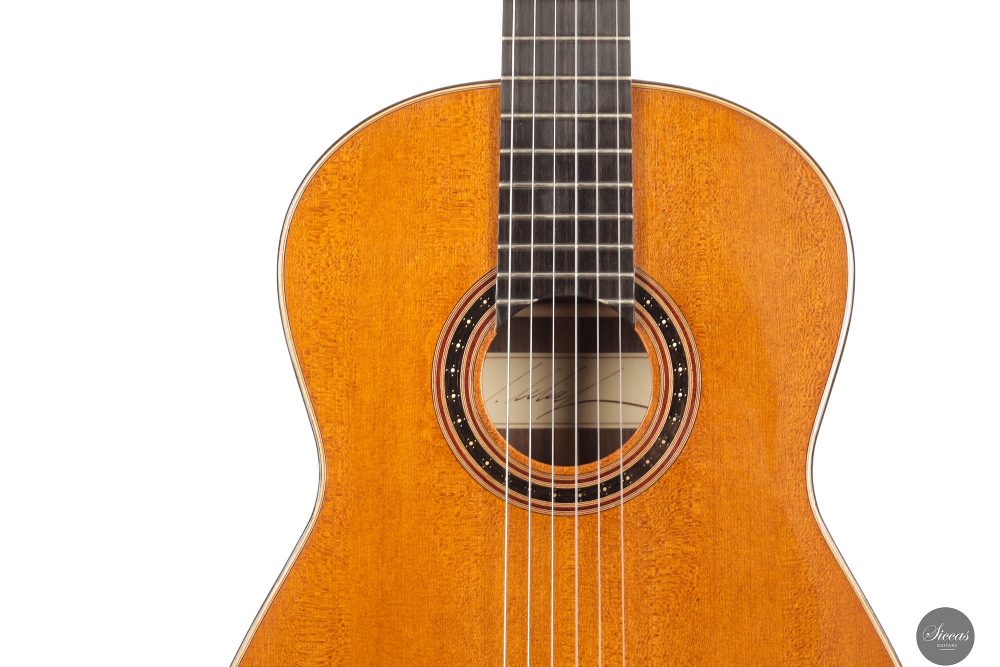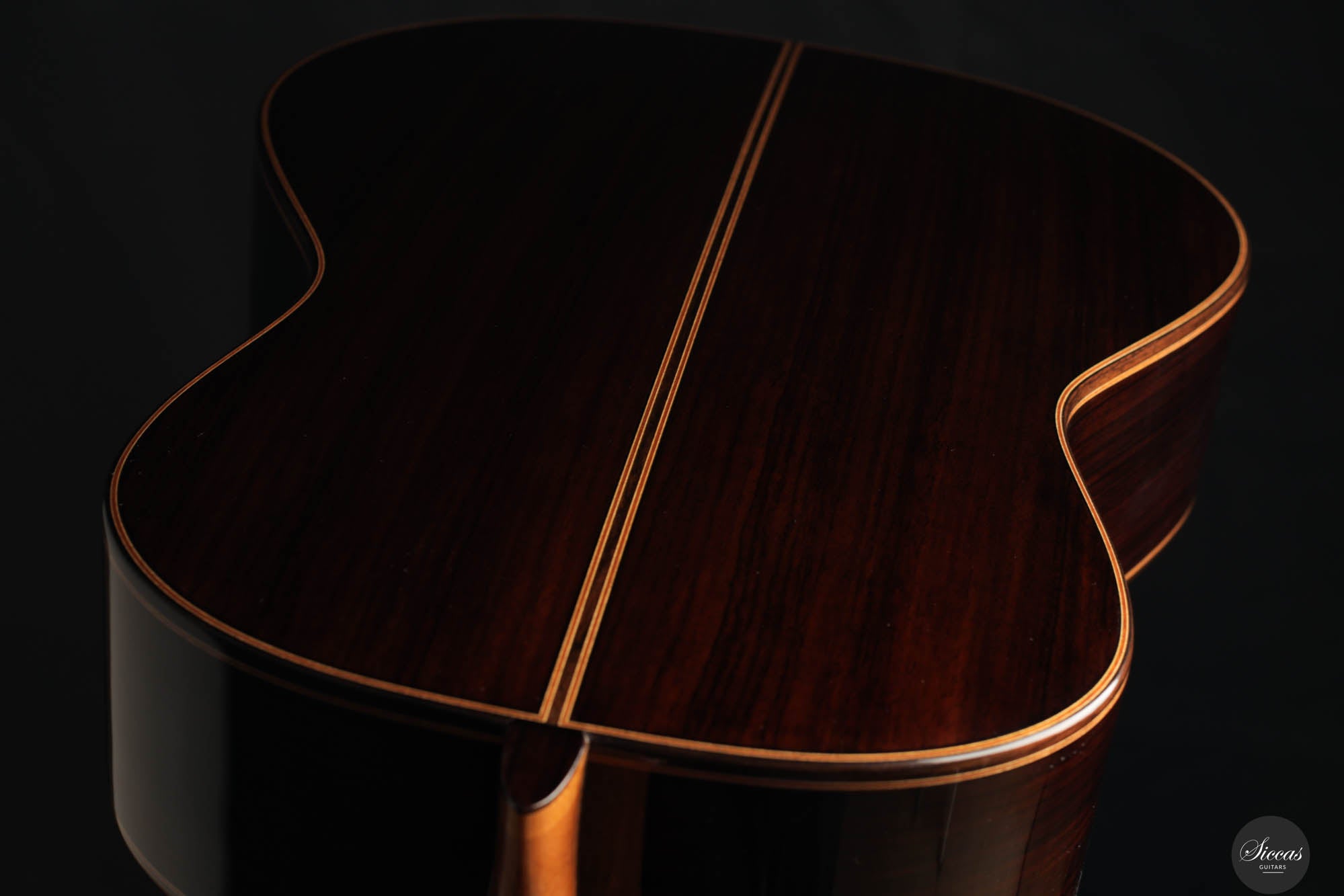 Jakob Lebisch, operating from Offenbach, Germany, near Frankfurt, has rapidly gained recognition as one of the most promising young luthiers specializing in 'double-top' guitars. His 2022 creation epitomizes the pinnacle of innovation and craftsmanship within this category. Weighing just 1240 grams, this double-top guitar boasts a remarkably low air resonance at D#-E, making it a standout piece in terms of acoustic performance. Despite the challenging specifications that might seem nearly impossible to achieve, Jakob has mastered the design intricacies, solidifying his reputation as one of the elite double-top builders. The guitar's construction is not only a testament to his technical skill but also a reflection of his dedication to pushing the boundaries of traditional guitar making.