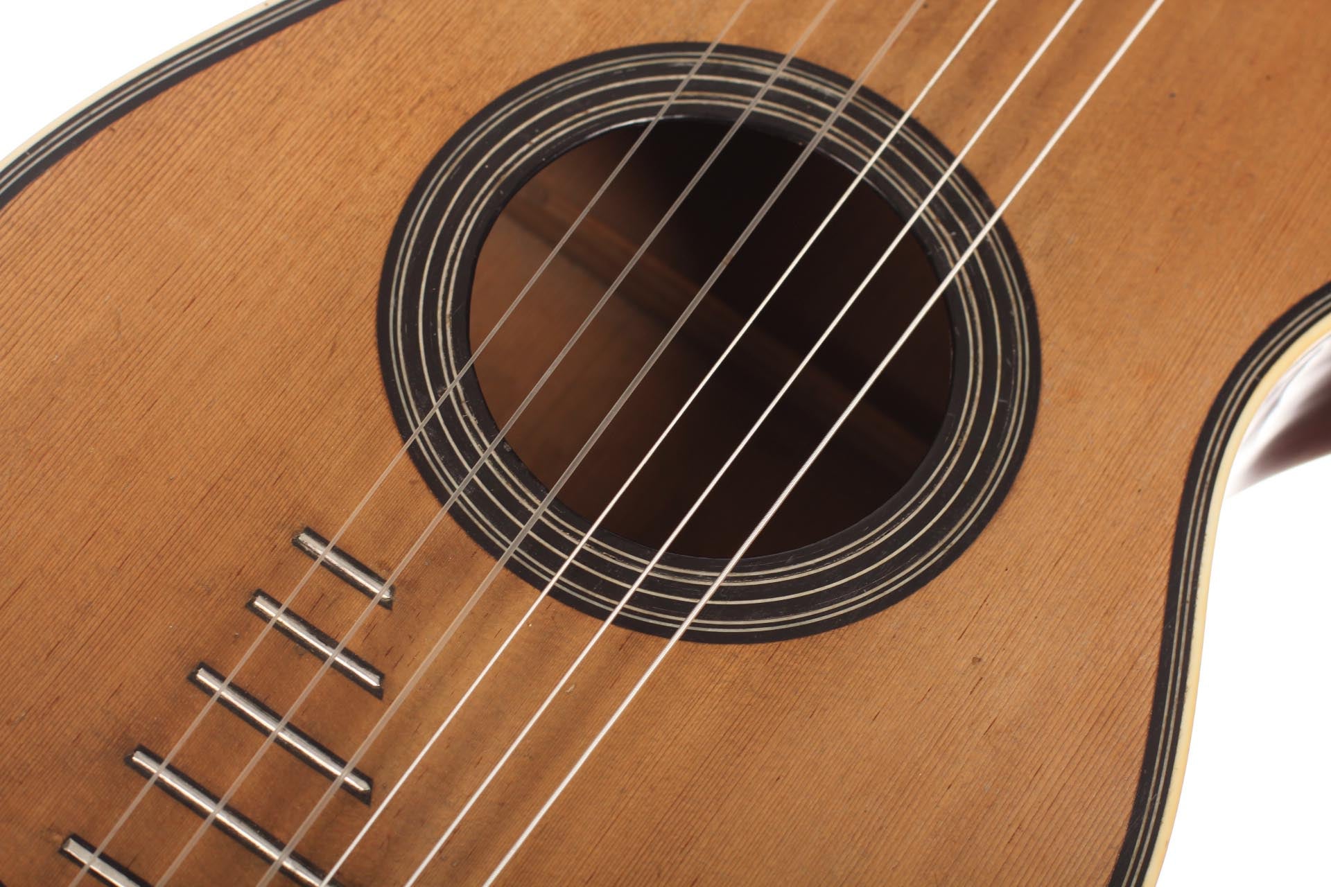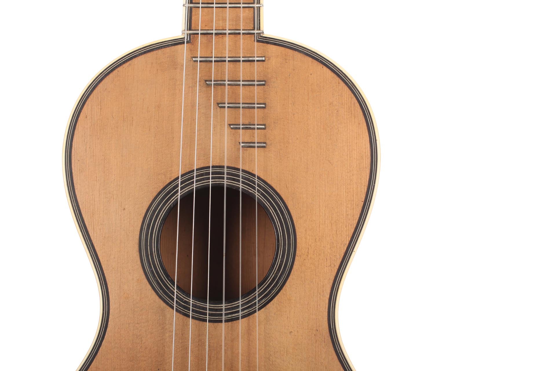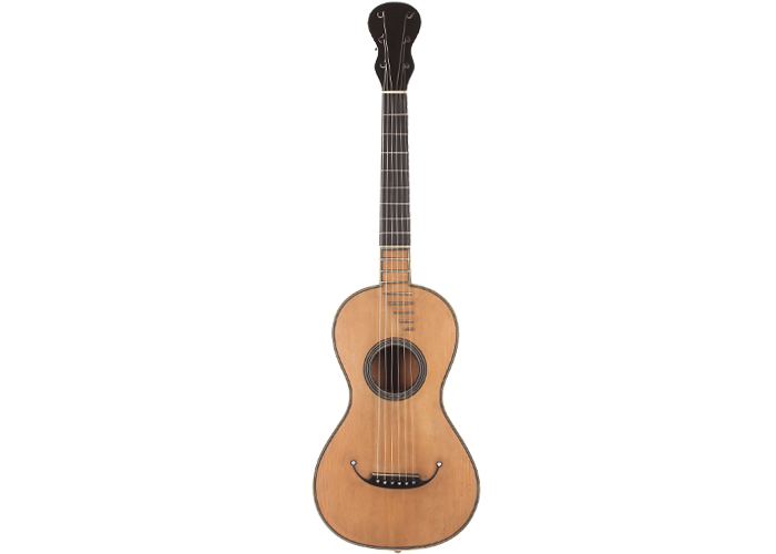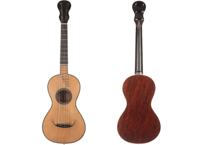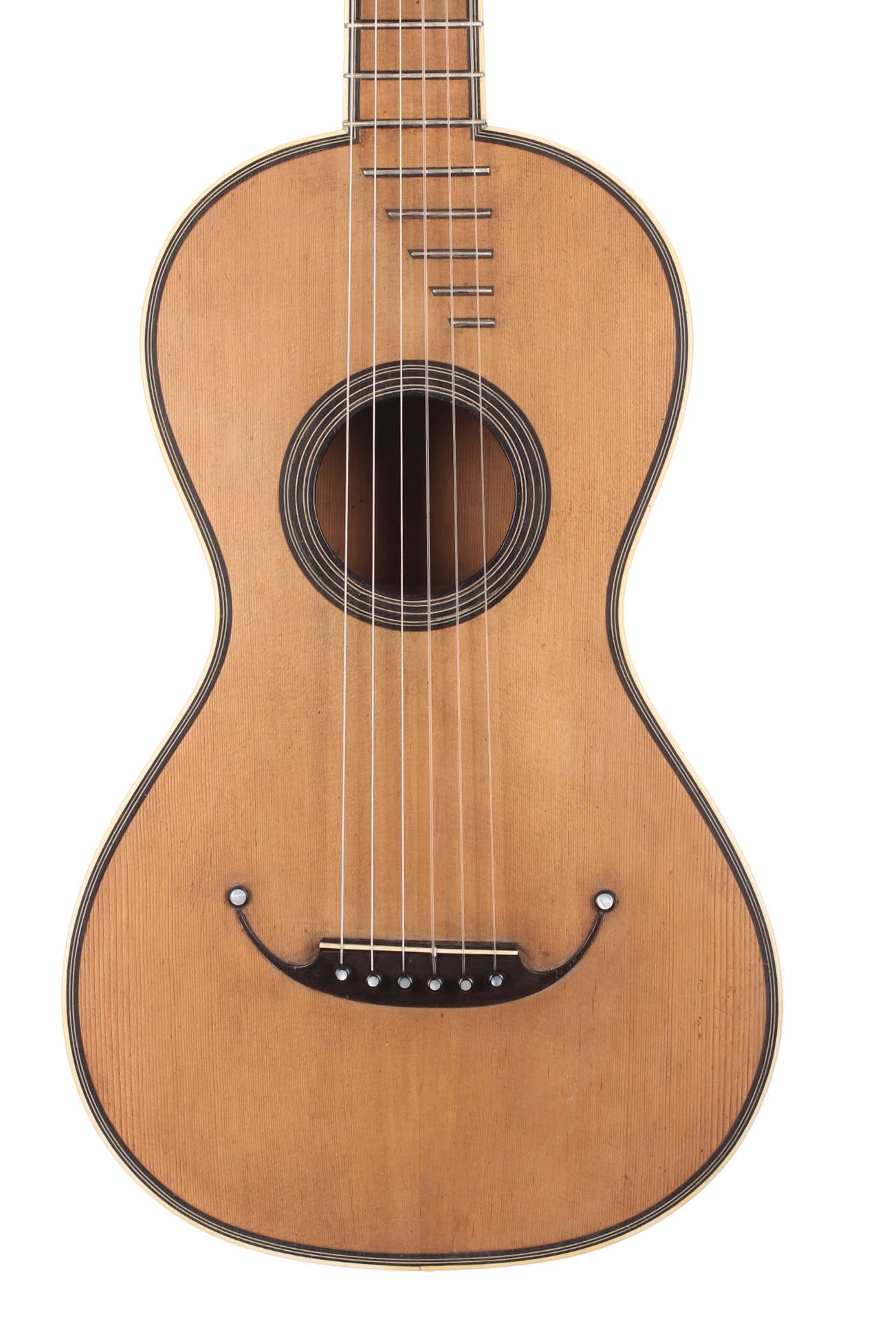 This romantic guitar was built around 1830. It is a finely decorated instrument. It has a beautifully coloured spruce top and very high-quality mahogany back and sides. The back is laminated with an inside spruce layer, what was a current feature of high quality instruments at that time. The ivory bindings give to the guitar a great charisma and are marvellously contrasting with the ebony purflings. The most amazing feature of this instrument is its sound. It really has everything a romantic guitar sound should have. It has a direct spontaneous tone with balanced sympathetic resonances and an old clear timbre. It is a gorgeous salon guitar and is ready to be played.