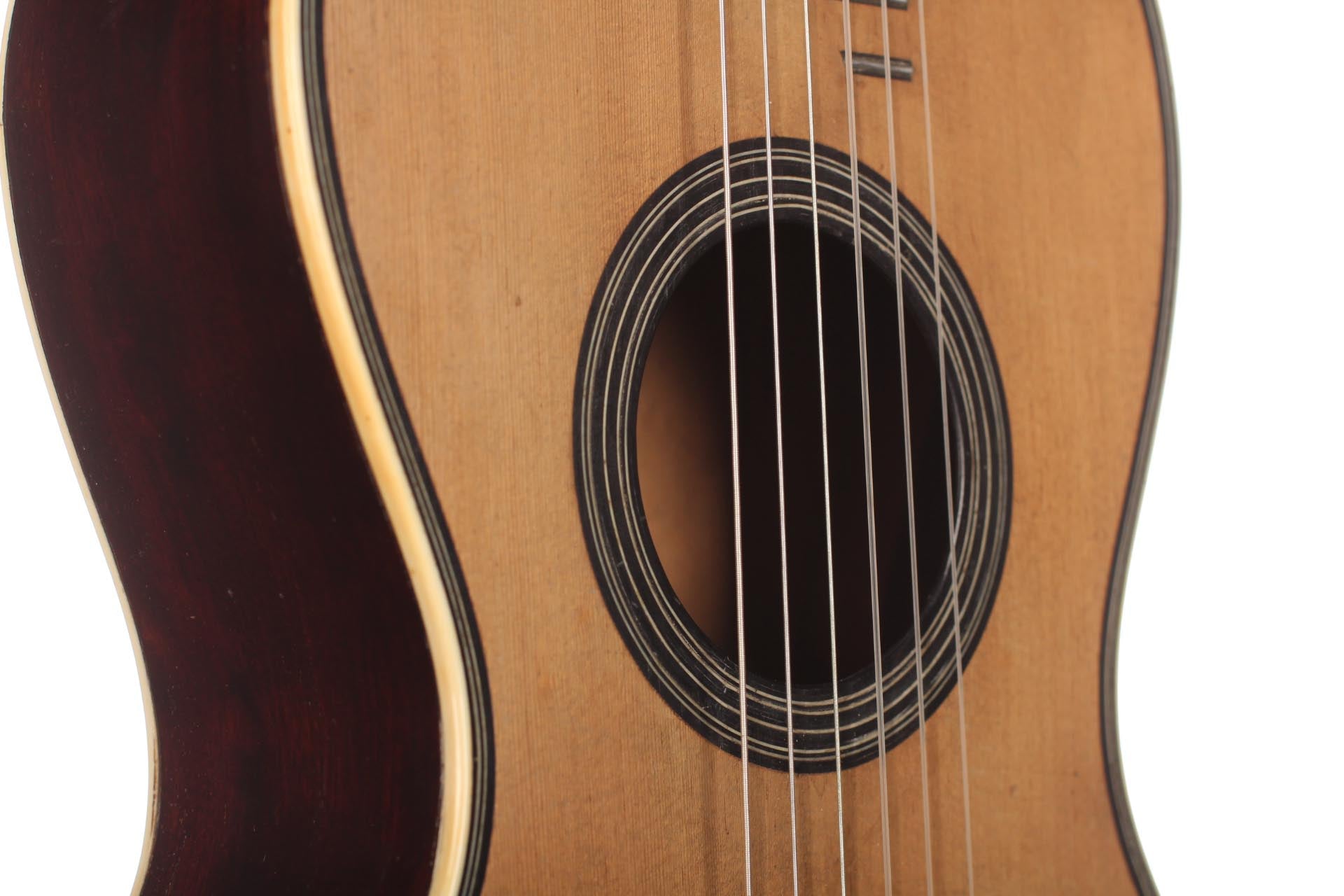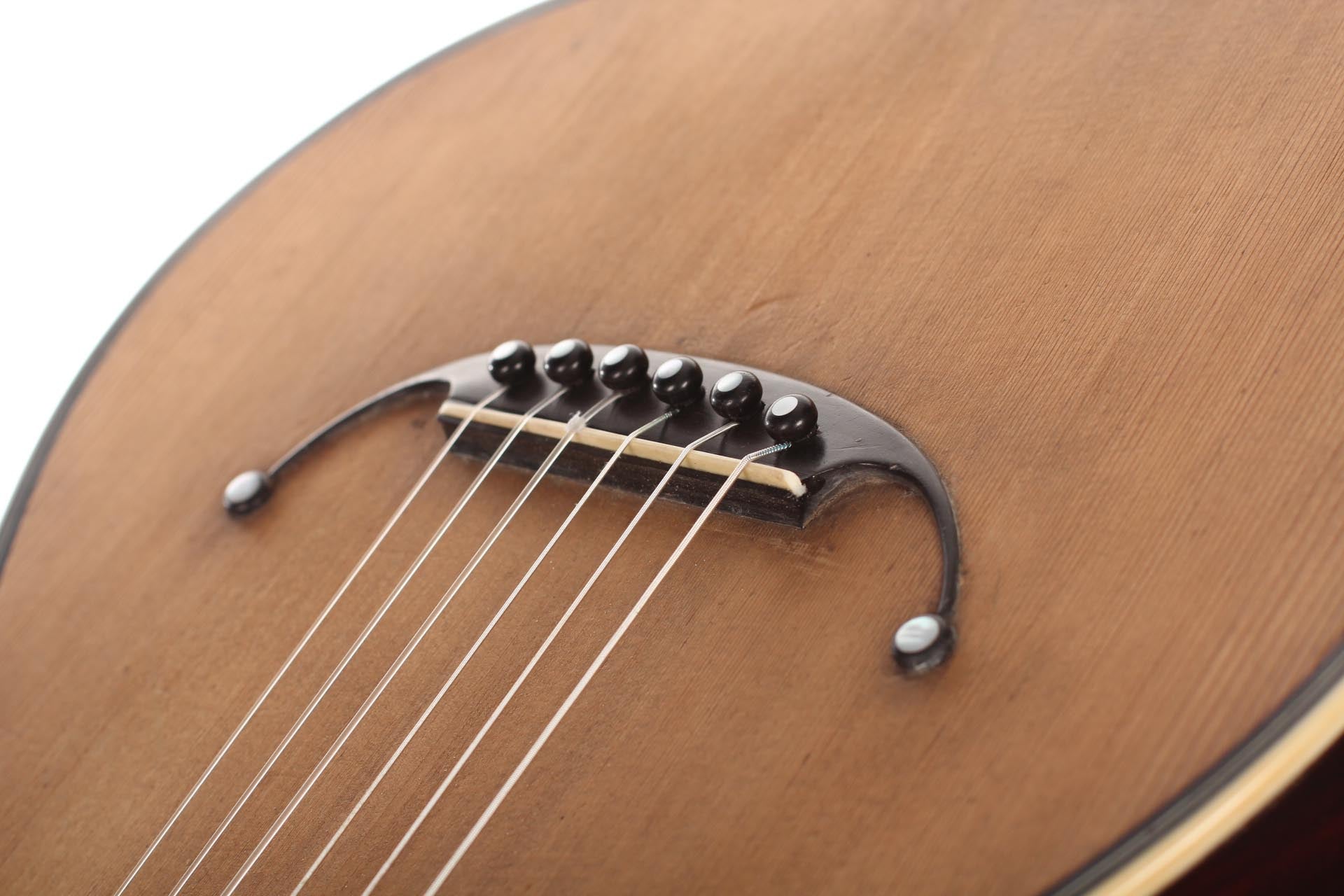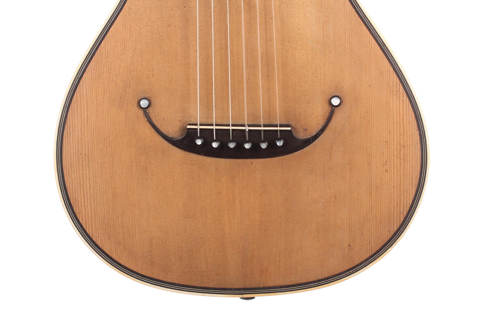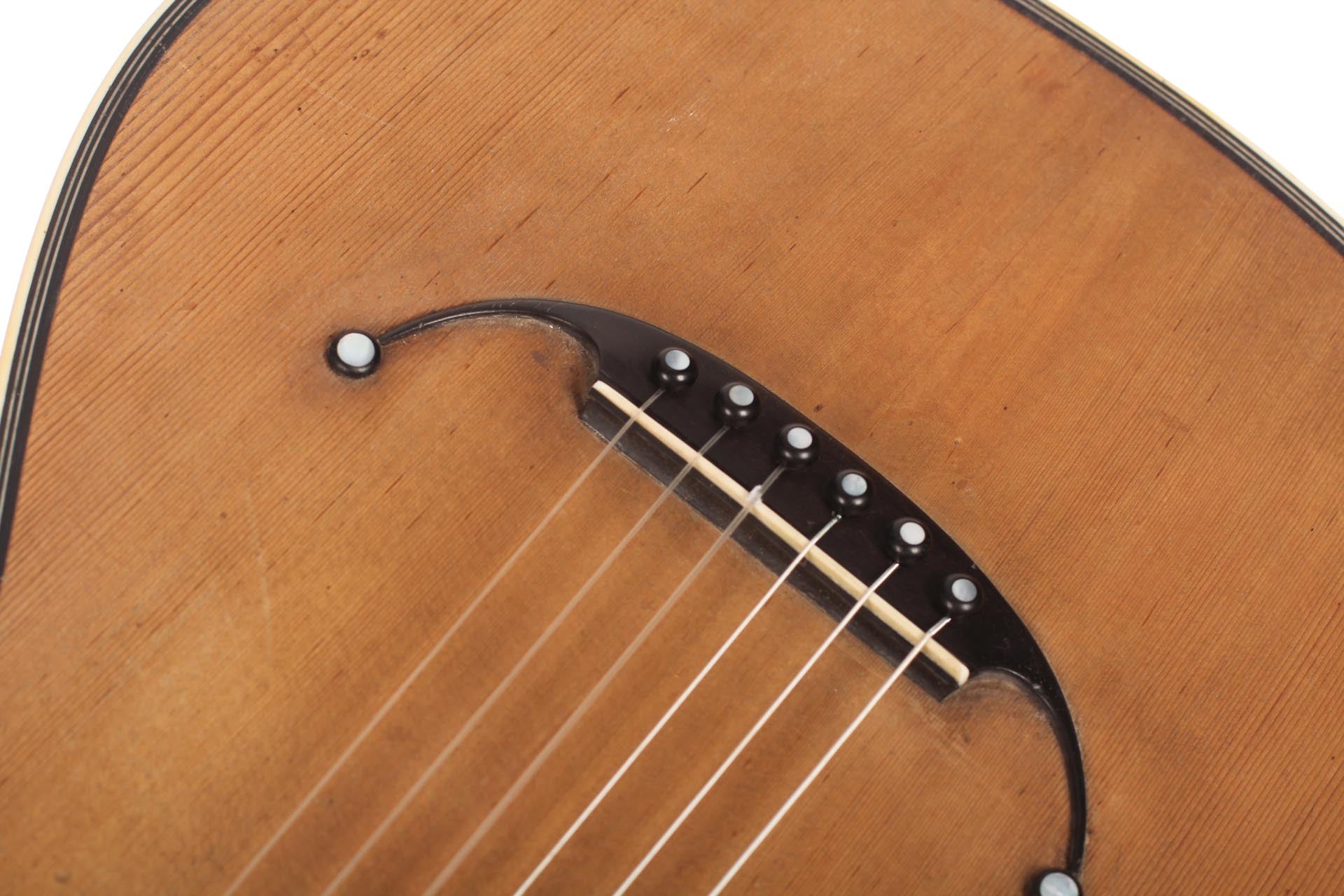 This romantic guitar was built around 1830. It is a finely decorated instrument. It has a beautifully coloured spruce top and very high-quality mahogany back and sides. The back is laminated with an inside spruce layer, what was a current feature of high quality instruments at that time. The ivory bindings give to the guitar a great charisma and are marvellously contrasting with the ebony purflings. The most amazing feature of this instrument is its sound. It really has everything a romantic guitar sound should have. It has a direct spontaneous tone with balanced sympathetic resonances and an old clear timbre. It is a gorgeous salon guitar and is ready to be played.