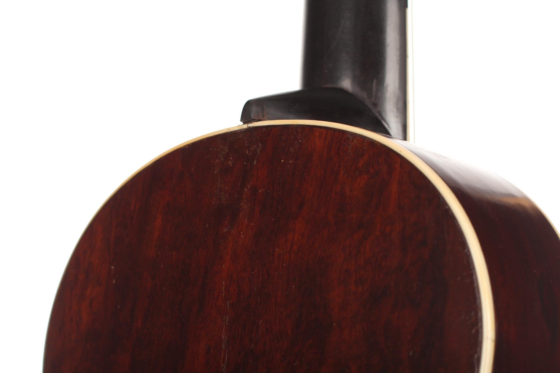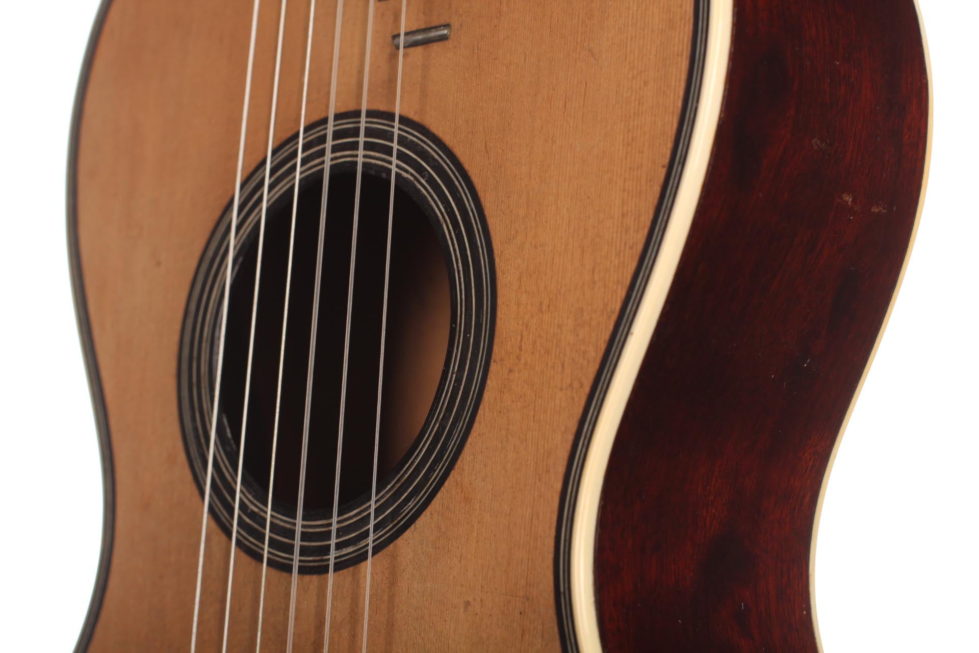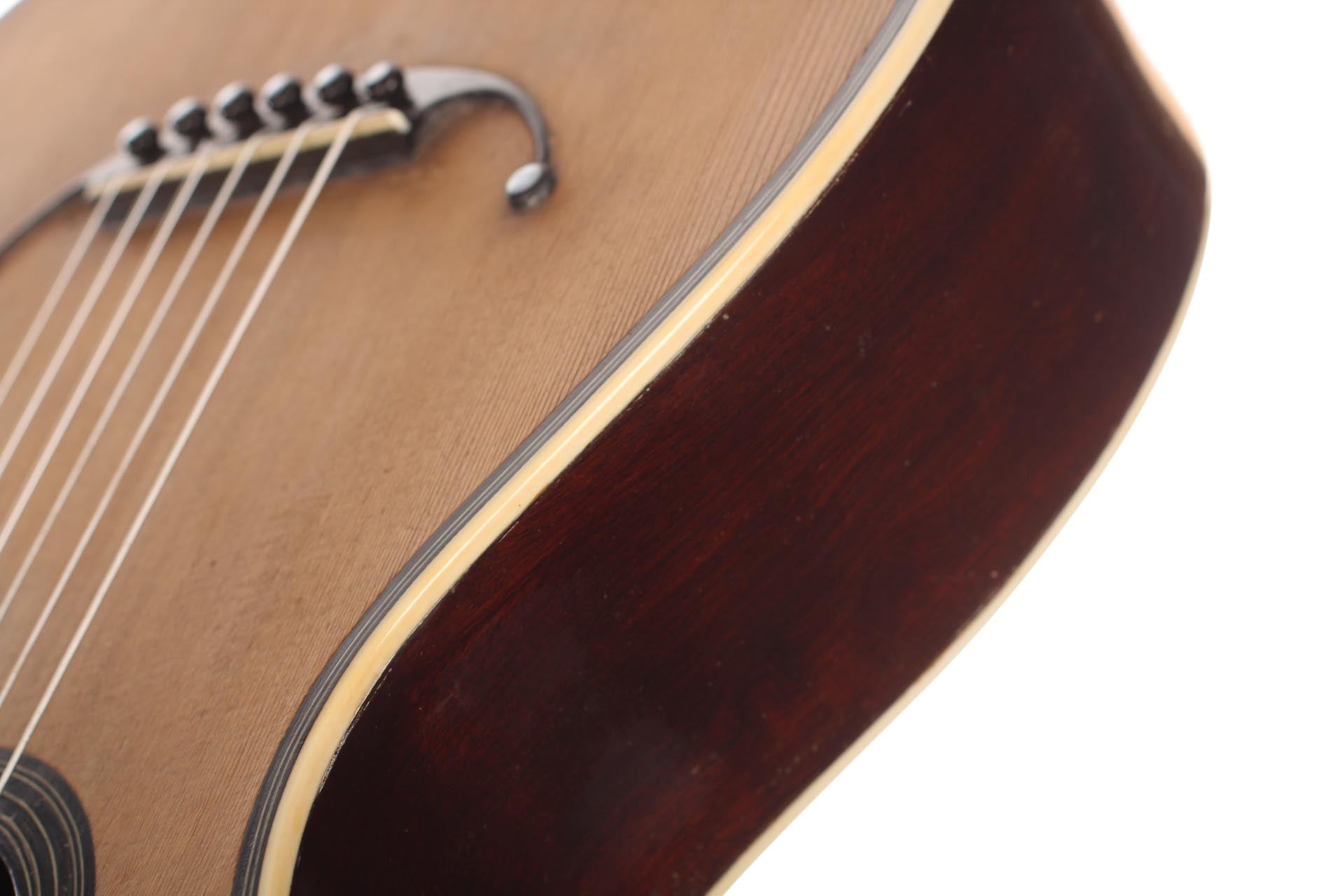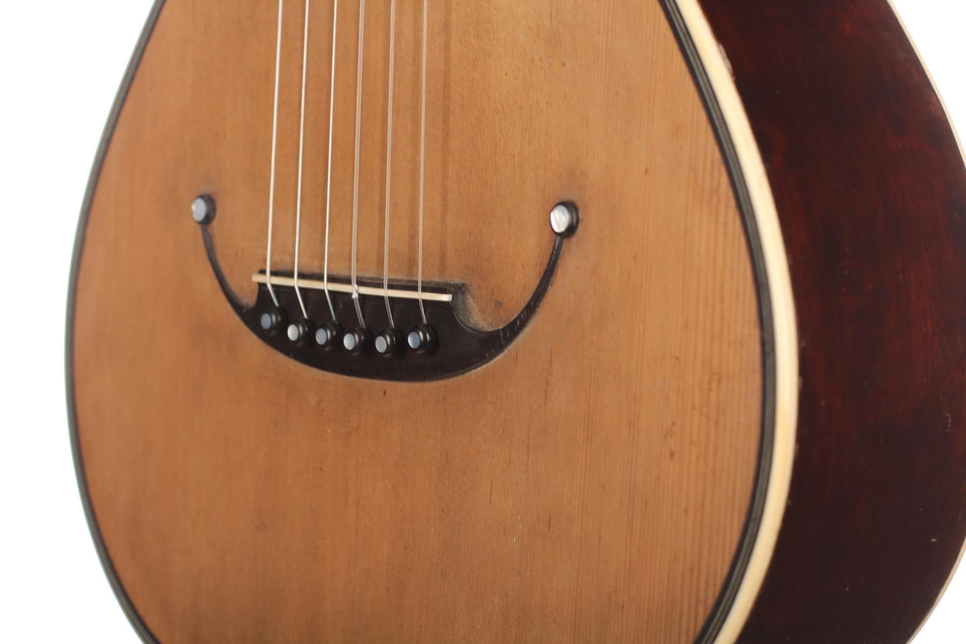 This romantic guitar was built around 1830. It is a finely decorated instrument. It has a beautifully coloured spruce top and very high-quality mahogany back and sides. The back is laminated with an inside spruce layer, what was a current feature of high quality instruments at that time. The ivory bindings give to the guitar a great charisma and are marvellously contrasting with the ebony purflings. The most amazing feature of this instrument is its sound. It really has everything a romantic guitar sound should have. It has a direct spontaneous tone with balanced sympathetic resonances and an old clear timbre. It is a gorgeous salon guitar and is ready to be played.