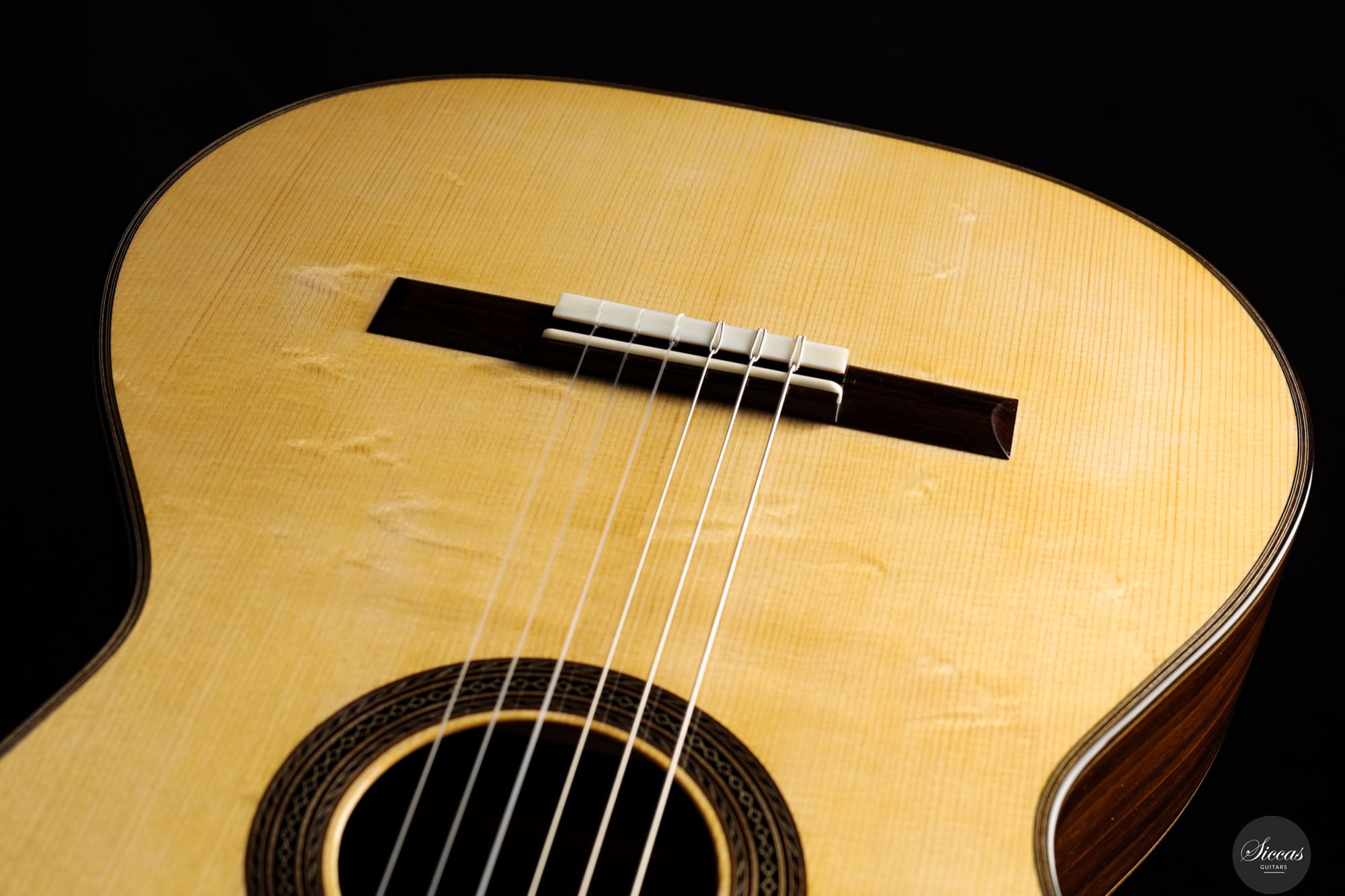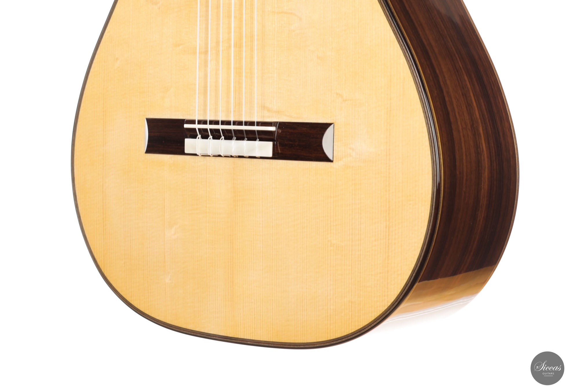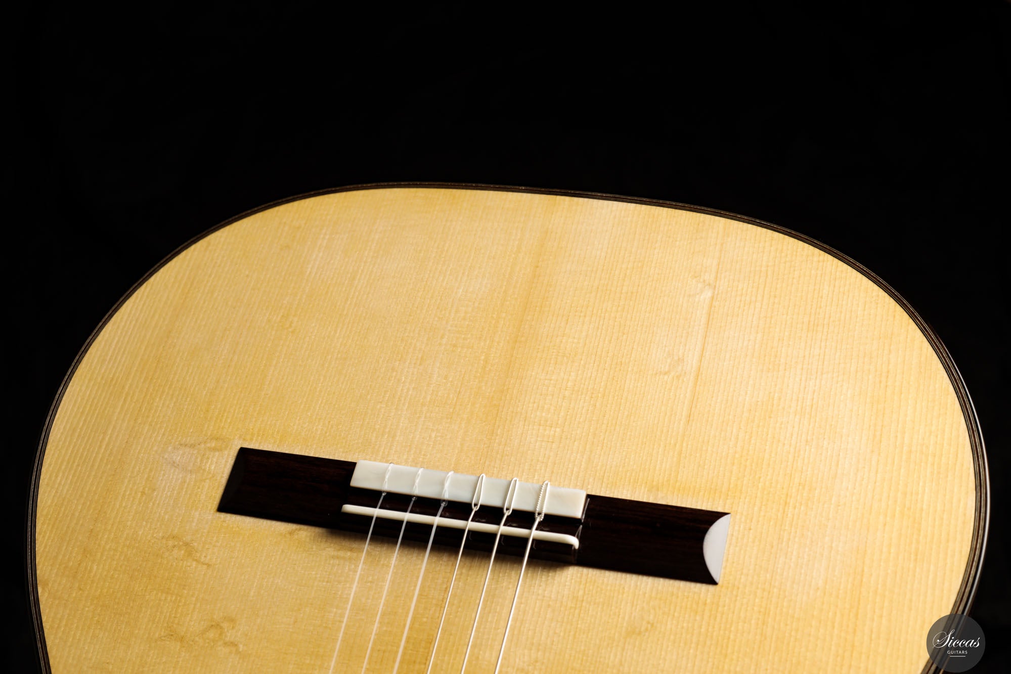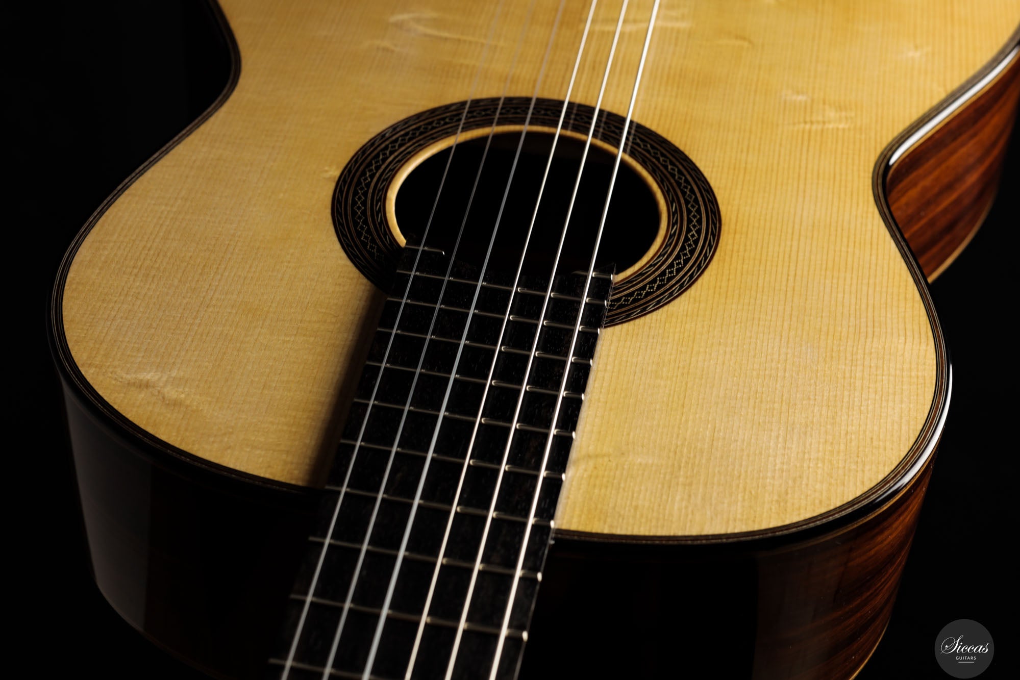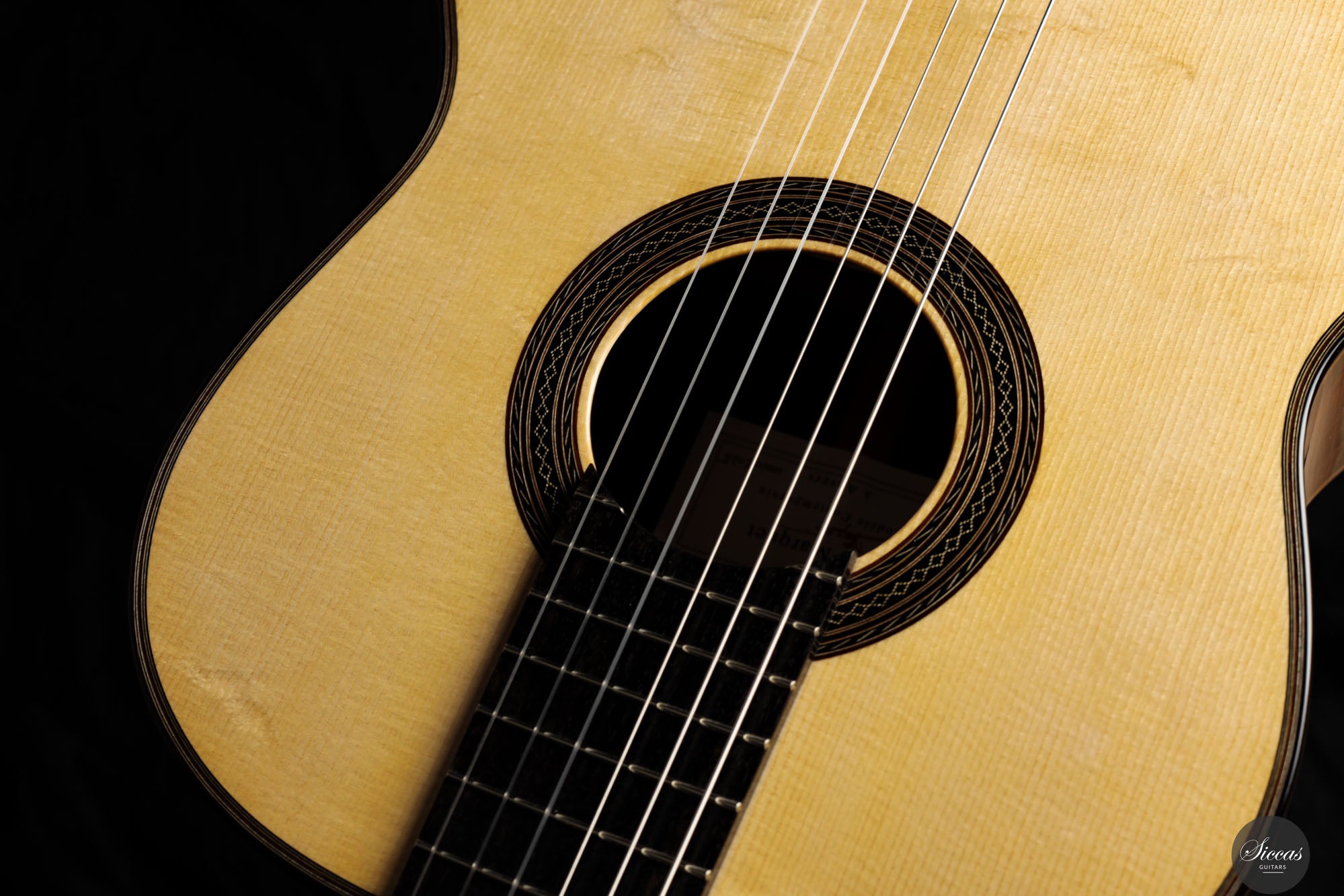 Das Modèle Contemporain beginnt mit einer sorgfältig abgestimmten Fichtendecke, die 2001 von Gerhard Oldiges bezogen wurde, um den idealen Kompromiss zwischen Flexibilität und Stärke zu erreichen. Um die Projektion und den Dynamikbereich zu verbessern, sind Boden und Zargen aus indischem Palisander sorgfältig verstärkt, was auch die Resonanz und die strukturelle Stabilität erhöht. Durch Jean's meisterhafte Handwerkskunst entsteht so ein Instrument mit einer schnellen, intuitiven Ansprache, die fast unmittelbar auf die Berührung des Spielers reagiert. Die Diskantsaiten schweben mit einer klaren, singenden Qualität, während der Mitteltonbereich eine reiche, farbenfrohe Klangpalette bietet, die zur Erkundung von Klanglandschaften einlädt. Das Sustain ist lang und gleichmäßig, sodass die Töne wunderschön nachklingen, und das Instrument bewahrt außergewöhnliche Trennung und Kompromiss über alle Register hinweg.