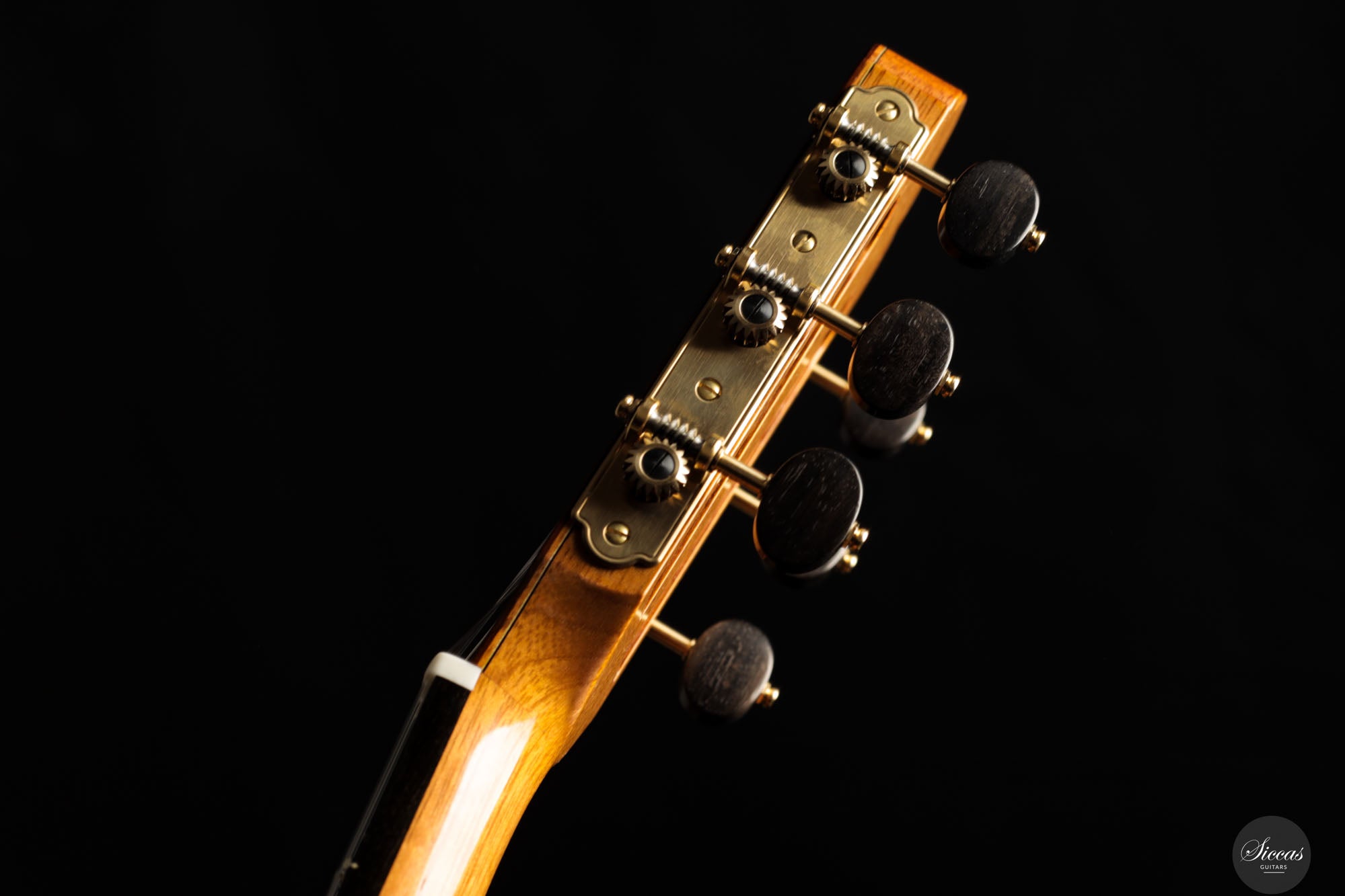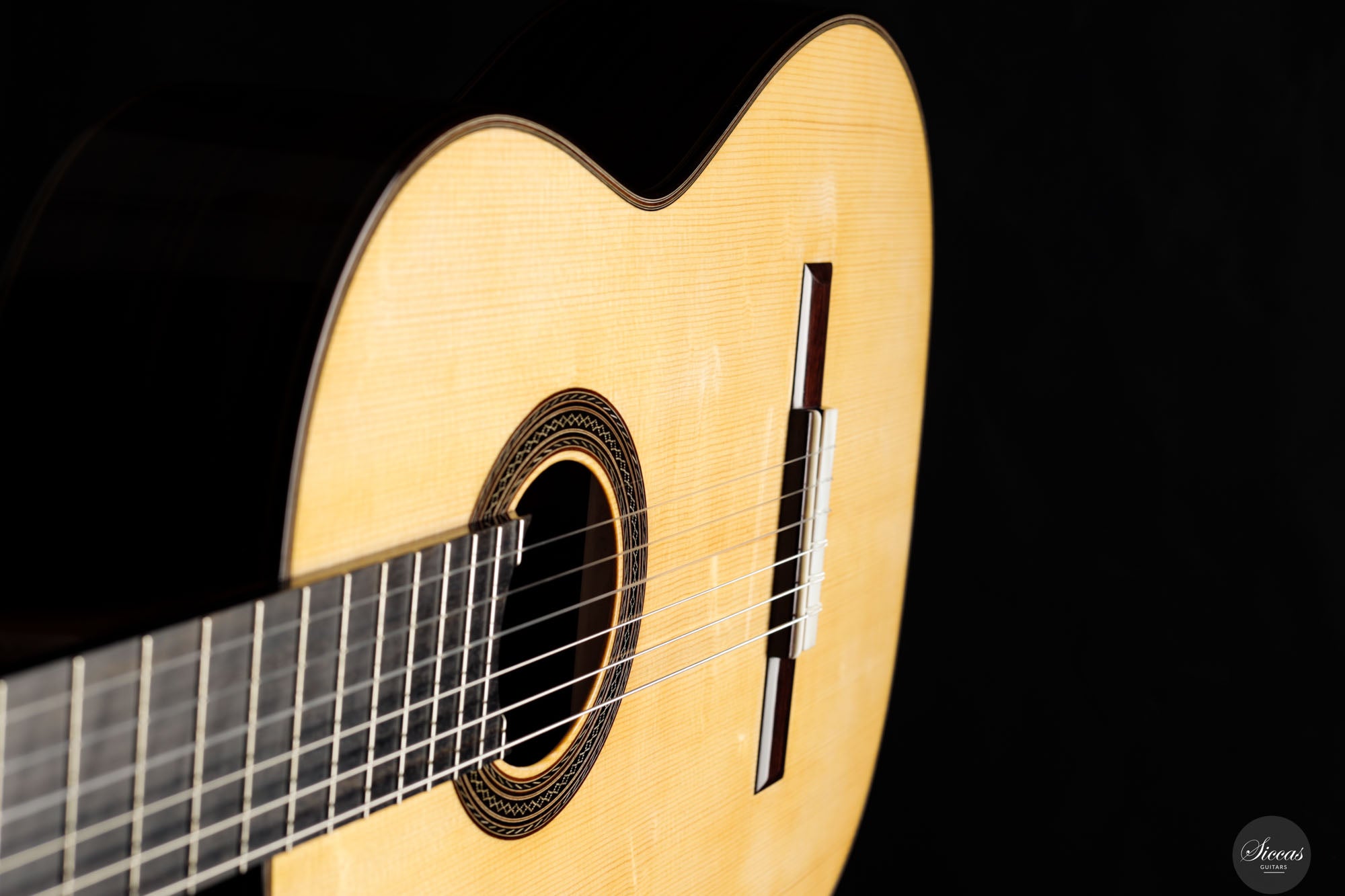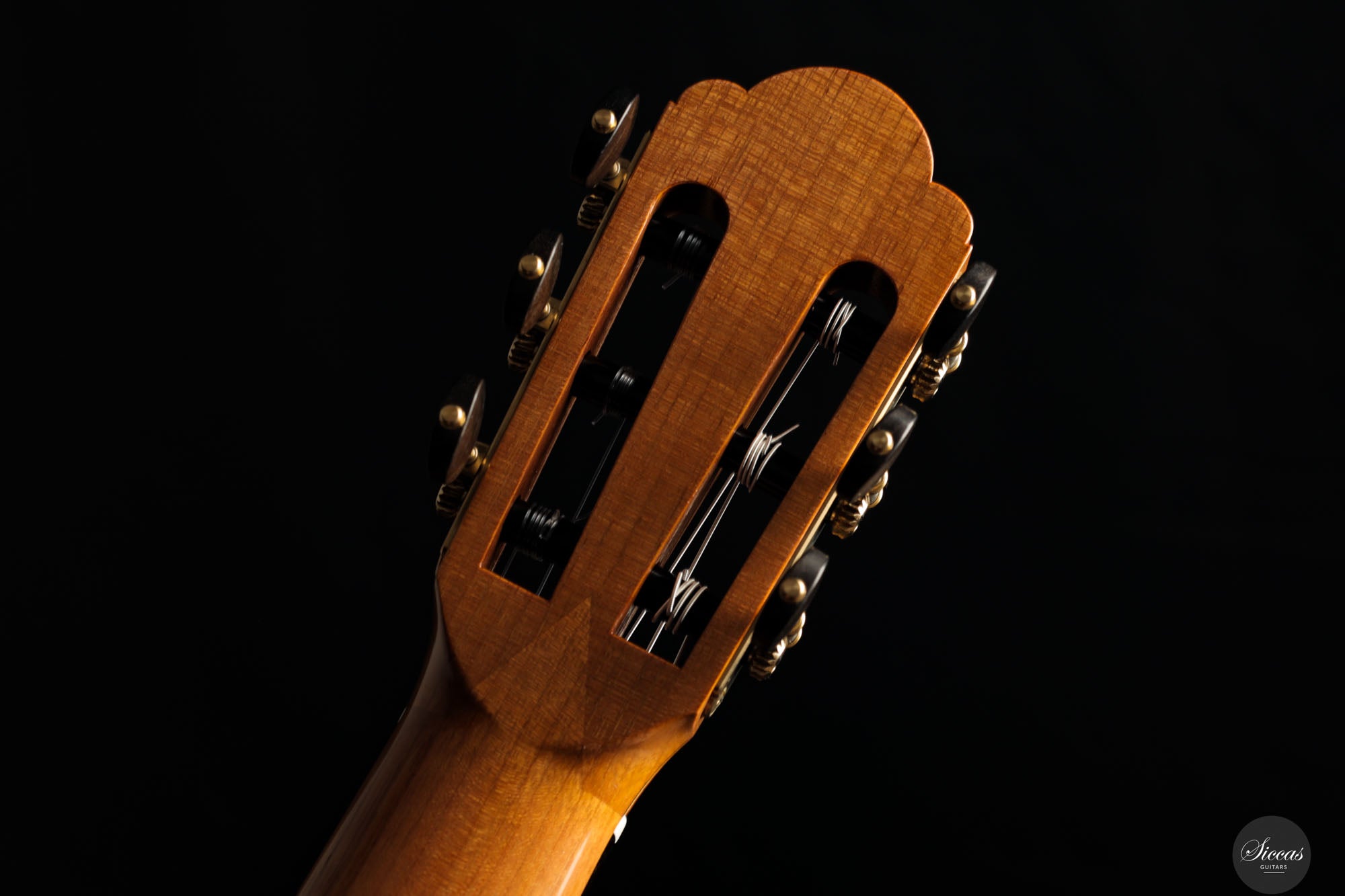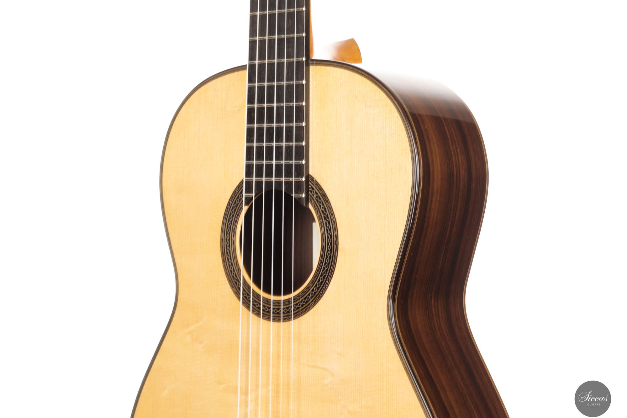 Das Modèle Contemporain beginnt mit einer sorgfältig abgestimmten Fichtendecke, die 2001 von Gerhard Oldiges bezogen wurde, um den idealen Kompromiss zwischen Flexibilität und Stärke zu erreichen. Um die Projektion und den Dynamikbereich zu verbessern, sind Boden und Zargen aus indischem Palisander sorgfältig verstärkt, was auch die Resonanz und die strukturelle Stabilität erhöht. Durch Jean's meisterhafte Handwerkskunst entsteht so ein Instrument mit einer schnellen, intuitiven Ansprache, die fast unmittelbar auf die Berührung des Spielers reagiert. Die Diskantsaiten schweben mit einer klaren, singenden Qualität, während der Mitteltonbereich eine reiche, farbenfrohe Klangpalette bietet, die zur Erkundung von Klanglandschaften einlädt. Das Sustain ist lang und gleichmäßig, sodass die Töne wunderschön nachklingen, und das Instrument bewahrt außergewöhnliche Trennung und Kompromiss über alle Register hinweg.