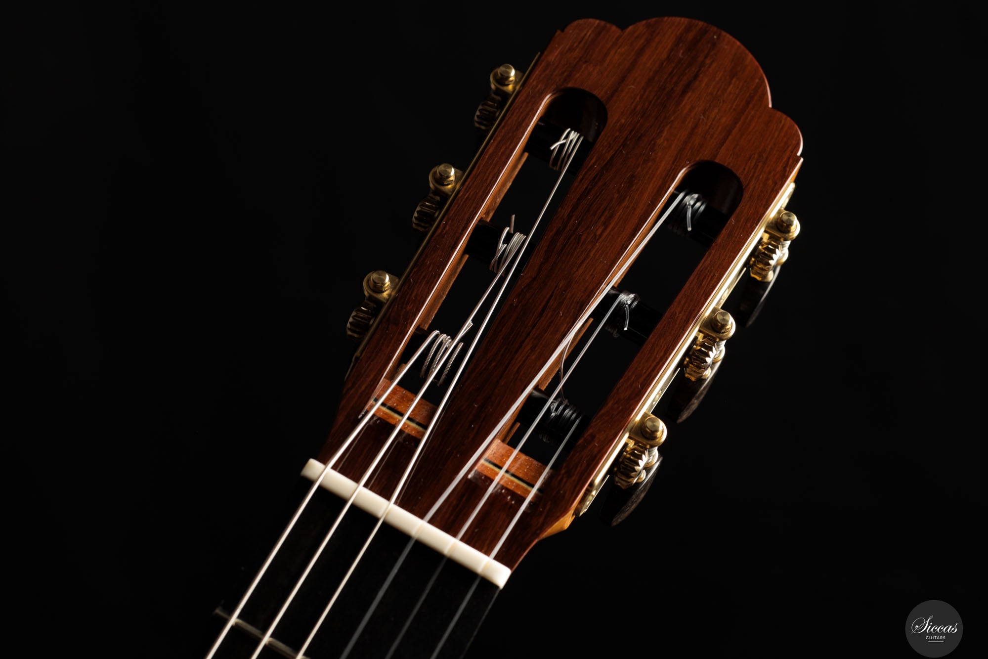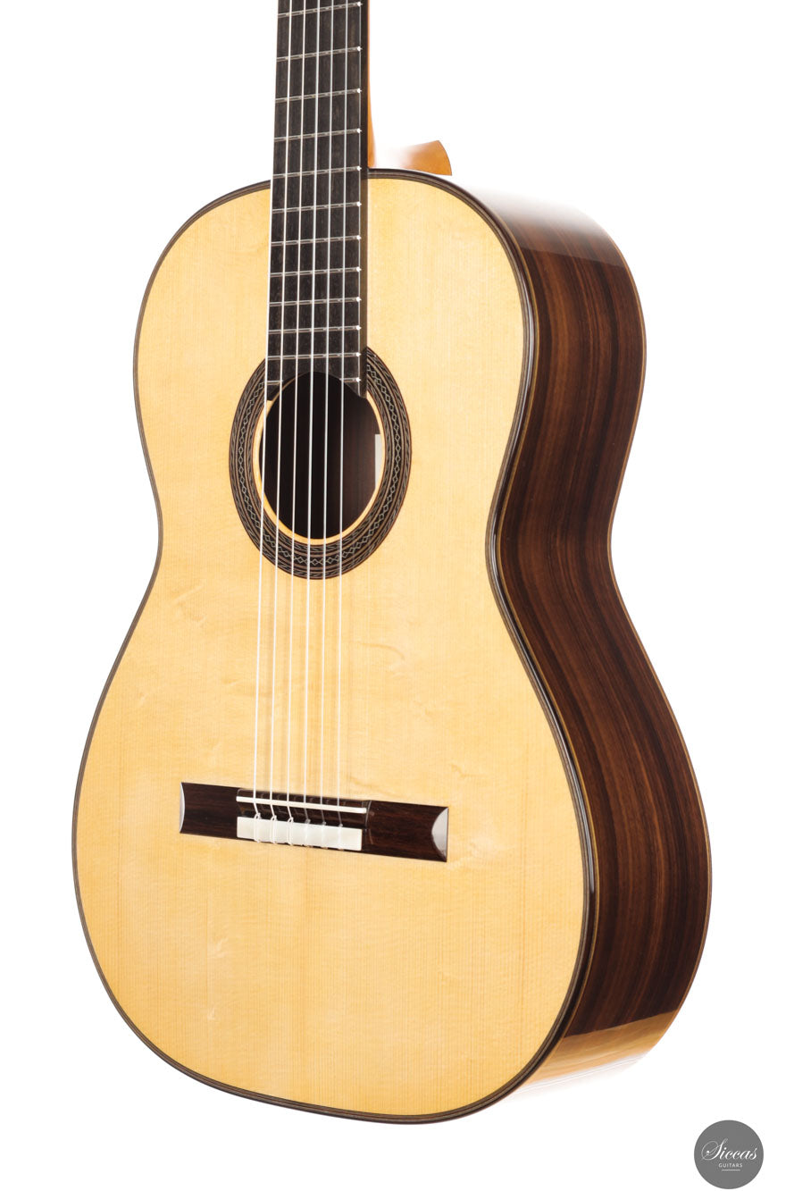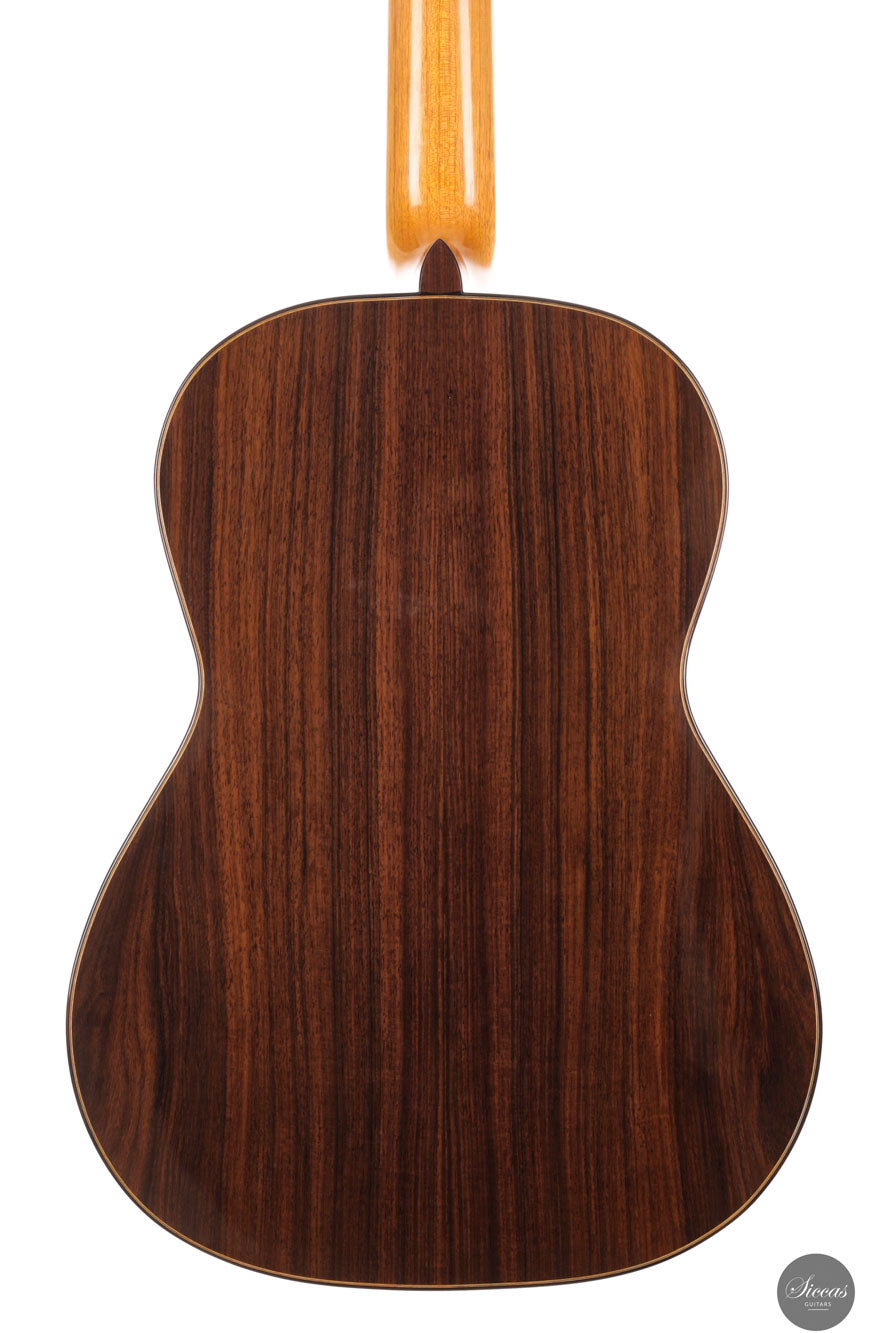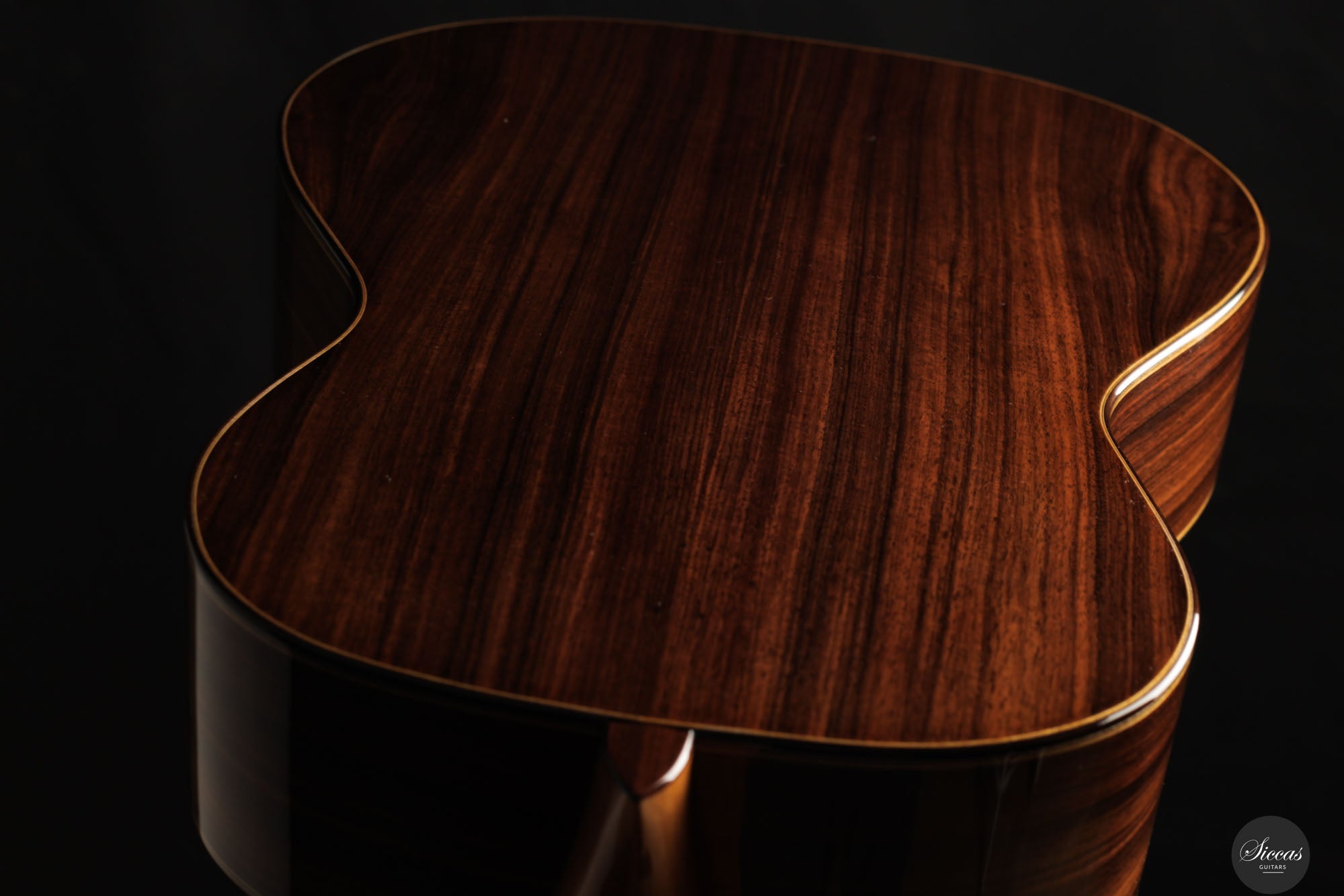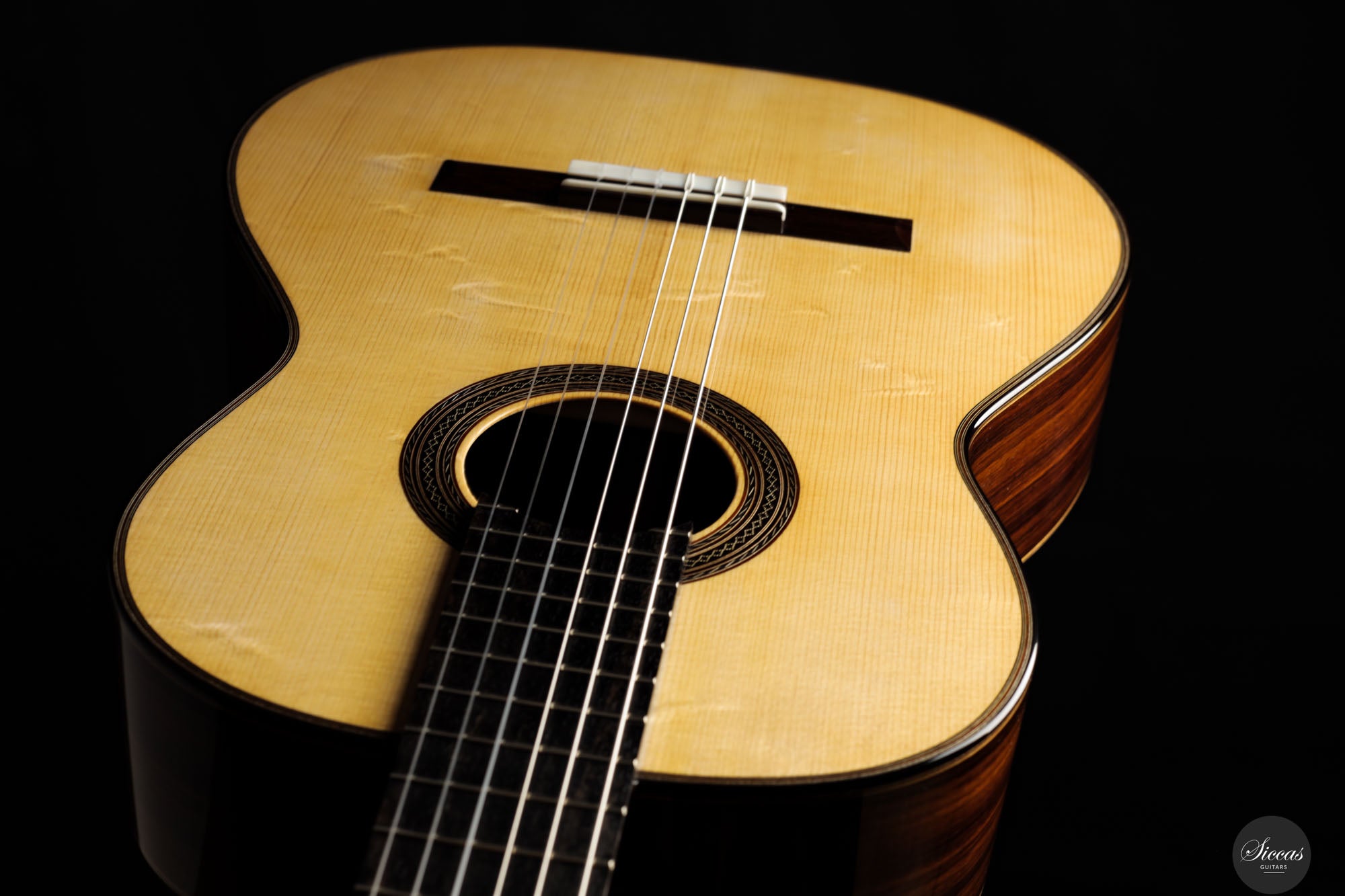 Das Modèle Contemporain beginnt mit einer sorgfältig abgestimmten Fichtendecke, die 2001 von Gerhard Oldiges bezogen wurde, um den idealen Kompromiss zwischen Flexibilität und Stärke zu erreichen. Um die Projektion und den Dynamikbereich zu verbessern, sind Boden und Zargen aus indischem Palisander sorgfältig verstärkt, was auch die Resonanz und die strukturelle Stabilität erhöht. Durch Jean's meisterhafte Handwerkskunst entsteht so ein Instrument mit einer schnellen, intuitiven Ansprache, die fast unmittelbar auf die Berührung des Spielers reagiert. Die Diskantsaiten schweben mit einer klaren, singenden Qualität, während der Mitteltonbereich eine reiche, farbenfrohe Klangpalette bietet, die zur Erkundung von Klanglandschaften einlädt. Das Sustain ist lang und gleichmäßig, sodass die Töne wunderschön nachklingen, und das Instrument bewahrt außergewöhnliche Trennung und Kompromiss über alle Register hinweg.