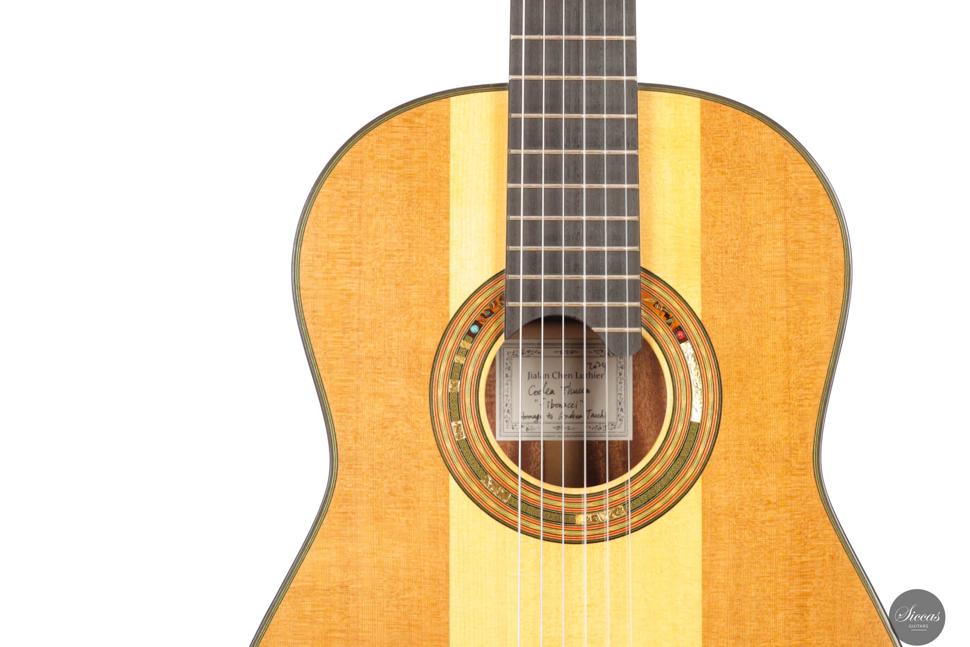 Jialan Chen, ein herausragender Gitarrenbauer seit 2013, spezialisierte sich zunächst auf die Herstellung von Gitarren im Torres-Stil, bevor er 2018 sein Repertoire um das Bouchet-Modell und sein innovatives „Impressionismus-Modell“ erweiterte. Sein tiefes Verständnis für Musik und Gitarrenkunst spiegelt sich in der hochwertigen Klangästhetik seiner Instrumente wider. Ein bedeutender Schritt in seiner Karriere war 2014 die Begegnung und das Lernen von den renommierten Gitarrenbauern Andrea Tacchi und Paolo Coriani in Italien, wo er unschätzbares Wissen und Fähigkeiten erwarb. Diese Erfahrung, zusammen mit seinem Studium und der Dokumentation historischer Gitarren in Europa, hat sein Handwerk tiefgreifend bereichert. Bekannt für ihre ausgefeilten Materialien, außergewöhnliche Klangqualität und elegantes Design, werden Jialans Gitarren weltweit geschätzt, wobei namhafte Musiker wie der schwedische Gitarrist Per-Olov Kindgren seit 2018 sein Bouchet-Modell bevorzugen.