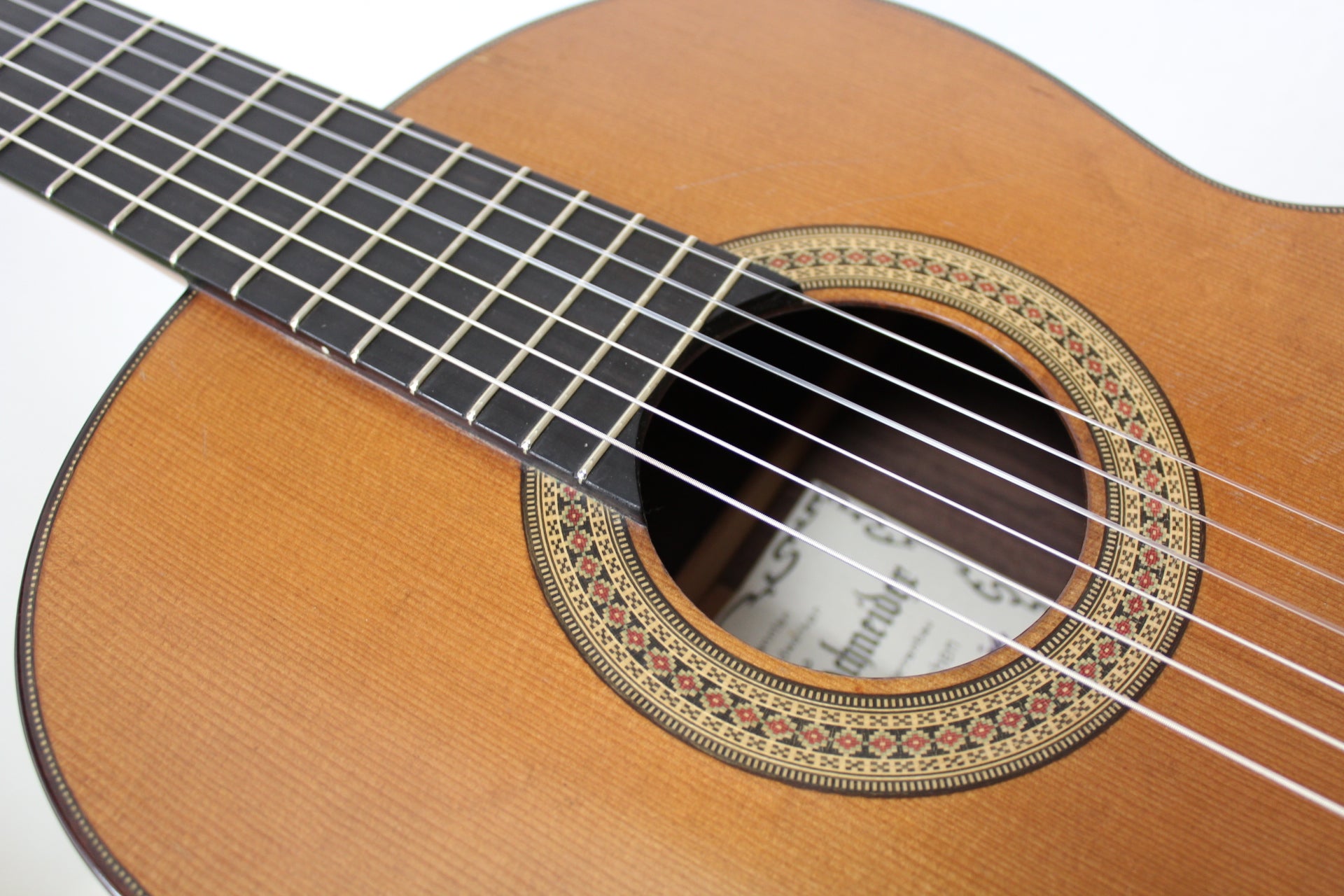 This is a classical guitar made by the German luthier Joachim Schneider in 1989. Joachim was born in 1939 in Markneukirchen and started to work at the workshop of his grandfather Willy Blahowetz. In 1961 he finished his training at the Chamber of Crafts with the "Meisterprüfung". One year later he took over his grandfather's workshop. He received many international awards for his craftmanship. This guitar has a cedar top and back and sides are made of Indian rosewood. The sound is nice and balanced with warm bases and smooth trebles giving the guitar a typical cedar sound. Intonation and playability are perfect on this 25 years old guitar.