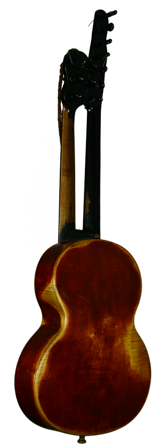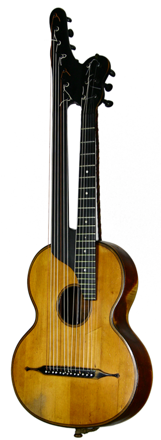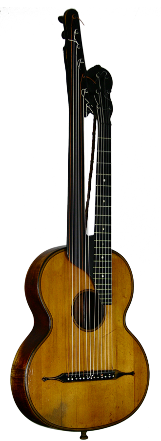 Im Instrumentenbau entwickelten sich um 1850 neue Konzepte: Bis zu vier zusätzliche Basssaiten konnten noch am Wirbelkasten seitlich angebracht werden, für mehr war ein zusätzlicher Hals und Wirbelkasten wie bei den Theorben des 17. Jahrhunderts erforderlich. Diesem Patent begegnen wir erstmals bei Johann Georg Stauffer, der wohl zu den kreativsten Gitarrenbauern überhaupt gezählt werden muss. Sein Schüler Johann Gottfried Scherzer perfektionierte diese Idee in den 1860er Jahren und bildete das Fundament des klassischen Wiener Gitarrenbaus, auf dem später Friedrich Schenk, Ludwig Reisinger, Josef Swossil, Wendelin Lux, Franz Xaver Güttler und Franz Angerer aufbauten. Die zweiteilige Decke besteht aus Fichte und hat dunkle und helle Randverzierungen, ebenso wie das Schallloch. Der Boden ist einteilig und besteht wie auch die Zargen aus stark geflammtem Ahorn. Der Kopf ist nach deutscher Art mit dem Hals verbunden. Der Hals ist mit dem Korpus verschraubt und individuell einstellbar. Das Griffbrett besitzt einen Nullbund und reicht schwebend bis über das Schallloch.