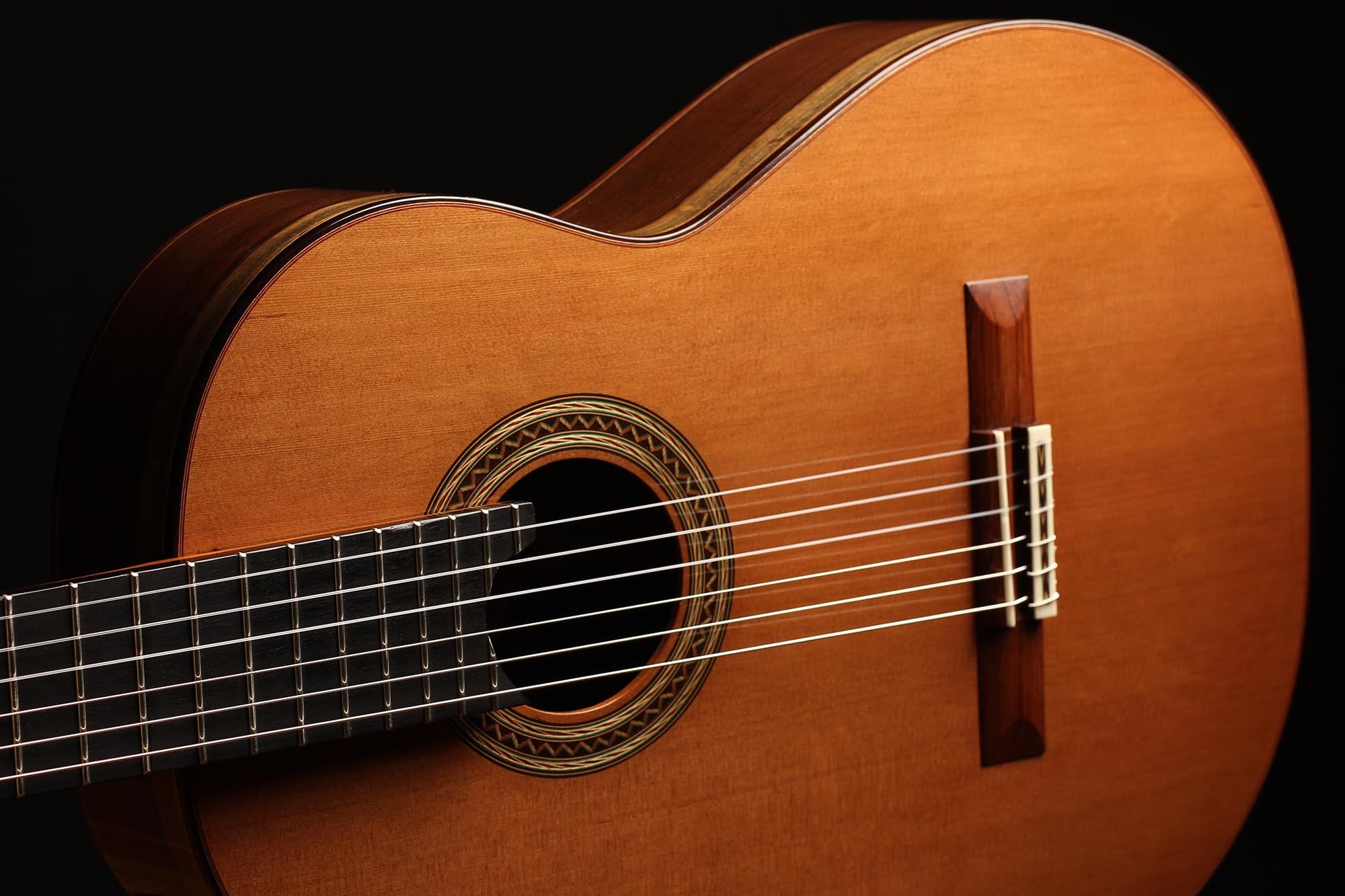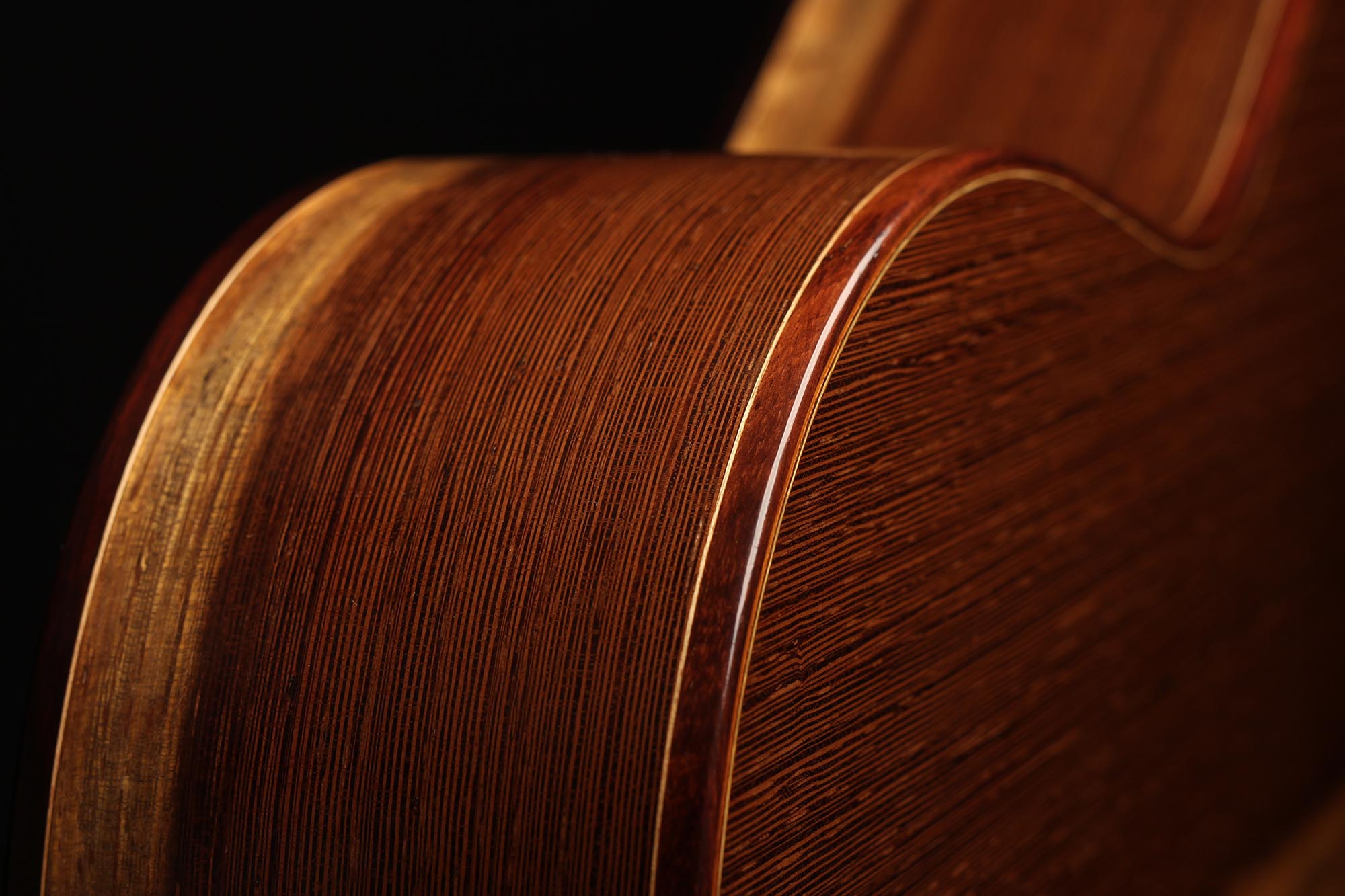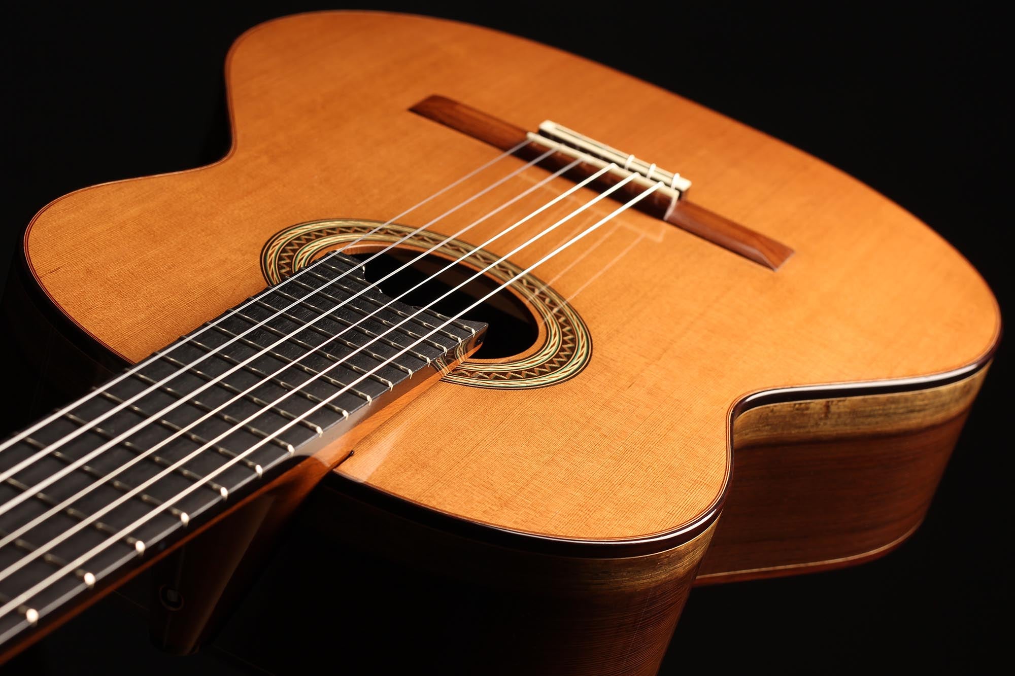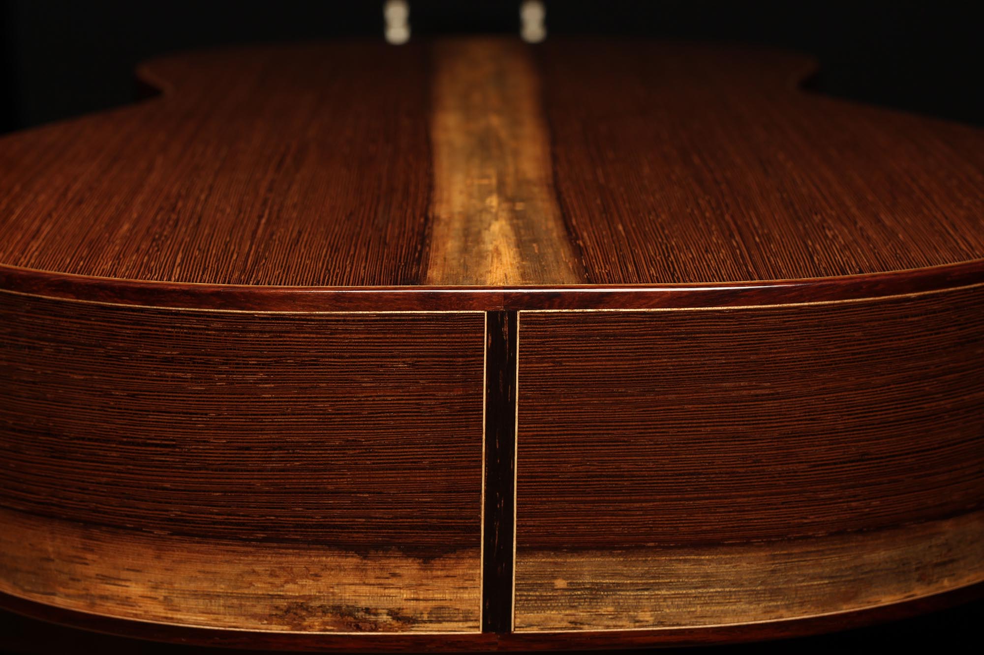 This guitar has not only a unique aesthetic, but also a very special bracing. The latter is relatively traditional and is made of a combination of spruce and cedar. The Wenge wood used for the back and sides is also remarkable. It is a guitar with a very good volume and a warm and elegant tone. The guitar plays very comfortably and reacts well to changes in the hand position, so that you can easily find different timbres.