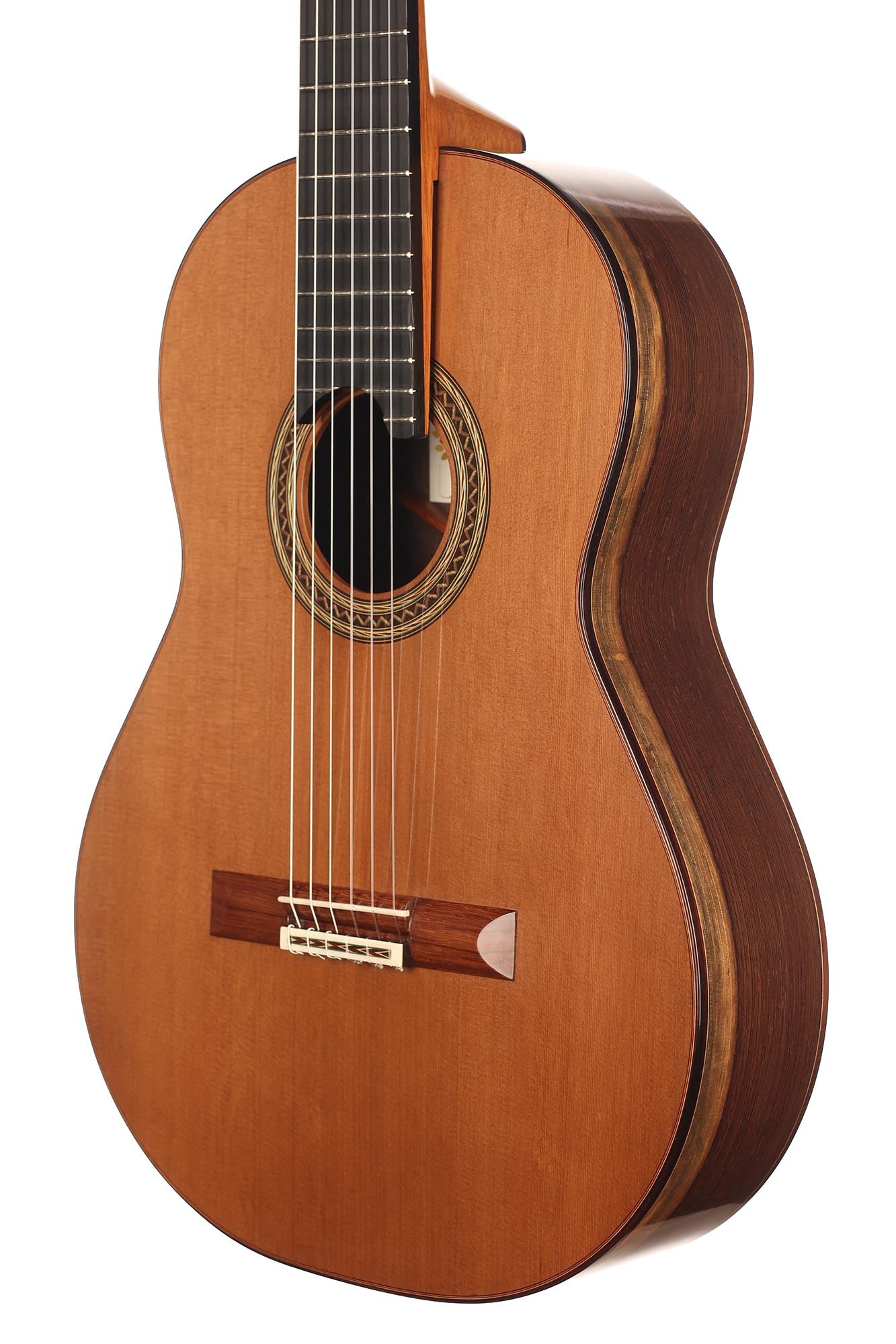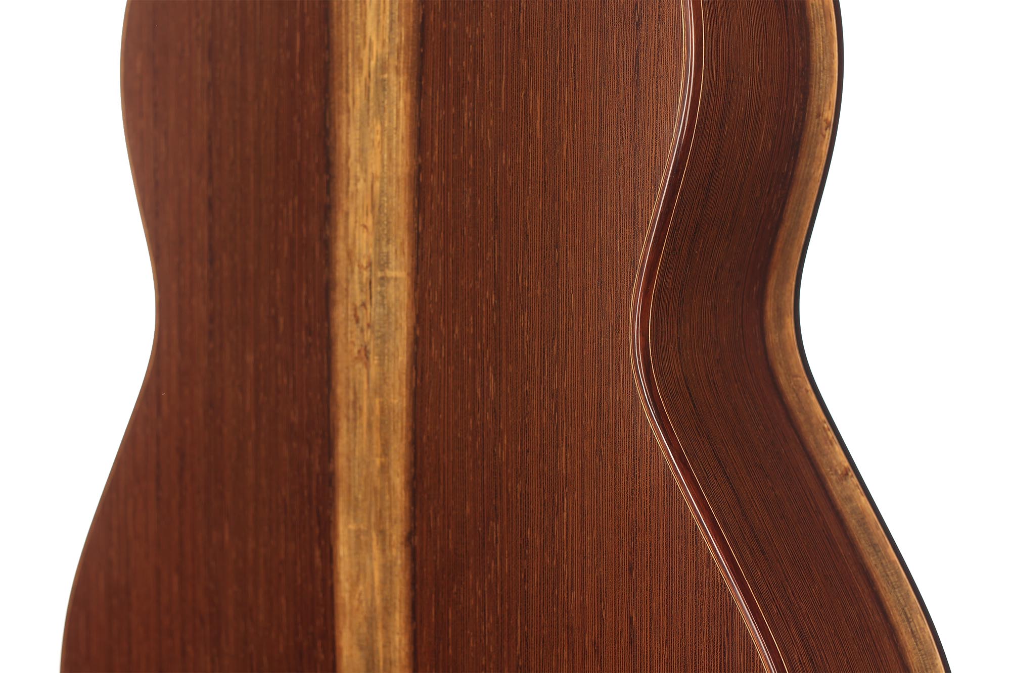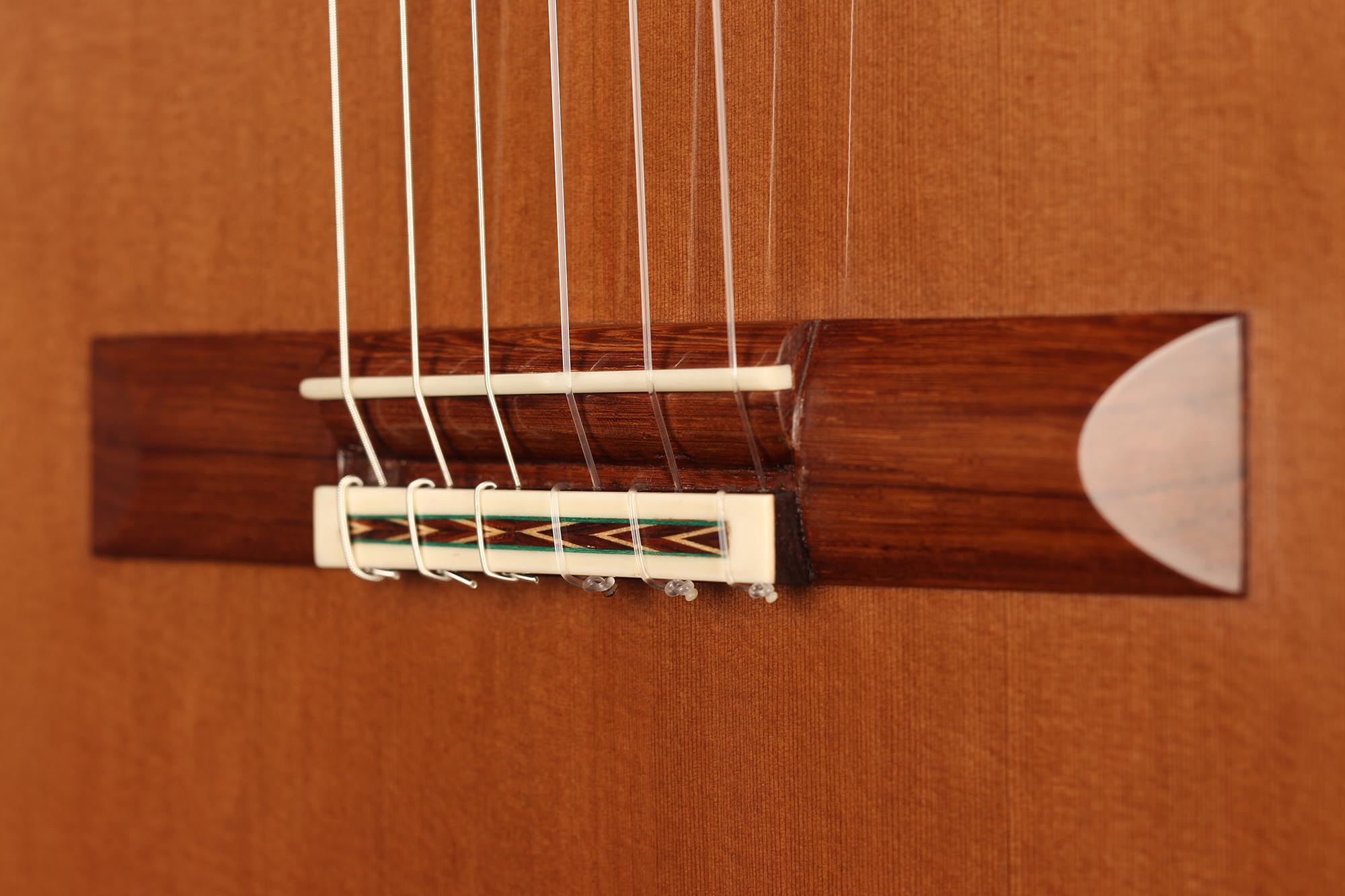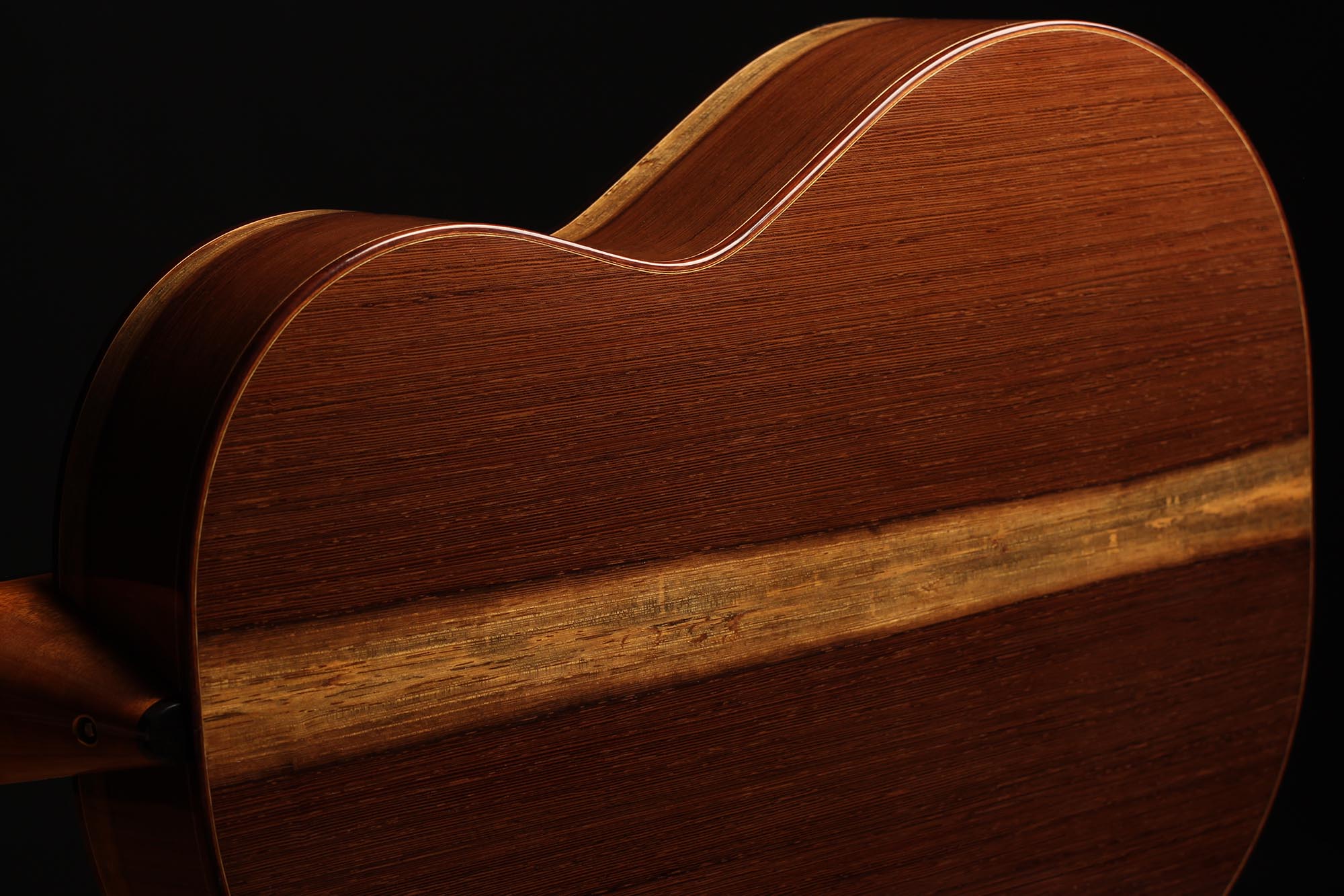 This guitar has not only a unique aesthetic, but also a very special bracing. The latter is relatively traditional and is made of a combination of spruce and cedar. The Wenge wood used for the back and sides is also remarkable. It is a guitar with a very good volume and a warm and elegant tone. The guitar plays very comfortably and reacts well to changes in the hand position, so that you can easily find different timbres.