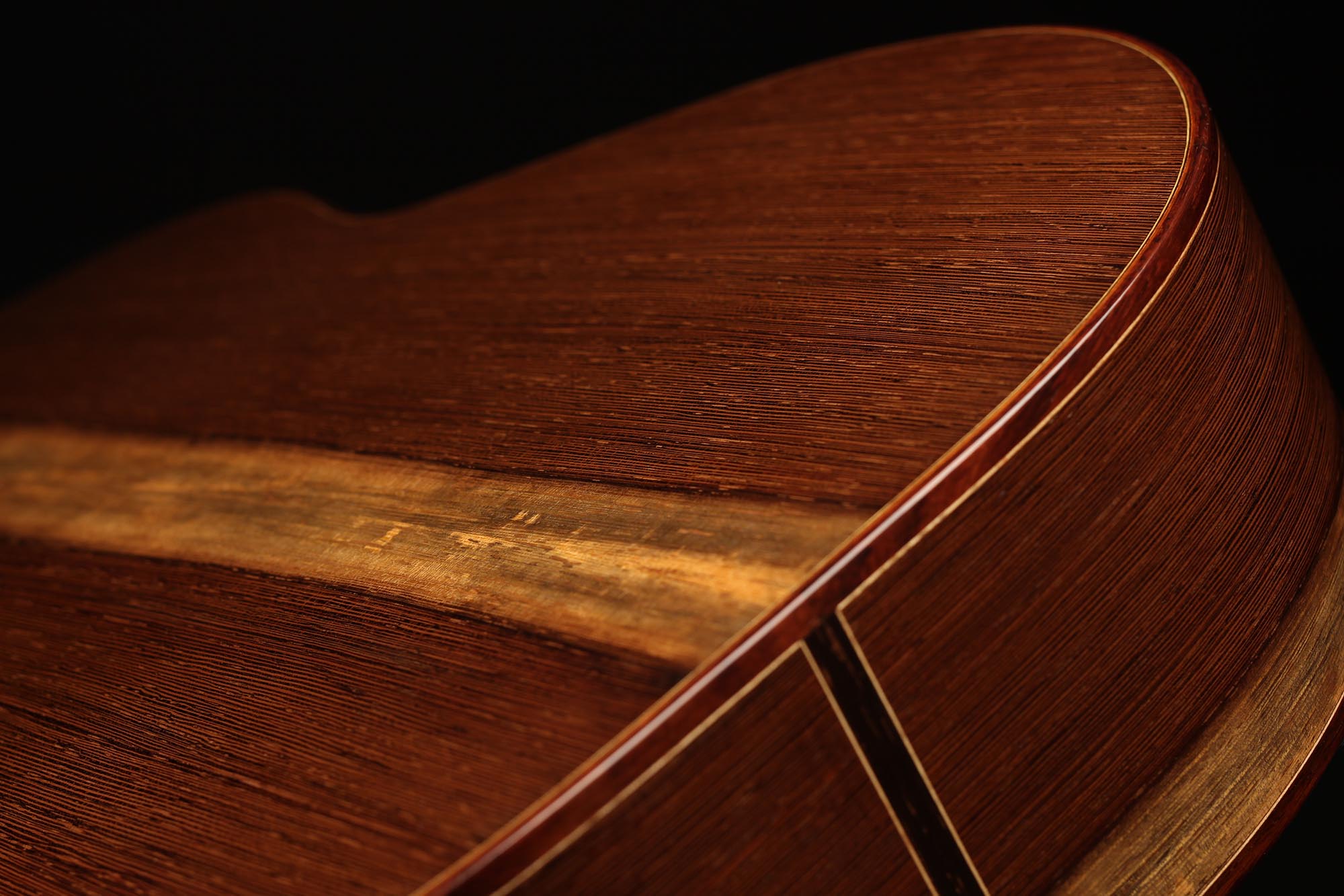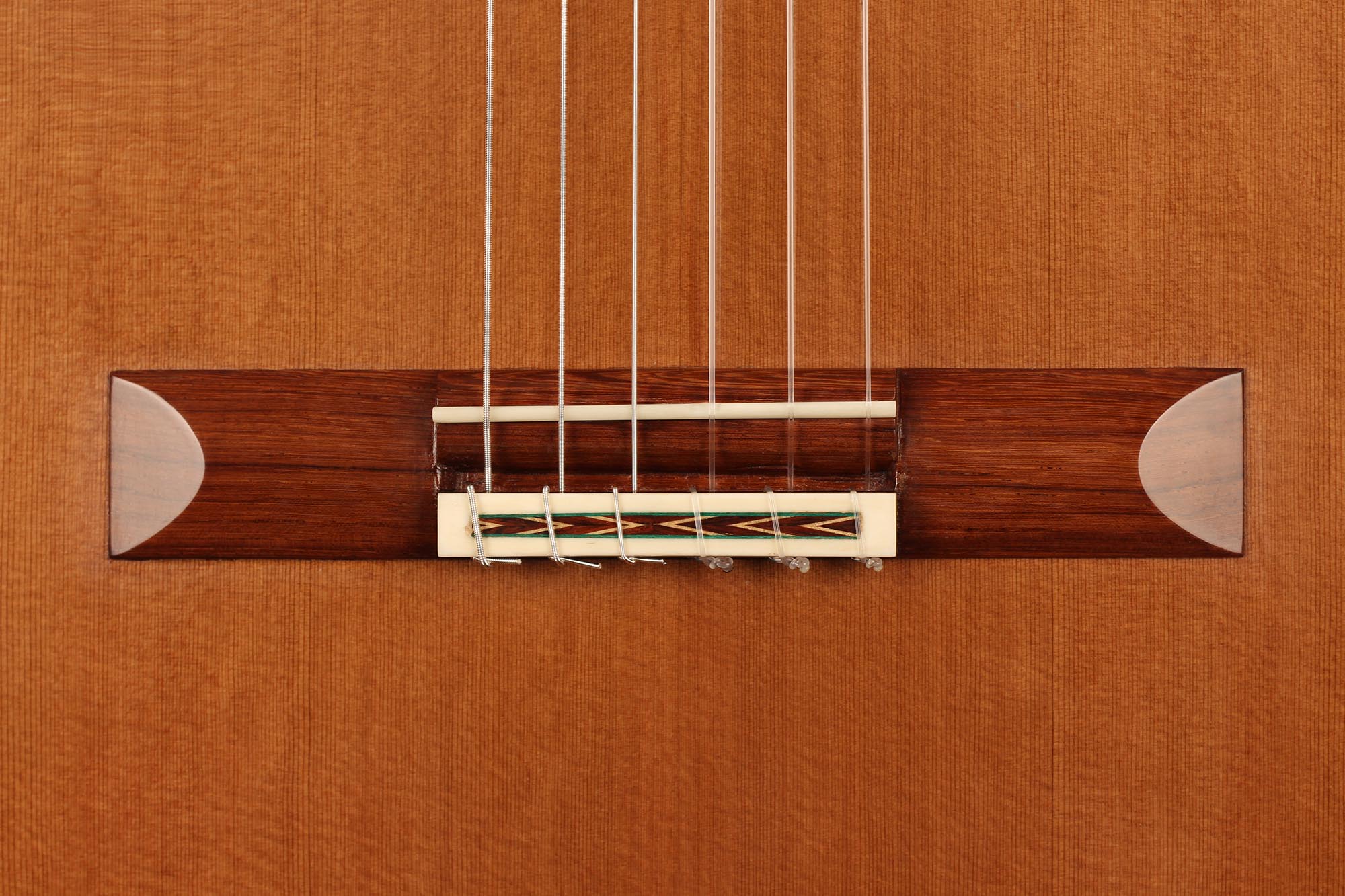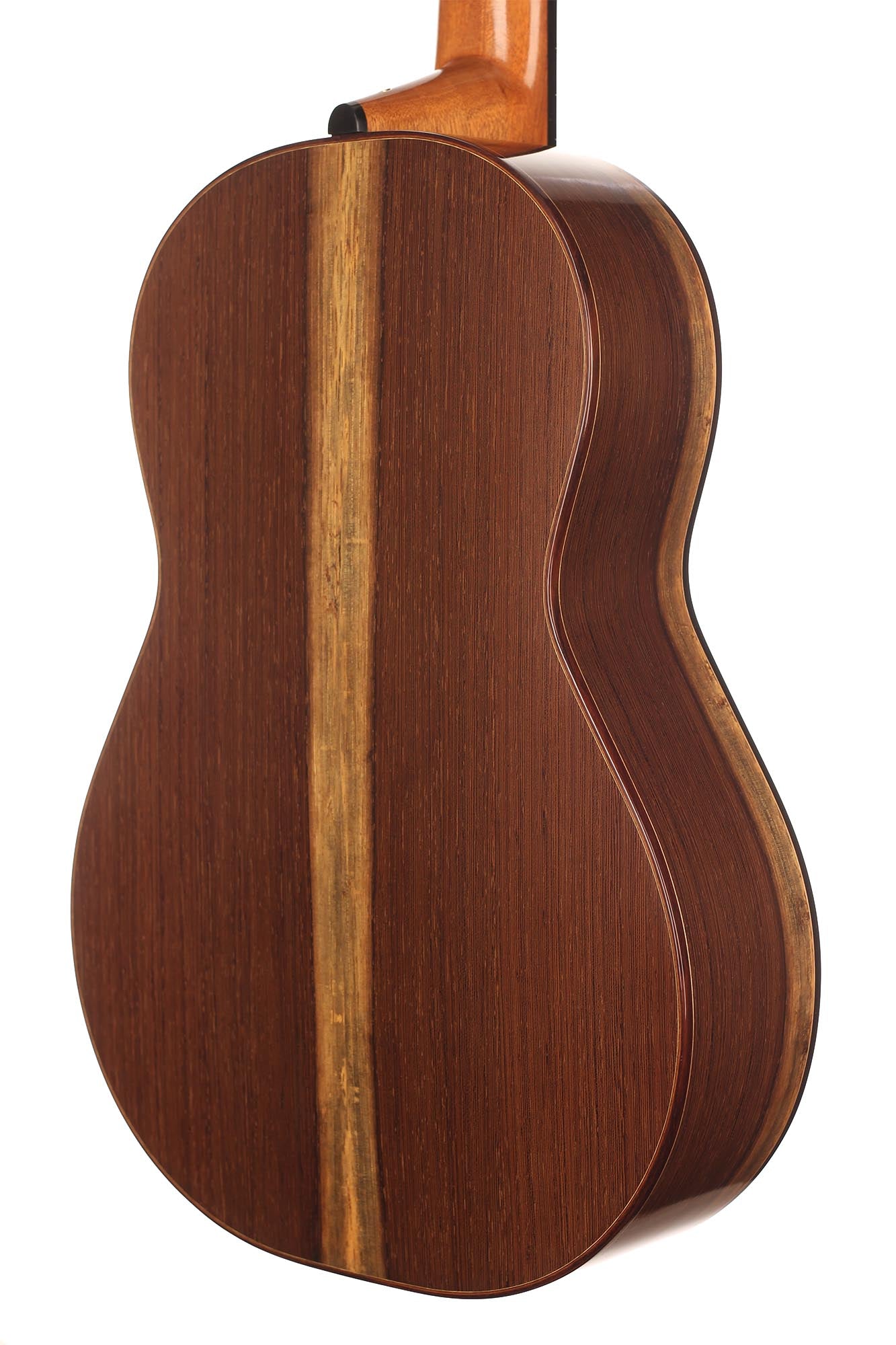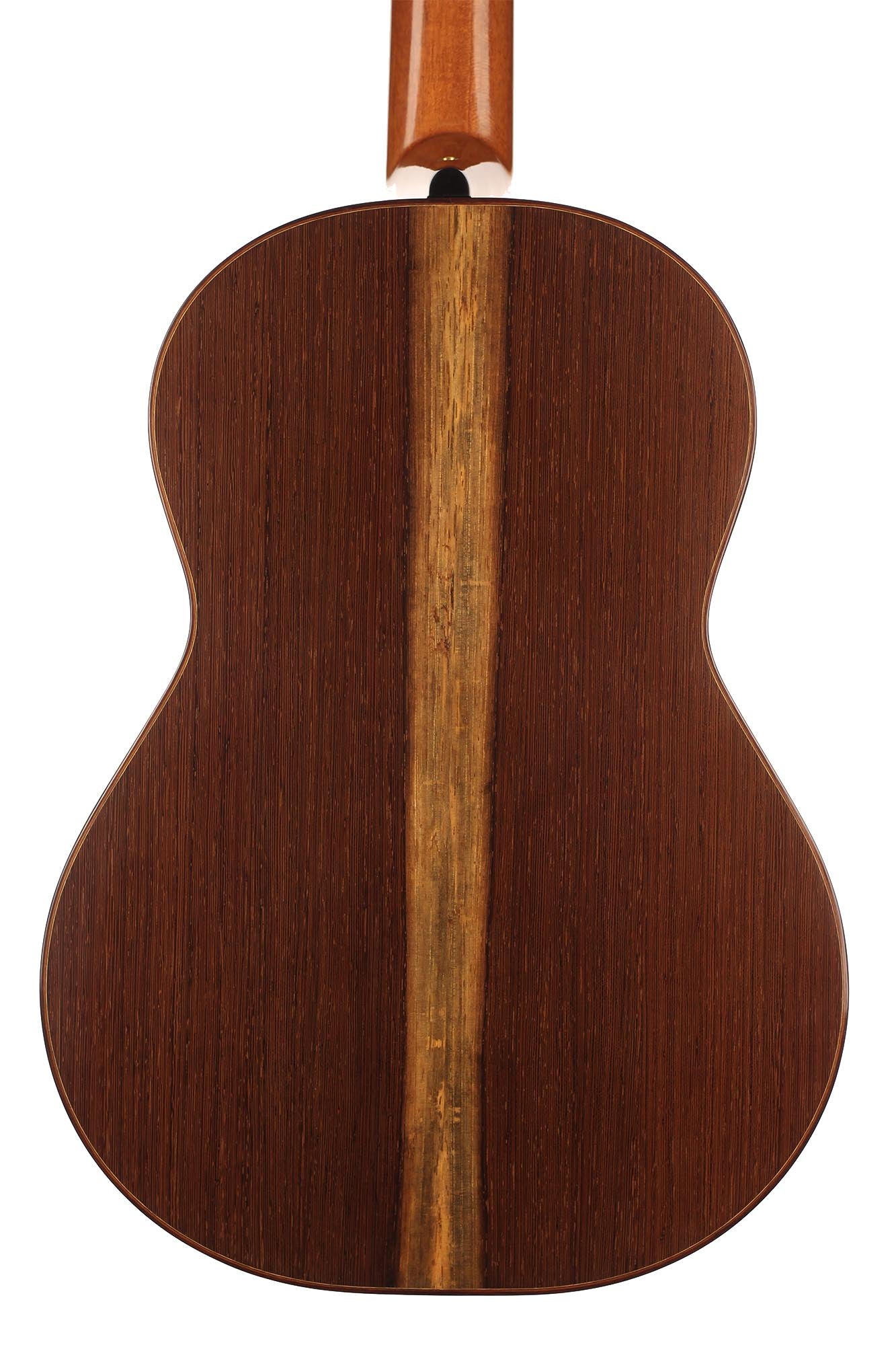 This guitar has not only a unique aesthetic, but also a very special bracing. The latter is relatively traditional and is made of a combination of spruce and cedar. The Wenge wood used for the back and sides is also remarkable. It is a guitar with a very good volume and a warm and elegant tone. The guitar plays very comfortably and reacts well to changes in the hand position, so that you can easily find different timbres.