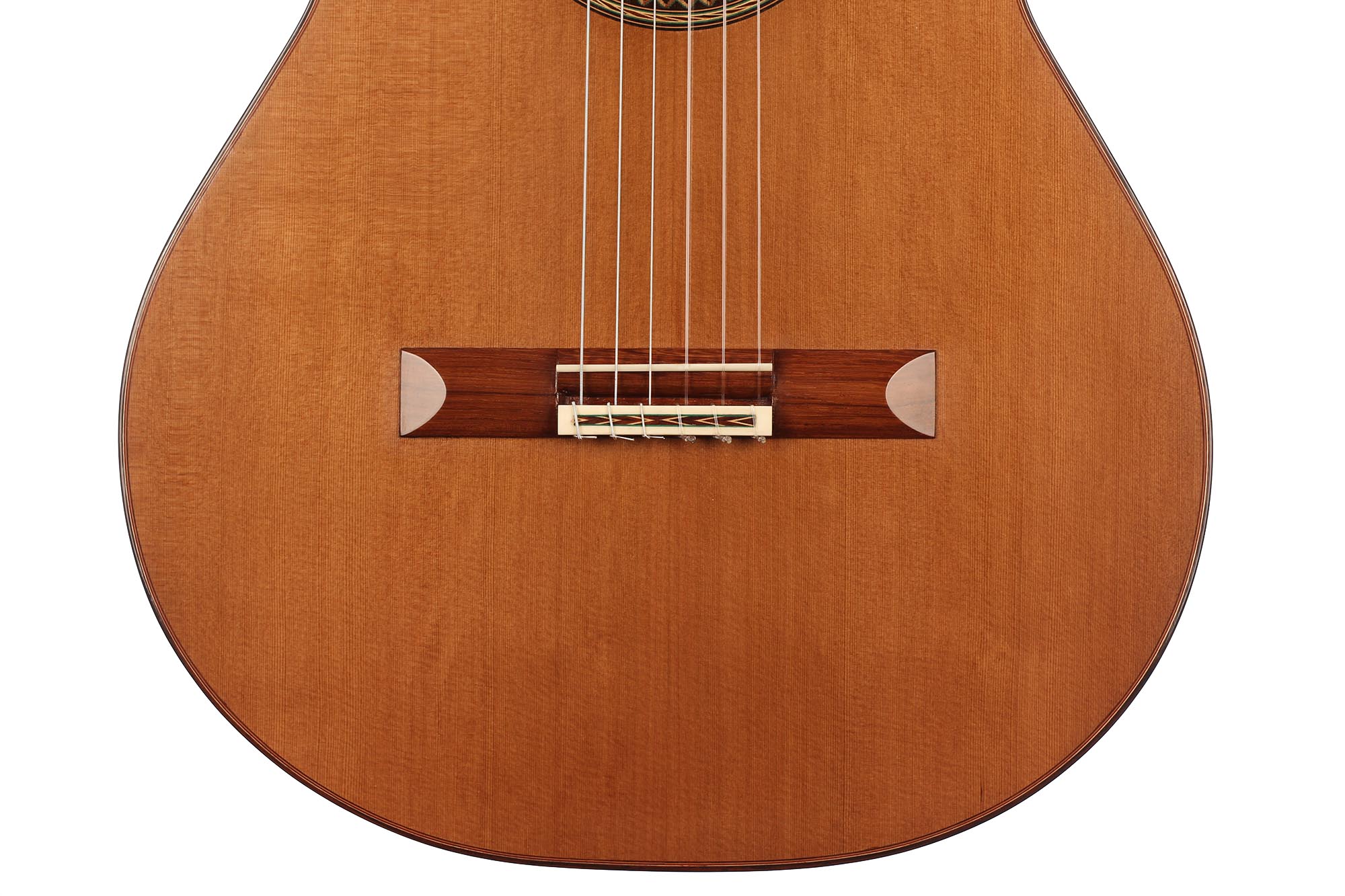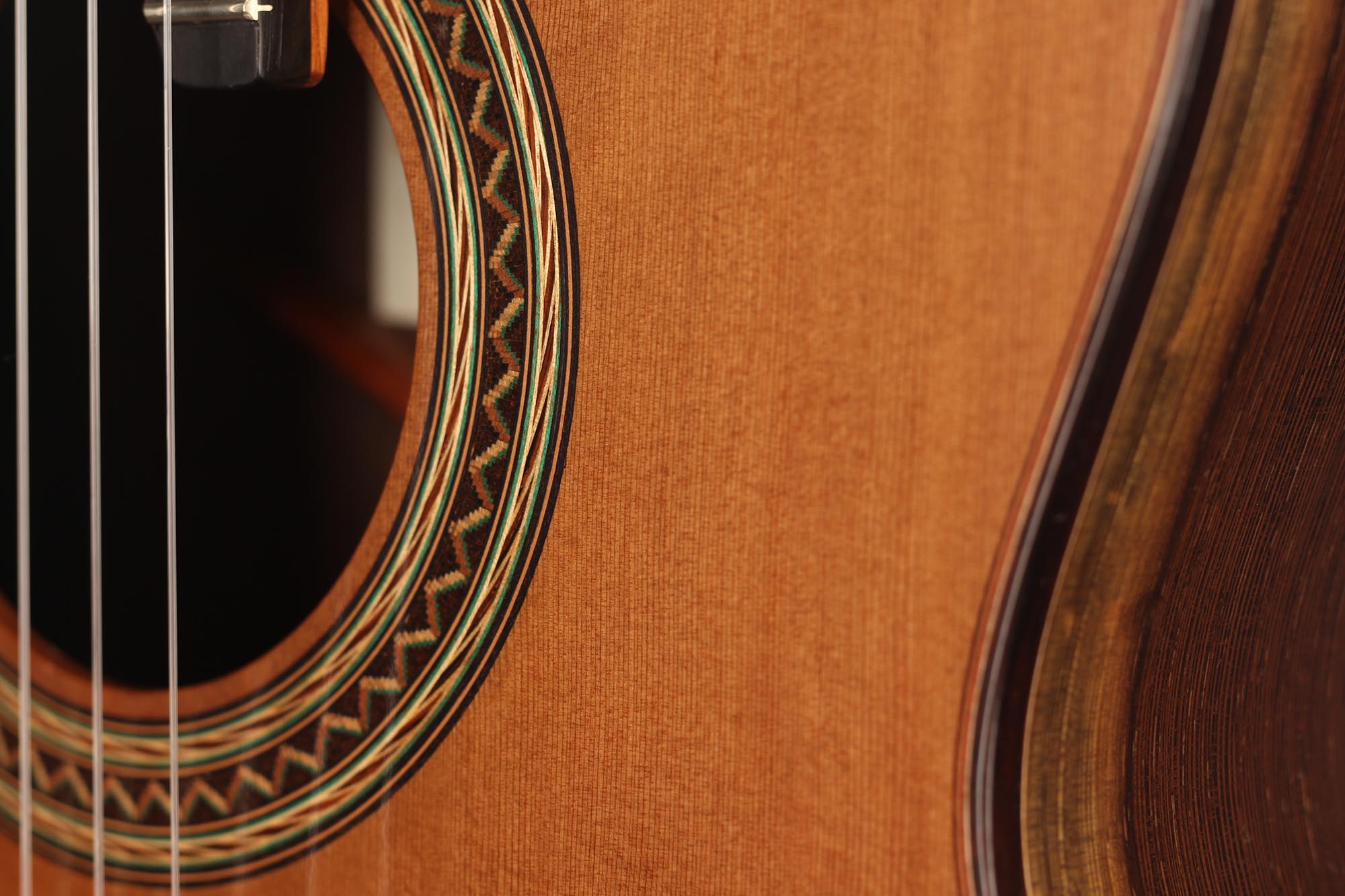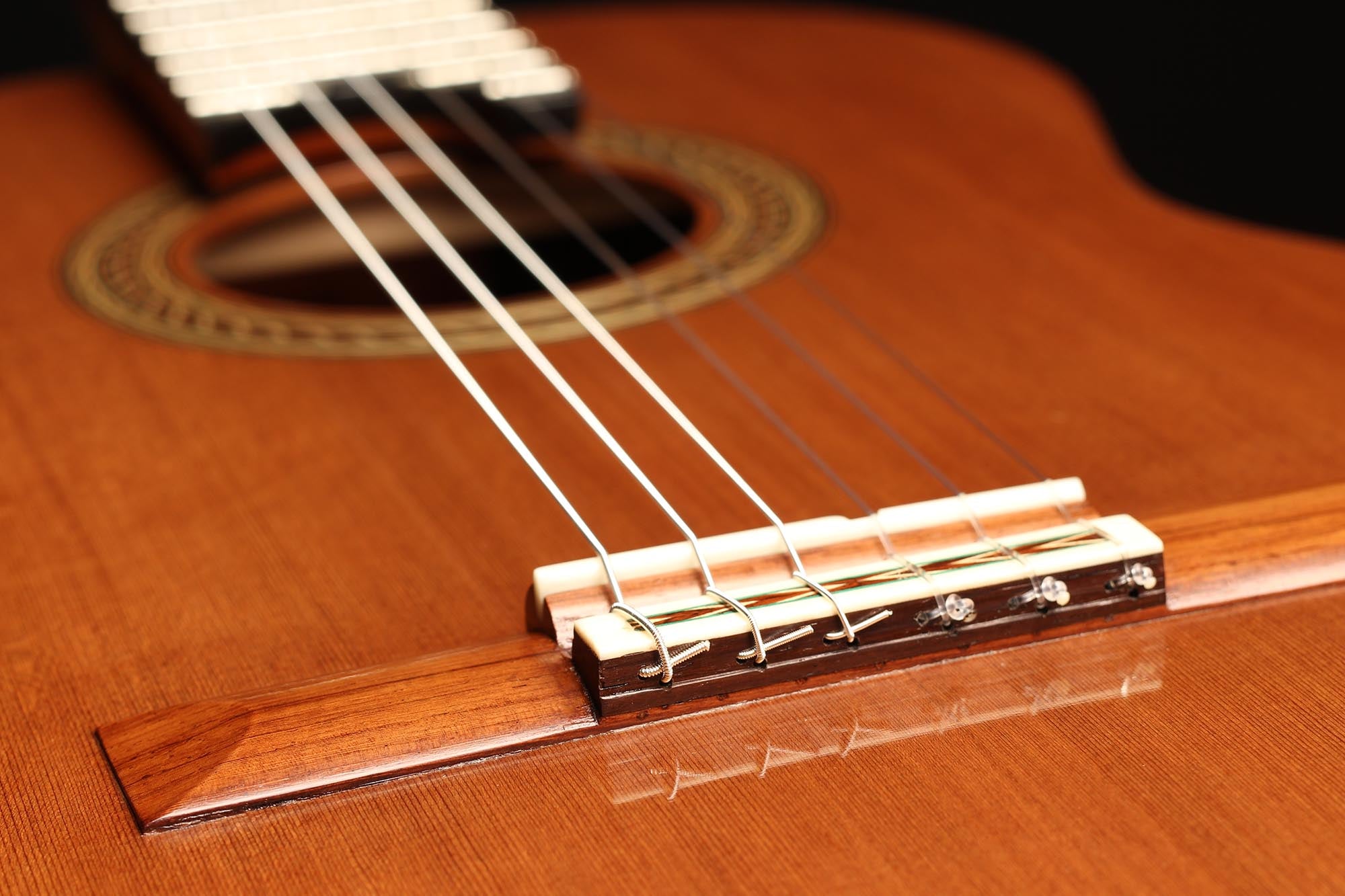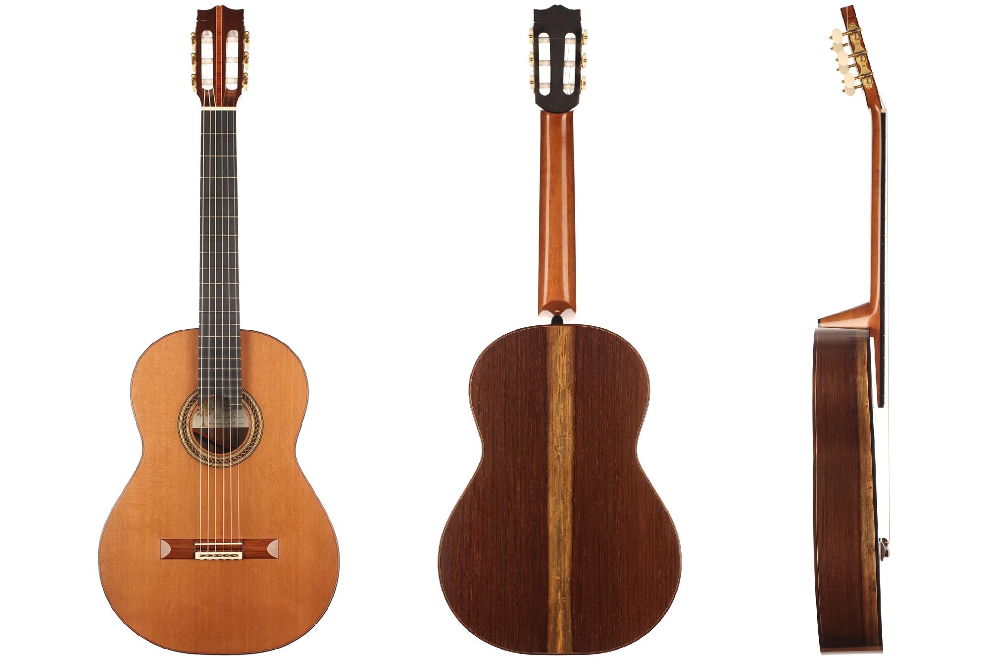 This guitar has not only a unique aesthetic, but also a very special bracing. The latter is relatively traditional and is made of a combination of spruce and cedar. The Wenge wood used for the back and sides is also remarkable. It is a guitar with a very good volume and a warm and elegant tone. The guitar plays very comfortably and reacts well to changes in the hand position, so that you can easily find different timbres.