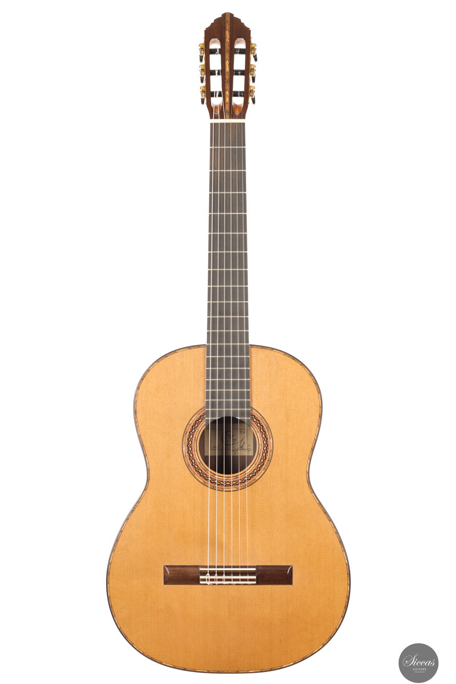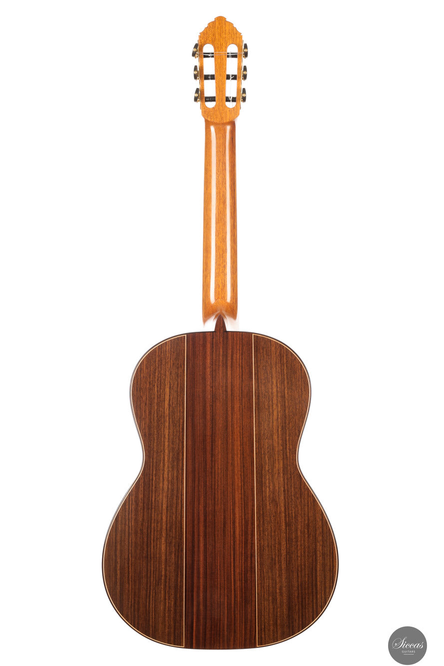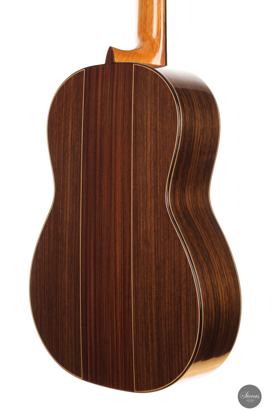 Die Konstruktion basiert auf einer Plantilla aus der zweiten Schaffensperiode von Antonio de Torres und verwendet ein traditionelles Sieben-Fächer-System mit zwei Schließleisten und einer leichten Stegleiste. Diese Bauweise unterstützt eine resonante und reaktionsschnelle Decke, die Kraft, Klarheit und Nuancen gleichermaßen vereint. Mit einer Eigenresonanz von F bis Fis und einem bemerkenswert geringen Gewicht von nur 1290 Gramm reagiert die Gitarre äußerst direkt und bietet ein ausgezeichnetes dynamisches Spektrum. Boden und Zargen bestehen aus indischem Palisander, der für Tiefe und Sustain sorgt, während der Cedro-Hals und das Ebenholzgriffbrett Stabilität und Spielkomfort gewährleisten. Ausgestattet ist die Gitarre mit hochwertigen Mechaniken von Kris Barnett, die sich durch Präzision und Langlebigkeit auszeichnen.